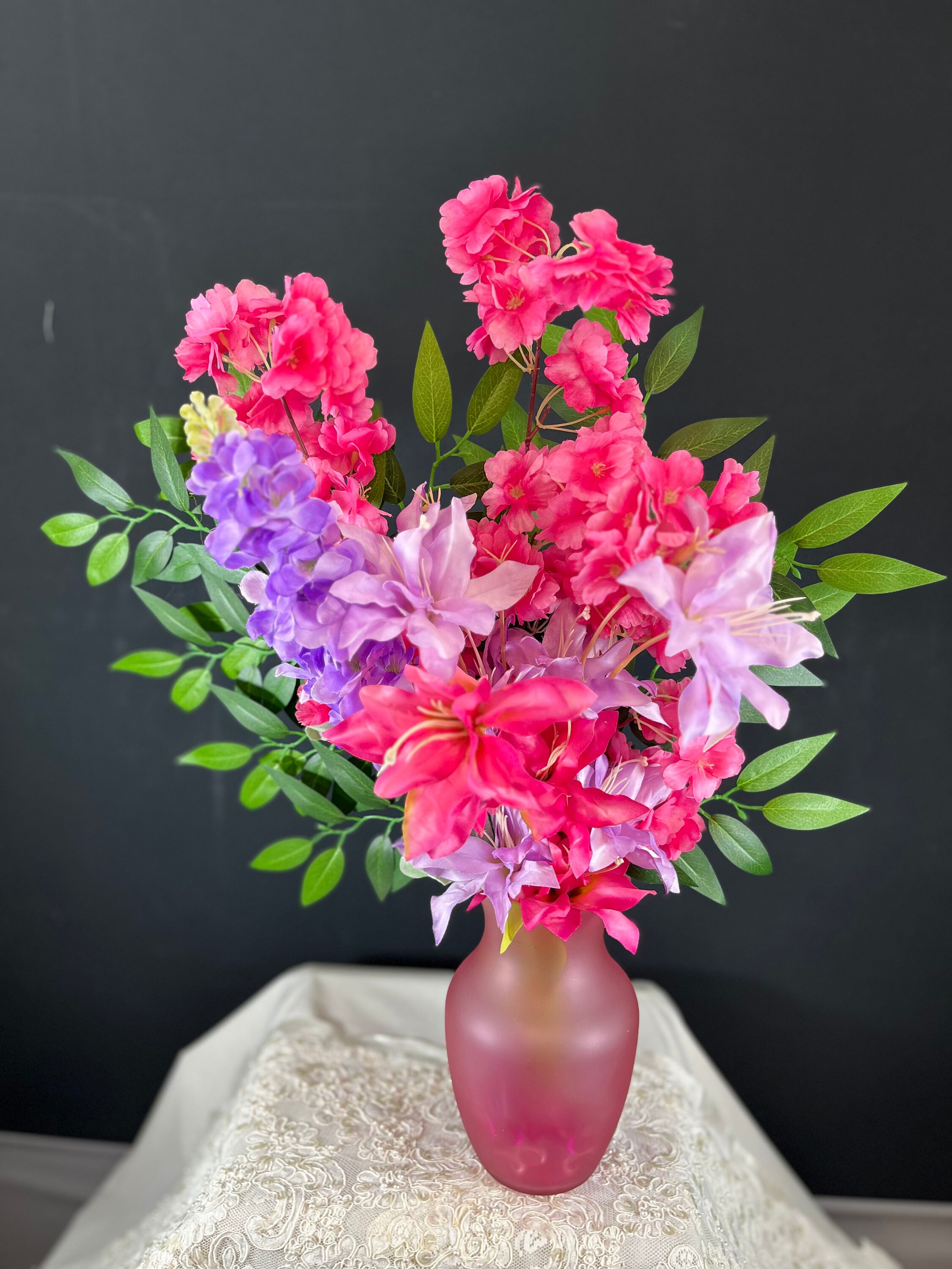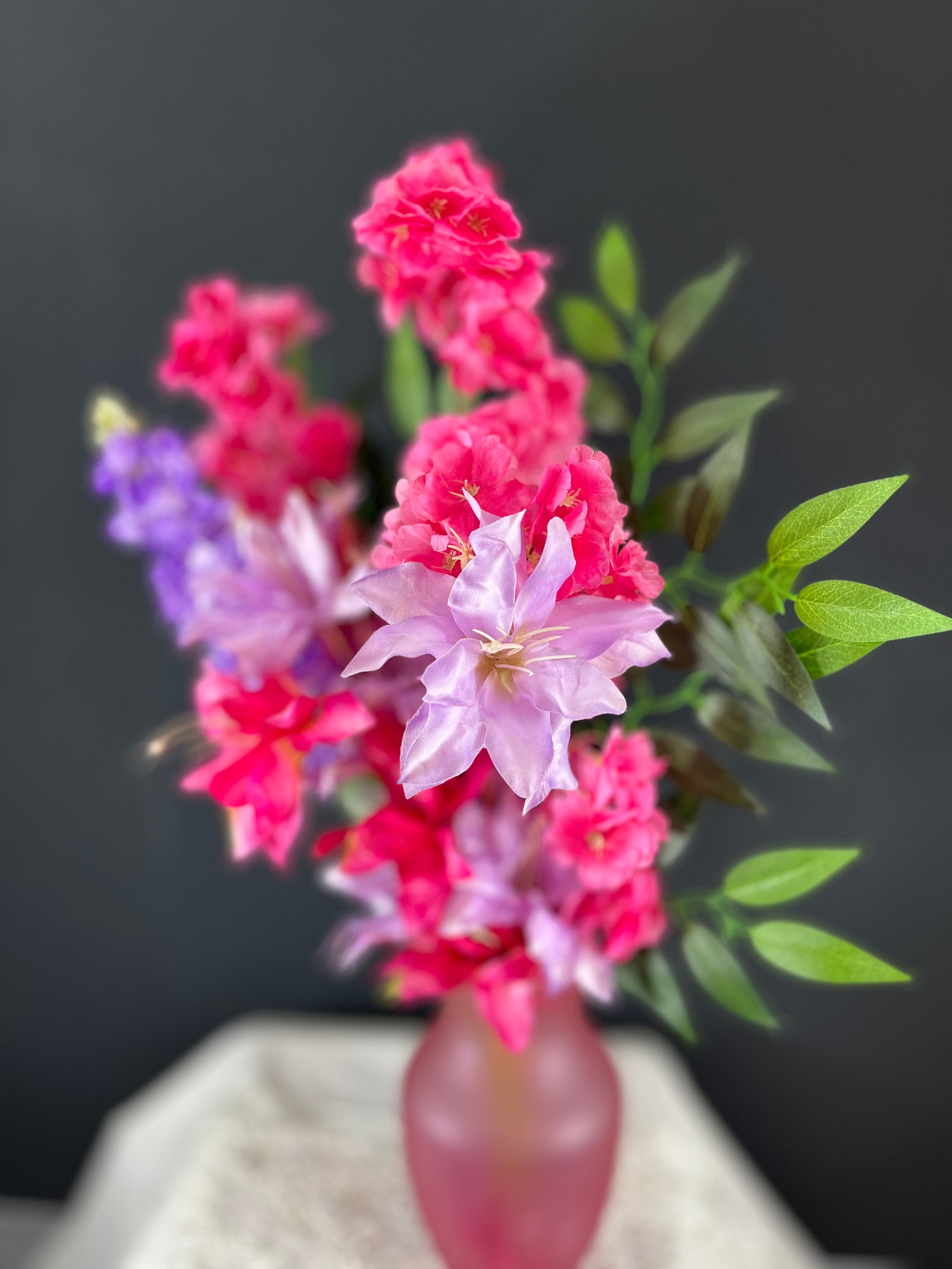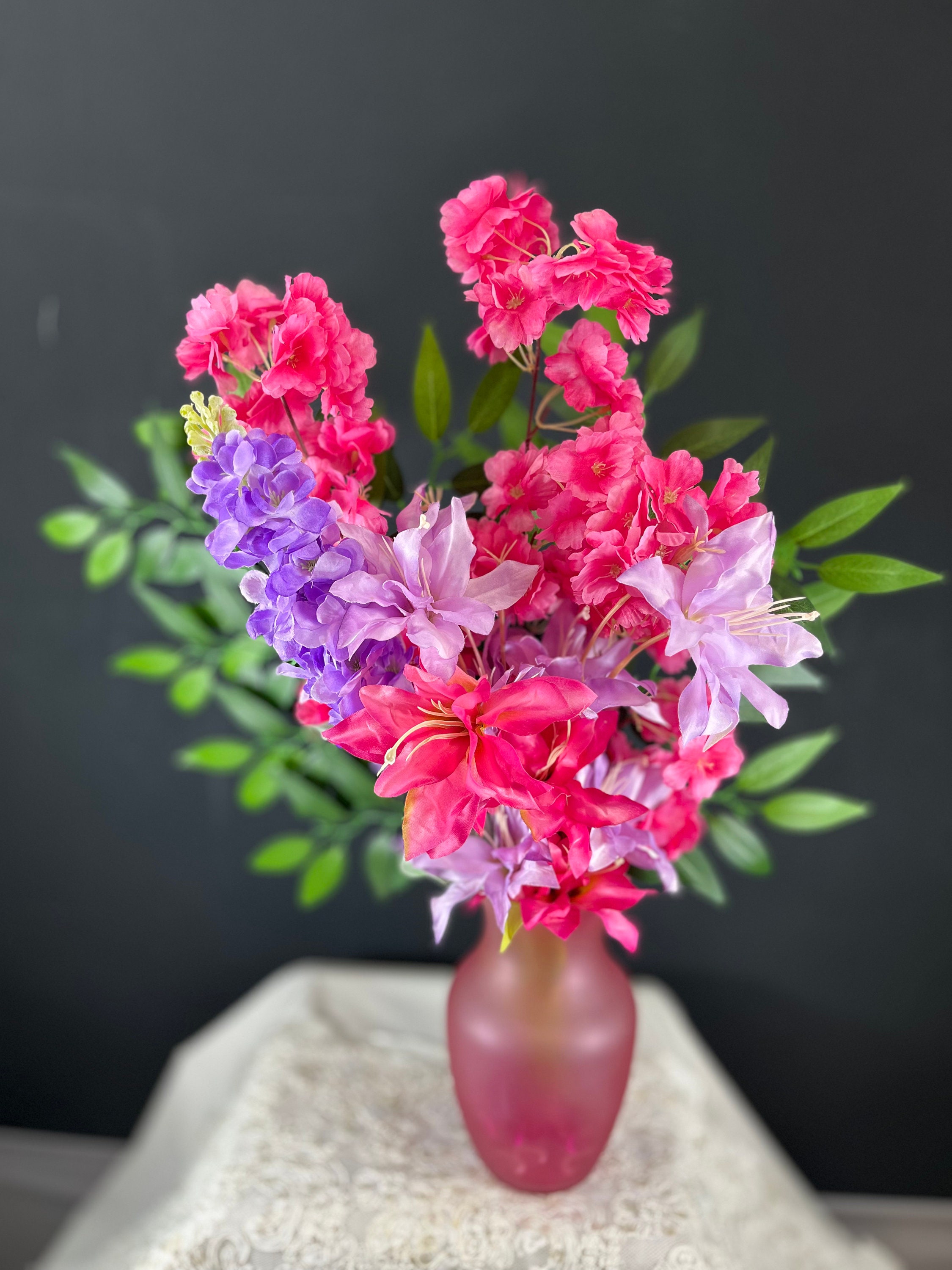 Introducing the Blush 'N' Bloom Artificial Flower Arrangement, a stunning fusion of flame lilies, cherry blossoms, and delphiniums. This exquisite arrangement brings together the fiery elegance of flame lilies, the delicate beauty of cherry blossoms, and the striking presence of delphiniums, creating a breathtaking display that enlivens any space.