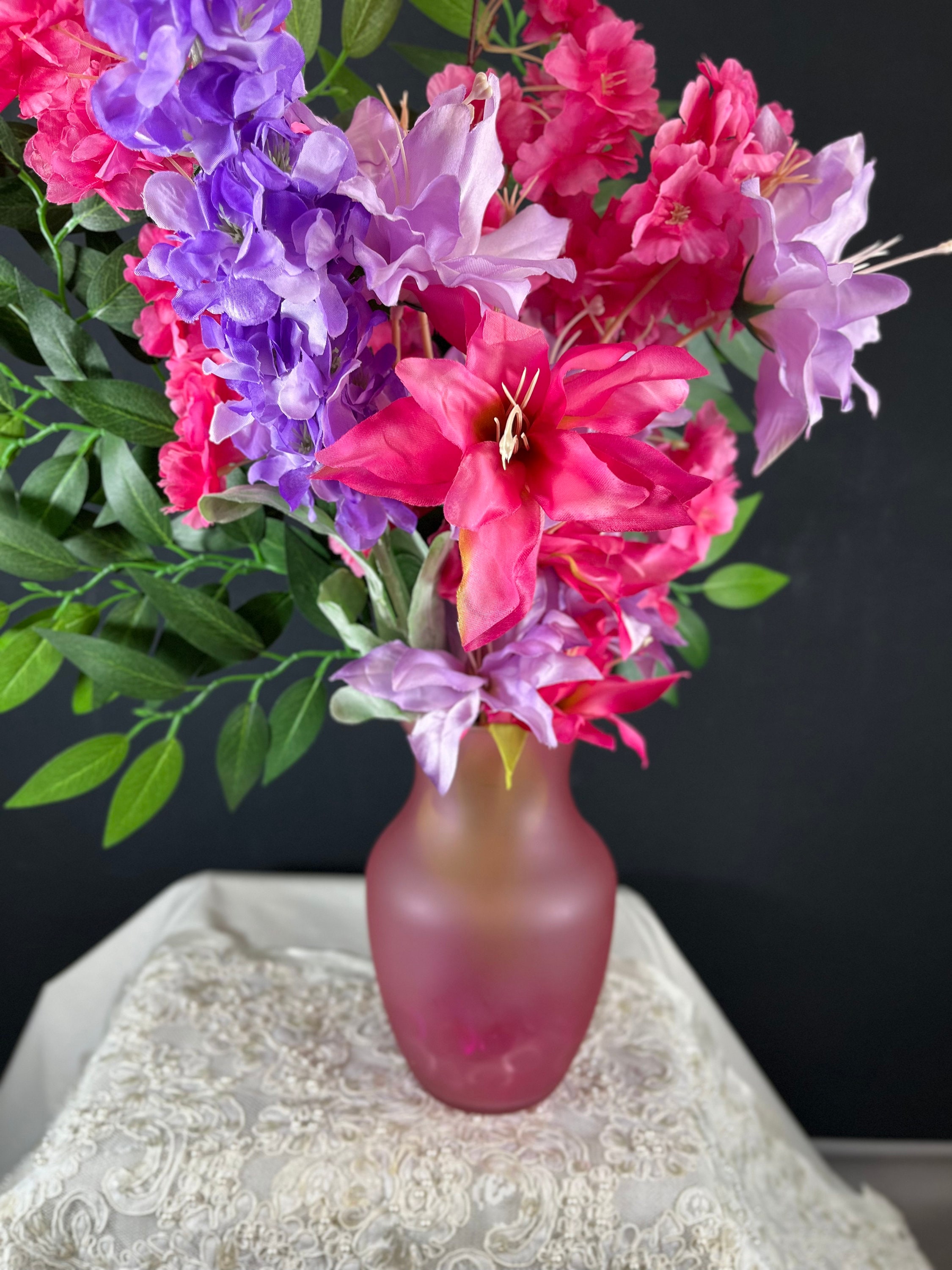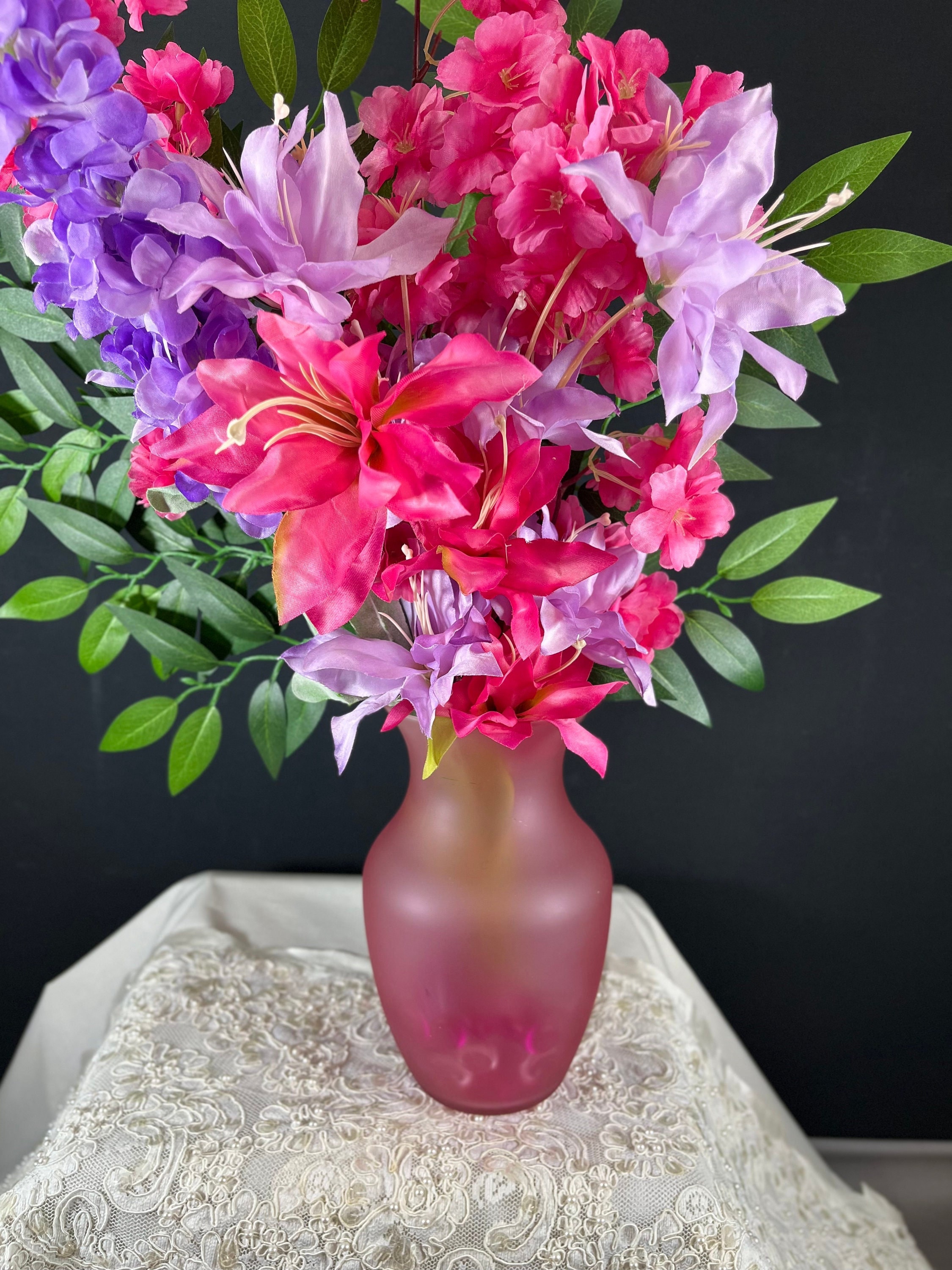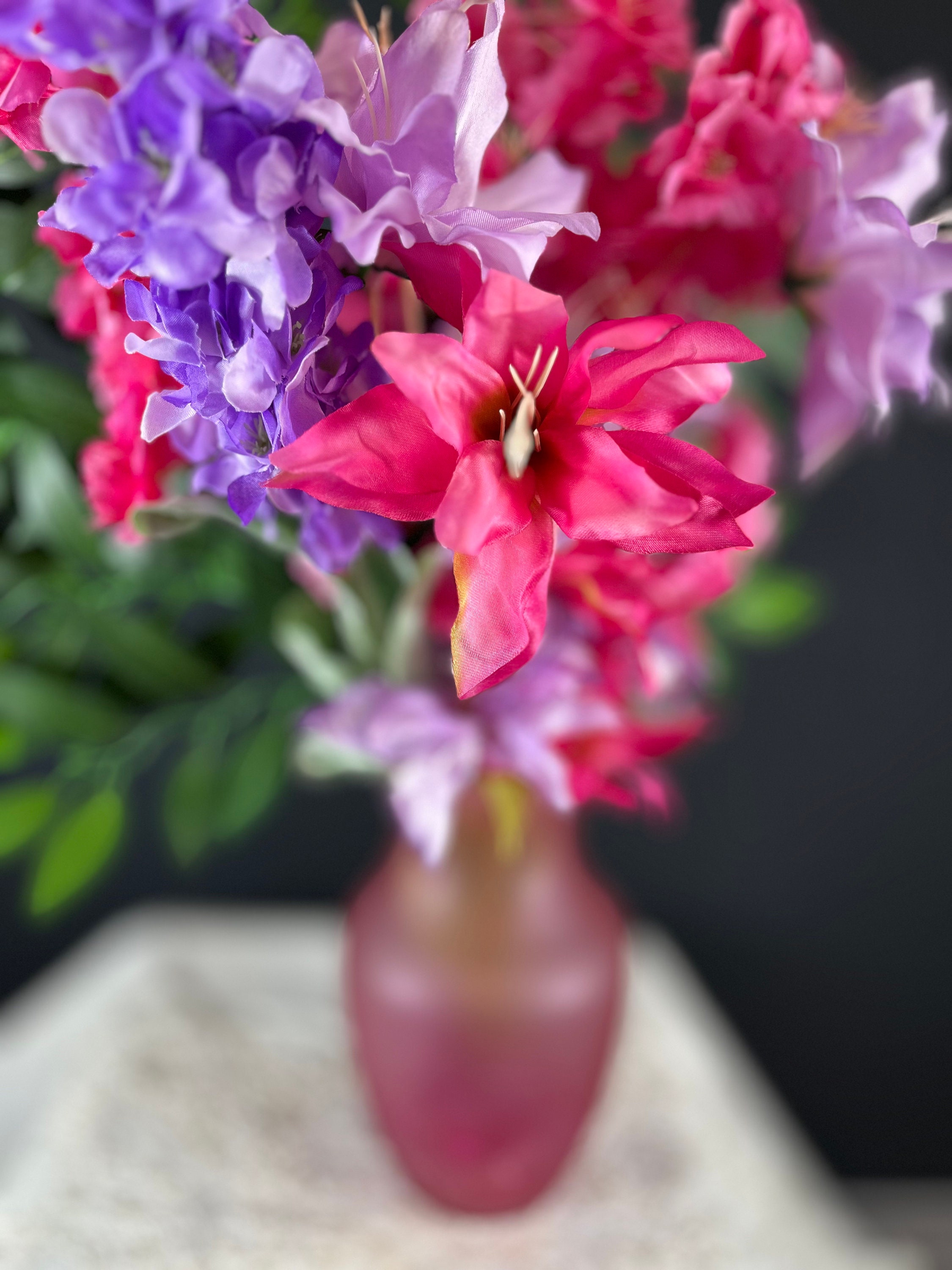 Introducing the Blush 'N' Bloom Artificial Flower Arrangement, a stunning fusion of flame lilies, cherry blossoms, and delphiniums. This exquisite arrangement brings together the fiery elegance of flame lilies, the delicate beauty of cherry blossoms, and the striking presence of delphiniums, creating a breathtaking display that enlivens any space.