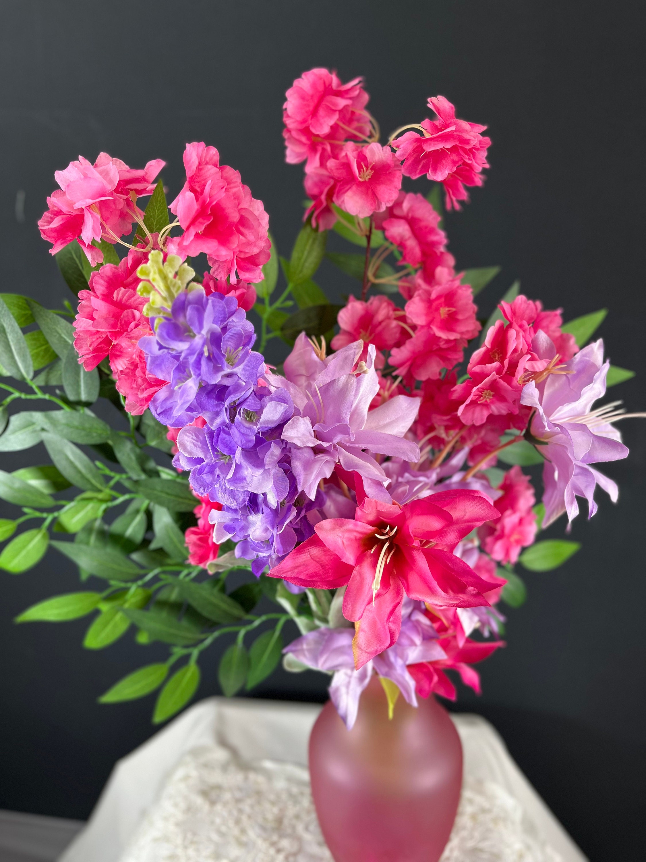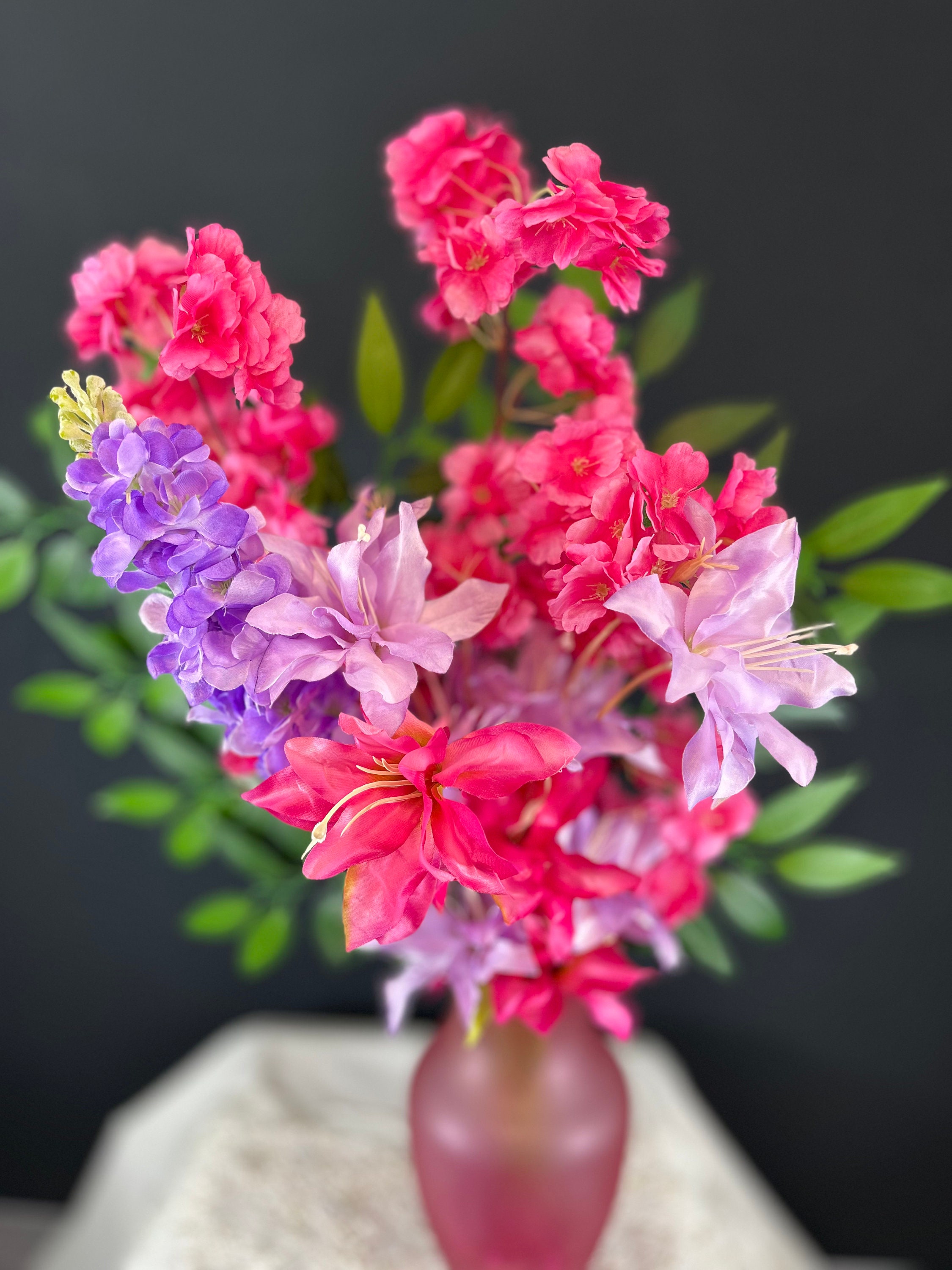 Vibrant and Diverse Colors: The arrangement showcases a rich blend of colors, from the vivid reds and oranges of flame lilies to the soft pinks of cherry blossoms and the bold blues of delphiniums, creating a visually stunning and harmonious bouquet.