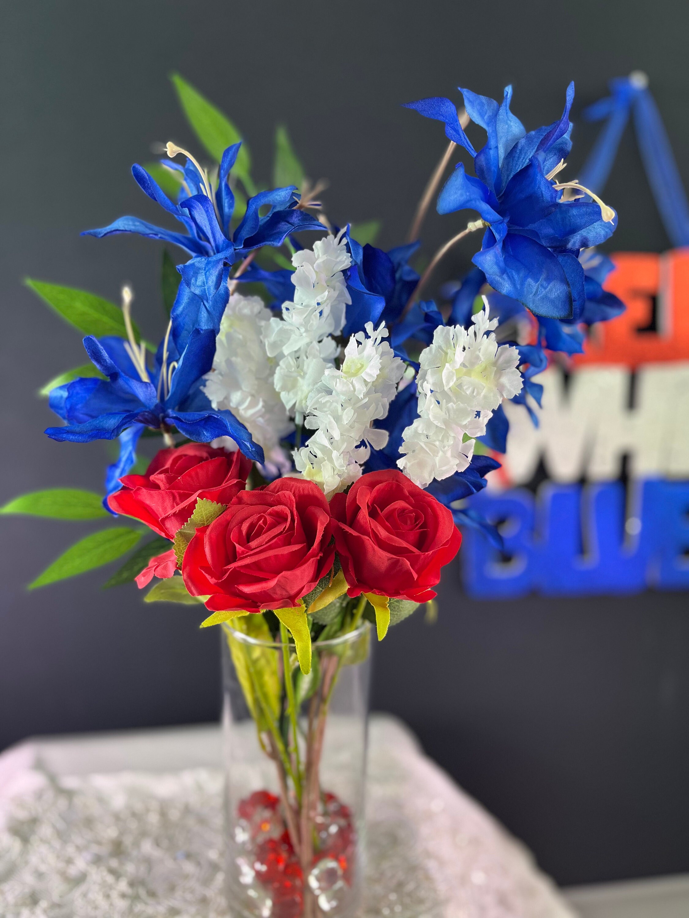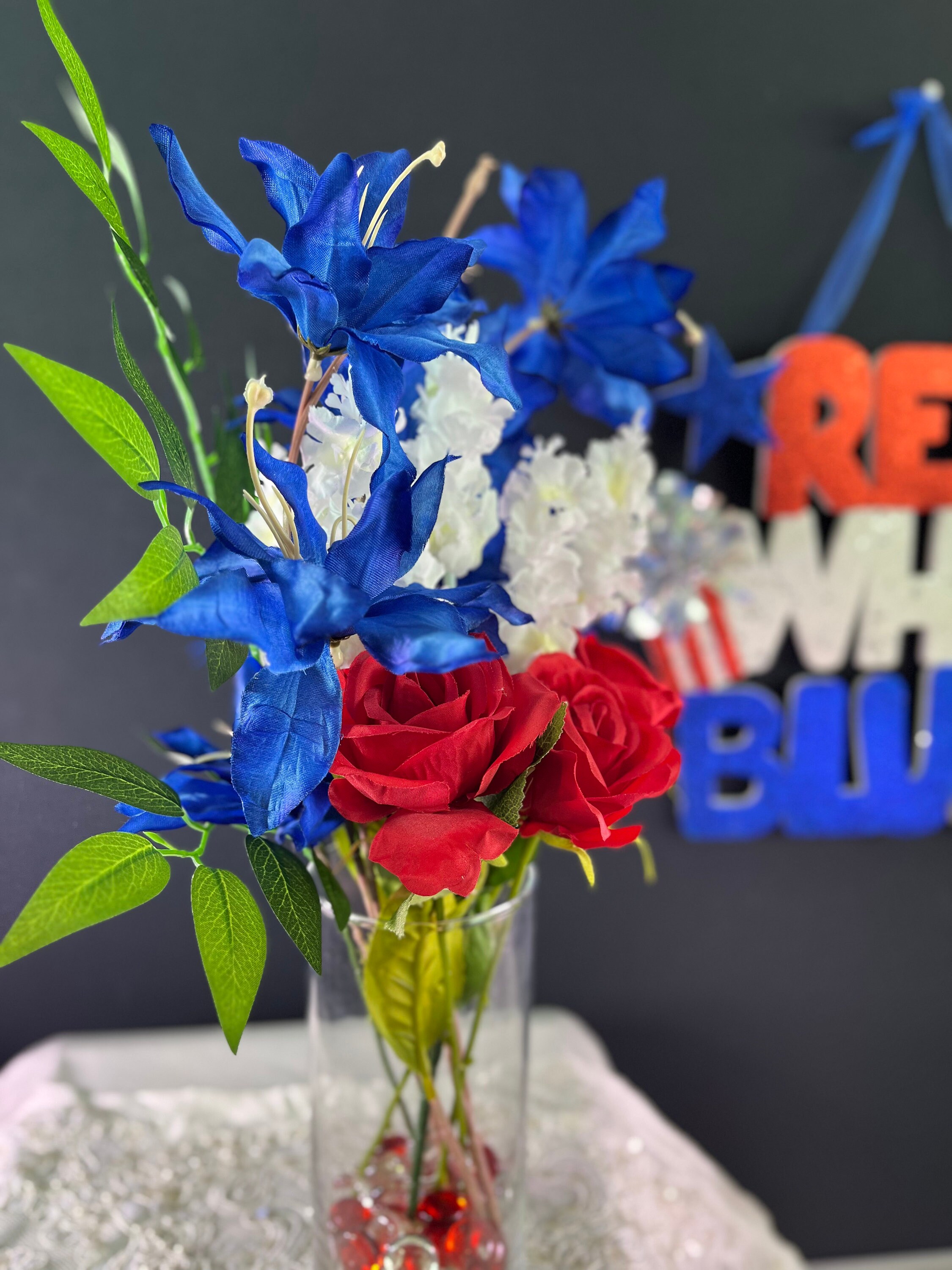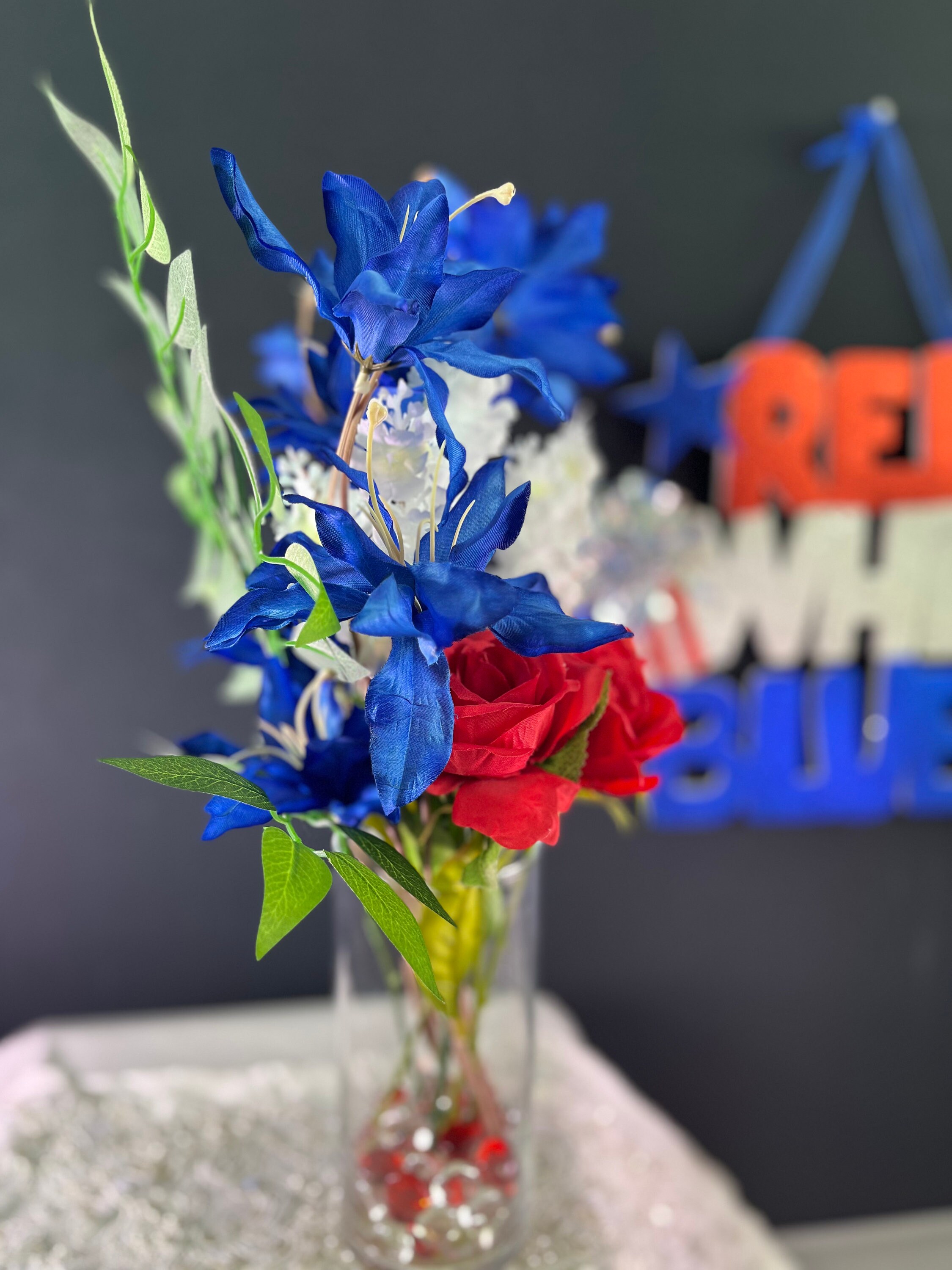 Celebrate the spirit of Independence Day with our American Beauty Artificial Flower Arrangement. This beautiful vibrant and patriotic arrangement features a striking combination of fake red roses, white delphiniums, and blue flame lilies, perfectly representing the iconic red, white, and blue of the American flag. Designed to infuse your space with festive charm and national pride, this arrangement is ideal for patriotic holidays and year-round display. Fake flowers are always in bloom and beautiful.