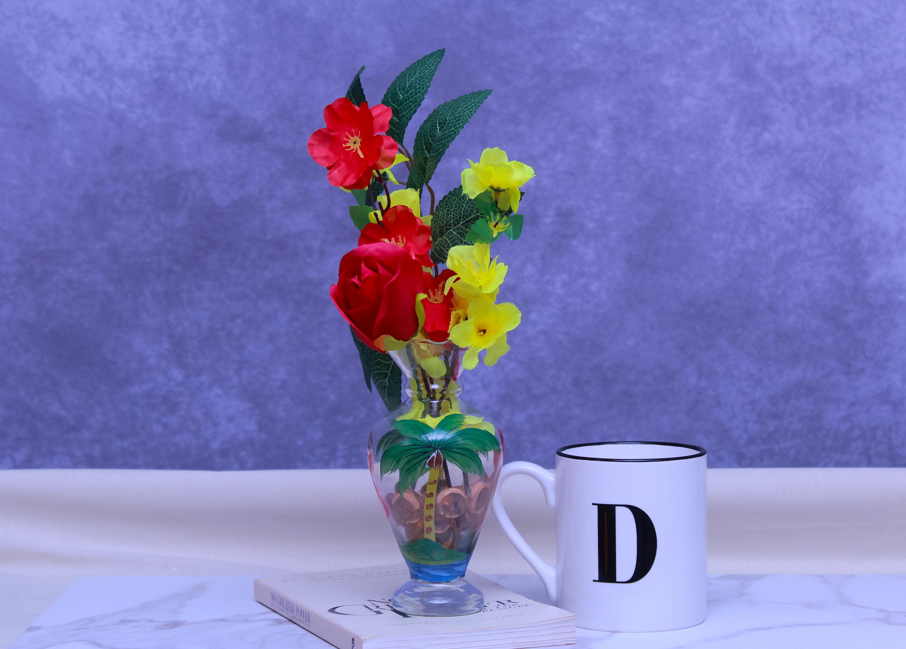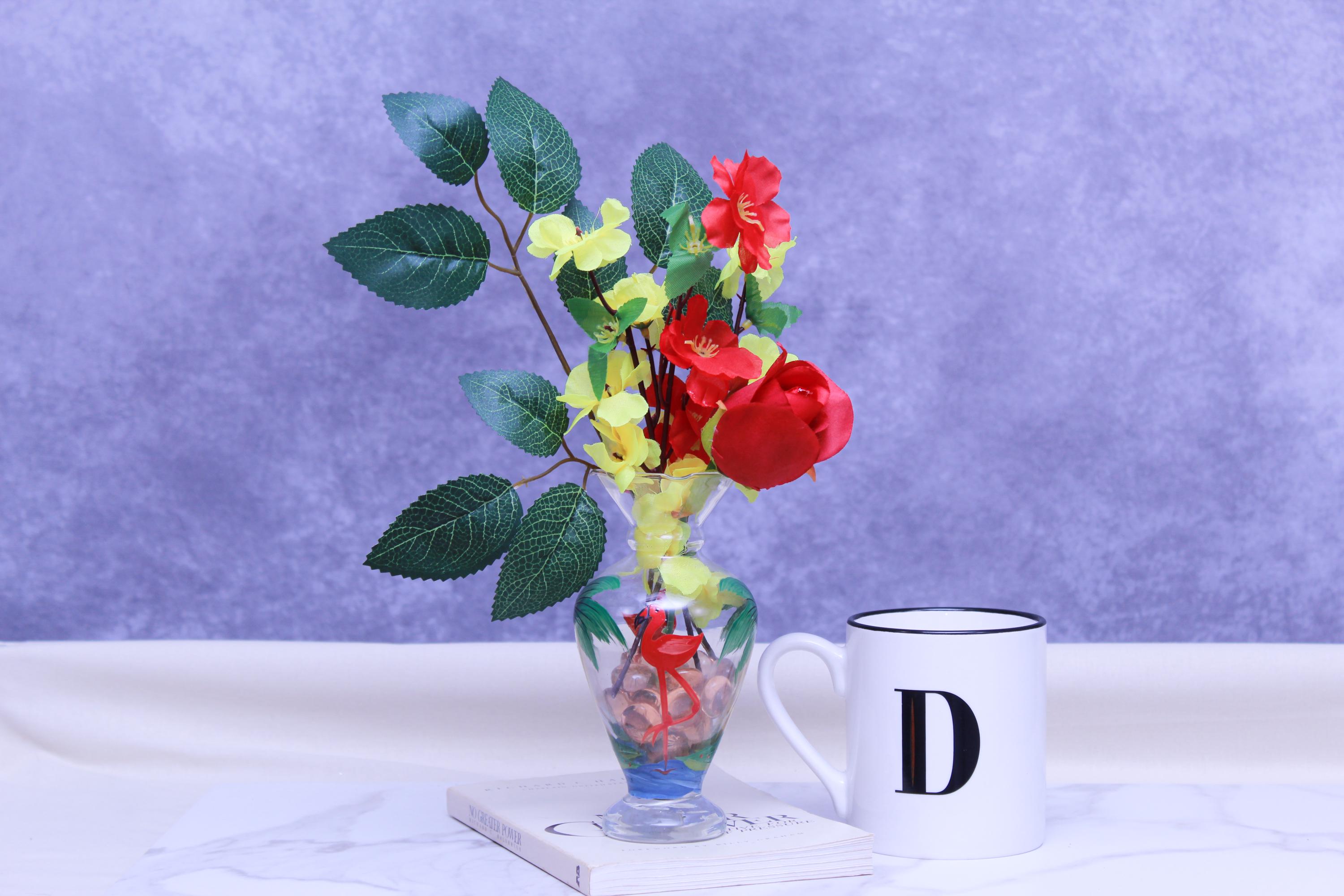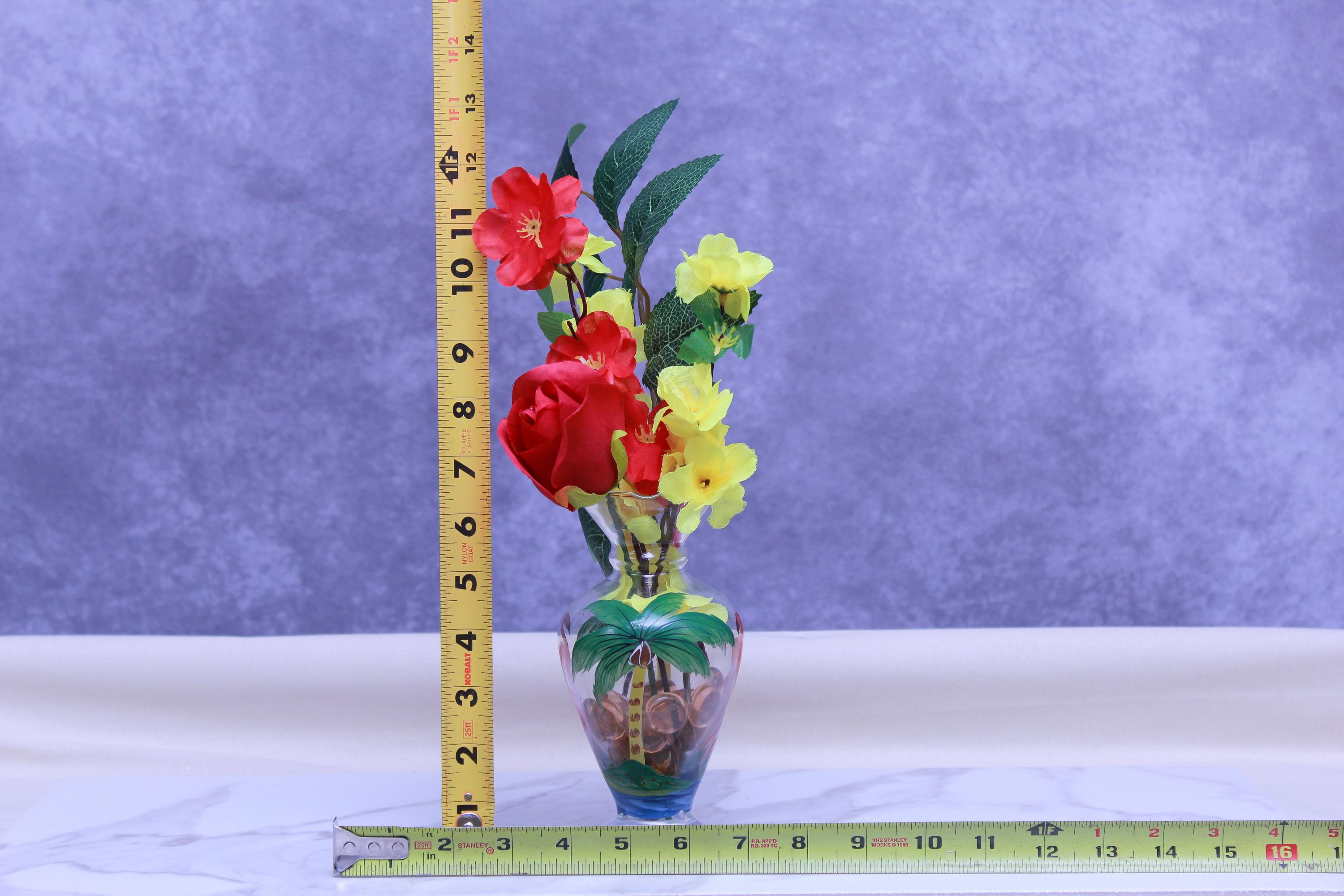 Add a pop of happy color to your home with this faux flower arrangement styled in a hand-painted glass vase featuring a tropical scene with a flamingo and palm trees. Designed with a bold red rose, sunny yellow blooms, and greenery, it’s the perfect small statement piece for coastal cottage decor, eclectic farmhouse styling, or any space that needs a cheerful lift.