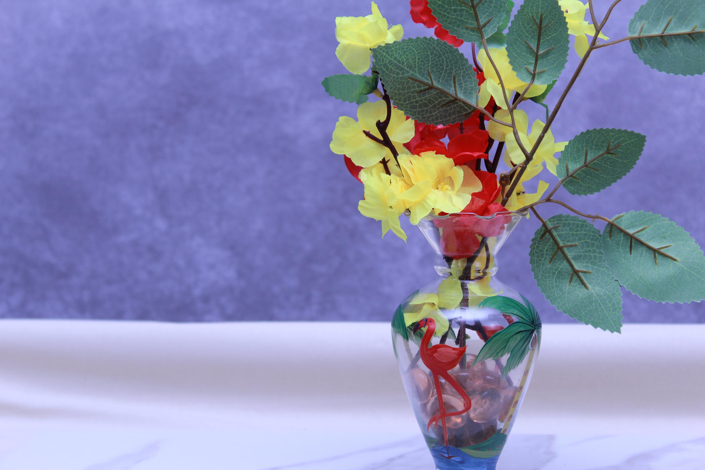 Hand Painted Flamingo Vase Faux Flower Arrangement (Red + Yellow)