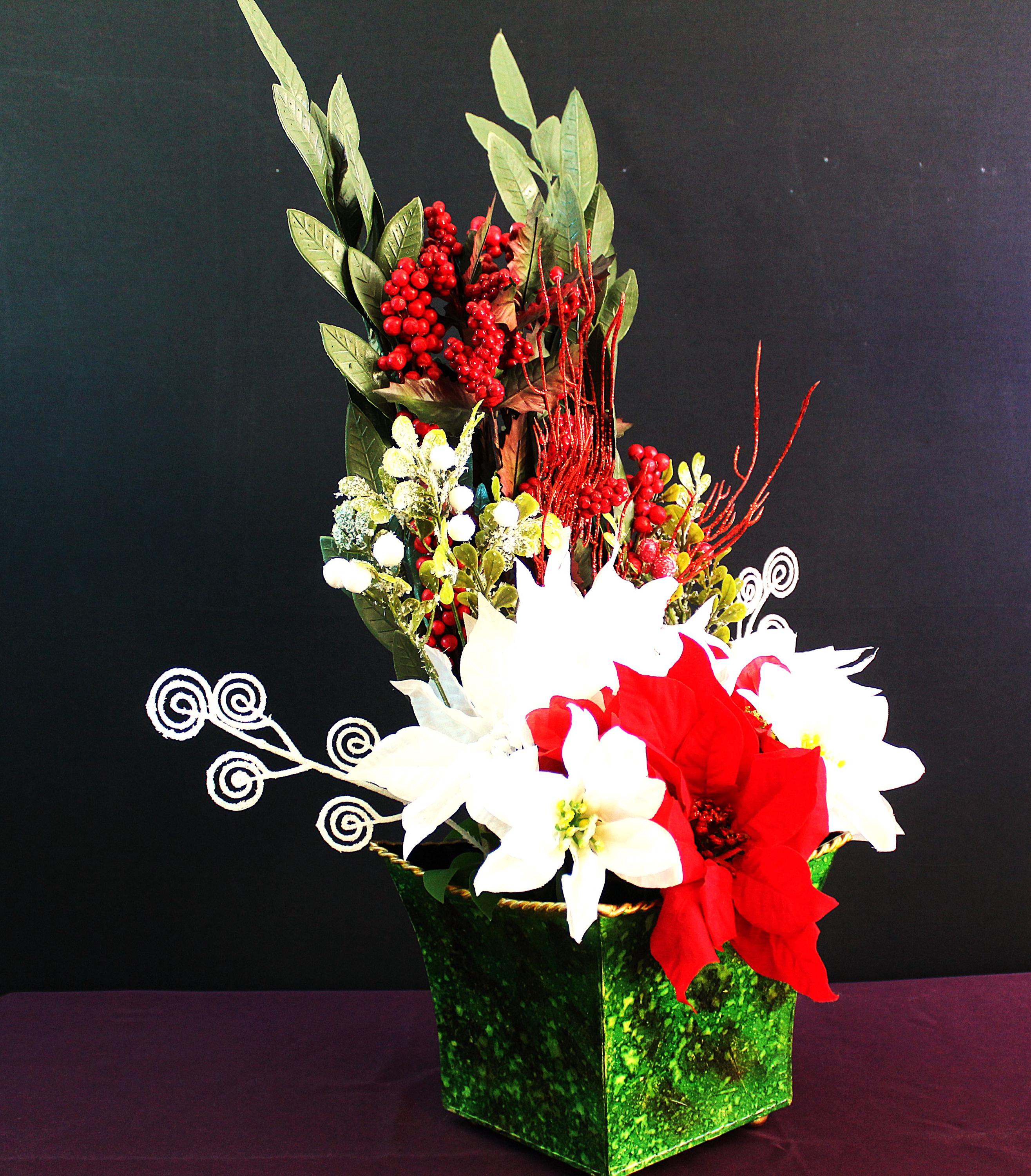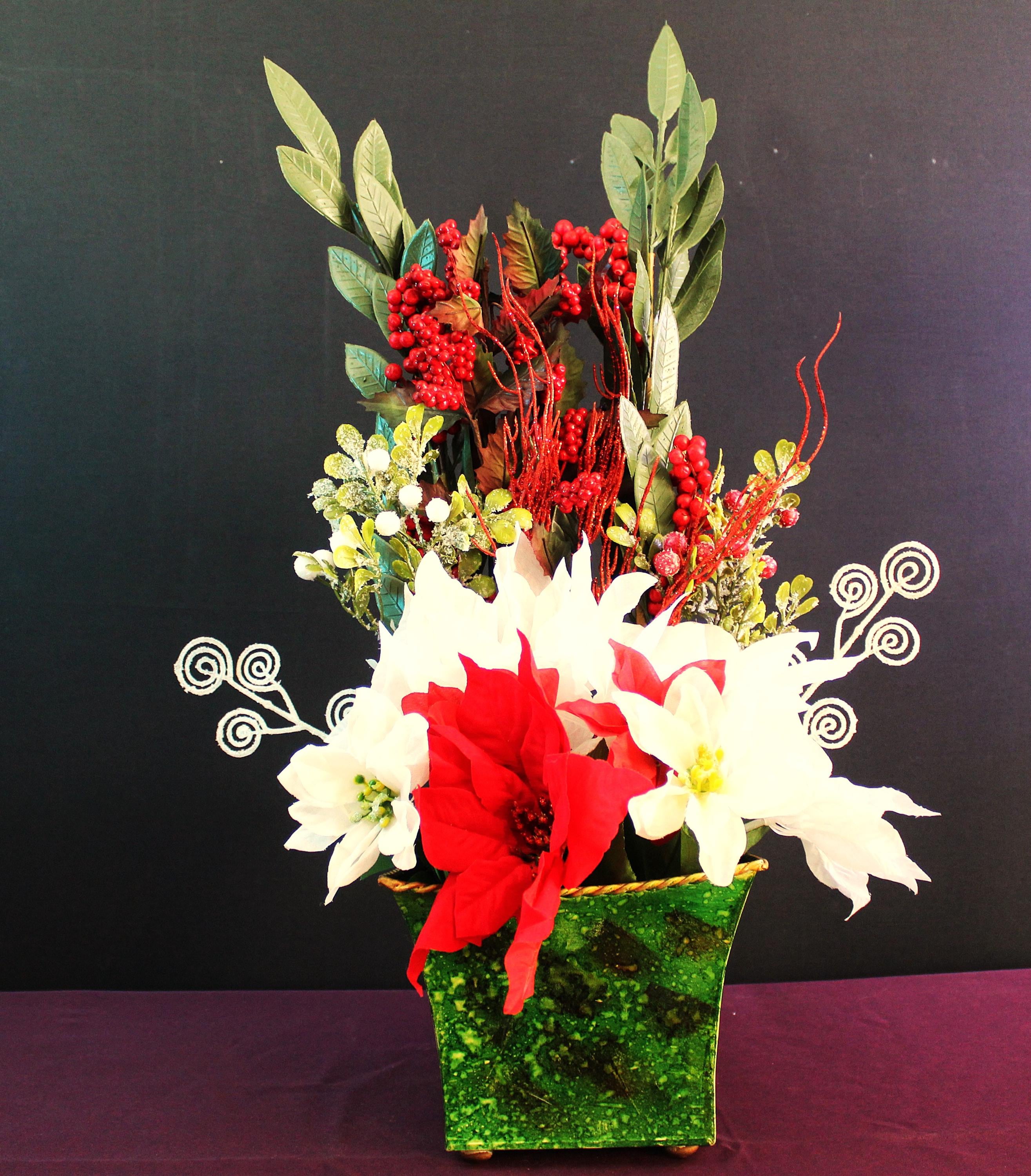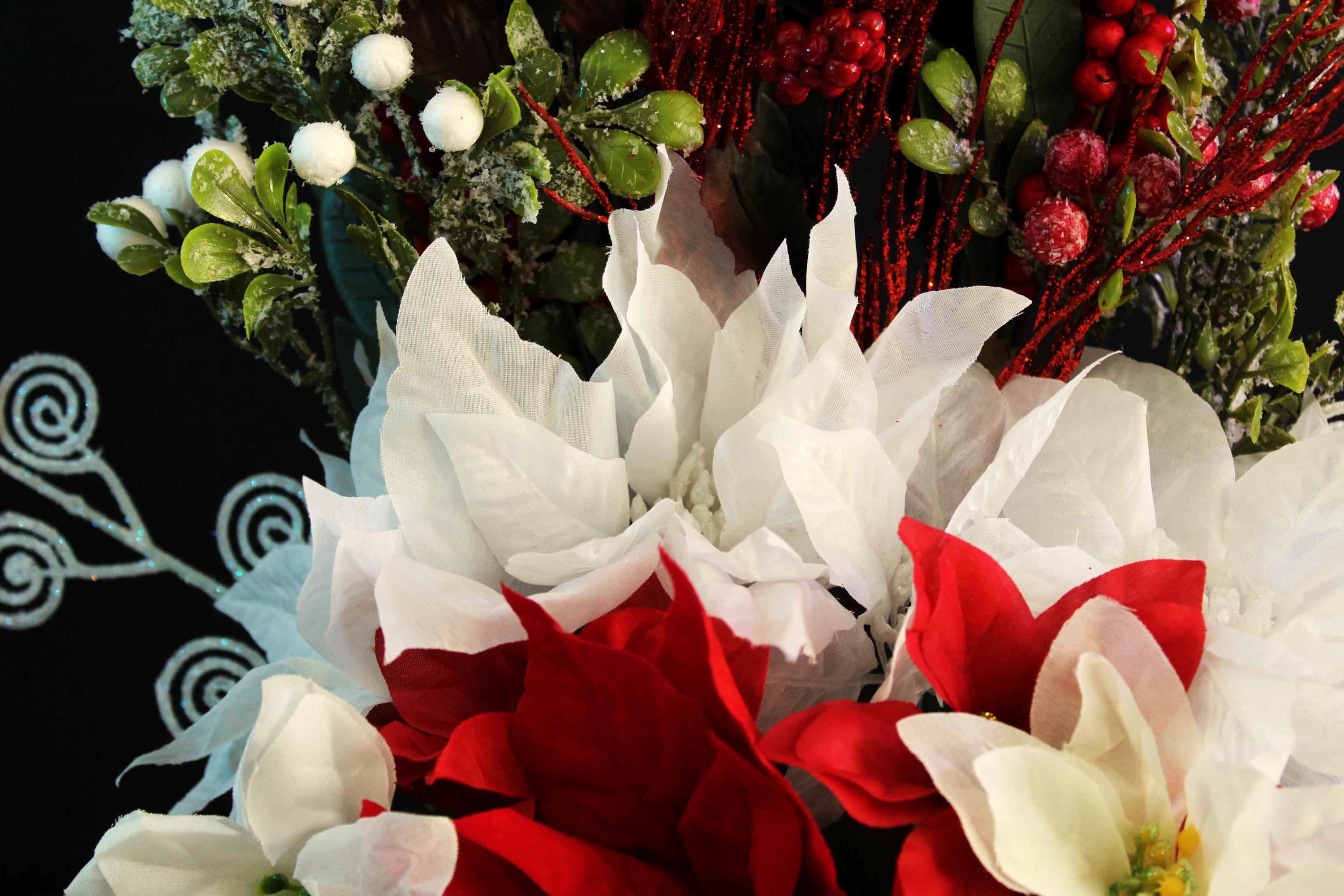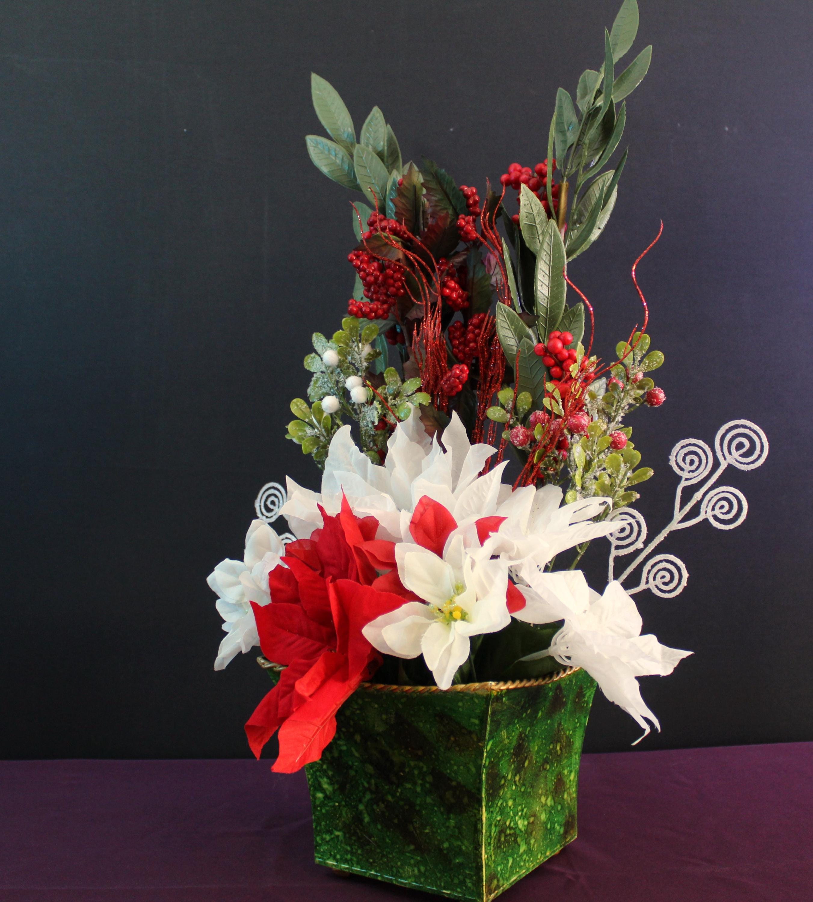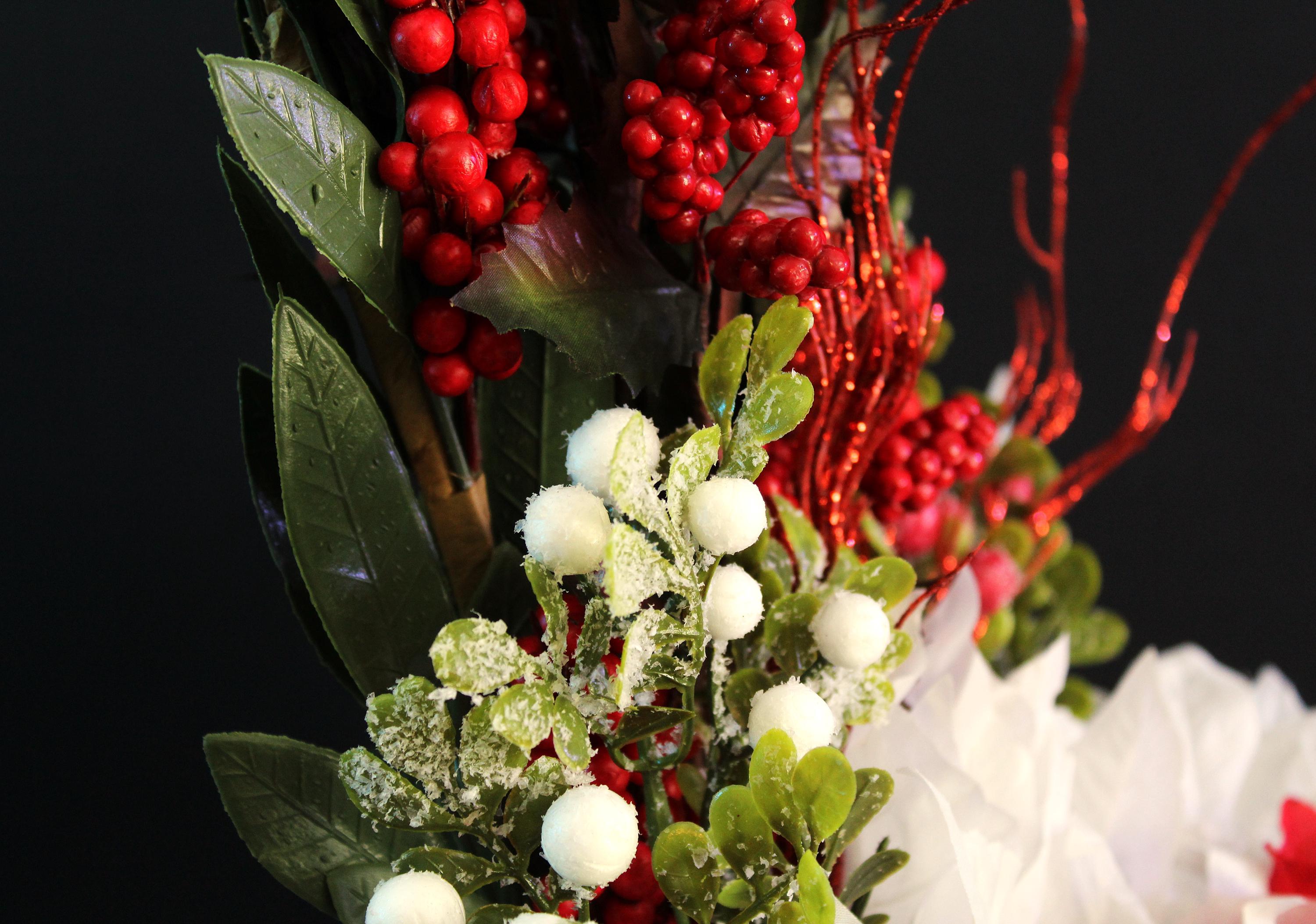 Add a touch of holiday elegance to your home with this stunning Red & White Poinsettia arrangement! Beautifully designed with lush winter greens and delicate white and red holly berry strands, this centerpiece is arranged in a vibrant green vase, elegantly outlined with gold rope detailing. Perfect as a Christmas decoration or a thoughtful gift for the holiday season.