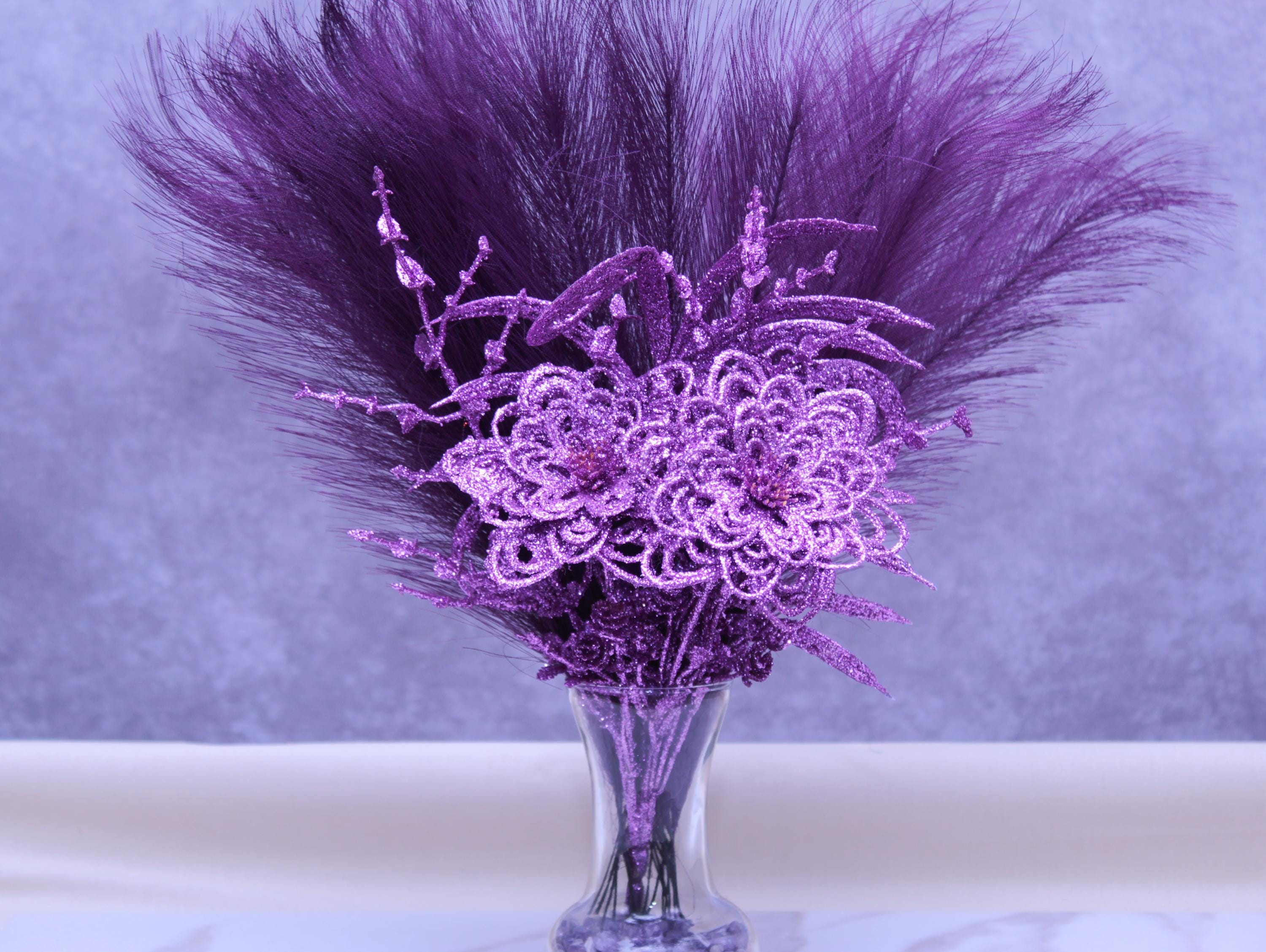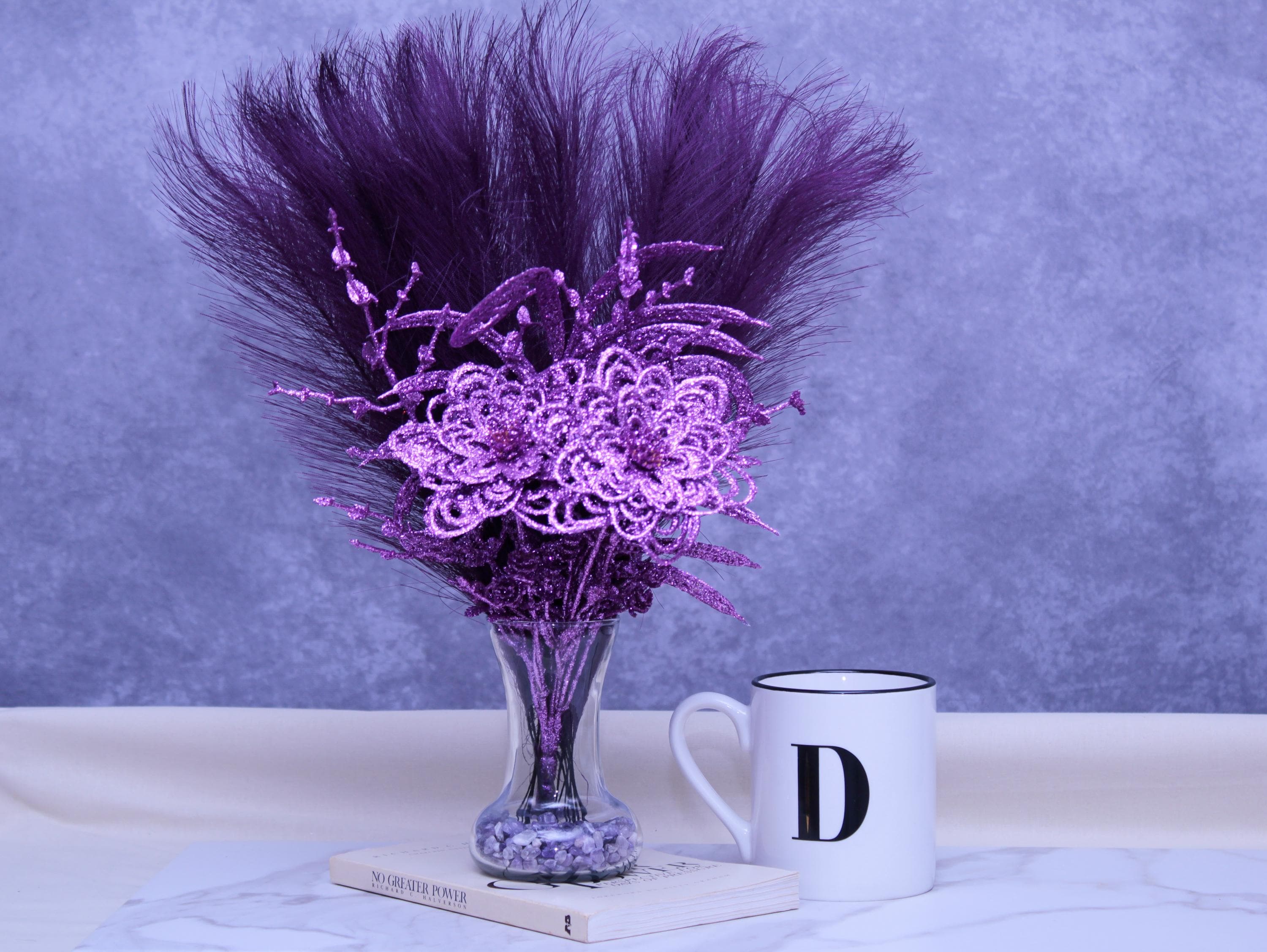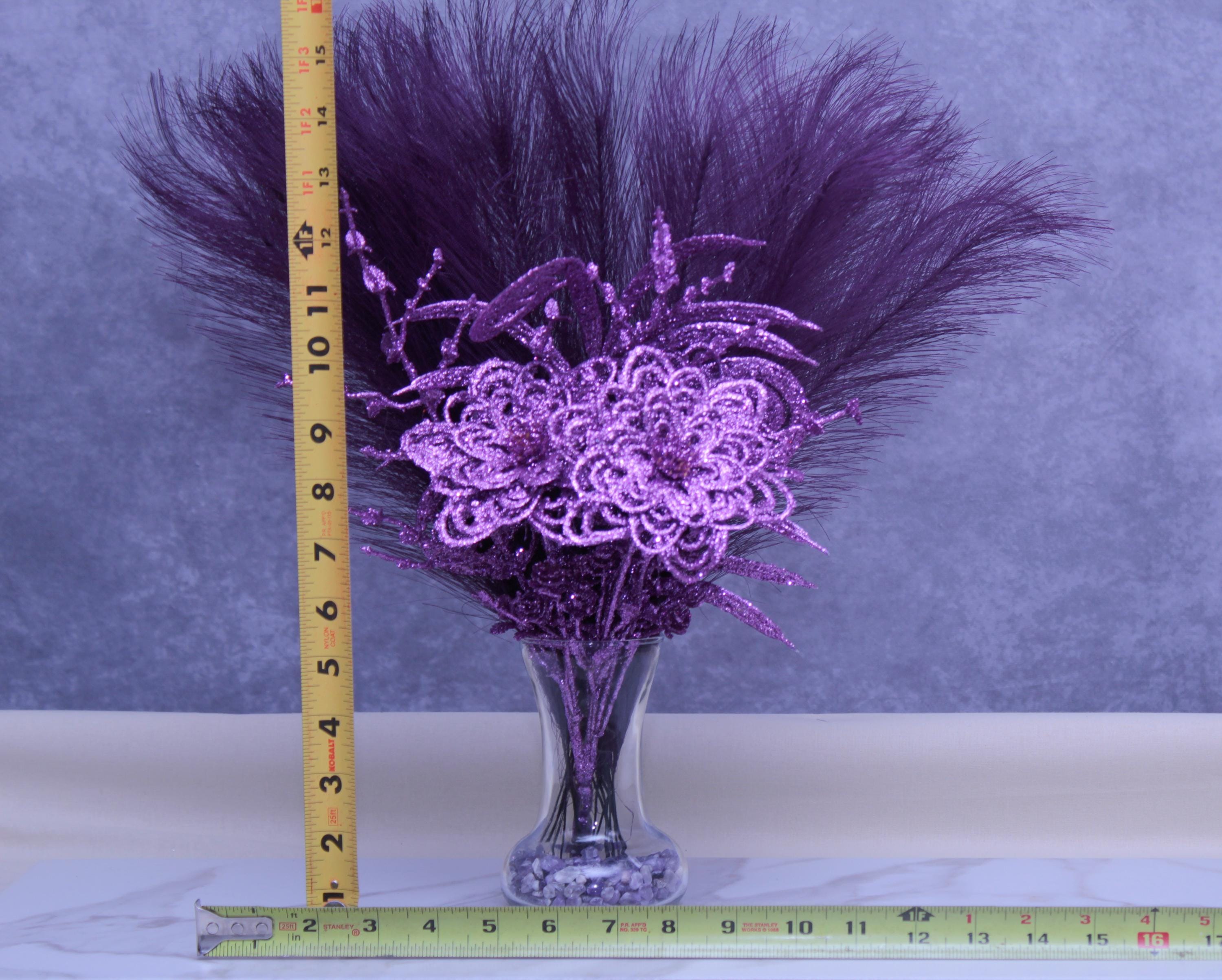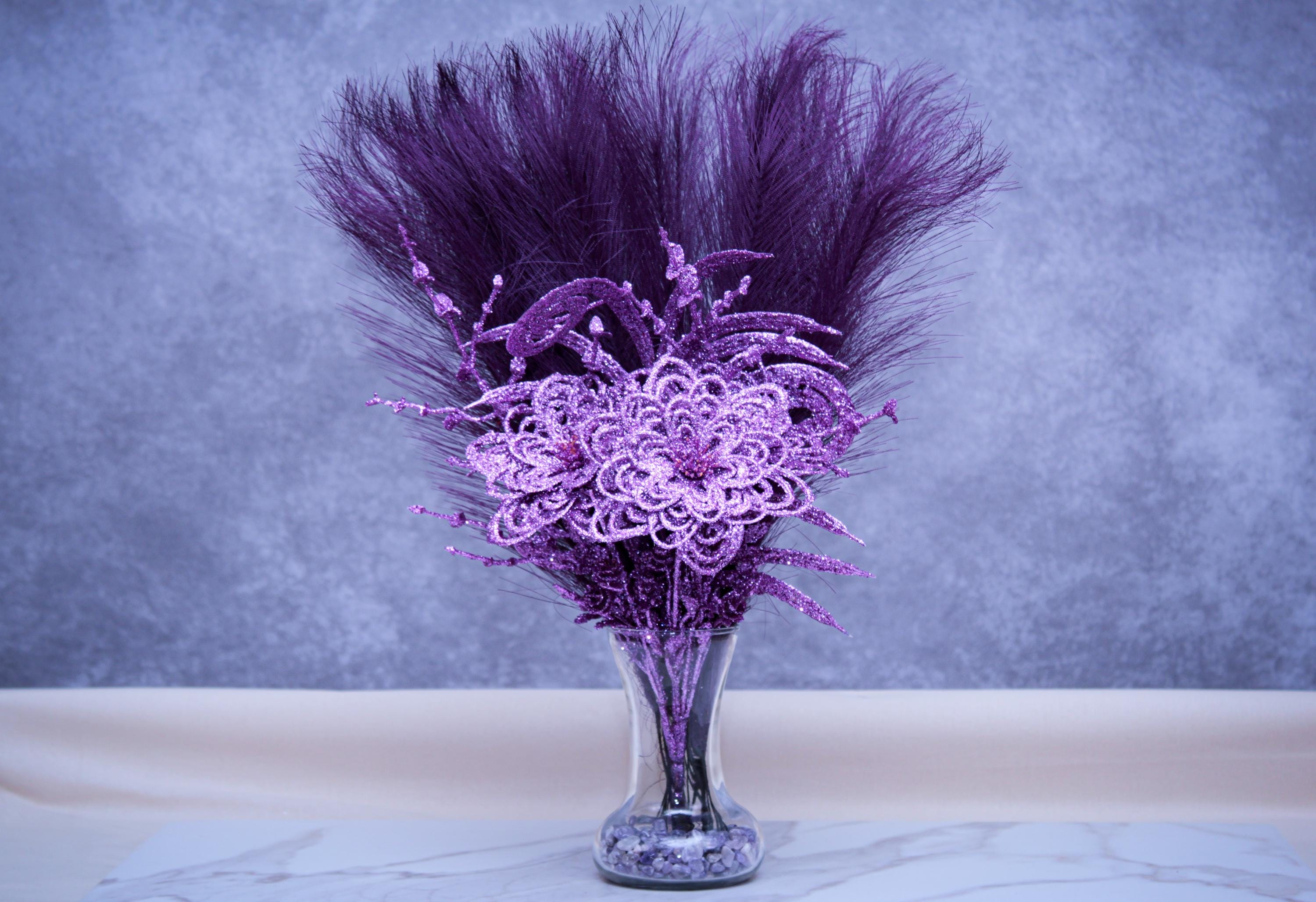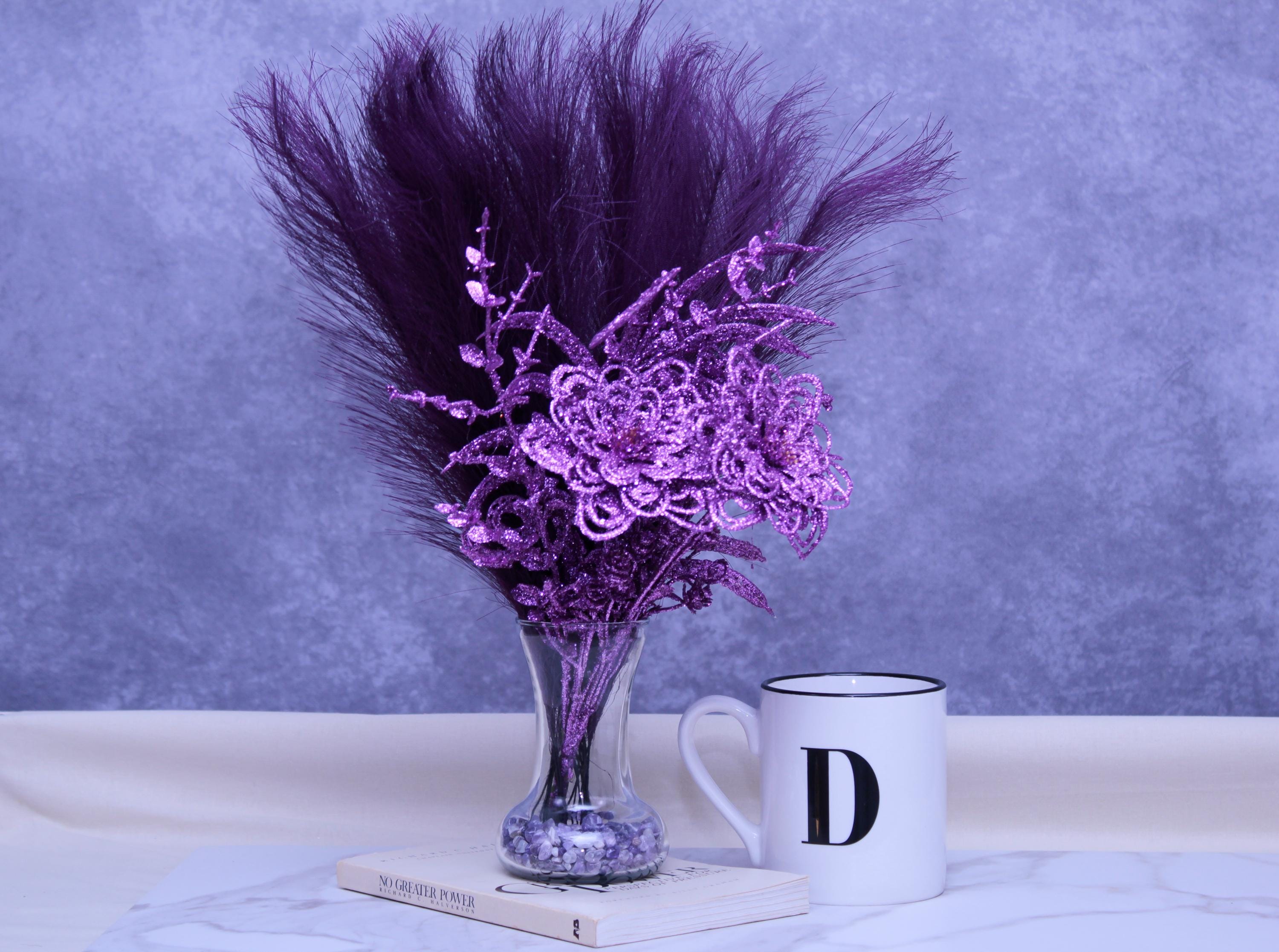 Faux pampas grass stems, purple sparkle floral picks / glitter accents, clear glass vase, neutral stone vase filler.