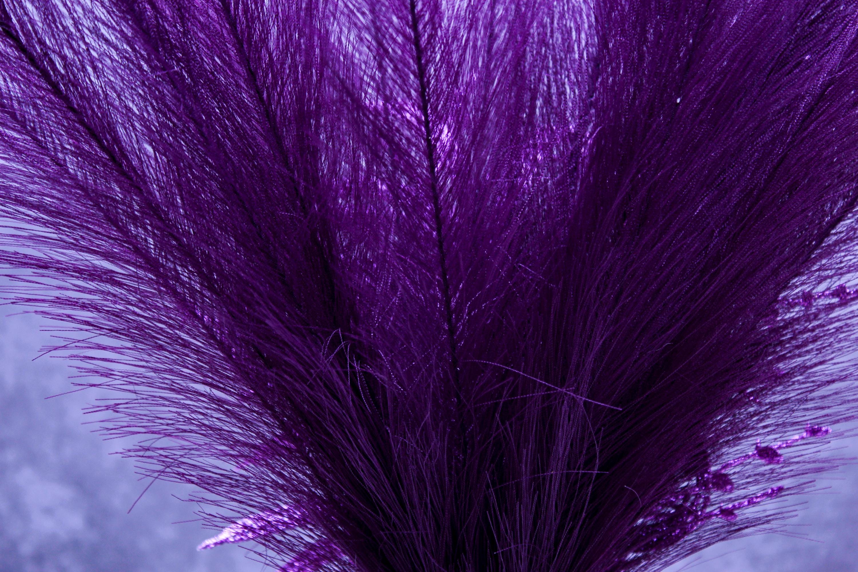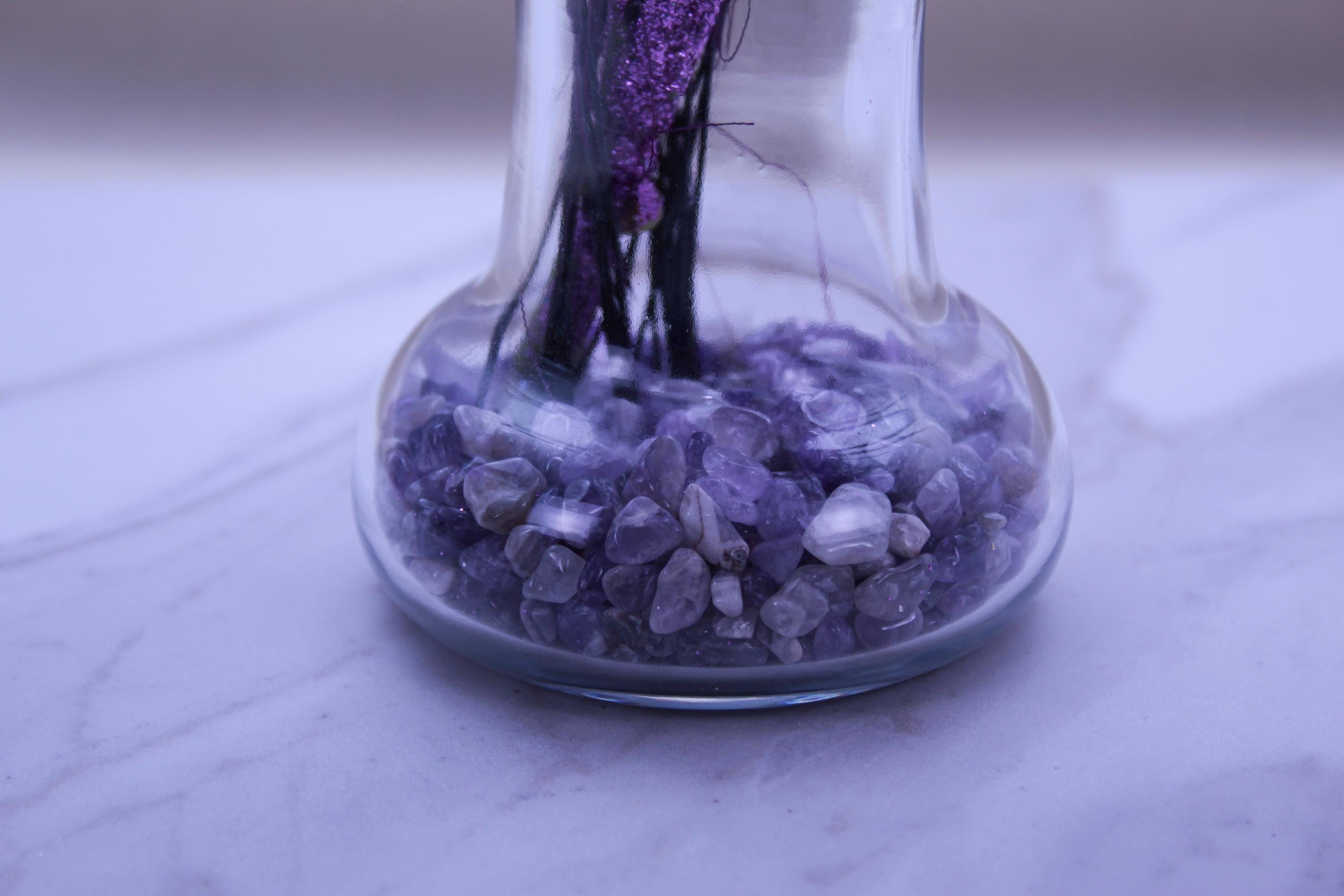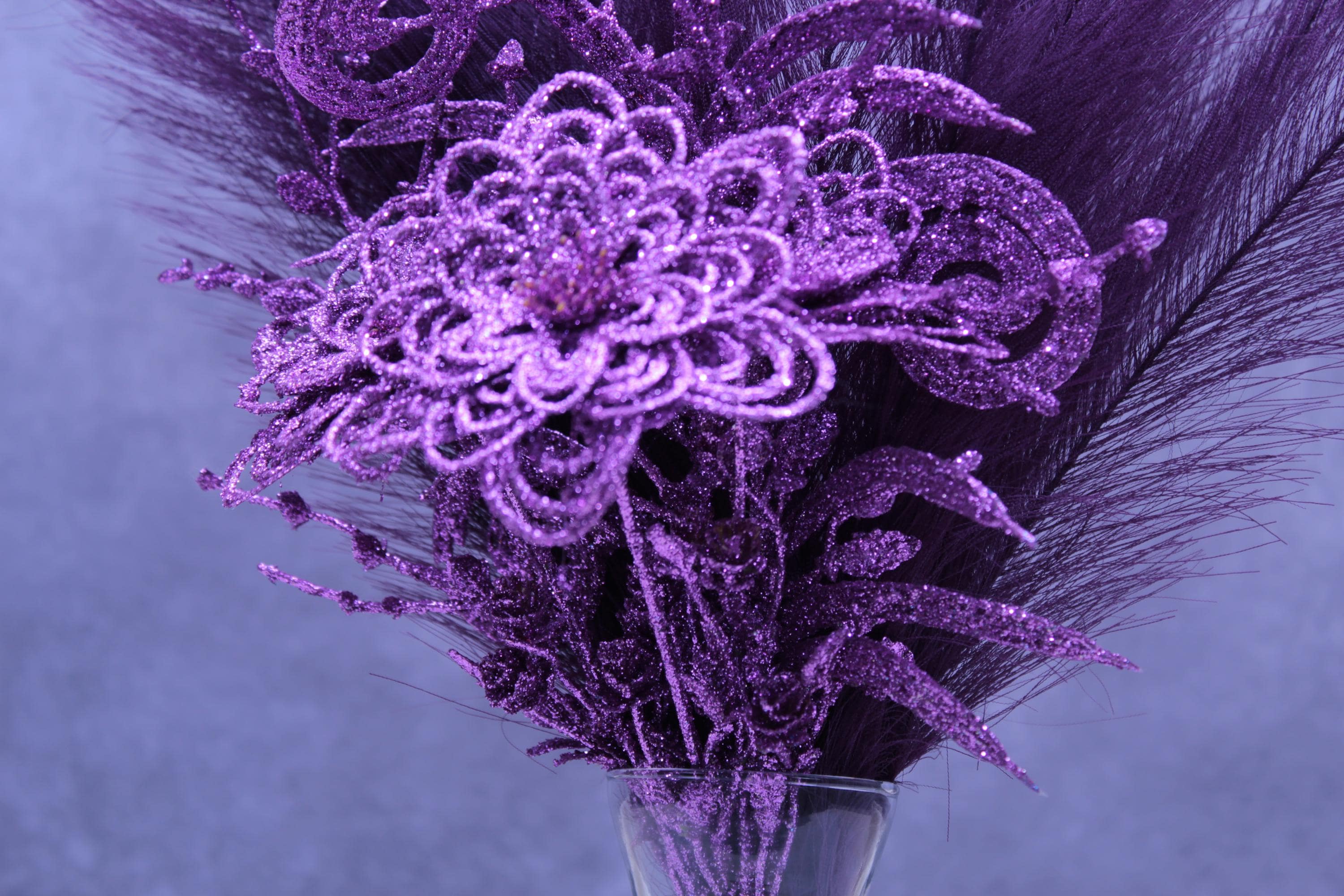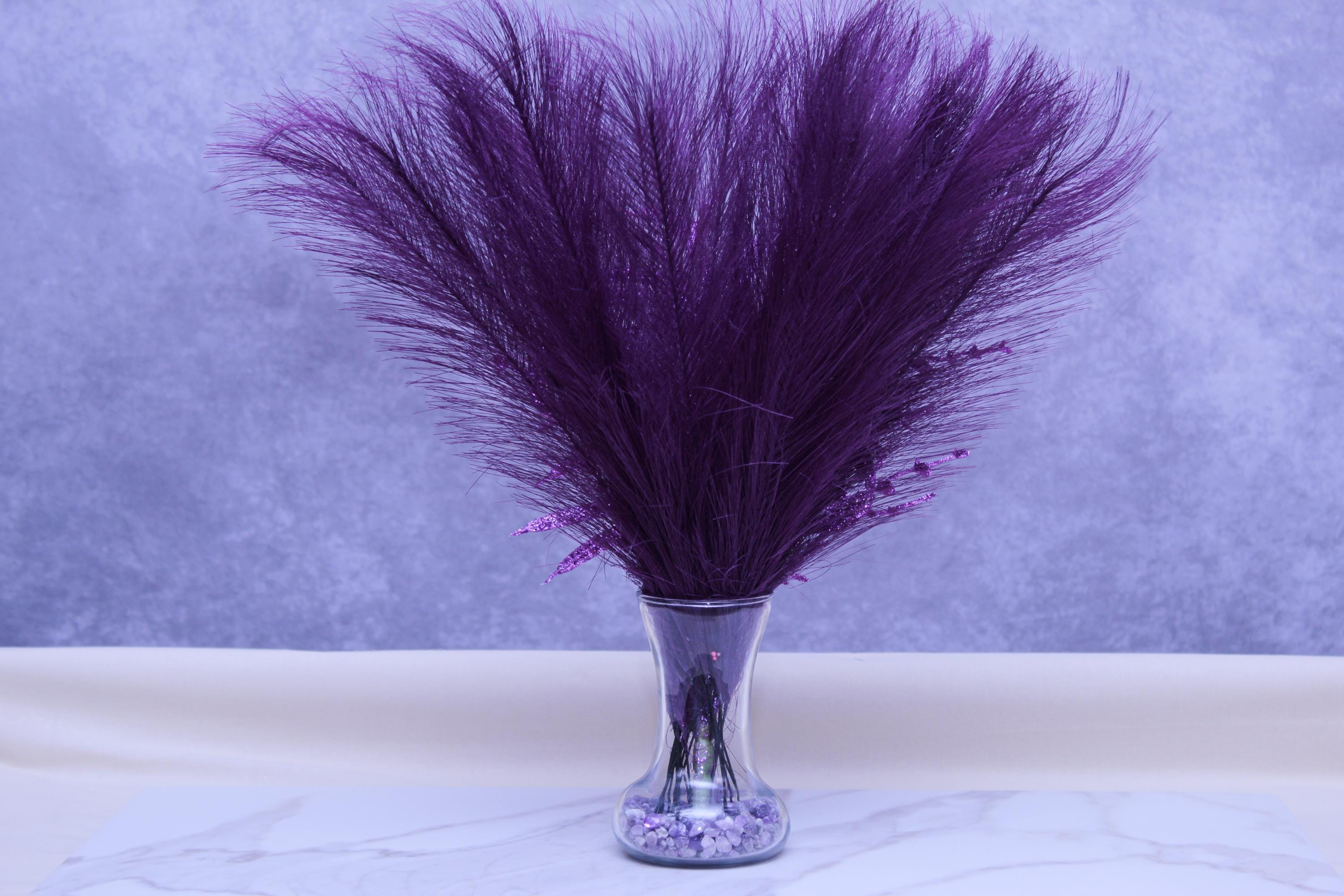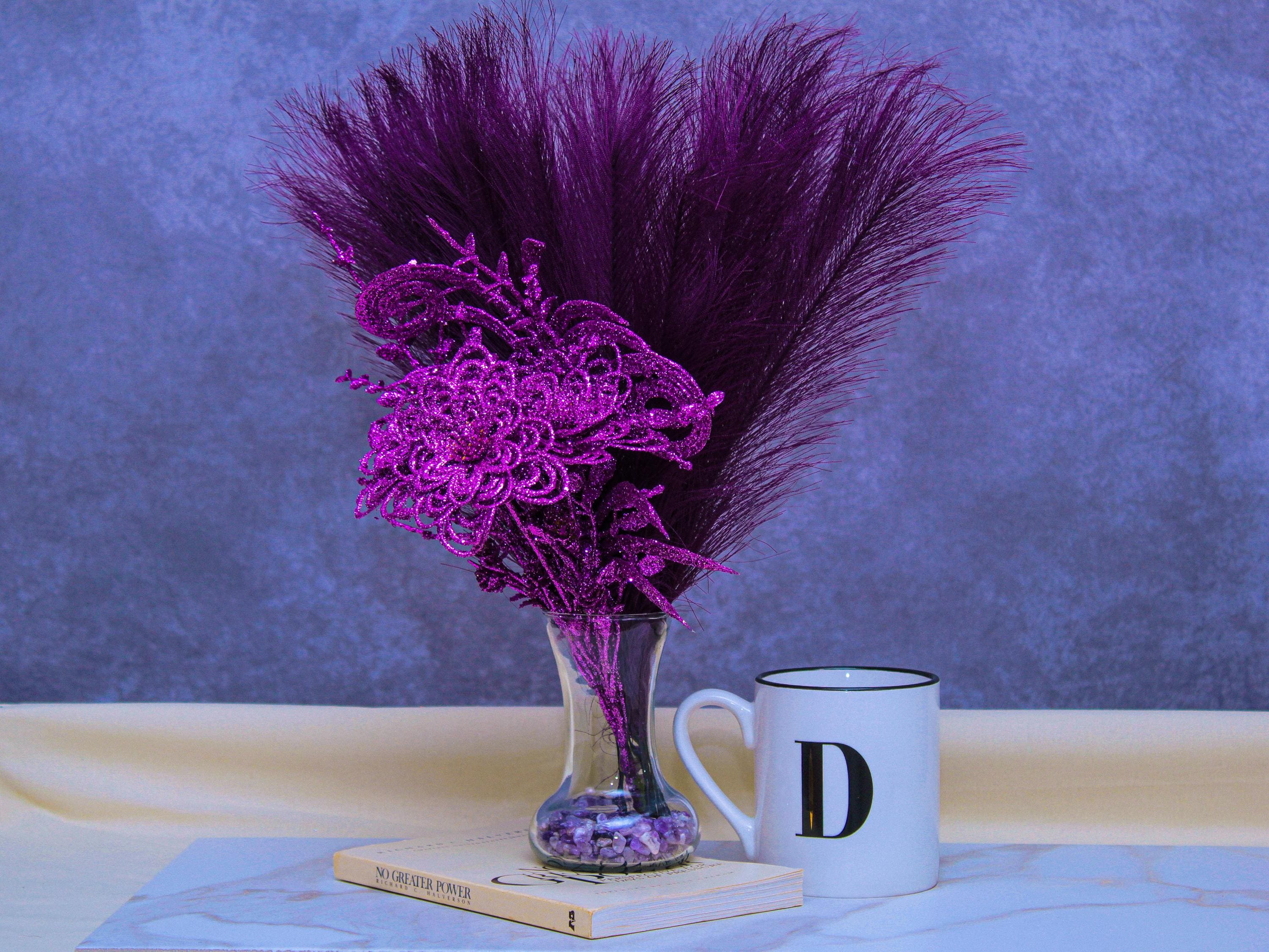 Faux pampas grass stems, purple sparkle floral picks / glitter accents, clear glass vase, neutral stone vase filler.