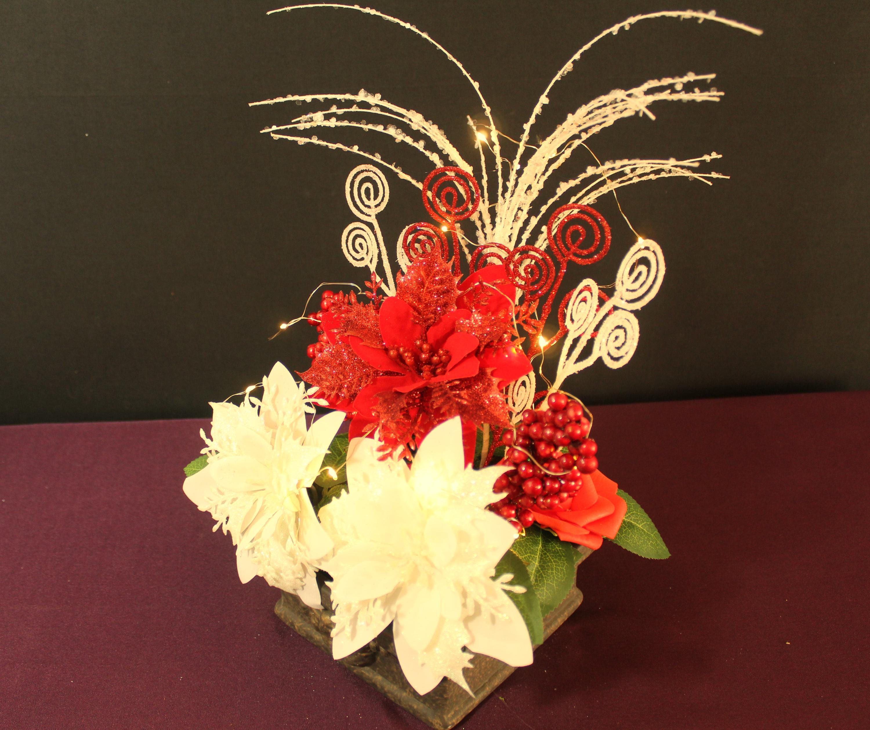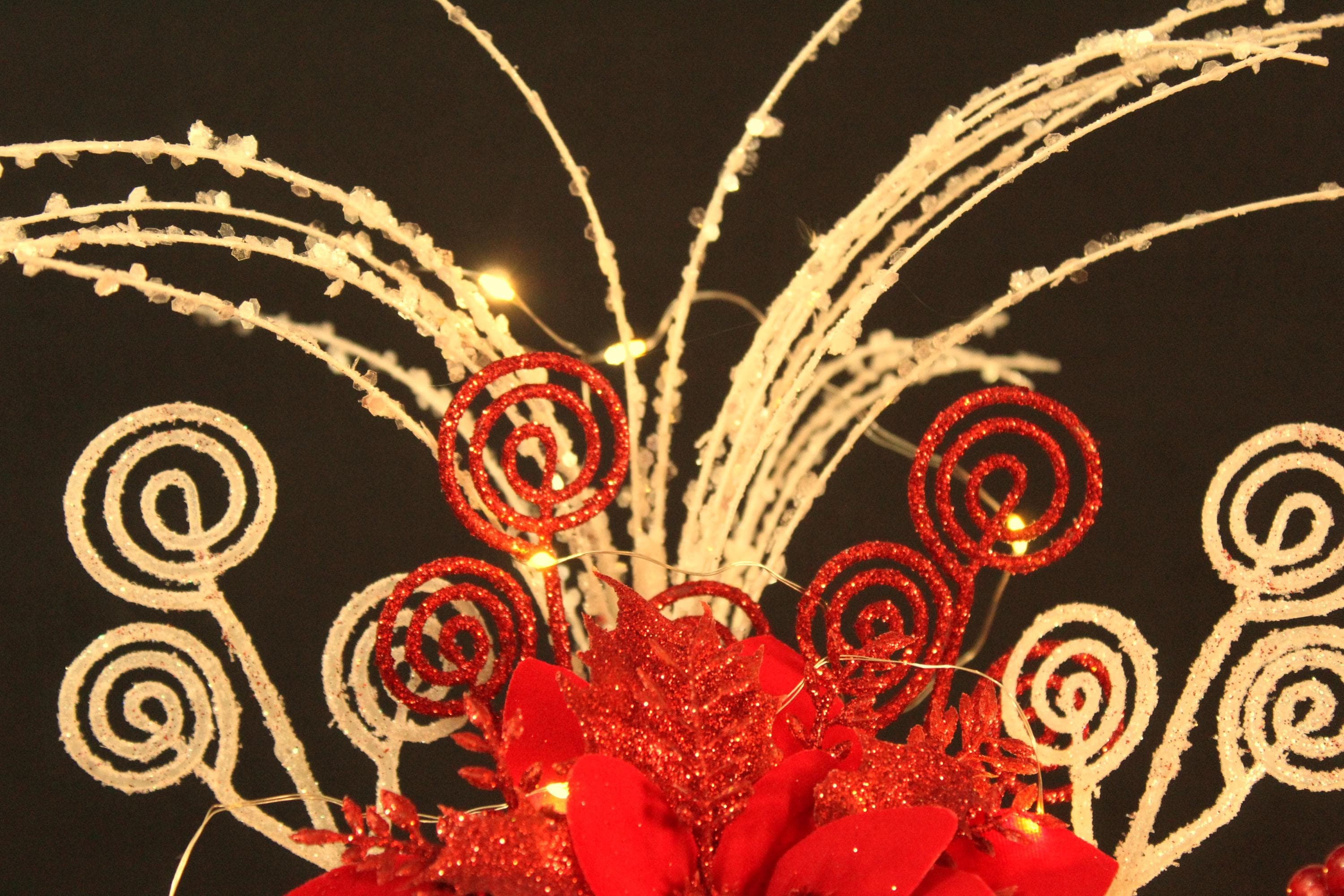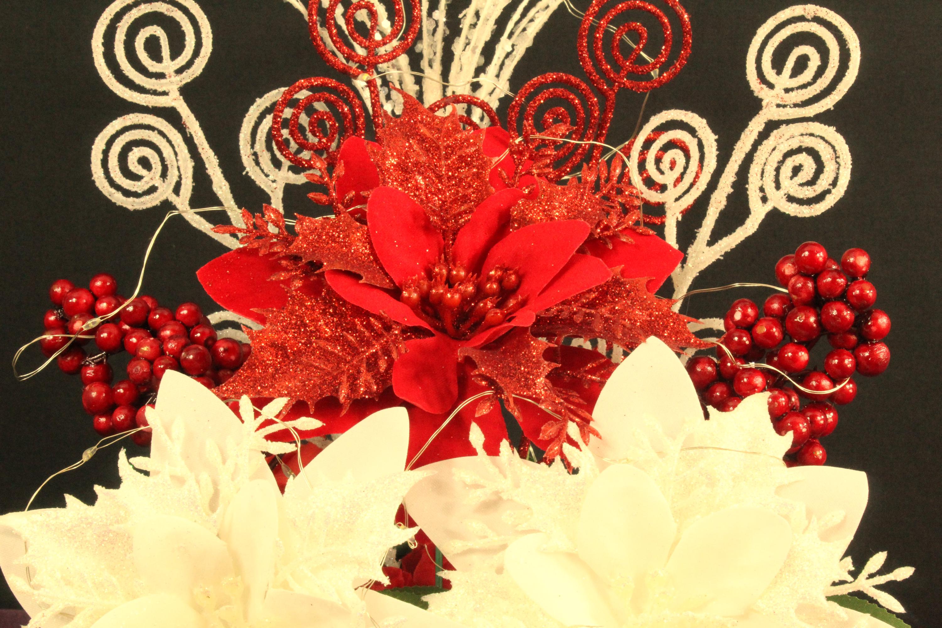 Brighten your holiday decor with this vibrant centerpiece featuring red glitter and white poinsettias, festive berries, candy swirls, sparkling glitter trees, and a mix of rose heads and mini roses. Nestled in a rustic, majestic container and illuminated with warm LED lights, this arrangement brings a joyful and elegant touch to any Christmas setting. Perfect for holiday tables, mantels, or entryways, this centerpiece combines festive colors with sophisticated charm.