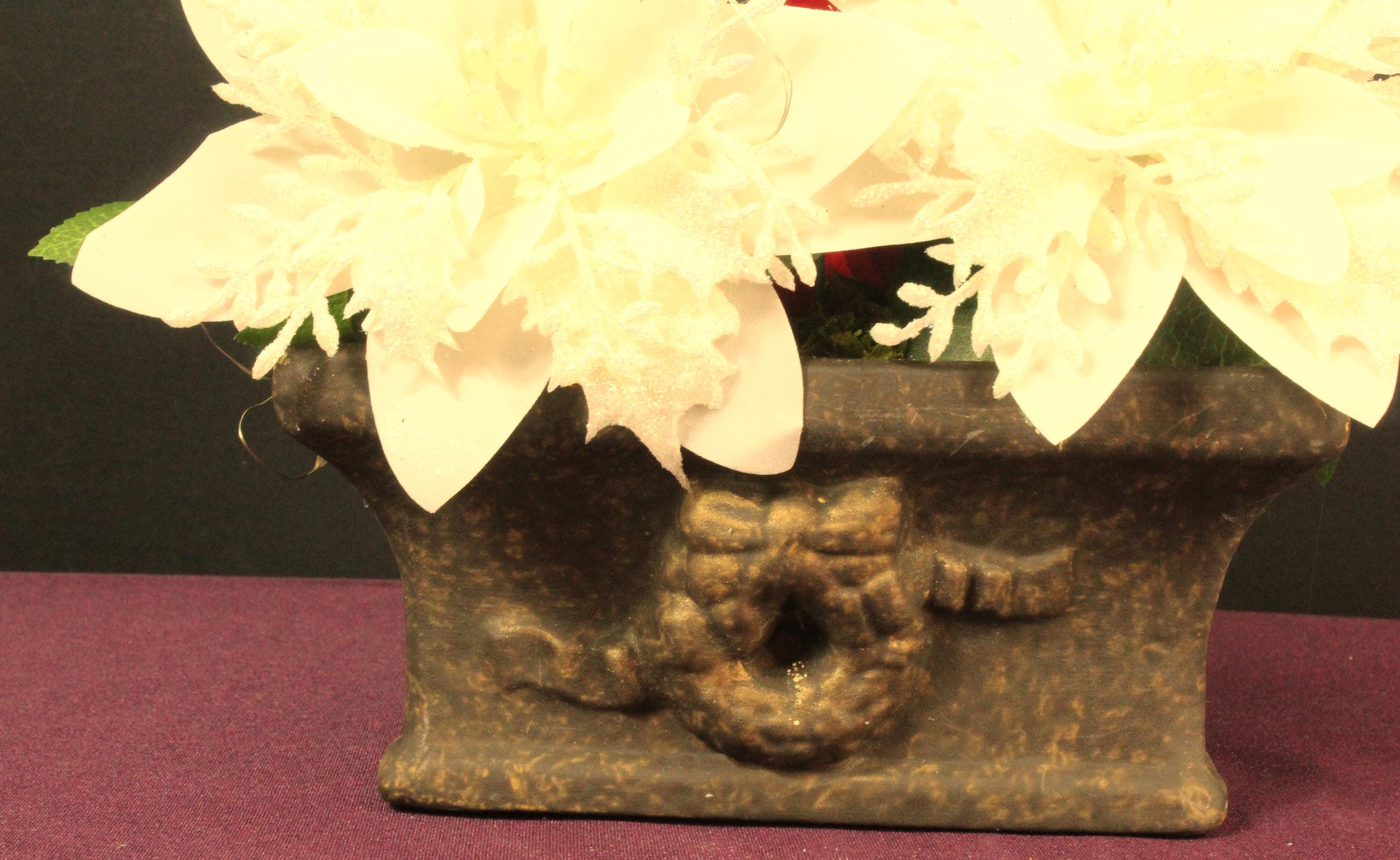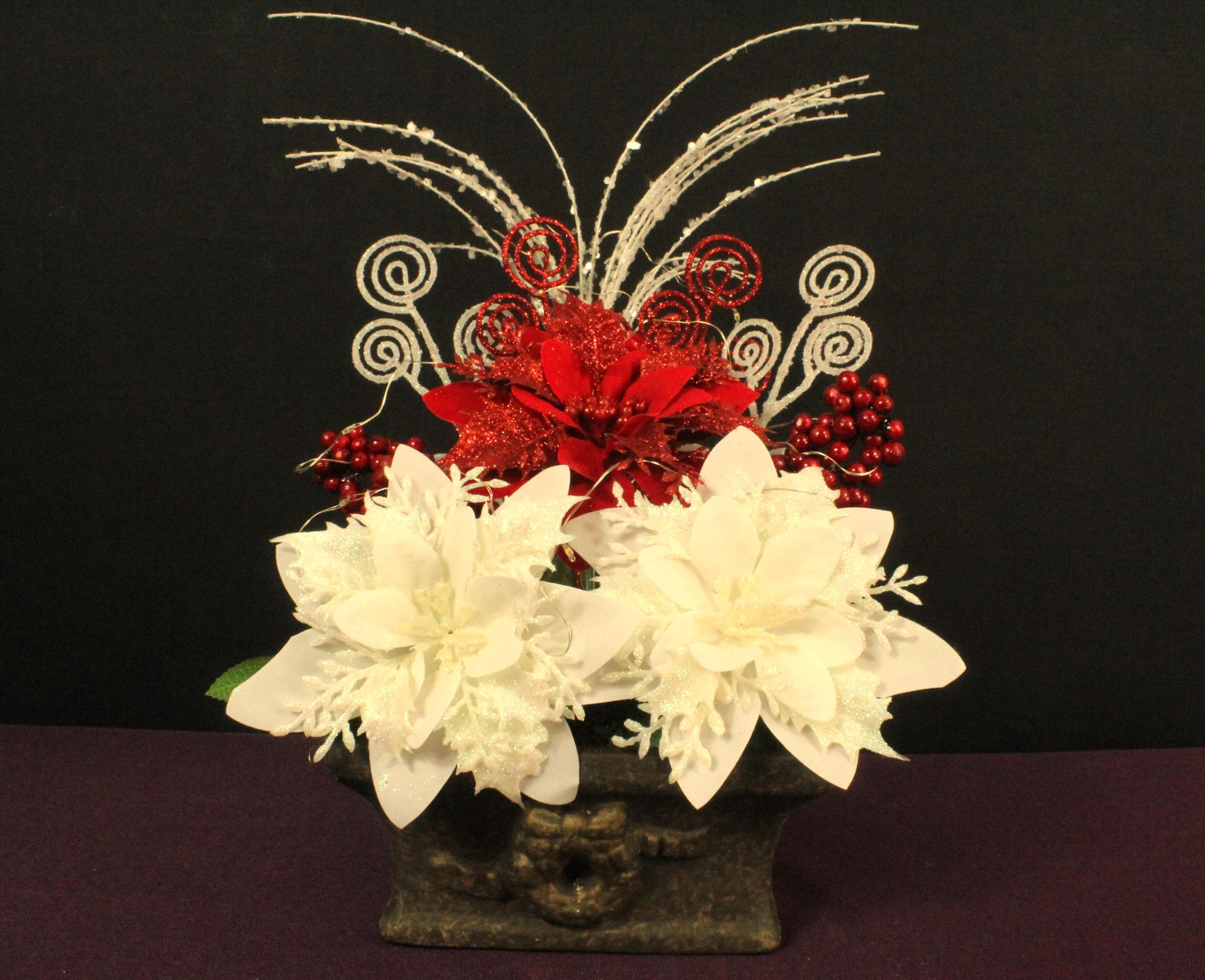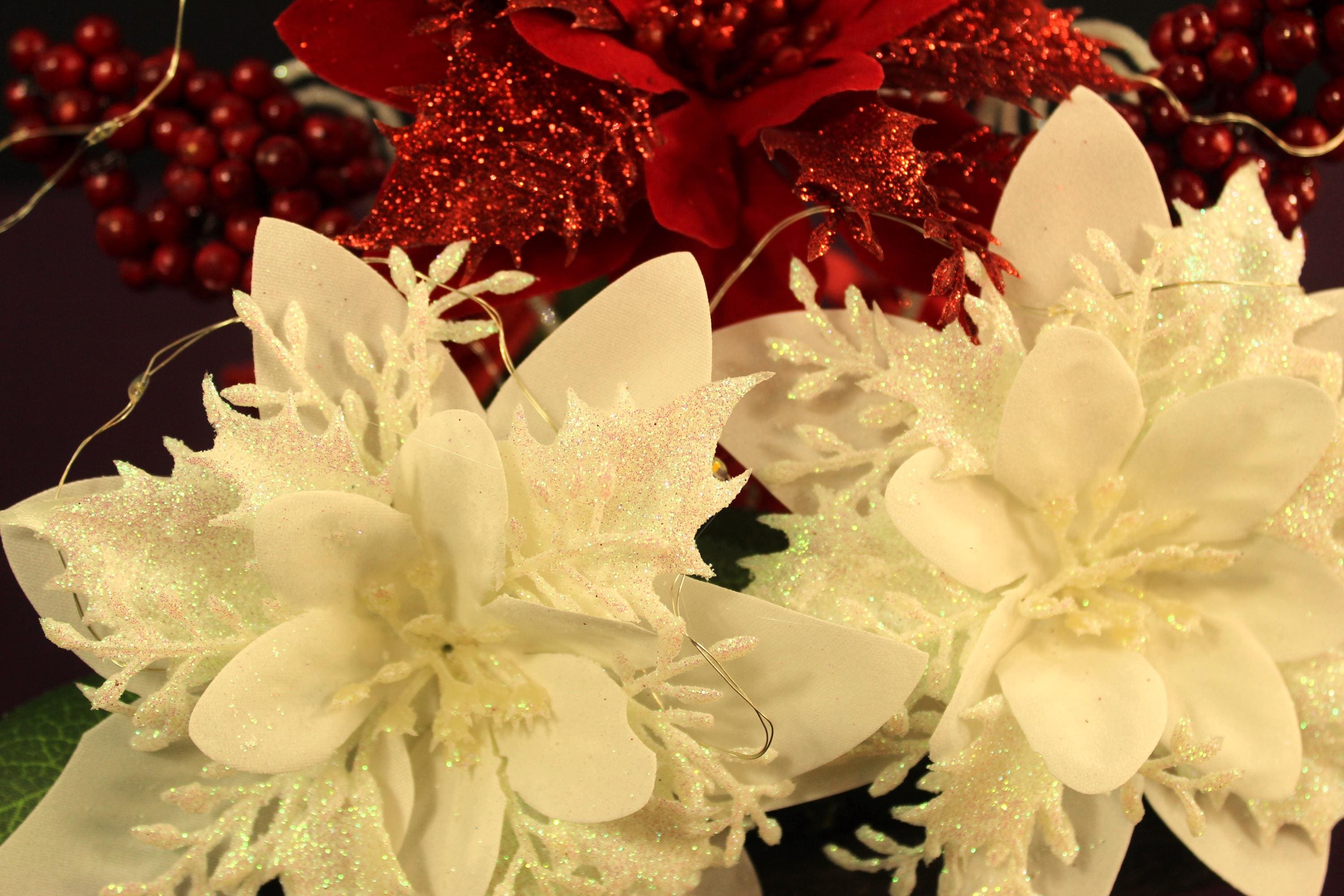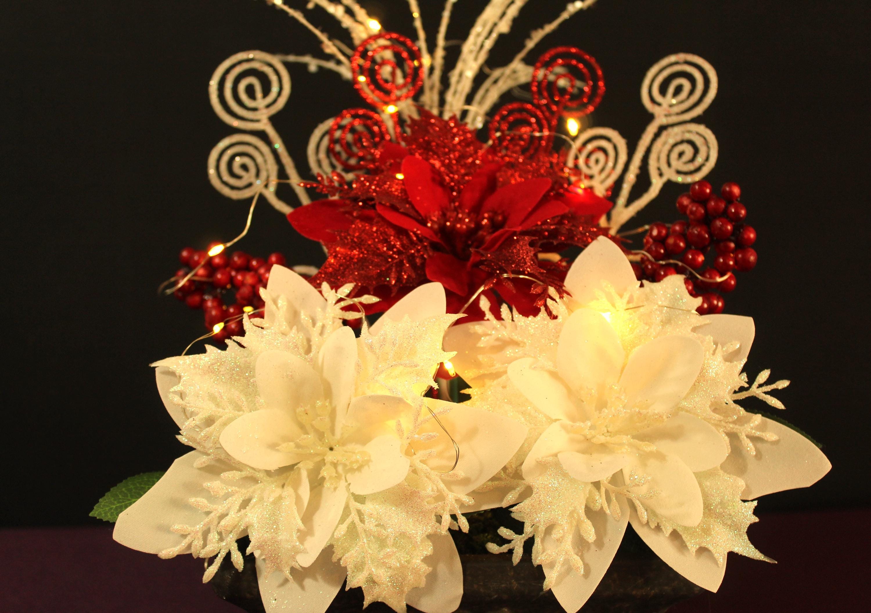 Brighten your holiday decor with this vibrant centerpiece featuring red glitter and white poinsettias, festive berries, candy swirls, sparkling glitter trees, and a mix of rose heads and mini roses. Nestled in a rustic, majestic container and illuminated with warm LED lights, this arrangement brings a joyful and elegant touch to any Christmas setting. Perfect for holiday tables, mantels, or entryways, this centerpiece combines festive colors with sophisticated charm.