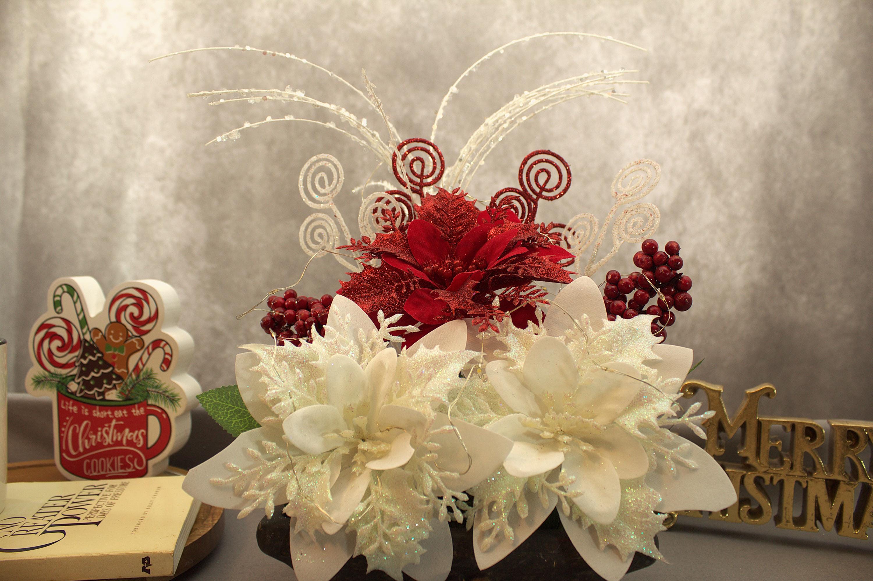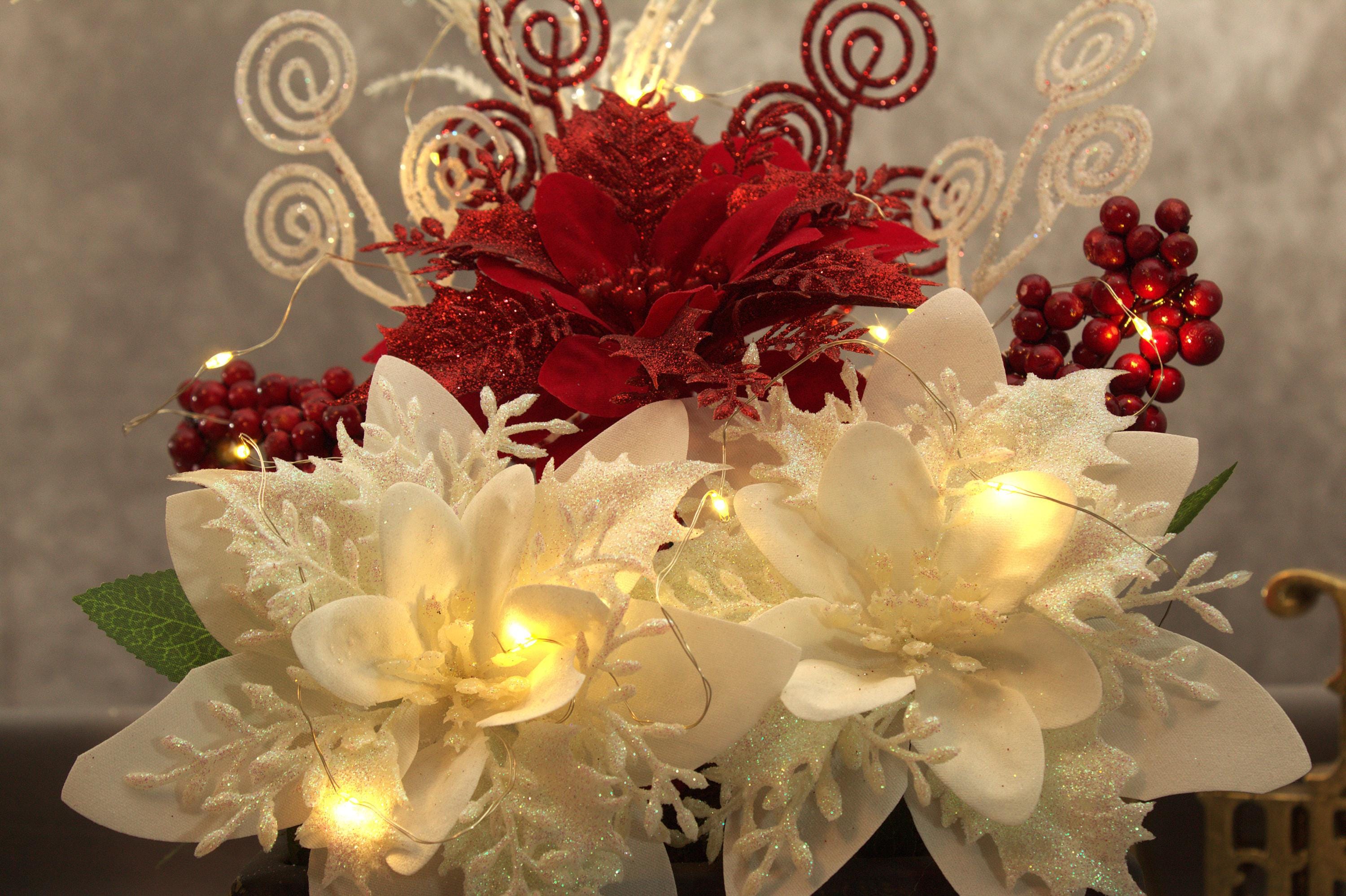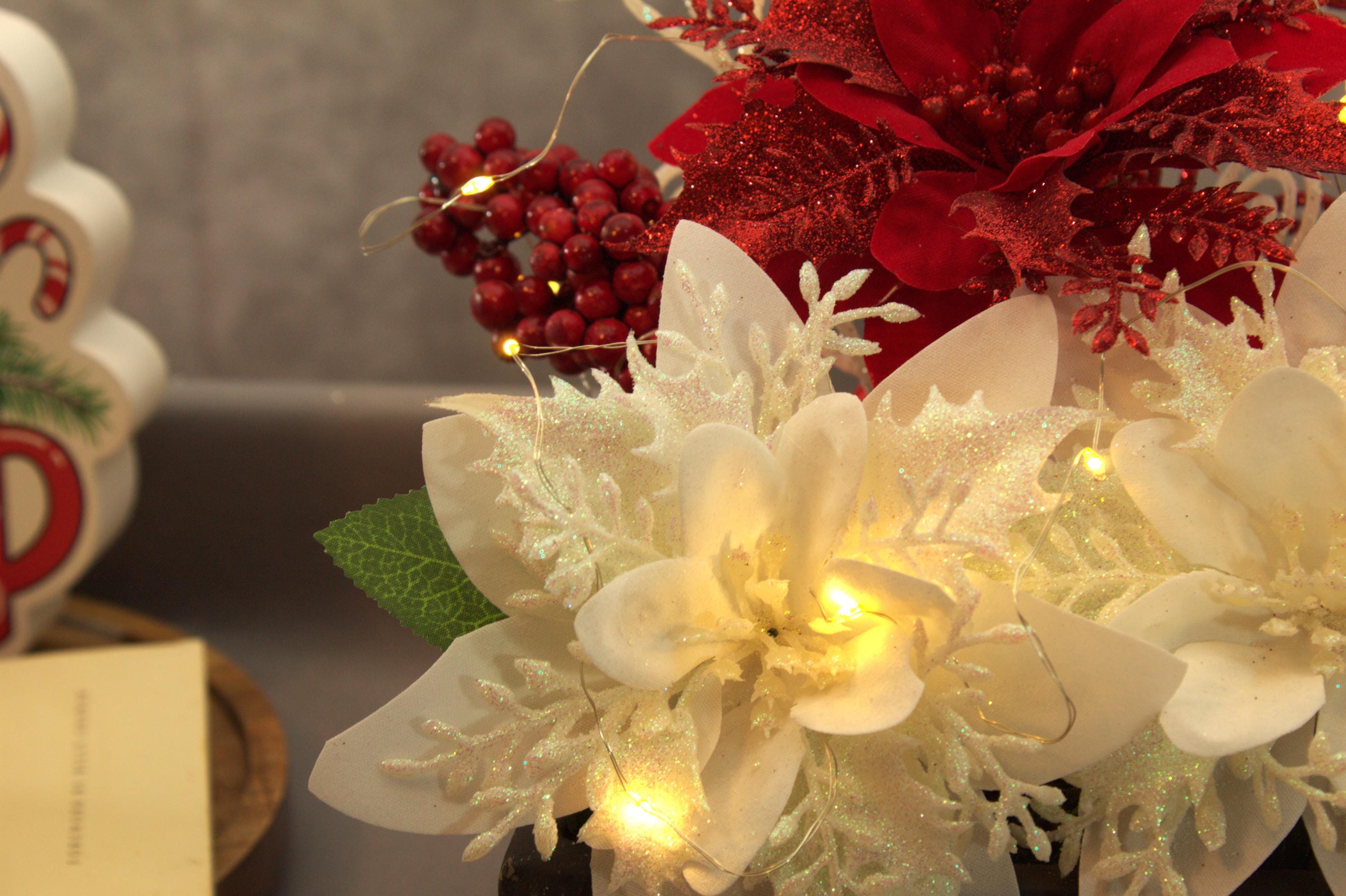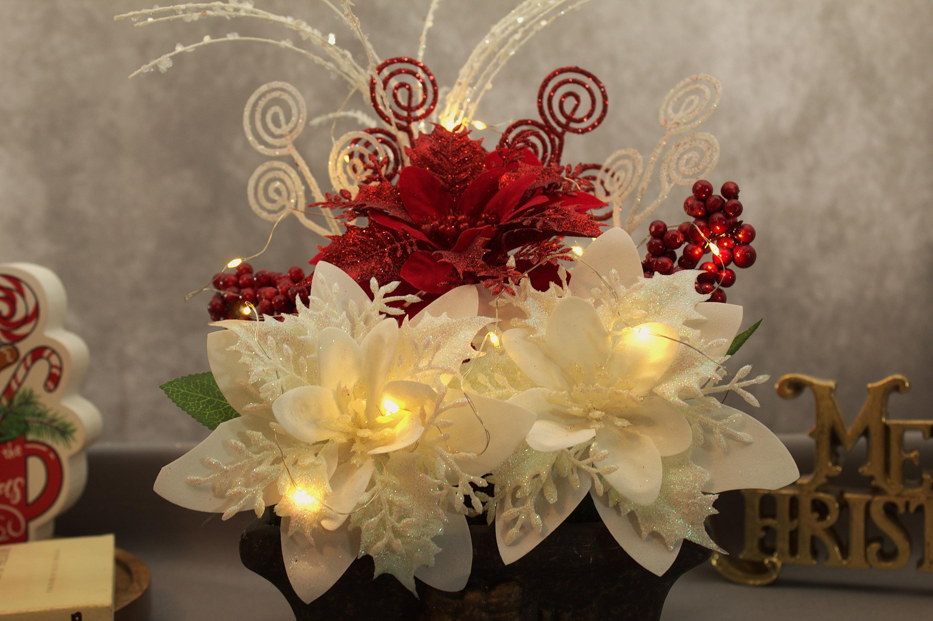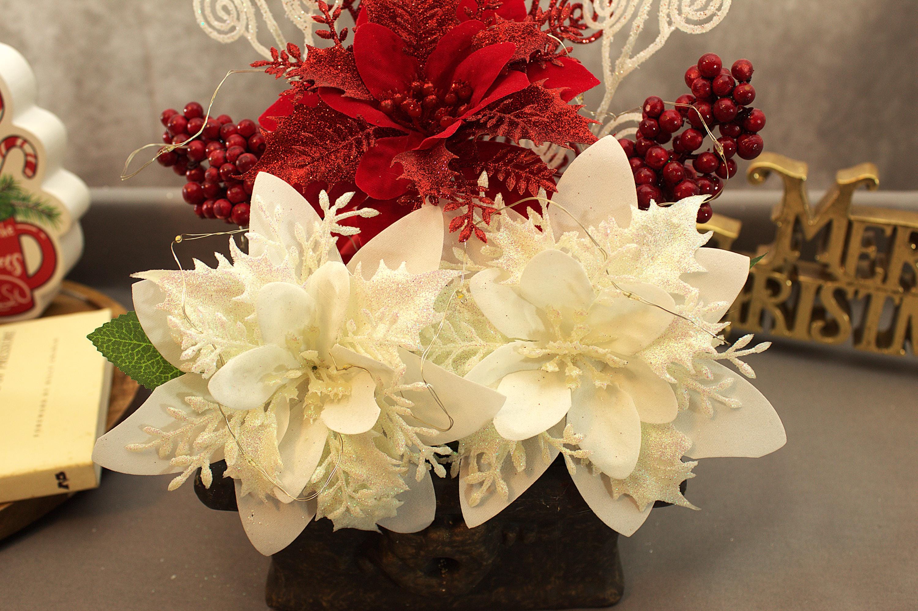 Brighten your holiday décor with this vibrant red and white poinsettia Christmas centerpiece. Red glitter poinsettias, creamy white poinsettias, red holly berries, candy swirls, and sparkling glitter trees burst from a rustic stone-style container, all softly illuminated by warm LED lights.