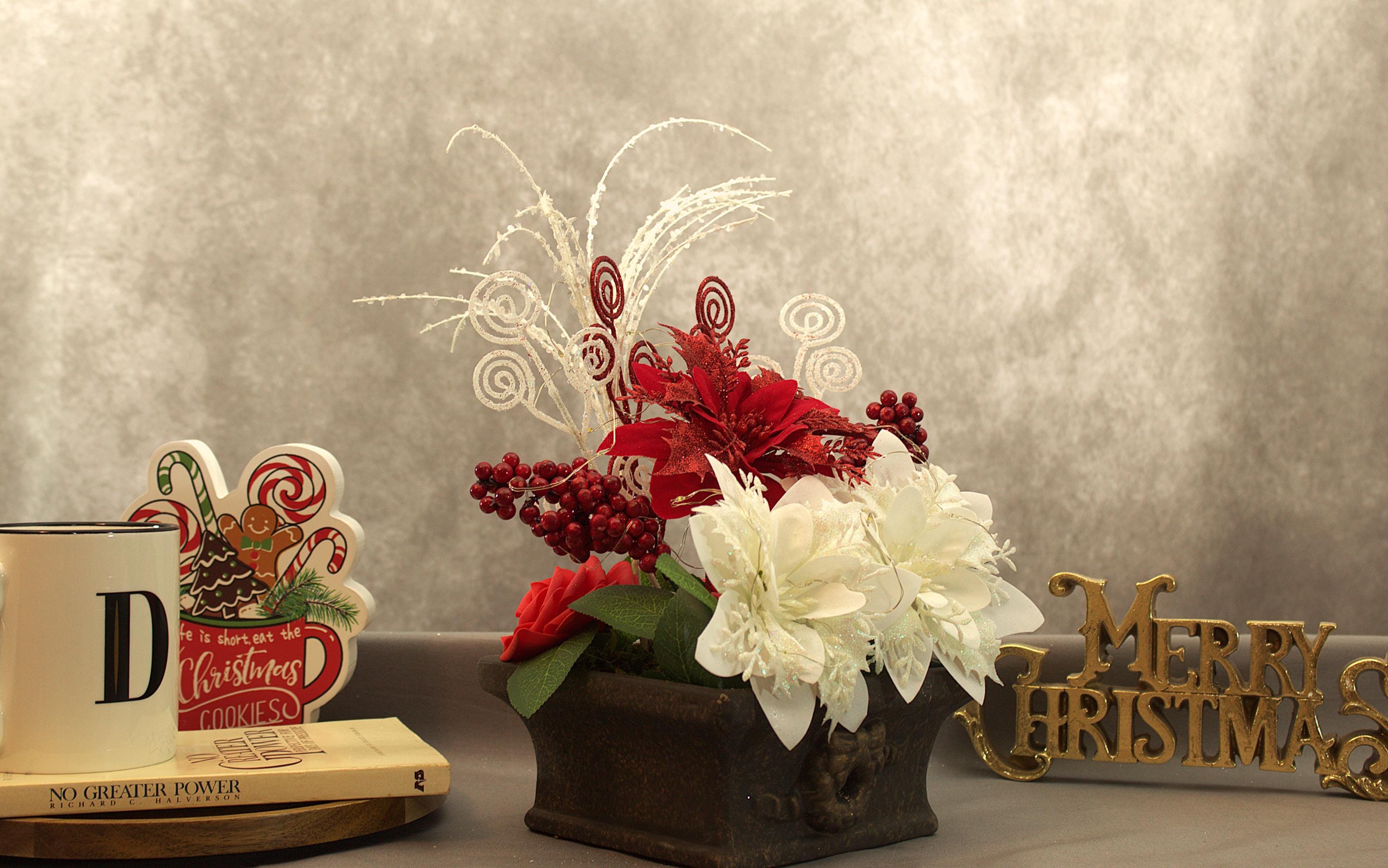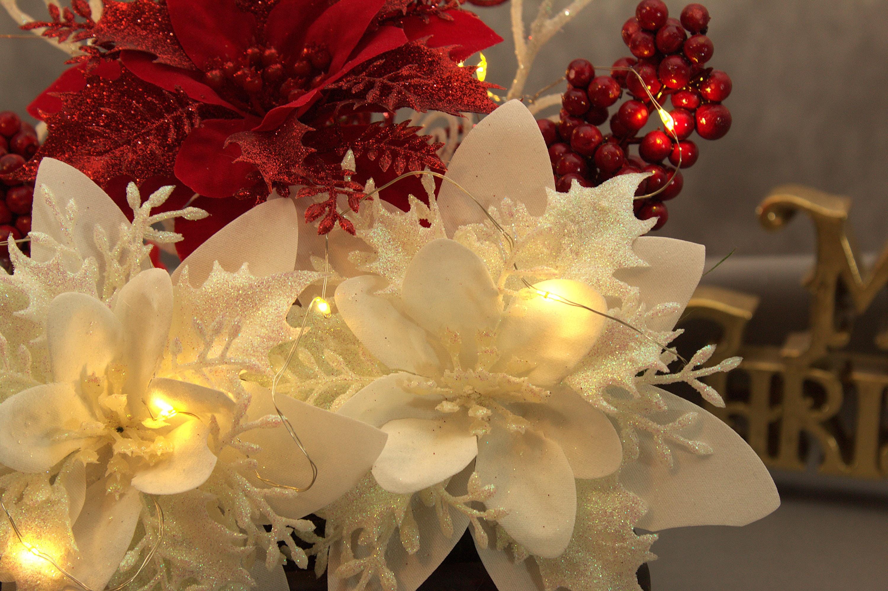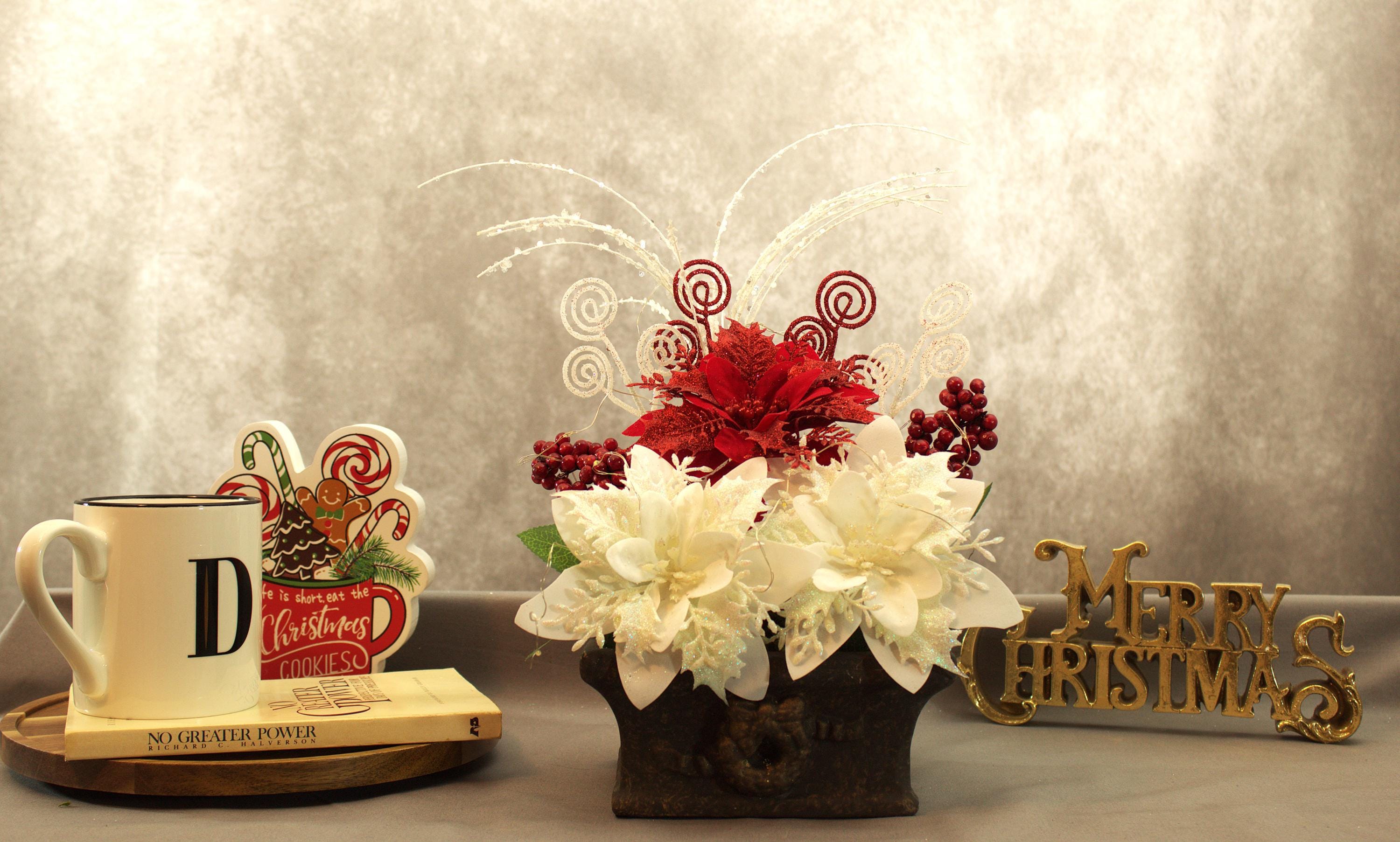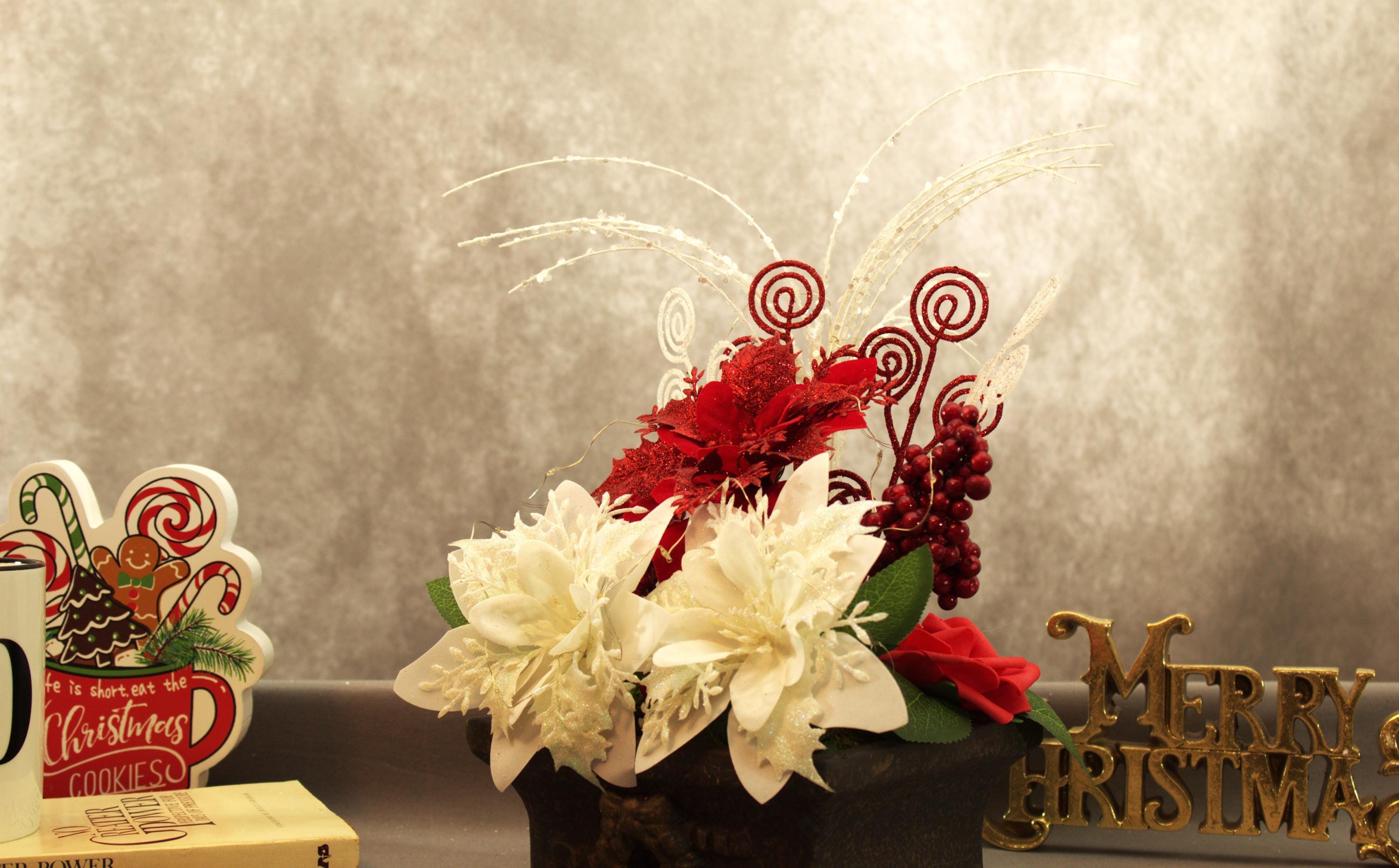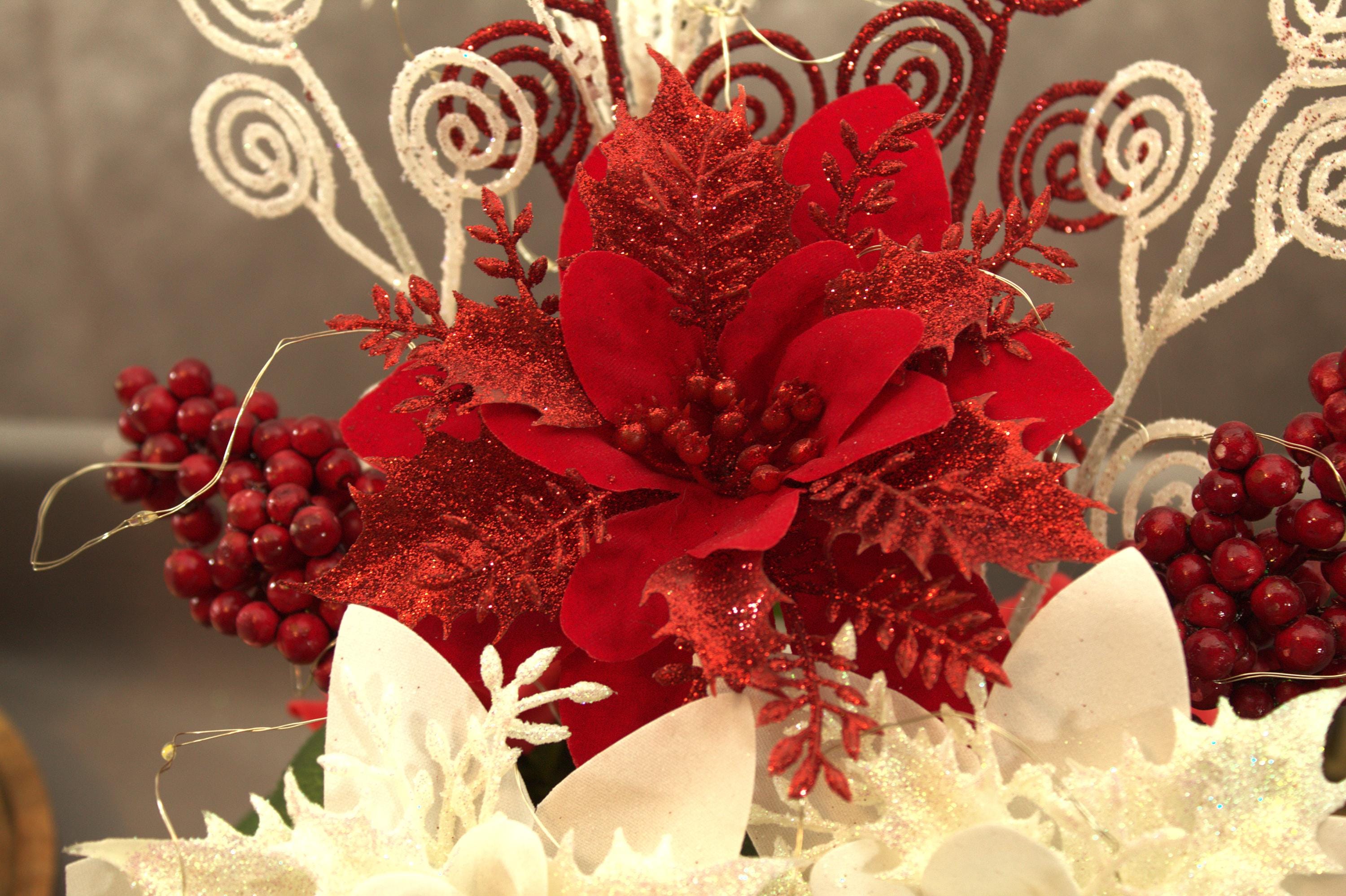 Brighten your holiday décor with this vibrant red and white poinsettia Christmas centerpiece. Red glitter poinsettias, creamy white poinsettias, red holly berries, candy swirls, and sparkling glitter trees burst from a rustic stone-style container, all softly illuminated by warm LED lights.