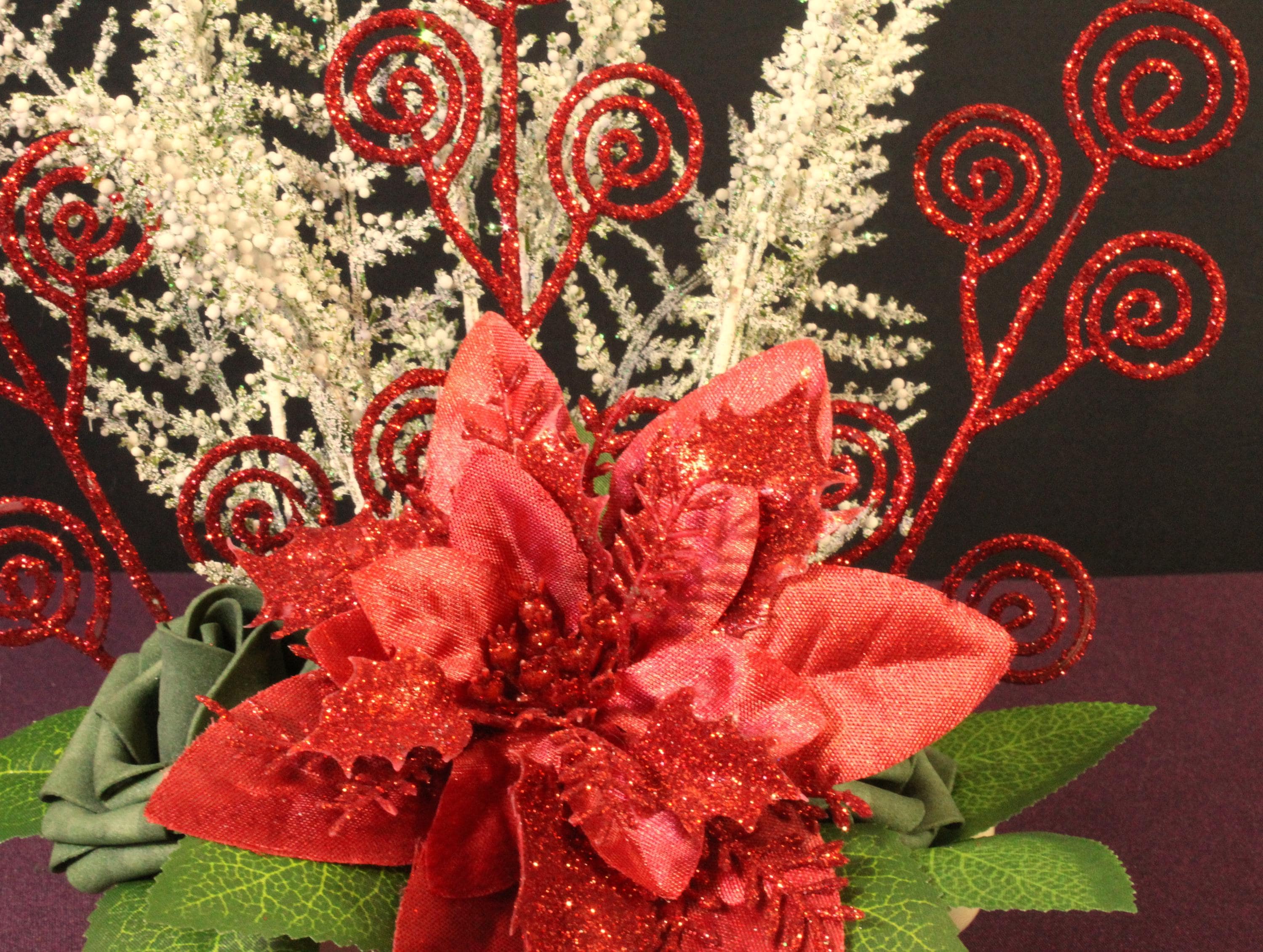 Arrangement Includes: Red poinsettias, red roses, candy swirls, small roses