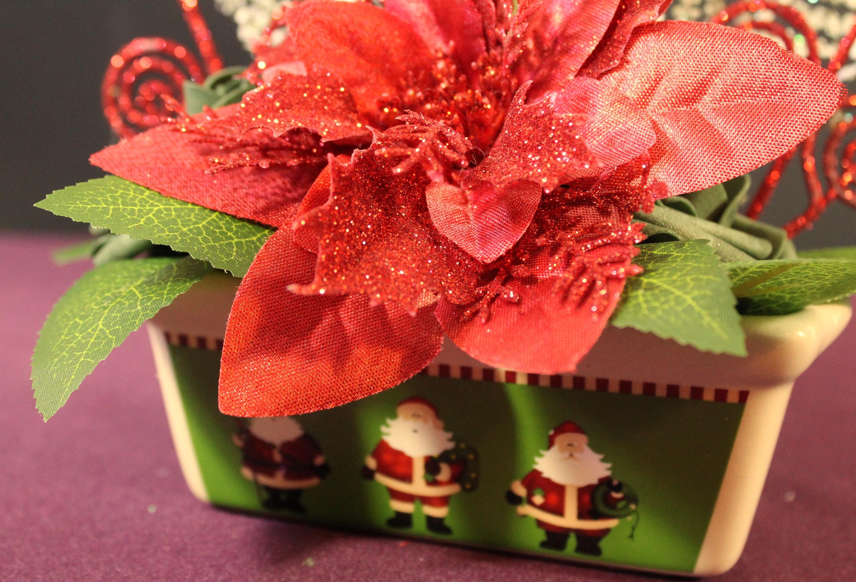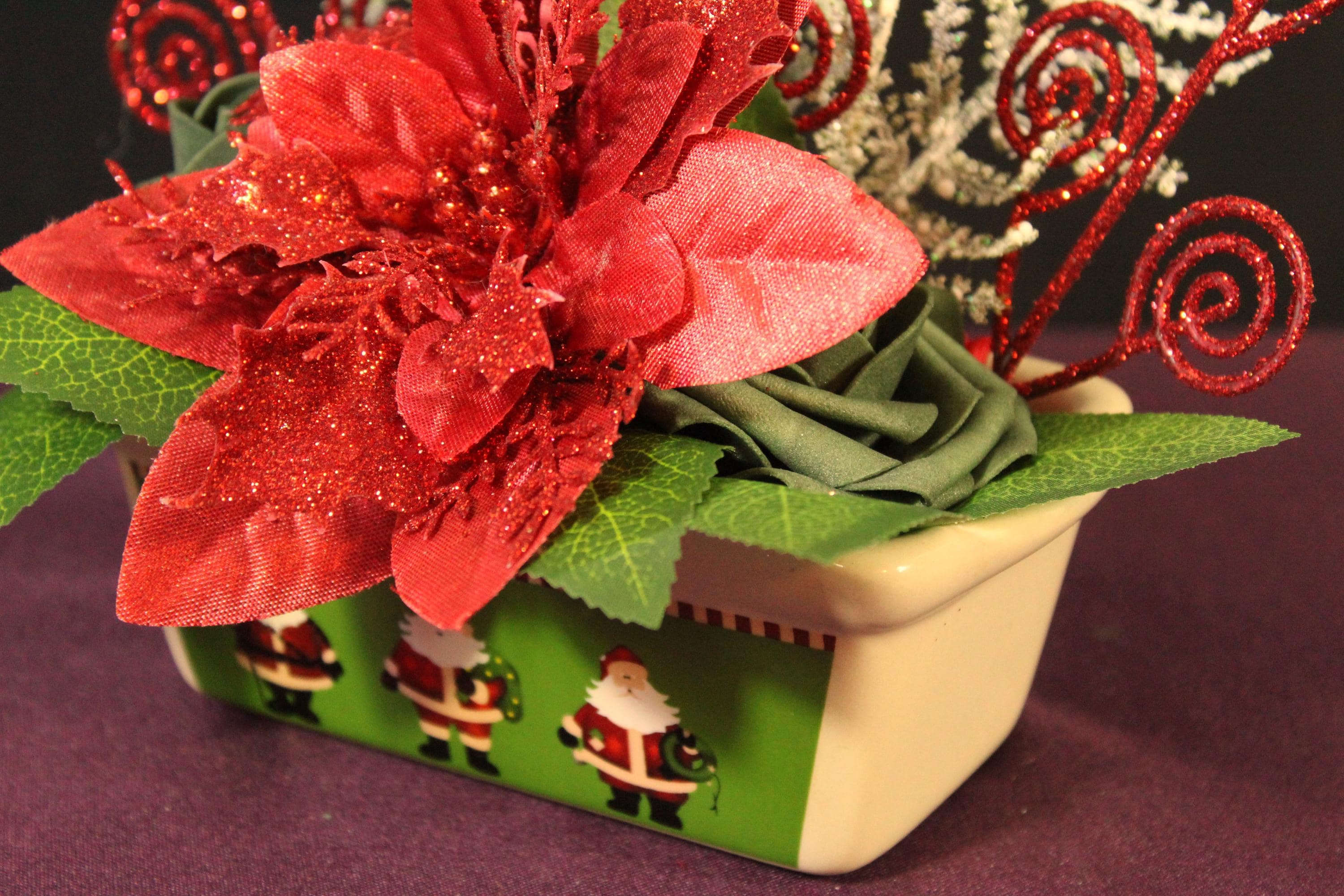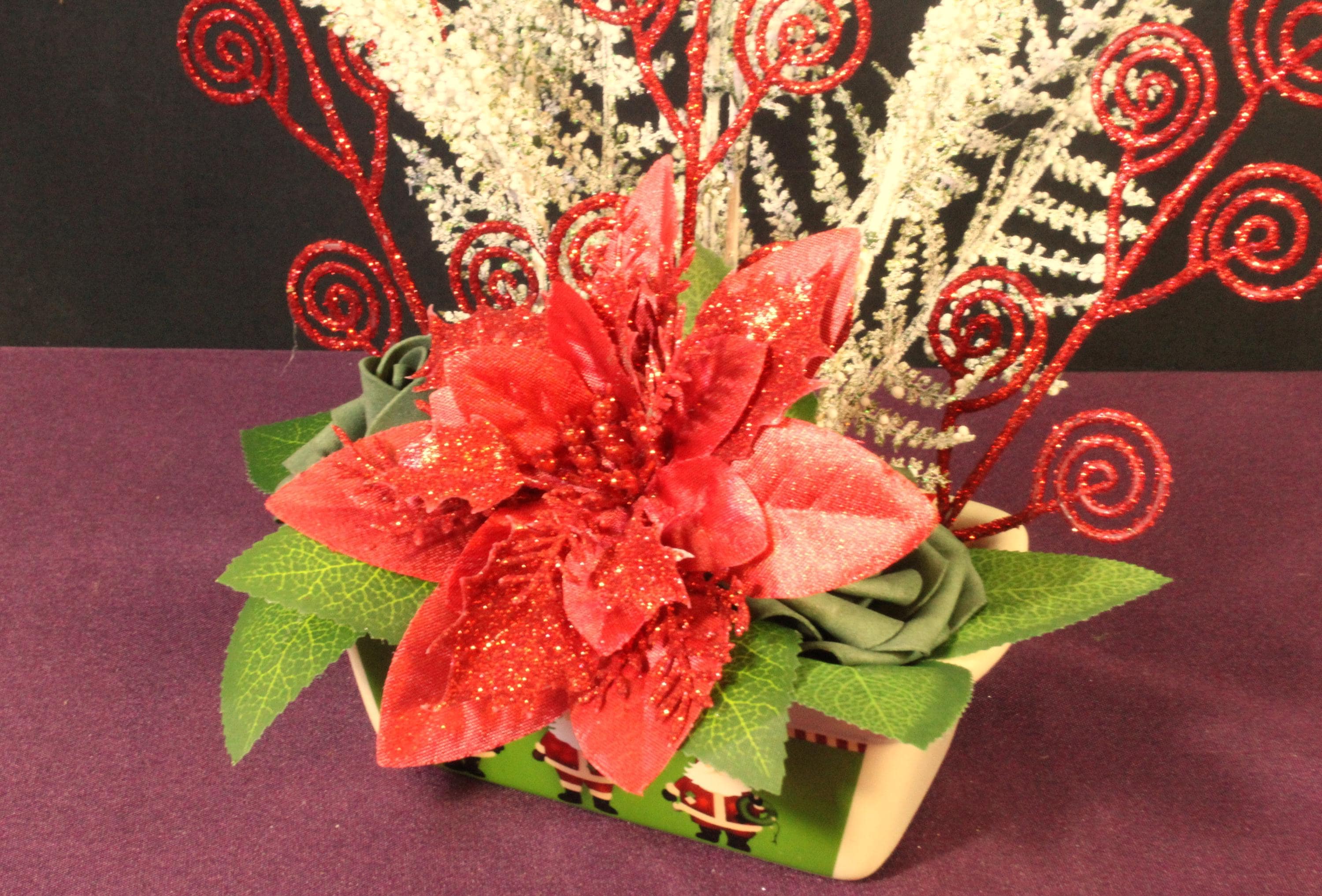 Materials: Silk flowers, artificial foliage, ceramic Santa vase