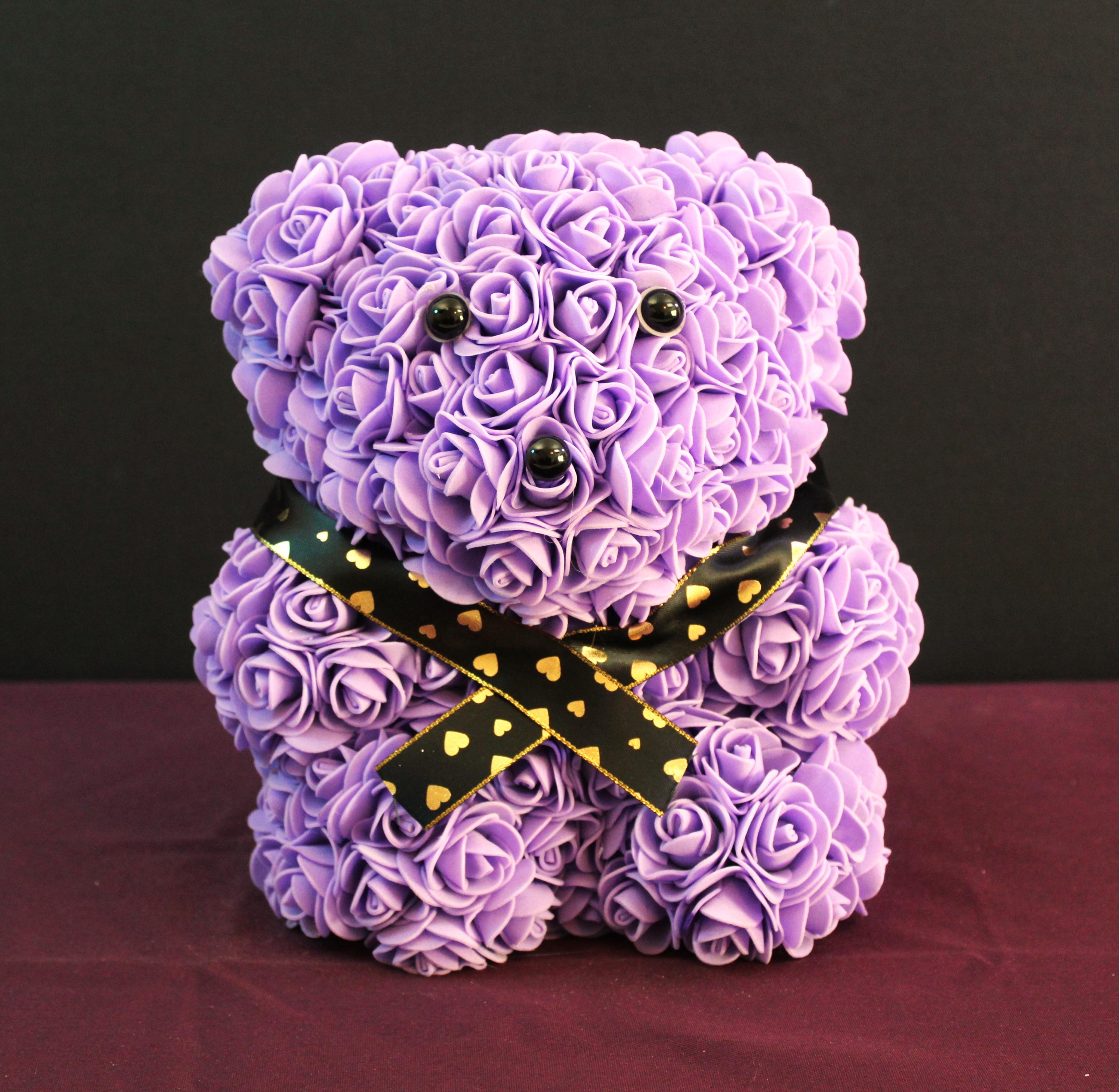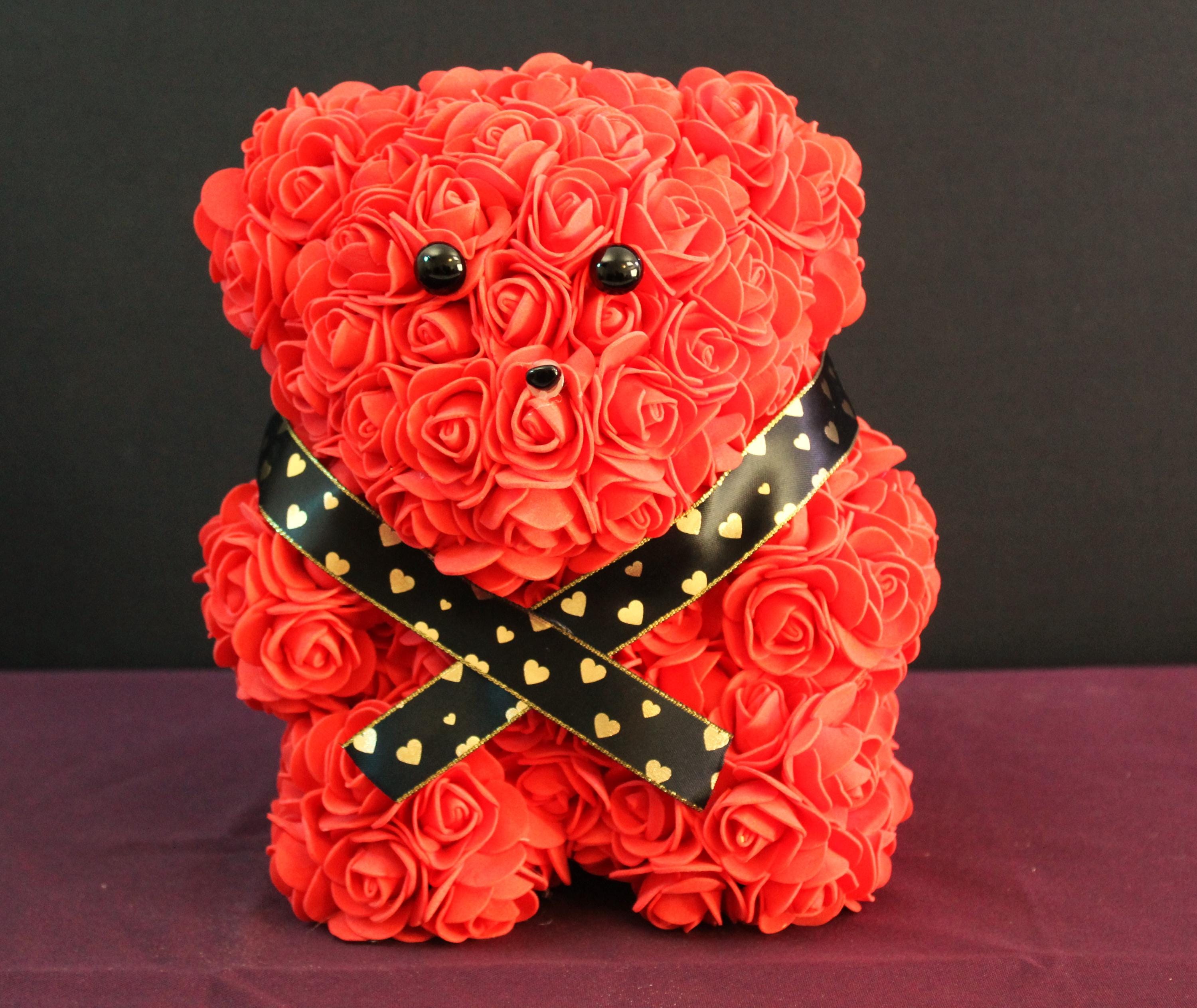 Make every occasion extra special with this gorgeous handcrafted Rose Covered Teddy Bear, available in stunning red or purple roses, and adorned with a luxurious gold & black ribbon. This unique and romantic gift is perfect for anniversaries, Valentine’s Day, birthdays, or any event where you want to show your love in a memorable way. The plush bear is covered with artificial, long-lasting foam roses, creating a keepsake that will be cherished for years.