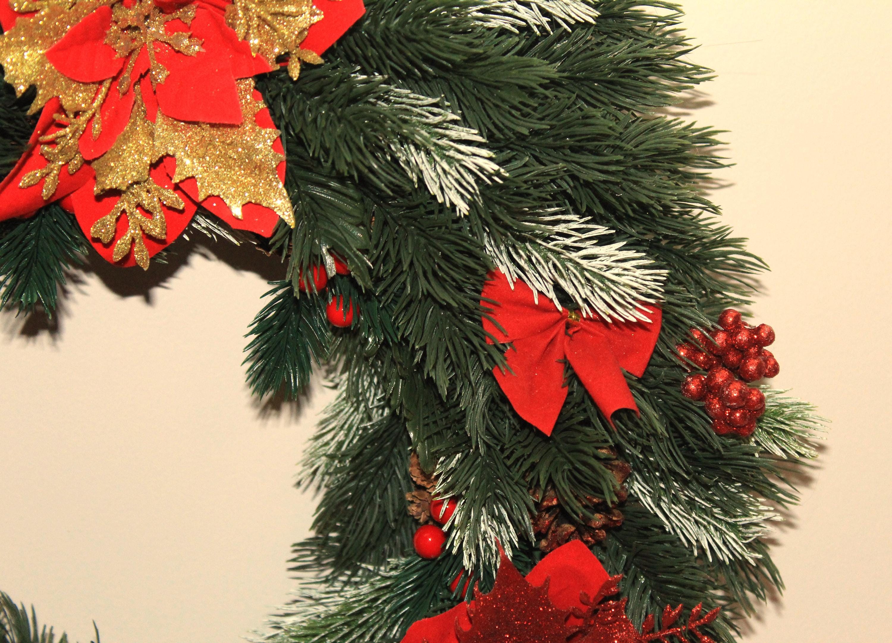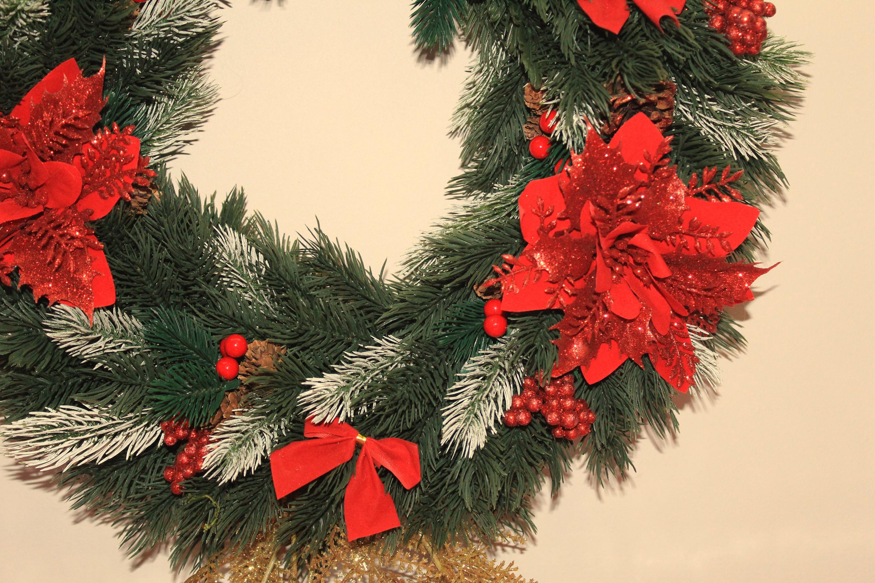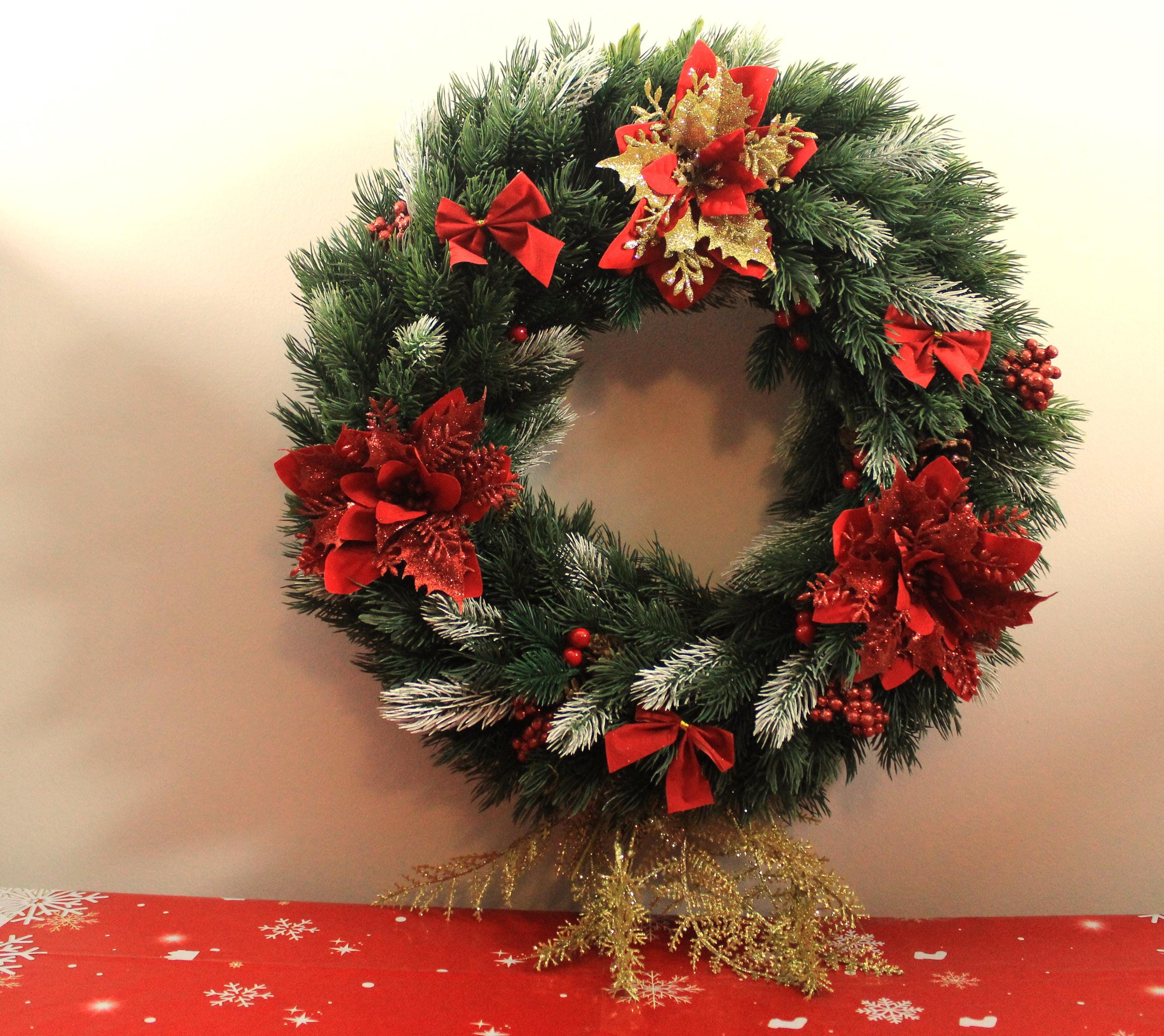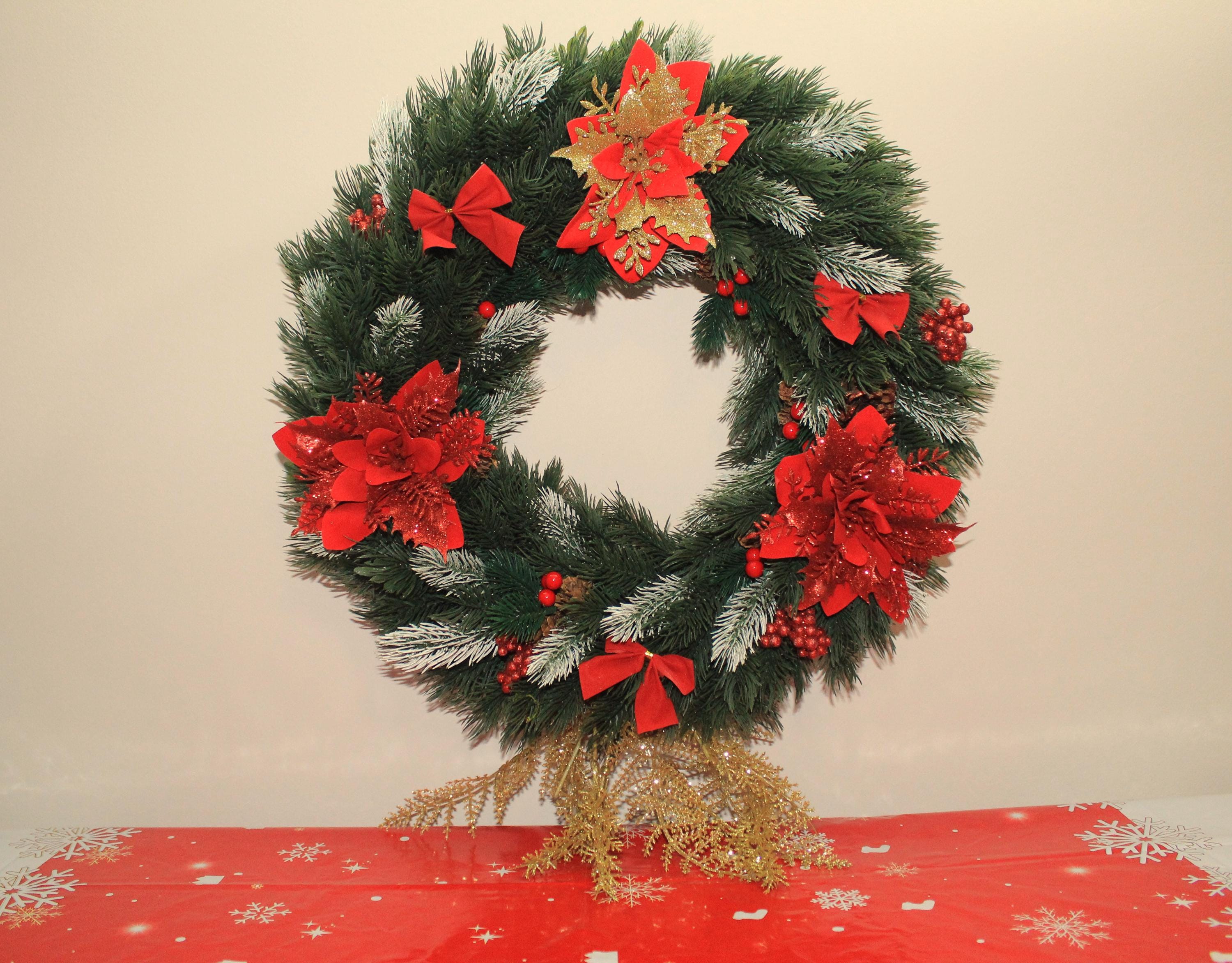 Materials: Artificial frosted pine, silk poinsettias, gold ornaments, natural pinecones, and premium ribbon