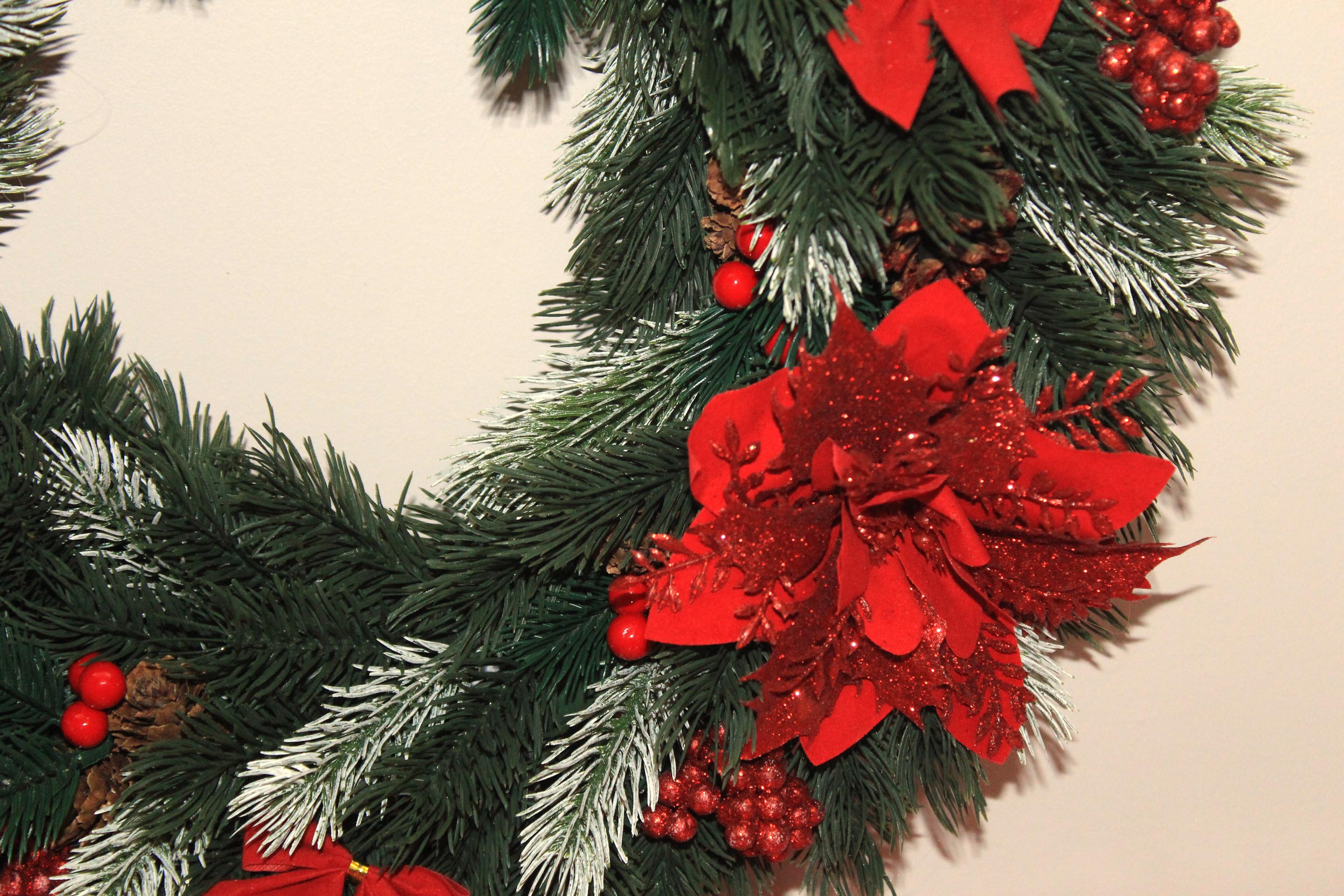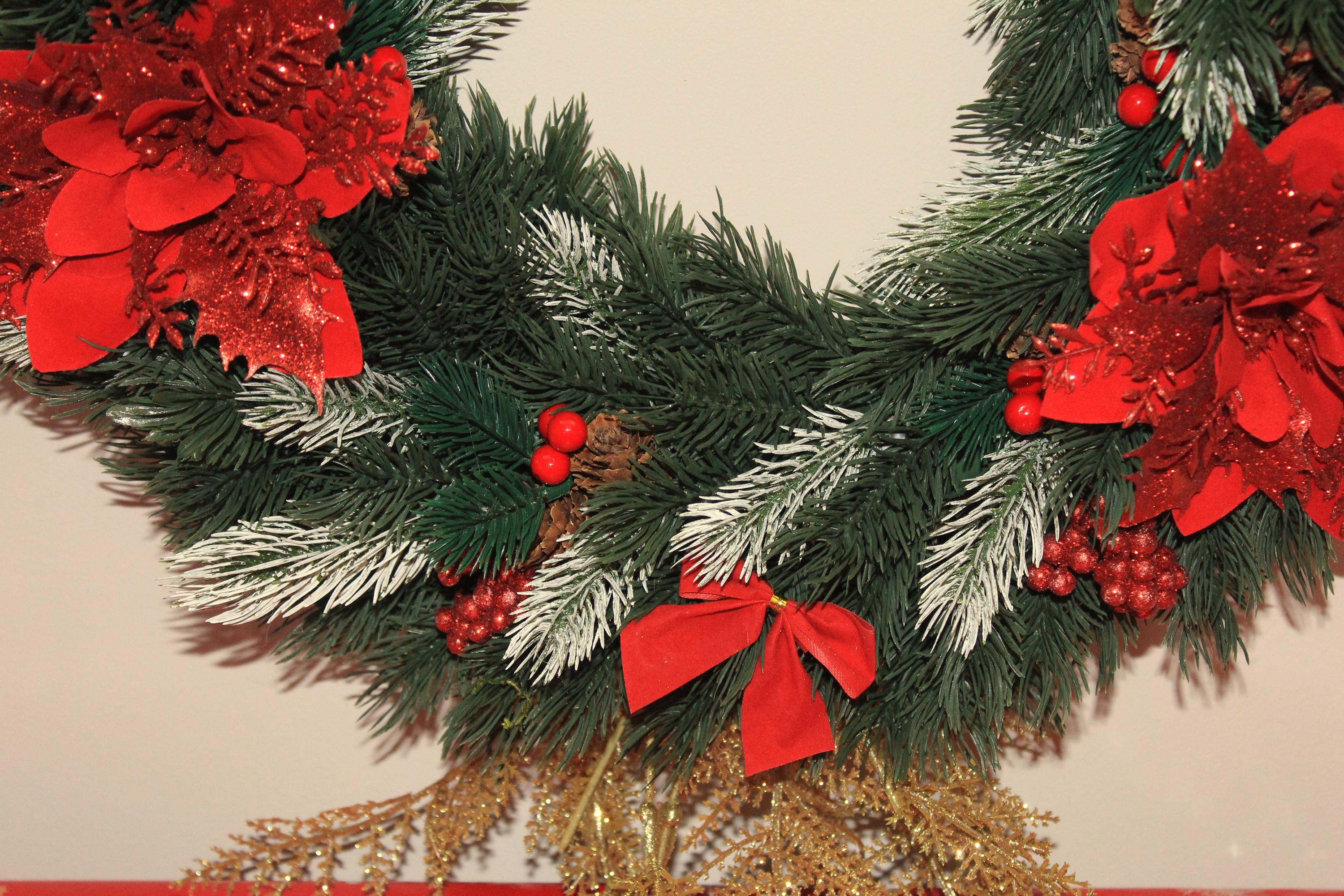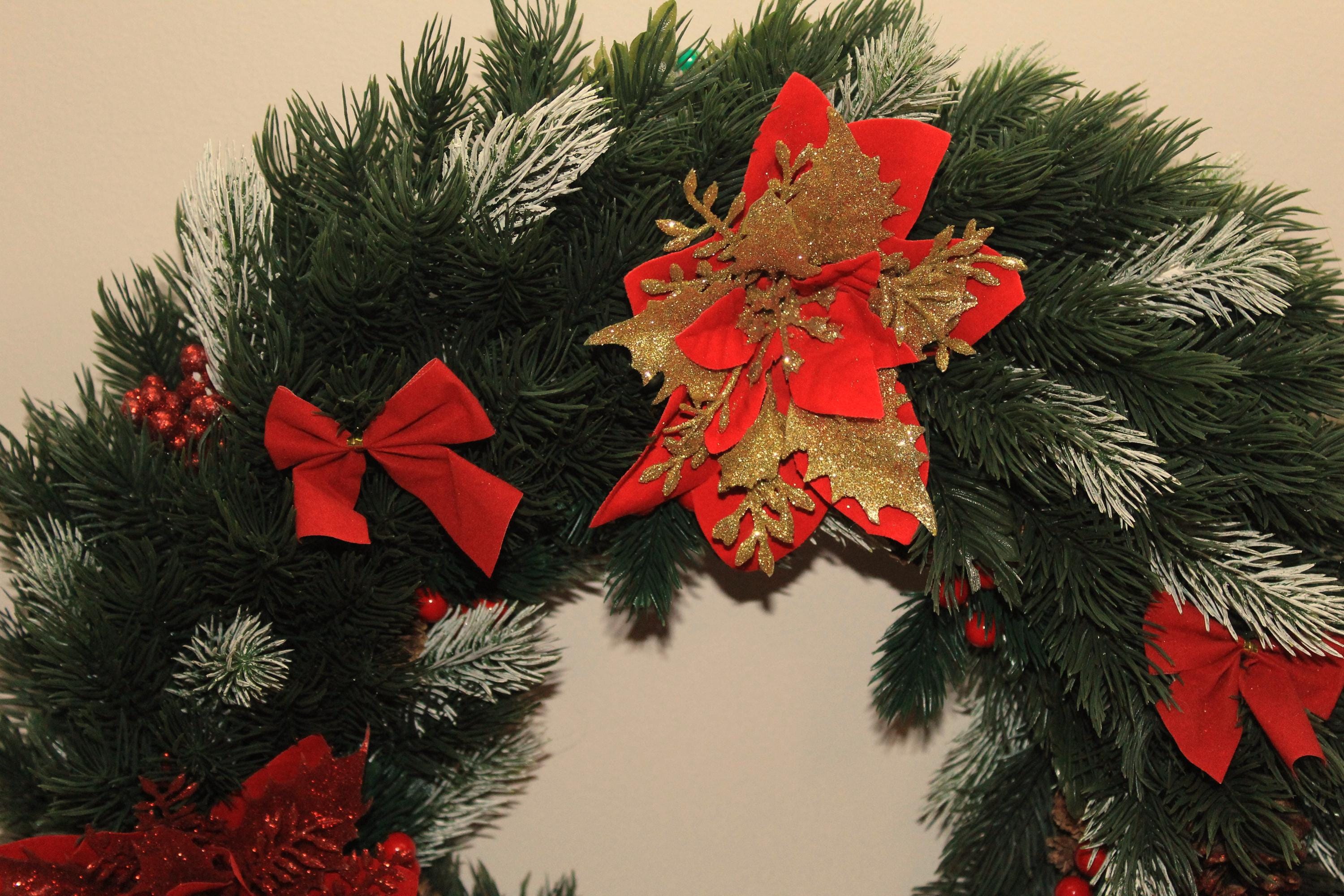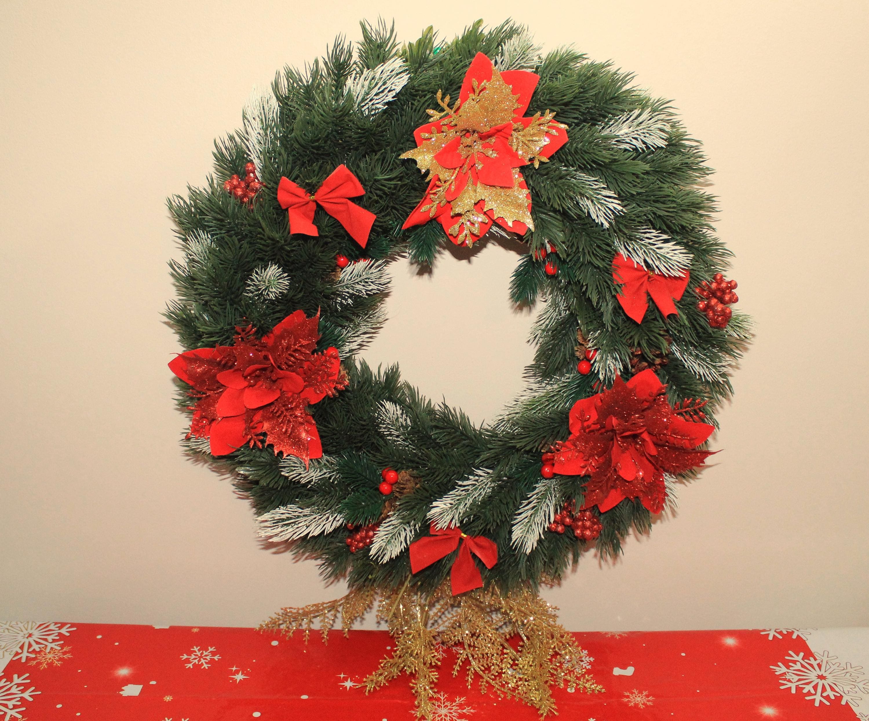 Materials: Artificial frosted pine, silk poinsettias, gold ornaments, natural pinecones, and premium ribbon