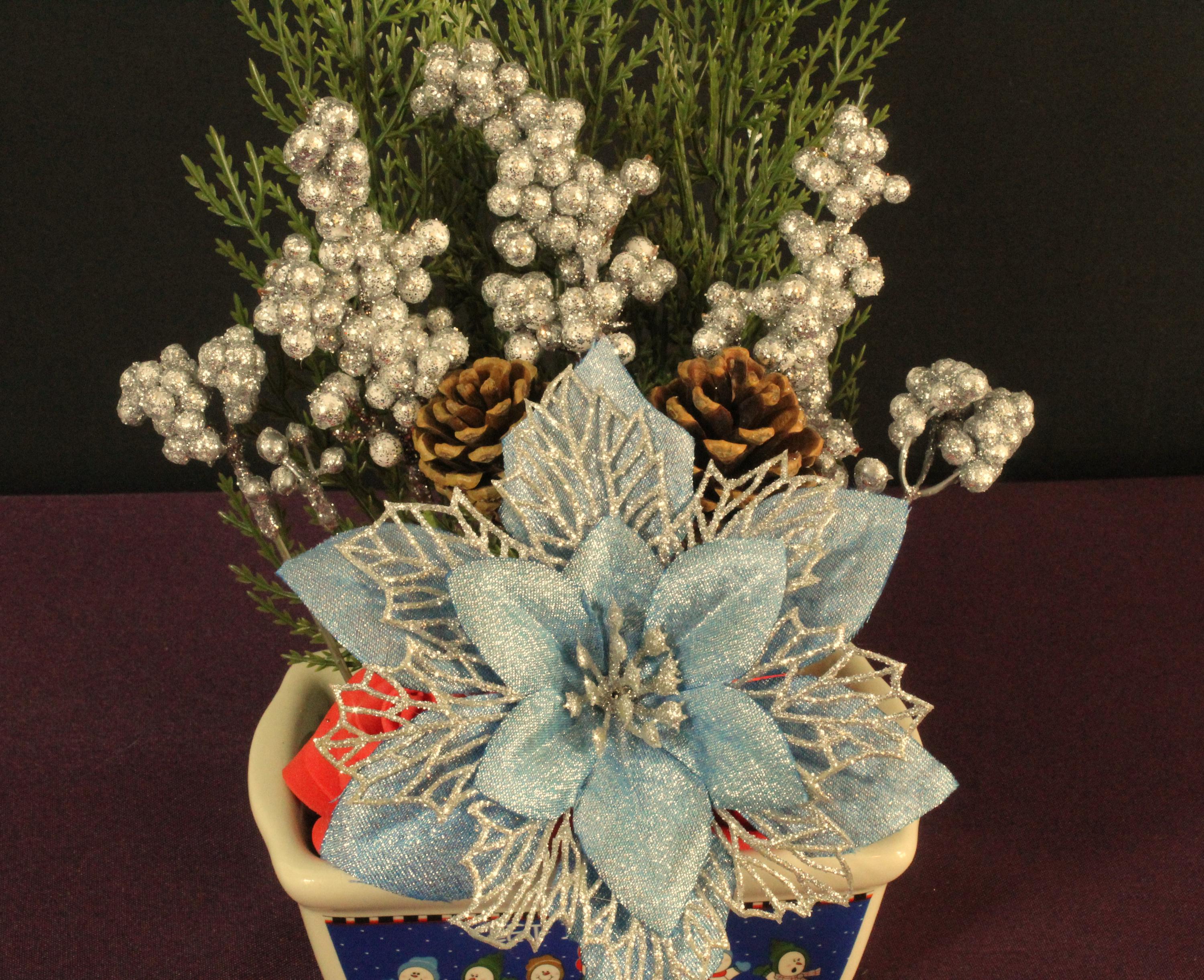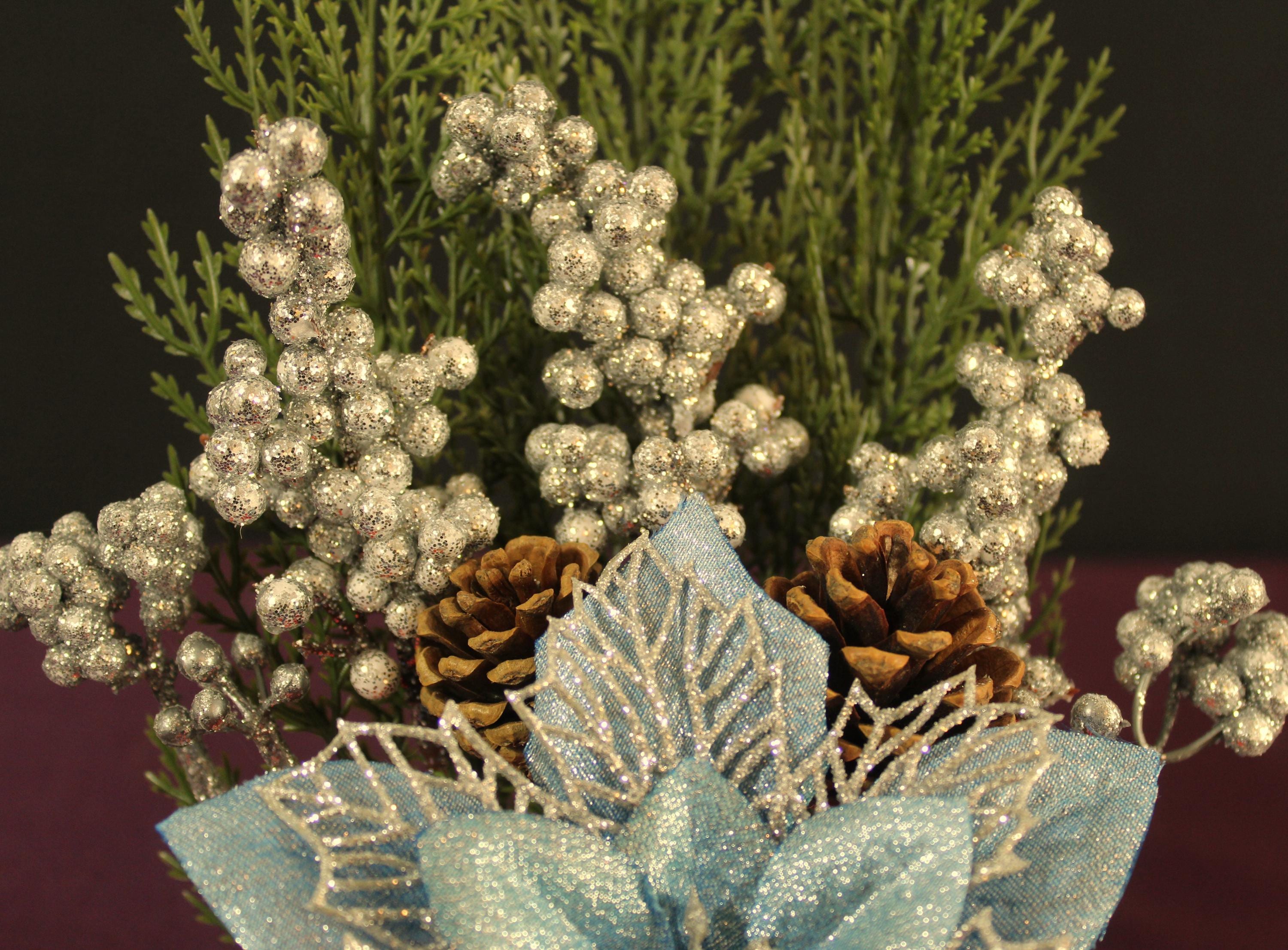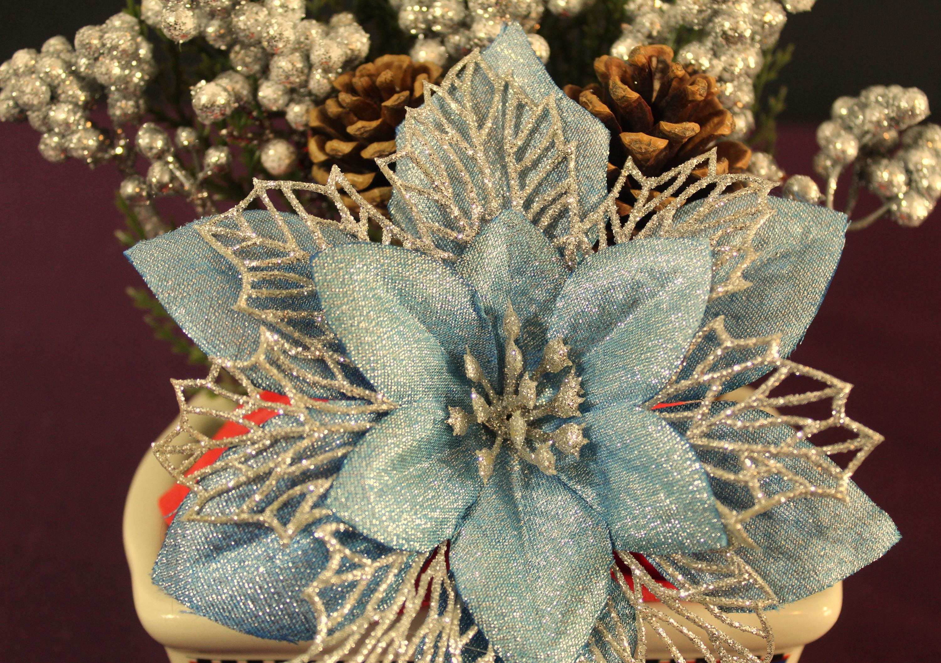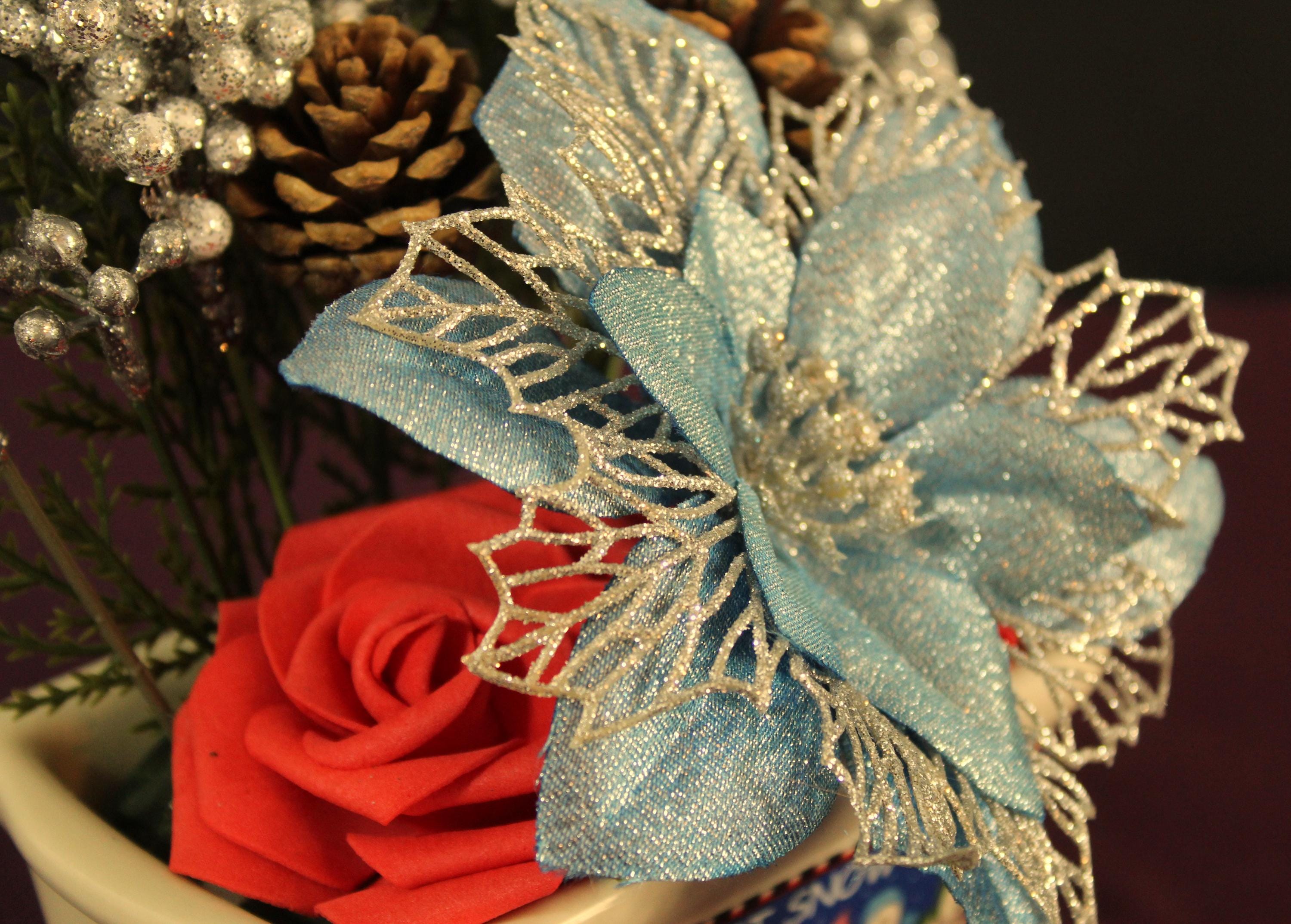 - Arrangement Includes: Vibrant blue poinsettias, rich red roses, frosted pine branches, natural pine cones, and festive red berries.