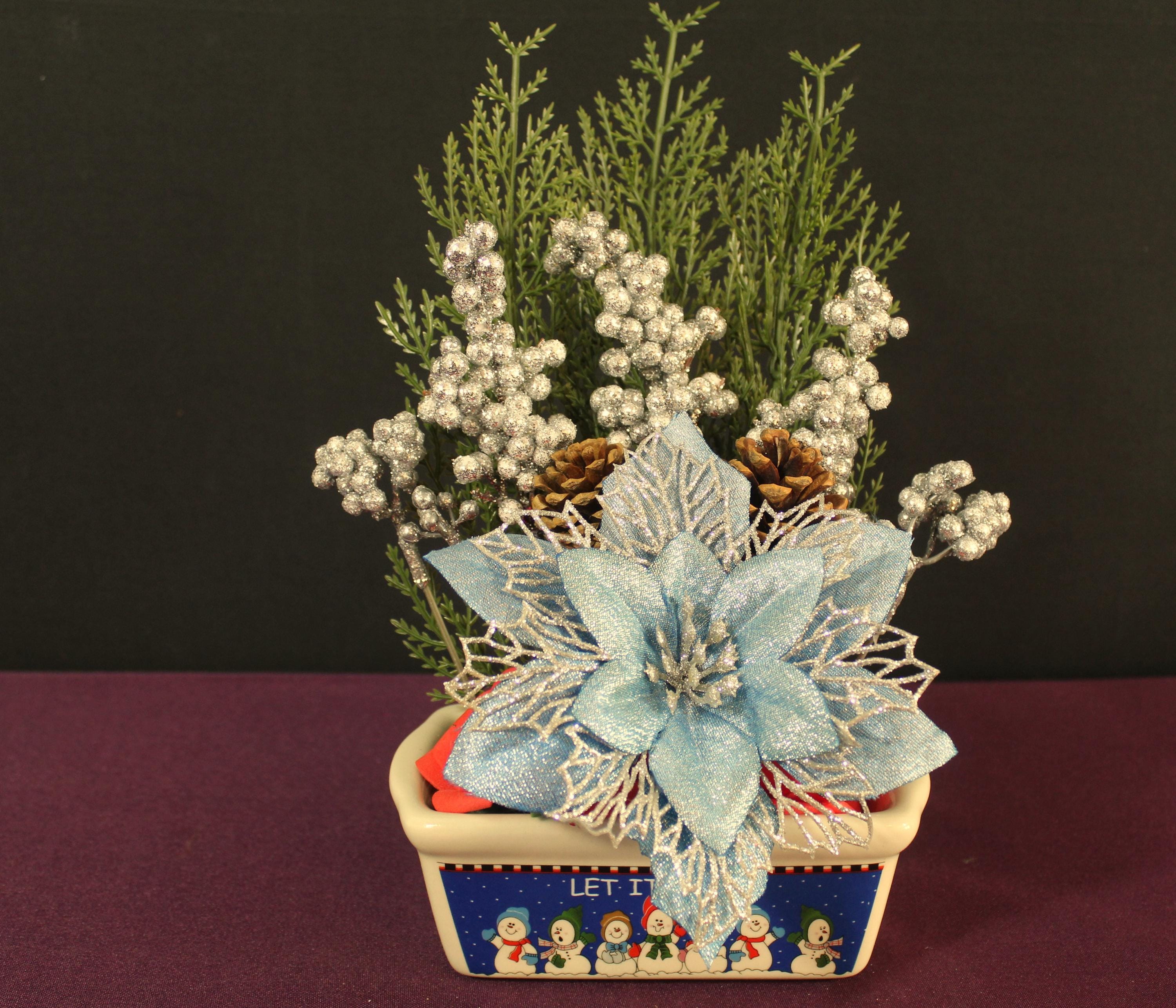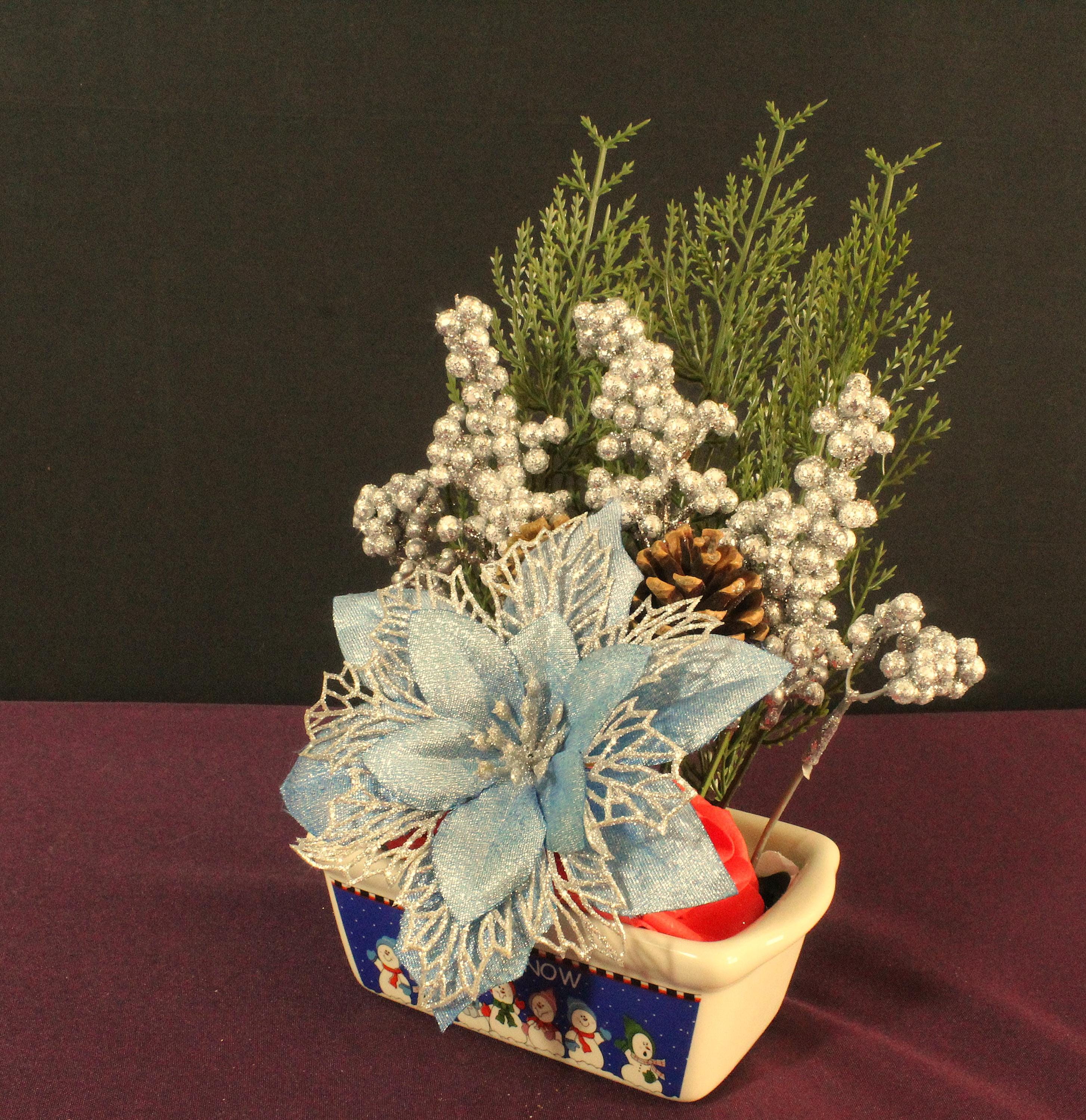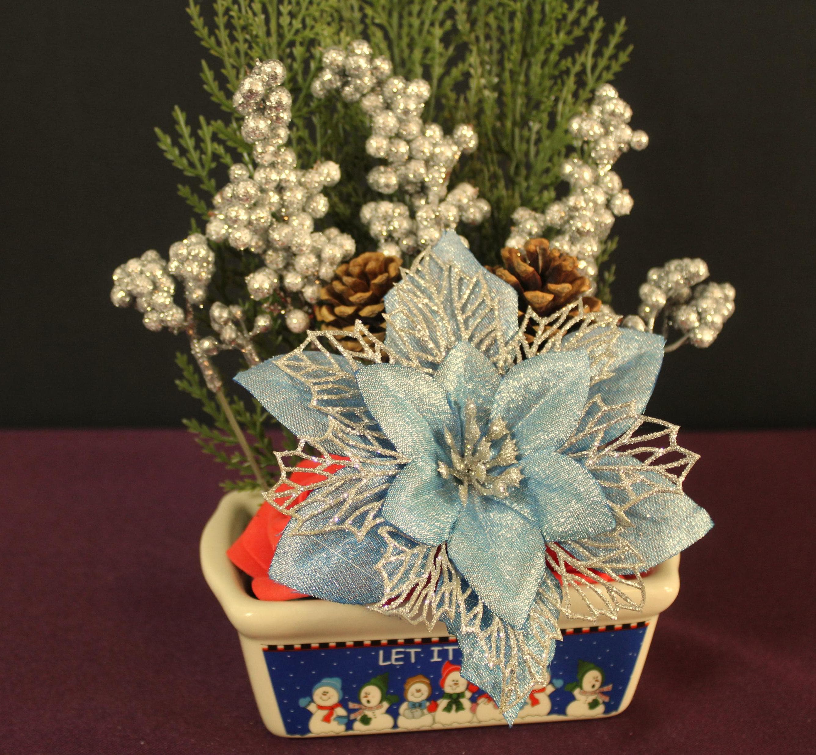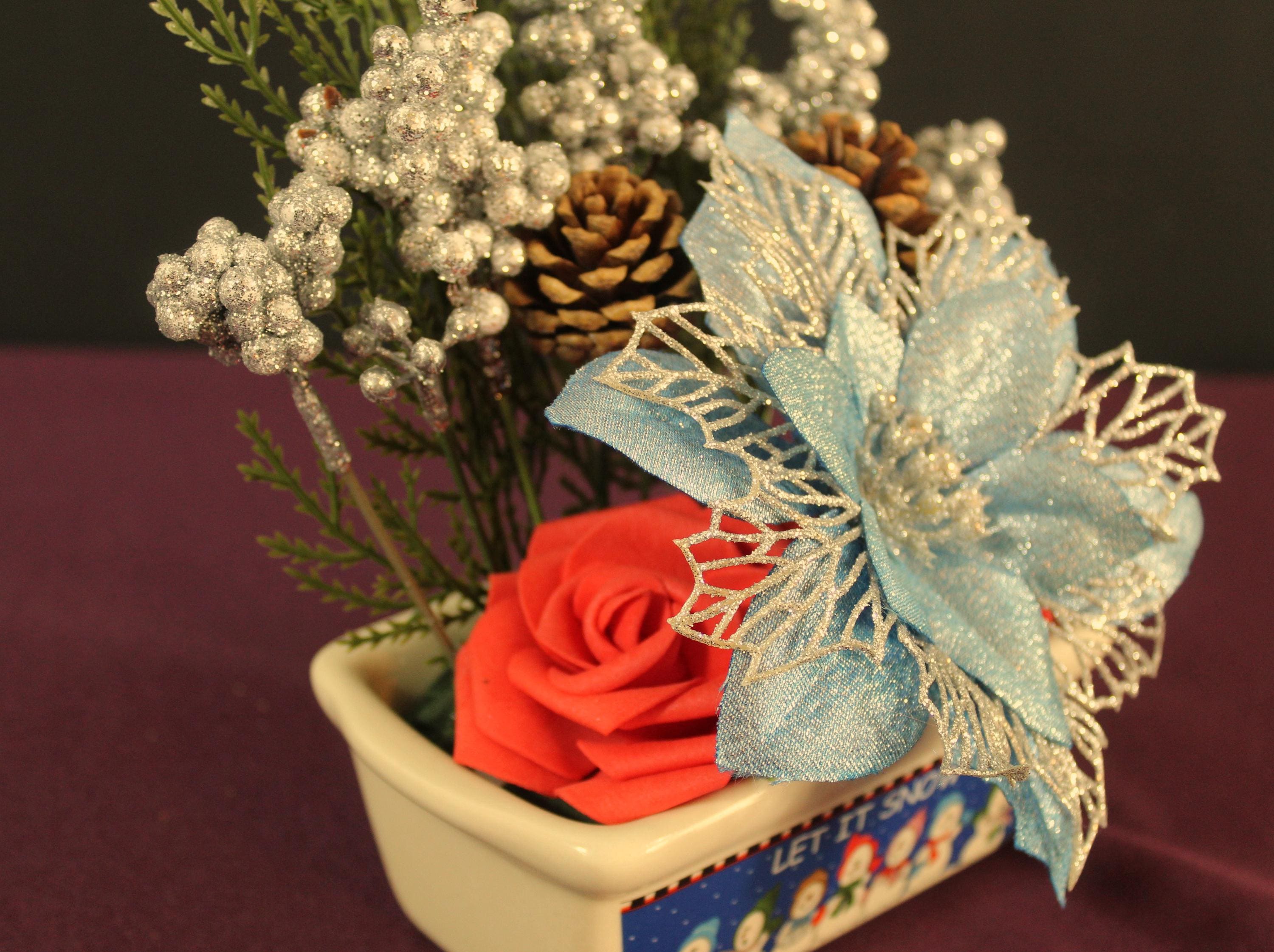 - Arrangement Includes: Vibrant blue poinsettias, rich red roses, frosted pine branches, natural pine cones, and festive red berries.
