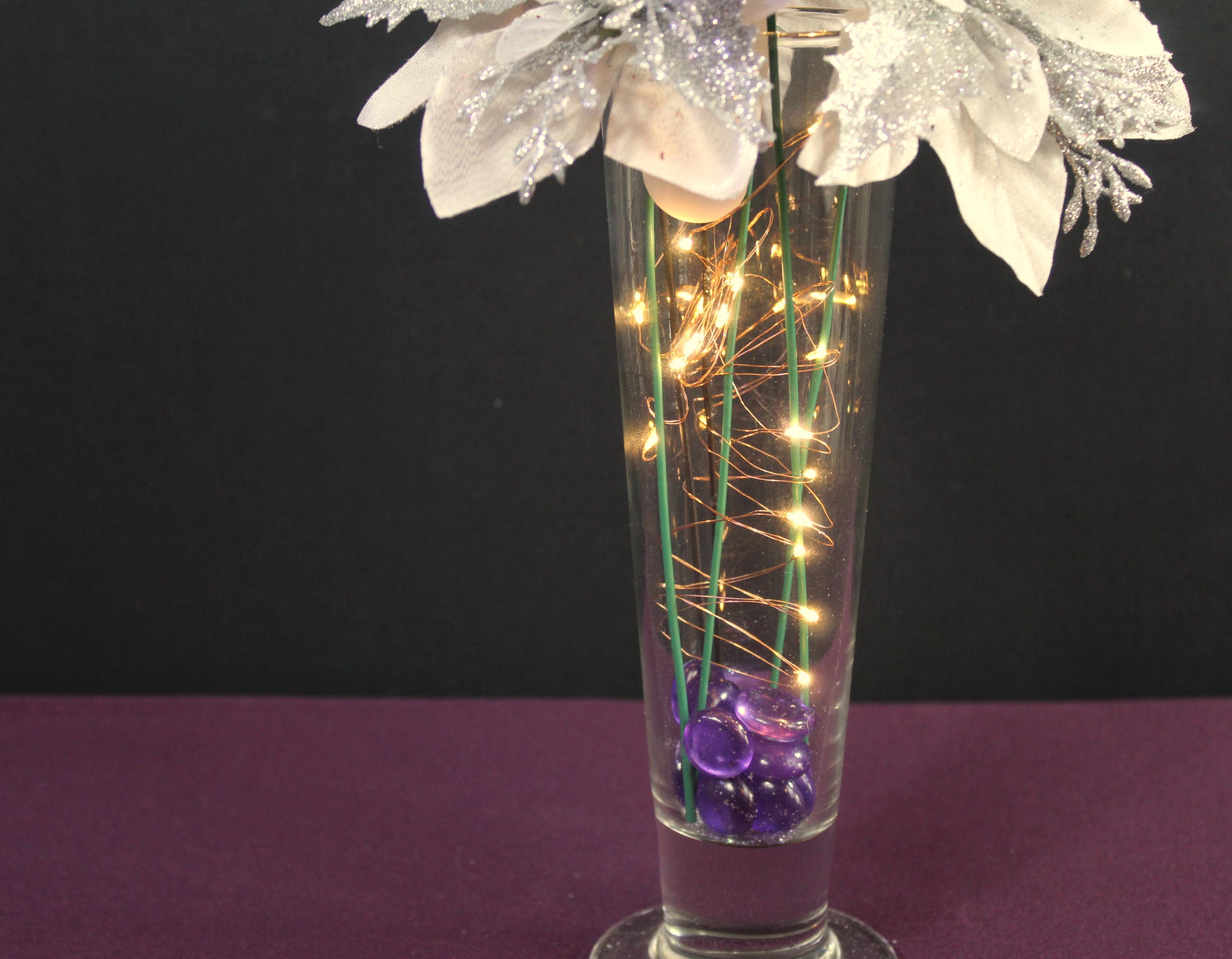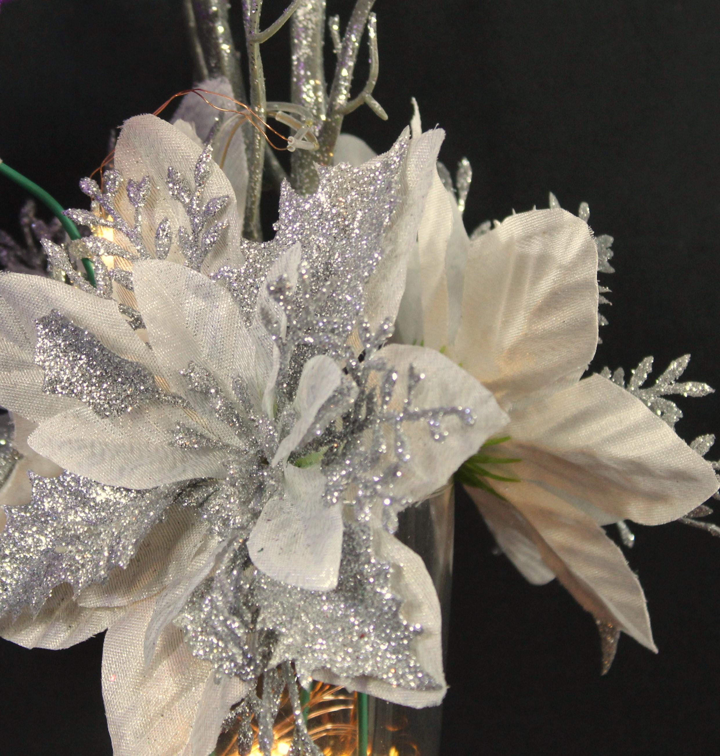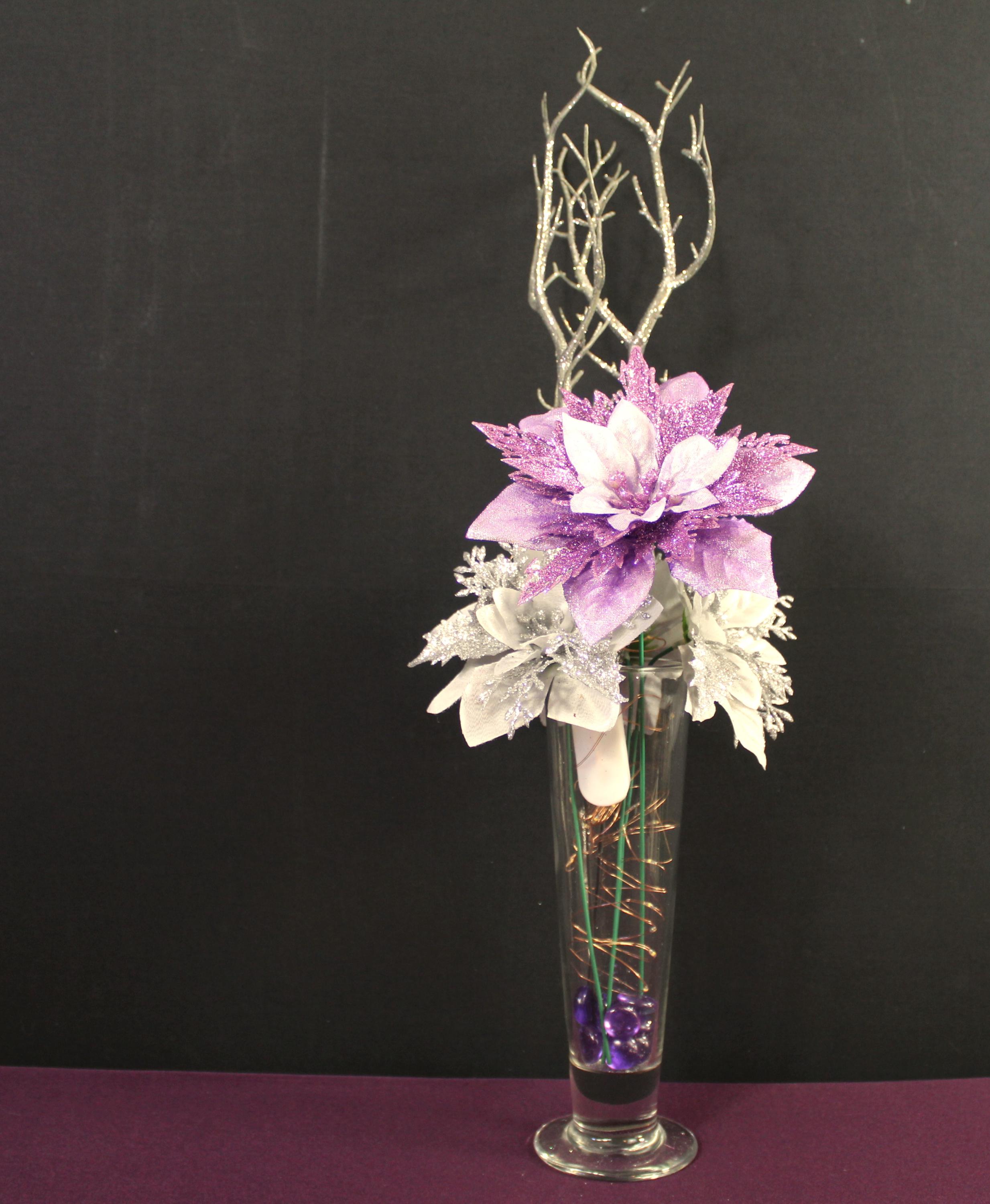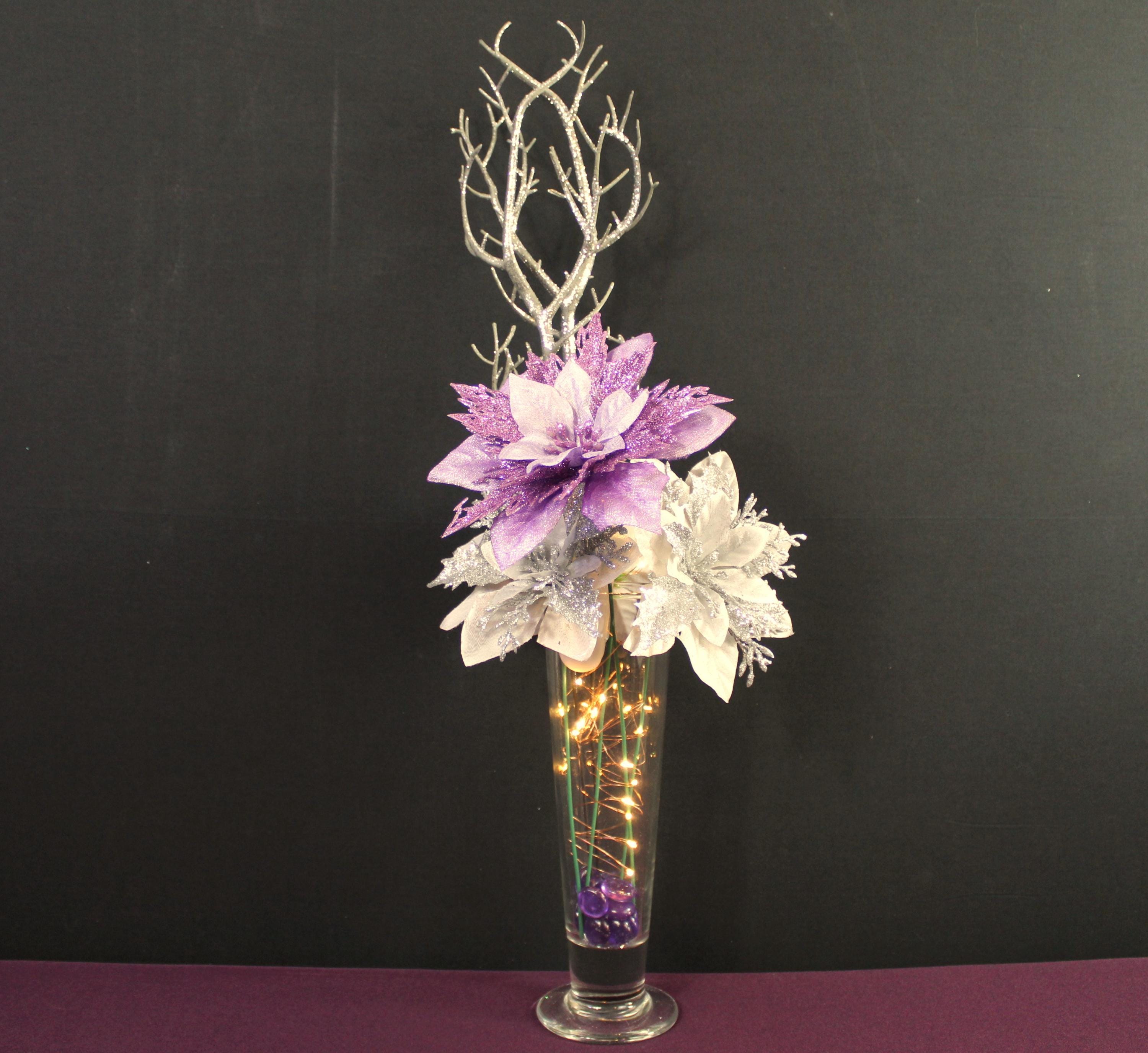- Arrangement Includes: White poinsettias, purple accents, white sparkle berries, decorative marbles, and integrated LED lights.