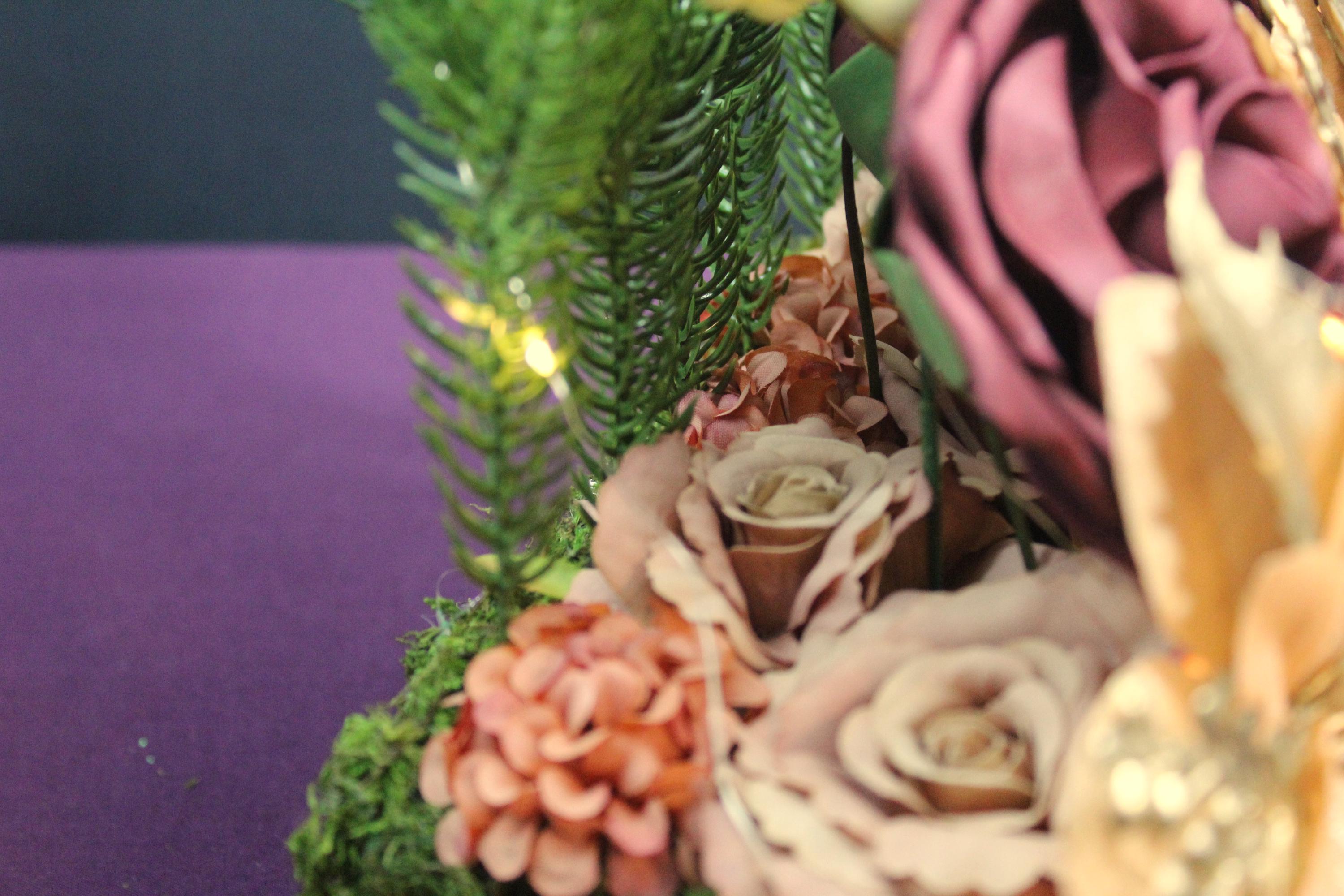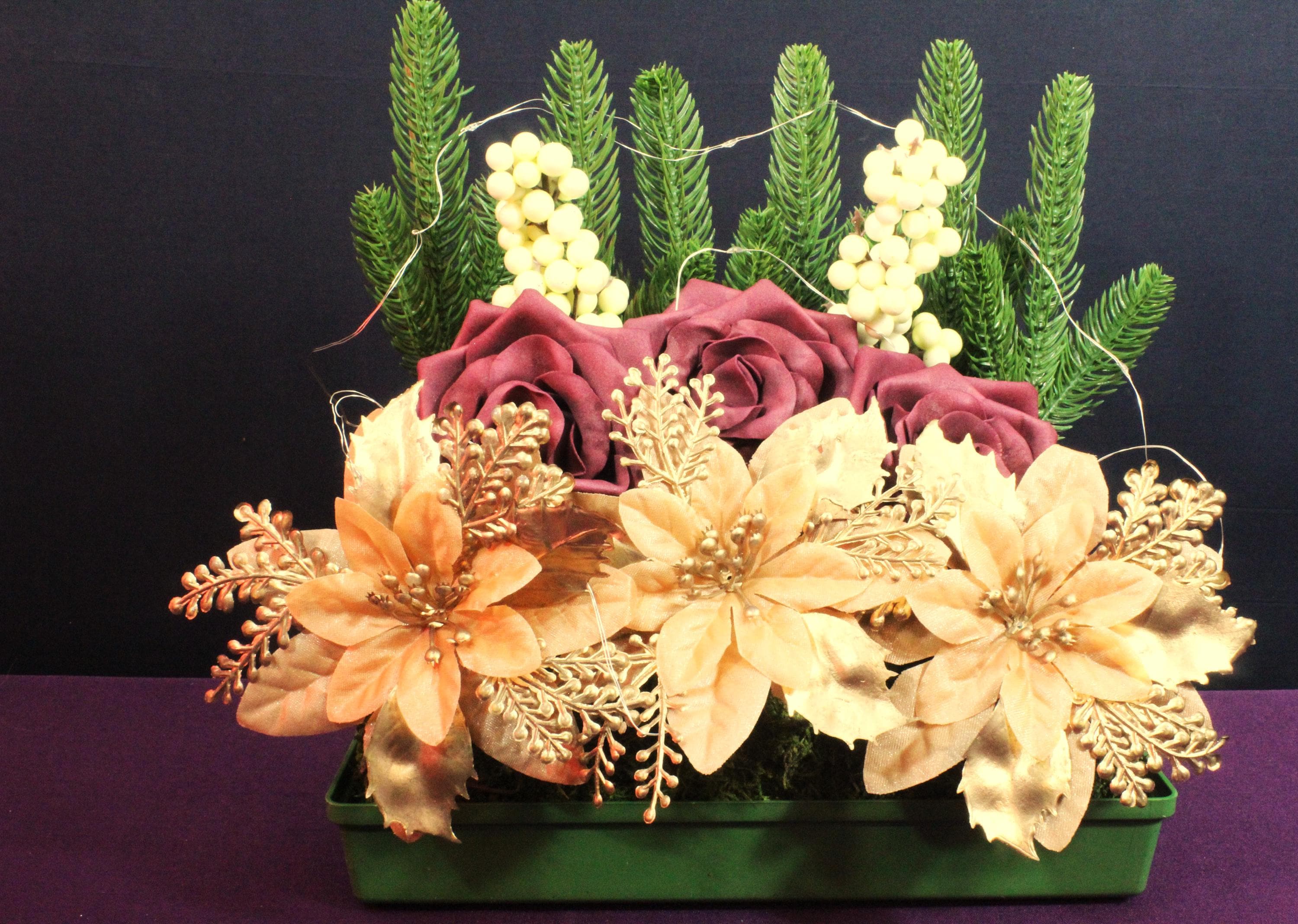 Materials: High-quality silk flowers, durable greenery, and safe LED lighting