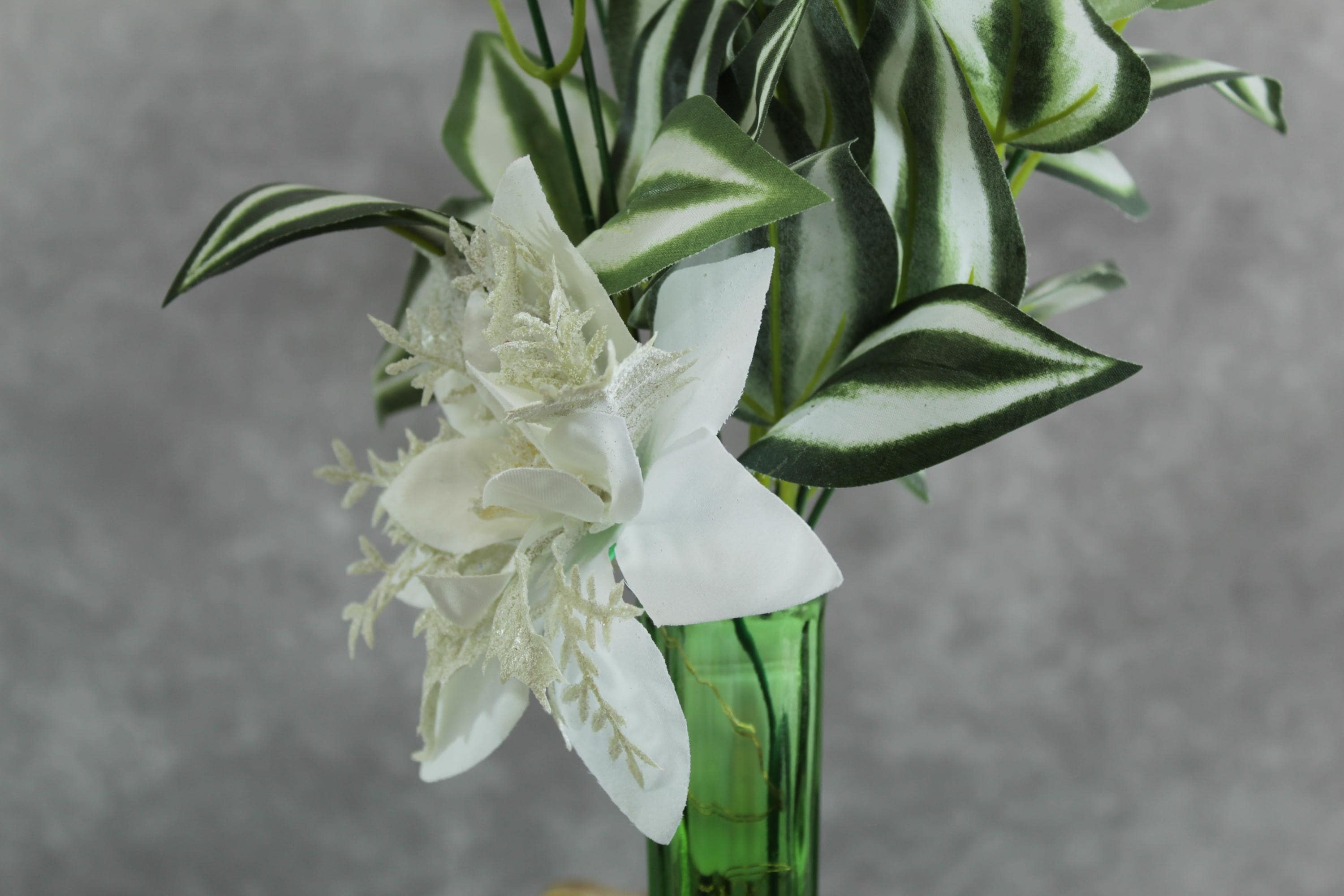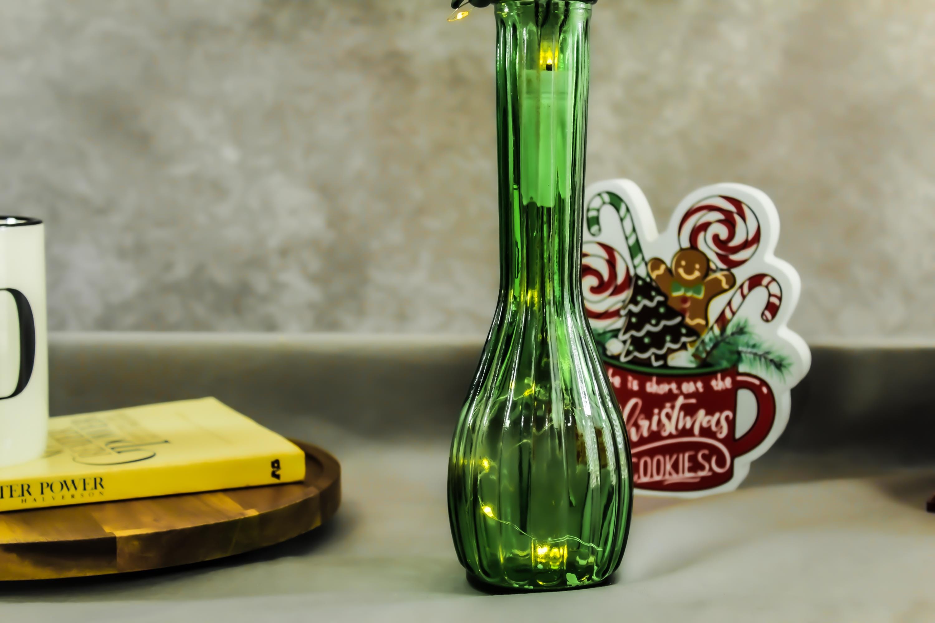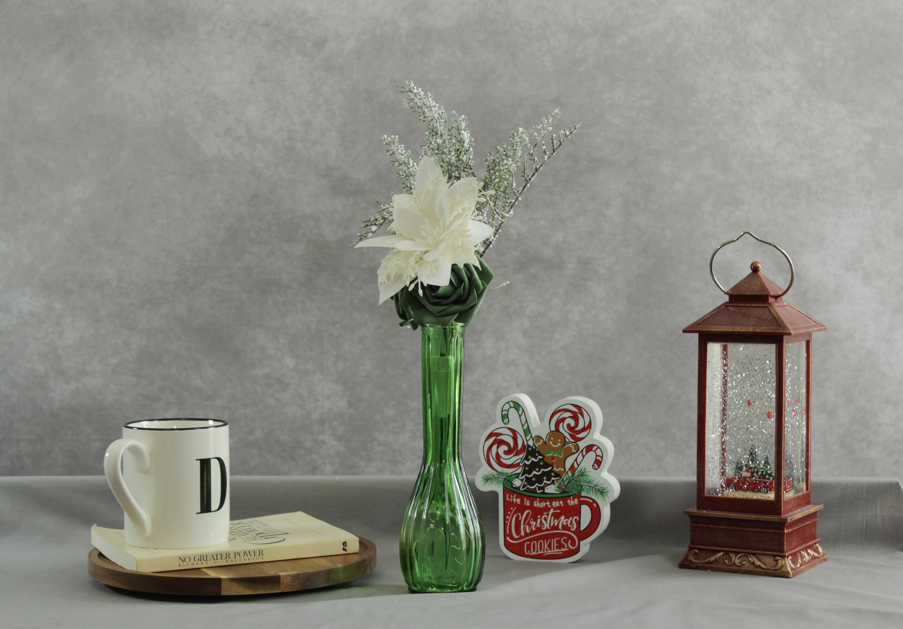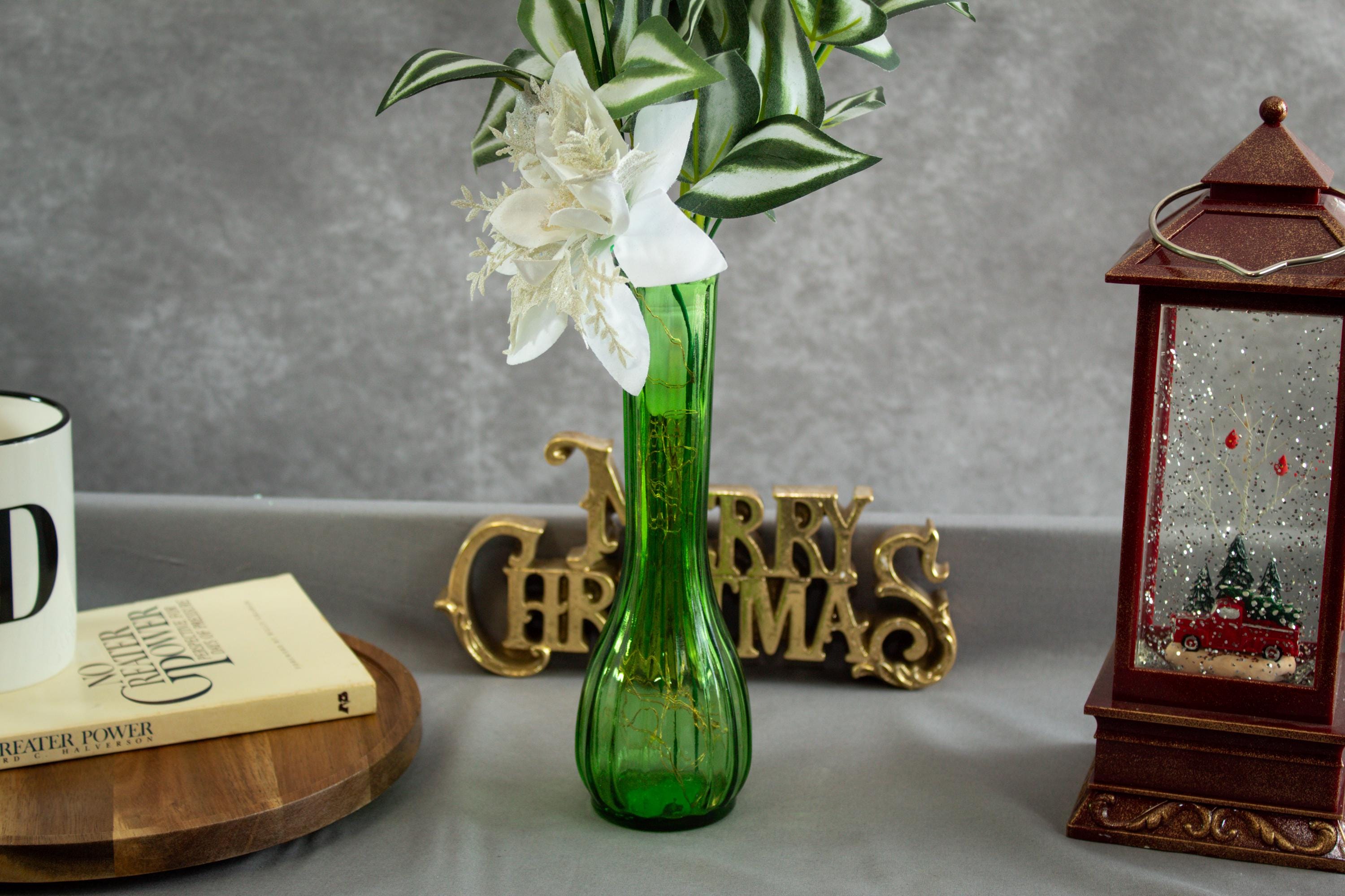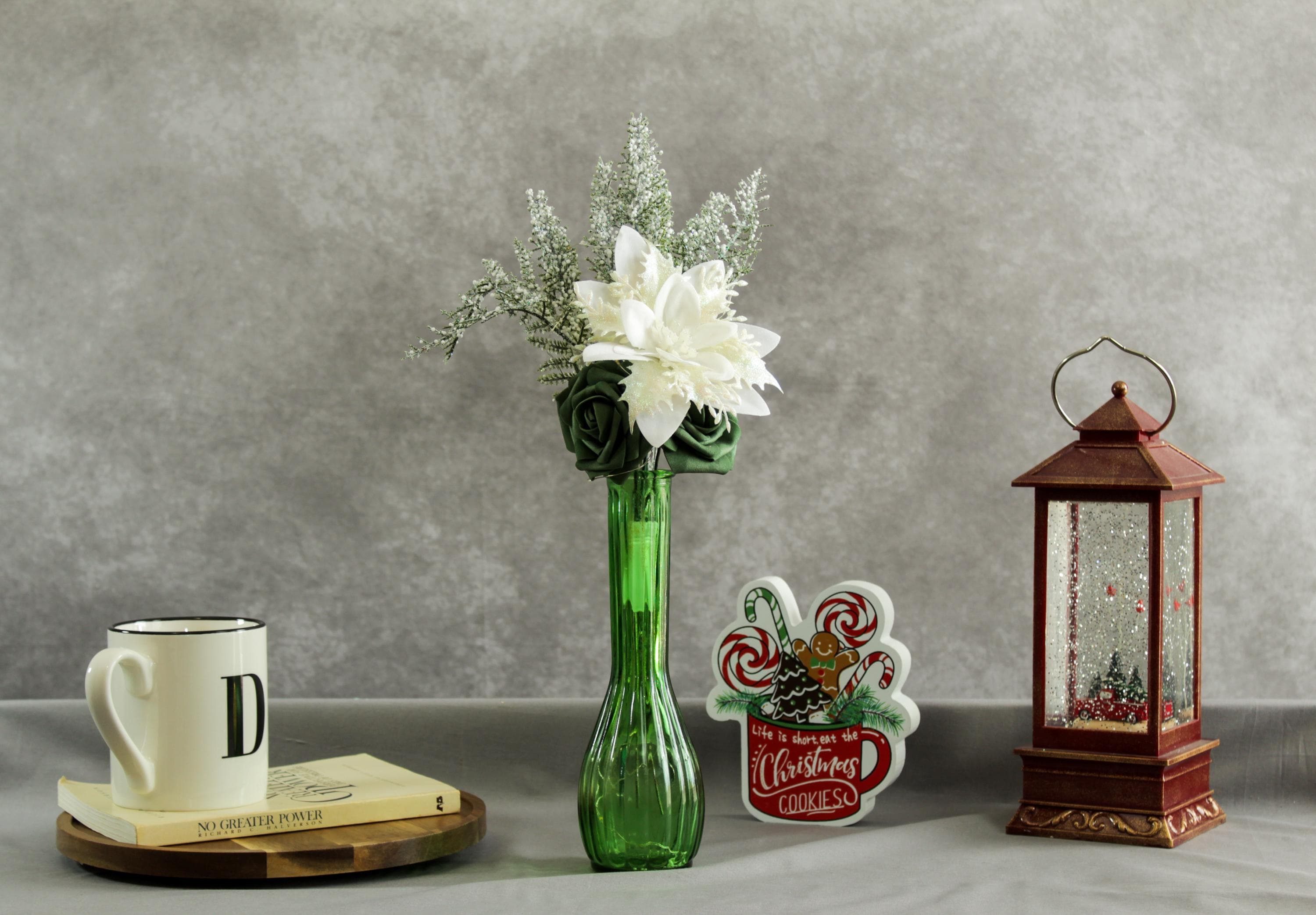 Arranged in a rich green glass bottle, this evergreen floral design works beautifully as holiday table decor, a Christmas bud vase on a mantel or bookshelf, or a neutral winter decor accent in any room. The classic green and white palette pairs perfectly with farmhouse Christmas styling, modern minimal spaces, or cozy rustic cabins.