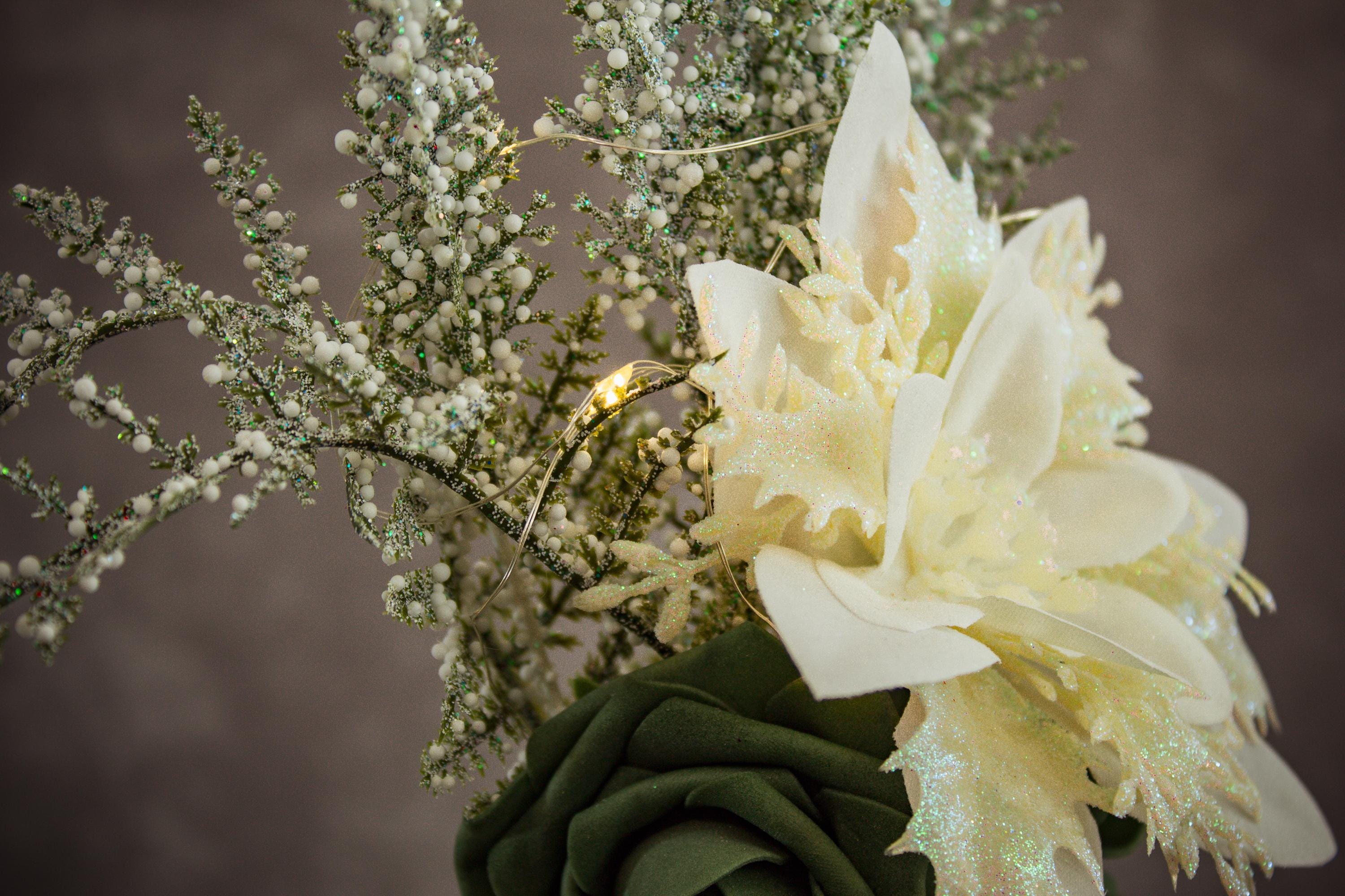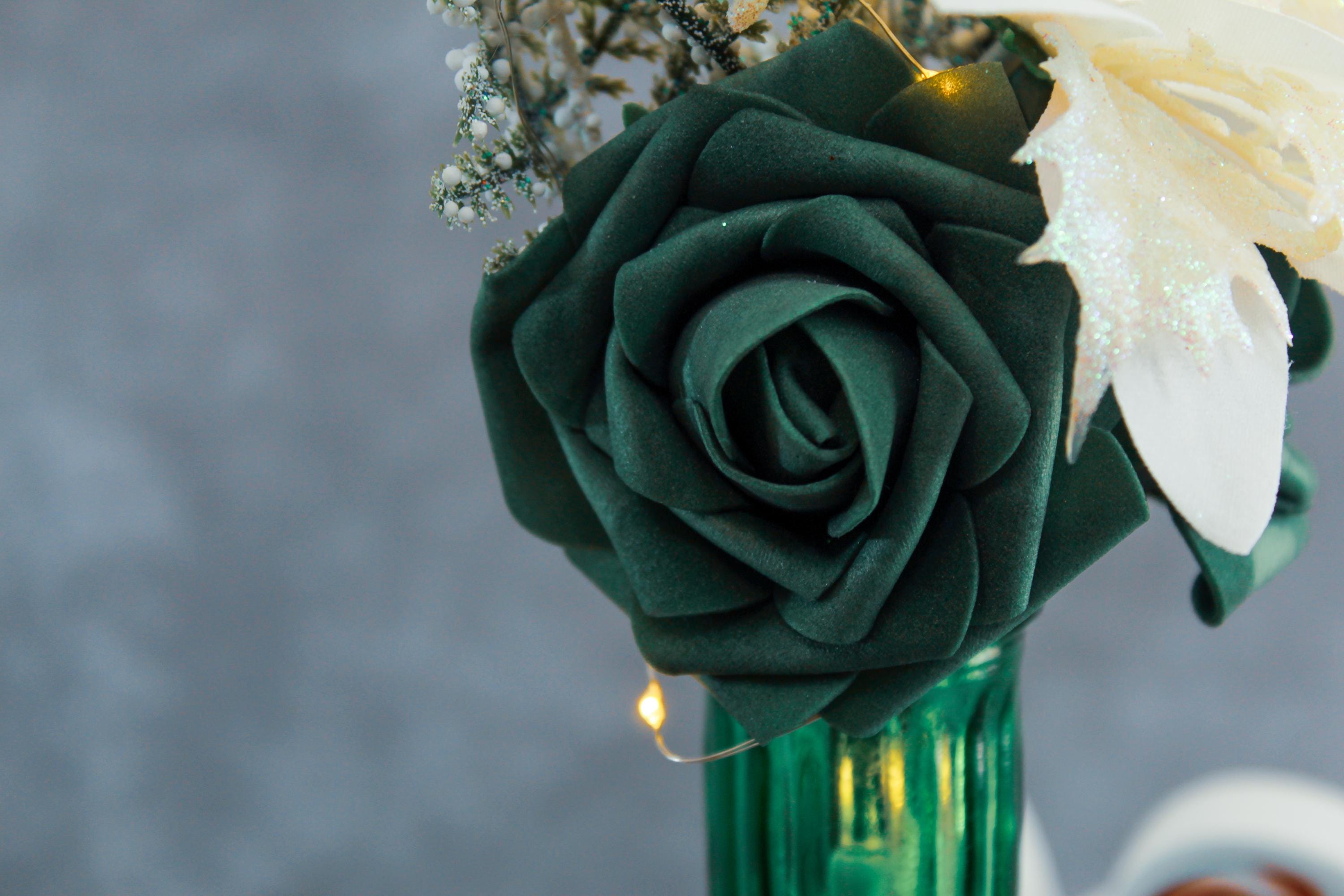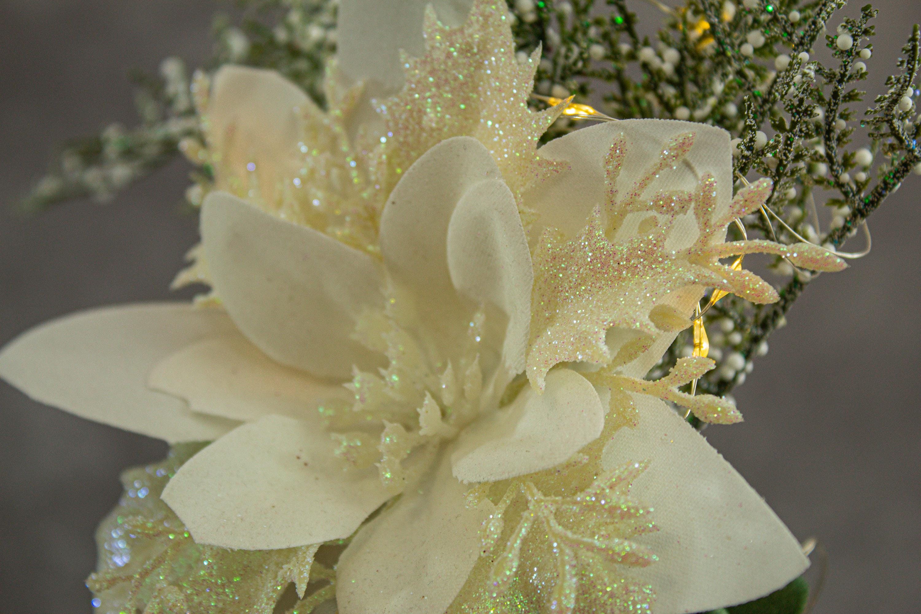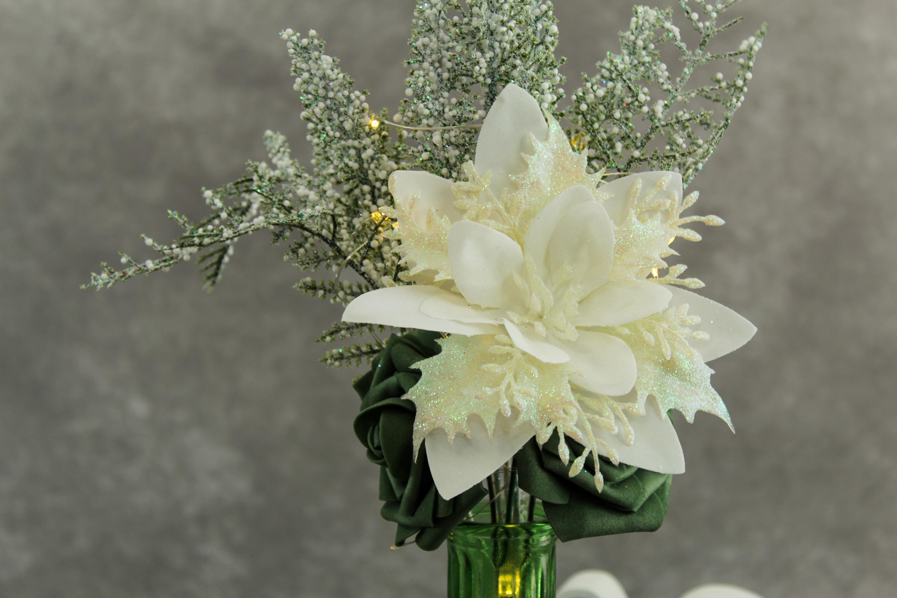 Bring quiet winter magic to your home with this elegant faux flower bouquet. Deep emerald green roses cradle a sparkling white poinsettia, surrounded by frosted greenery and tiny snowy berries. Warm fairy light flowers are woven through the stems, catching every shimmer and turning this piece into a glowing winter flower vase.