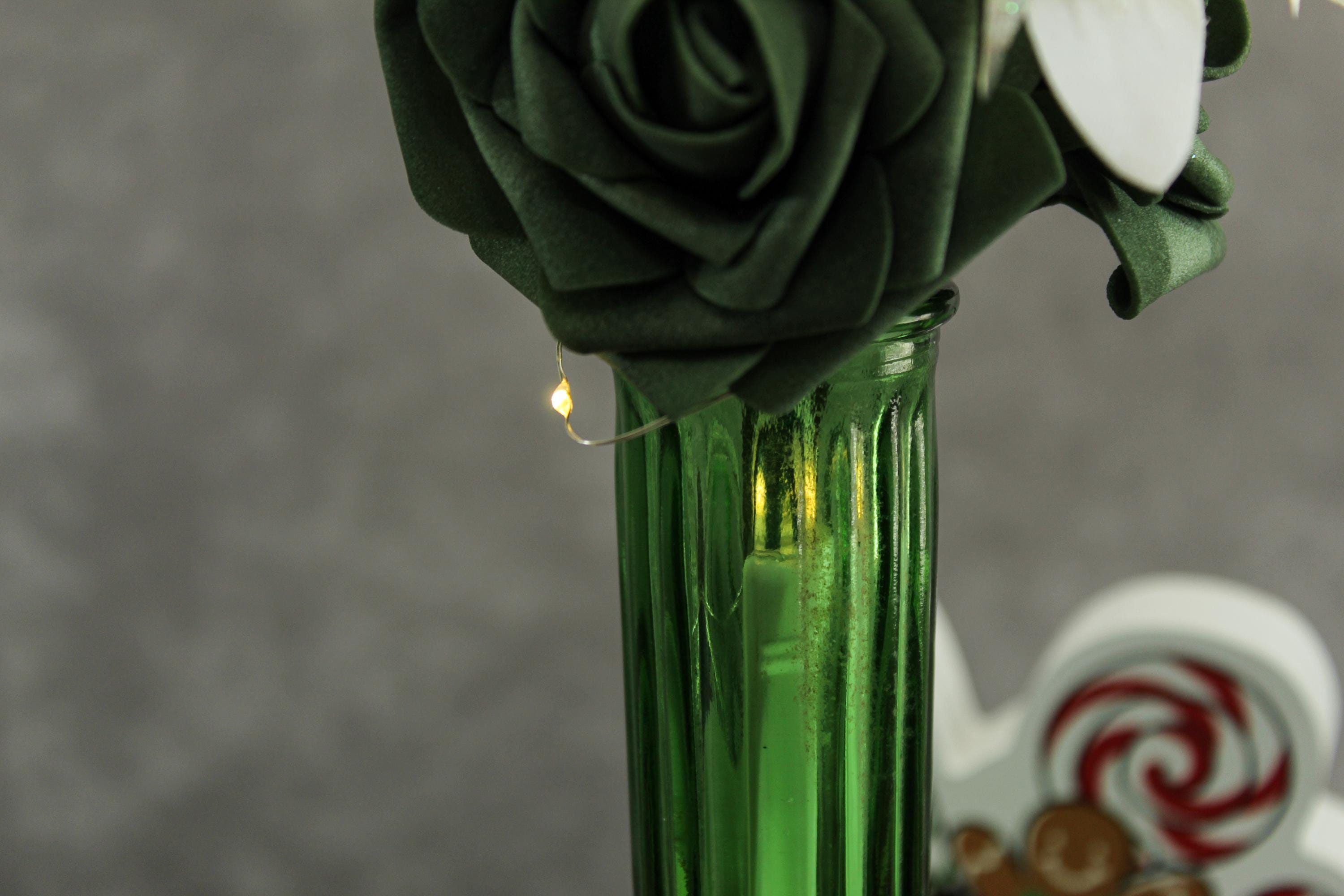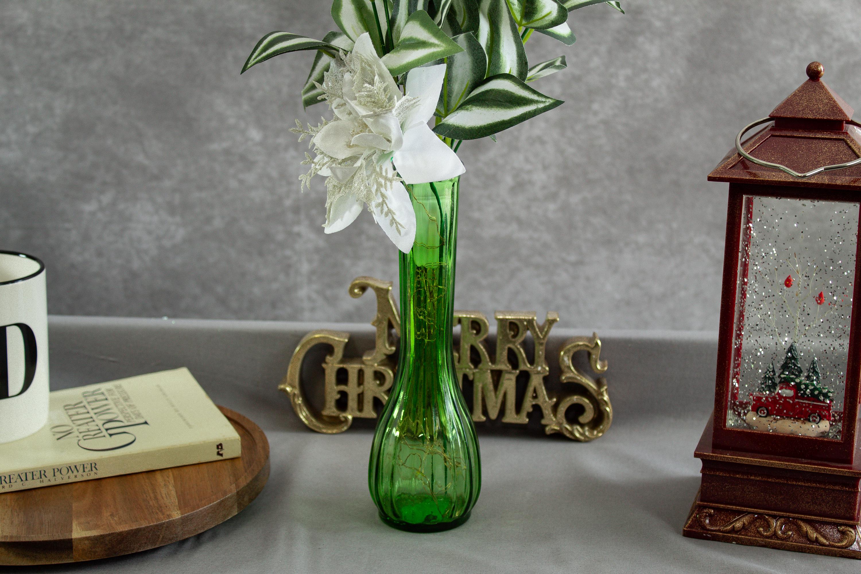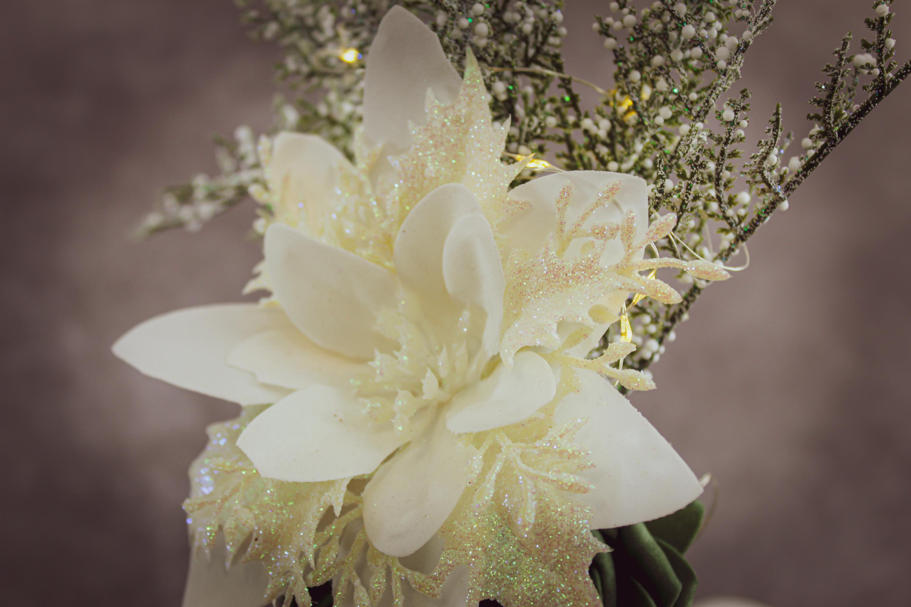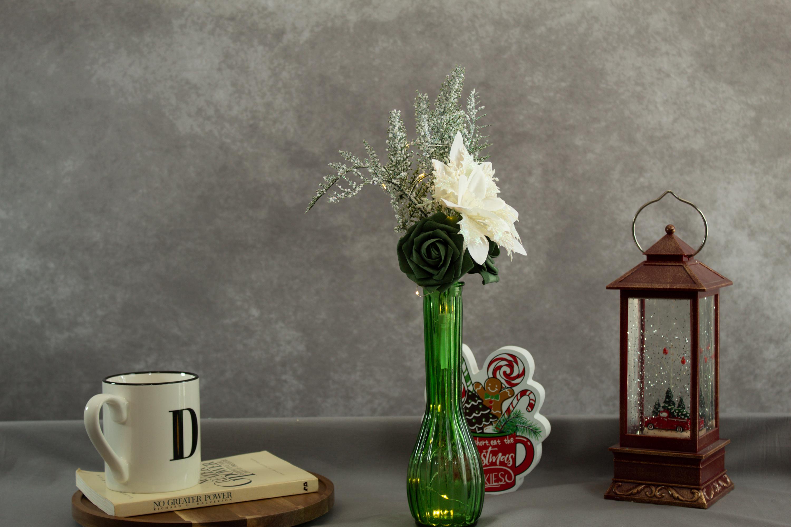 Bring quiet winter magic to your home with this elegant faux flower bouquet. Deep emerald green roses cradle a sparkling white poinsettia, surrounded by frosted greenery and tiny snowy berries. Warm fairy light flowers are woven through the stems, catching every shimmer and turning this piece into a glowing winter flower vase.