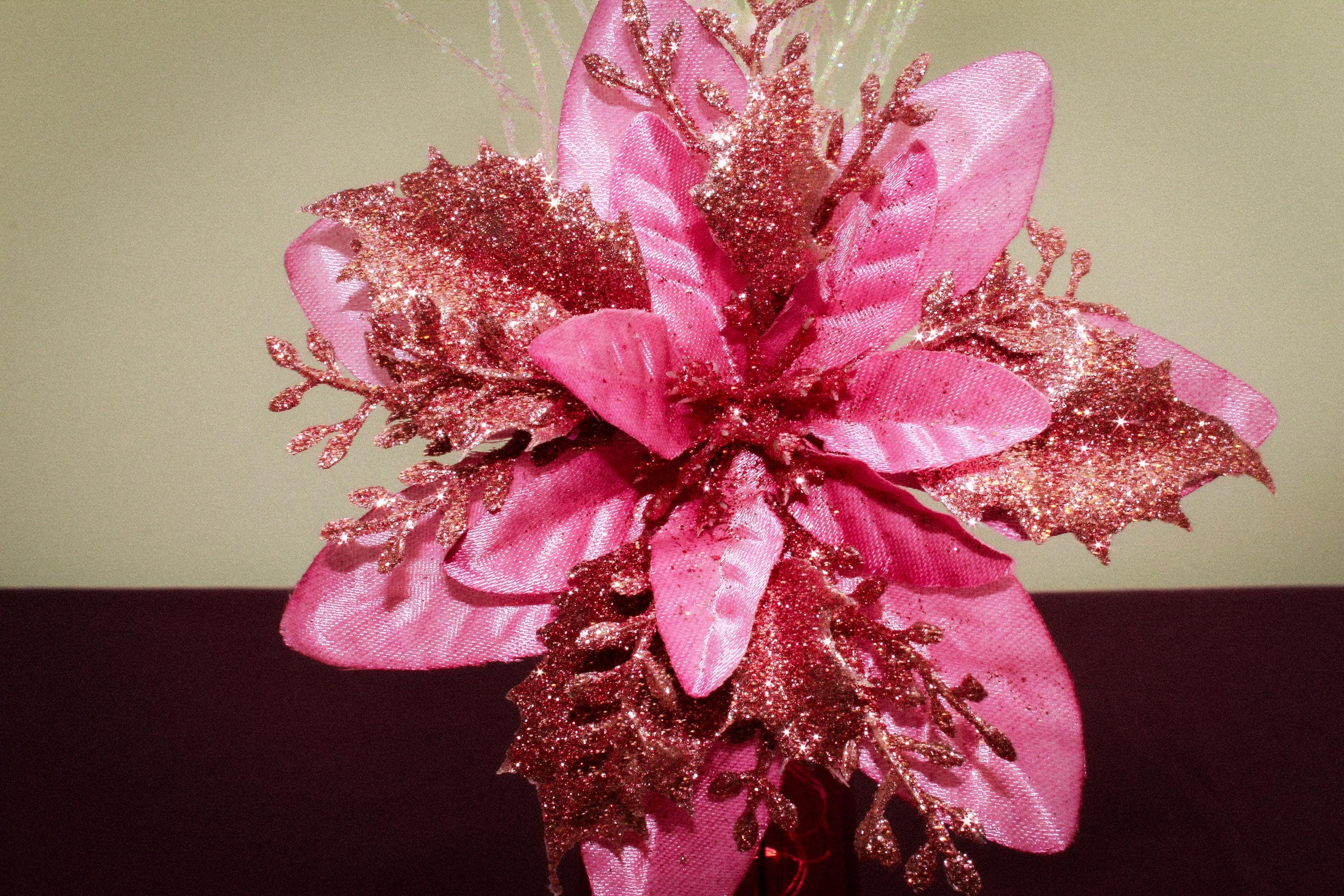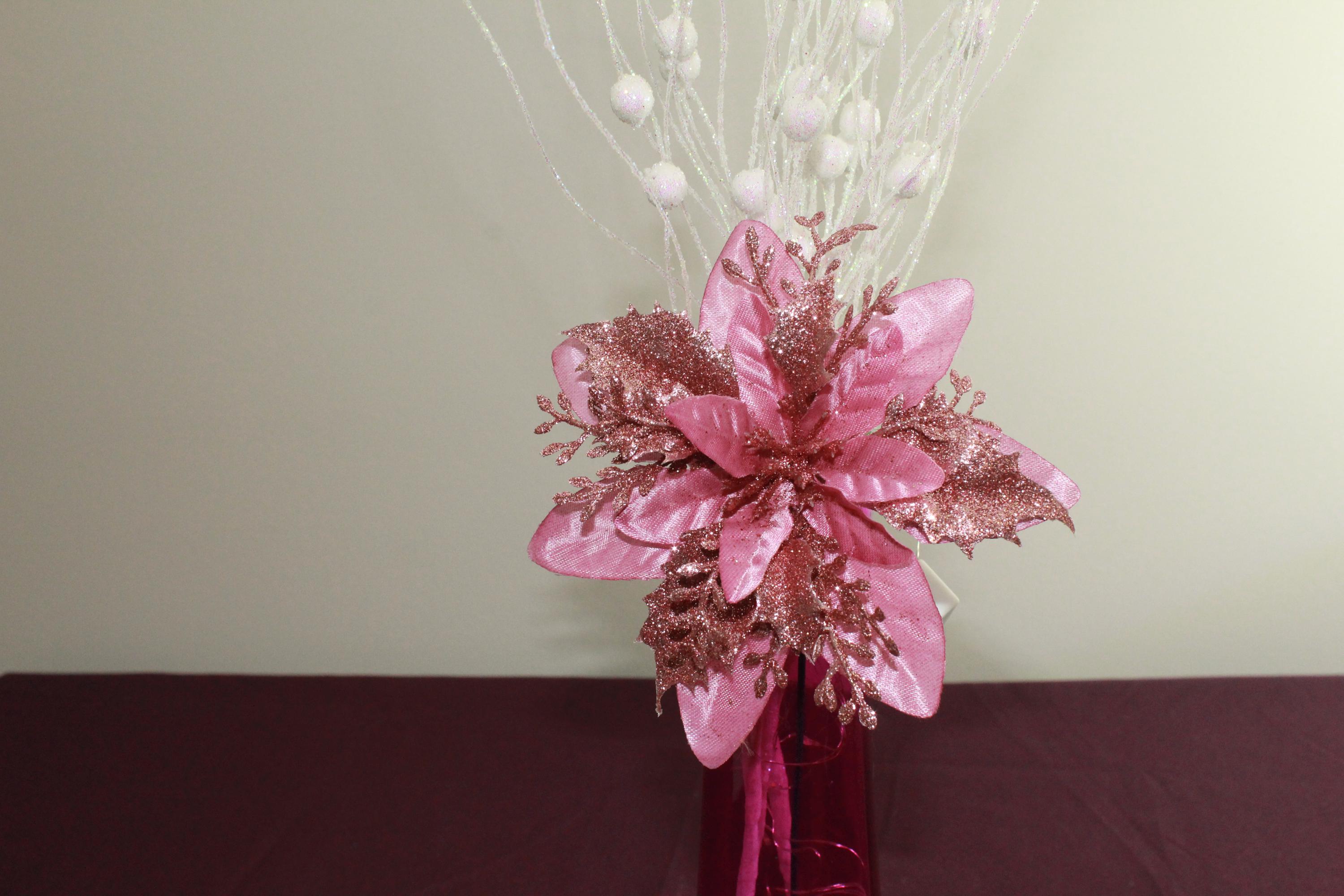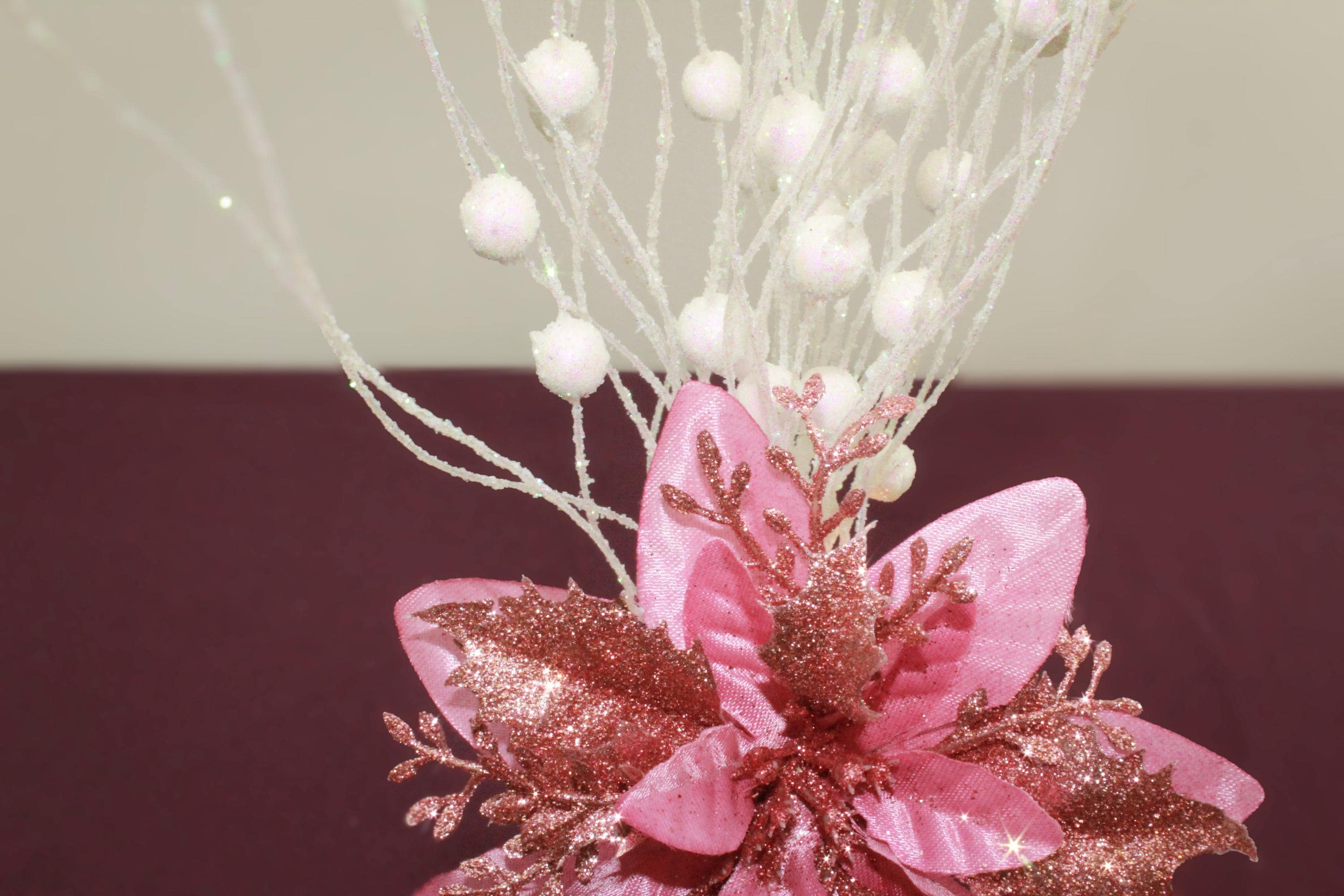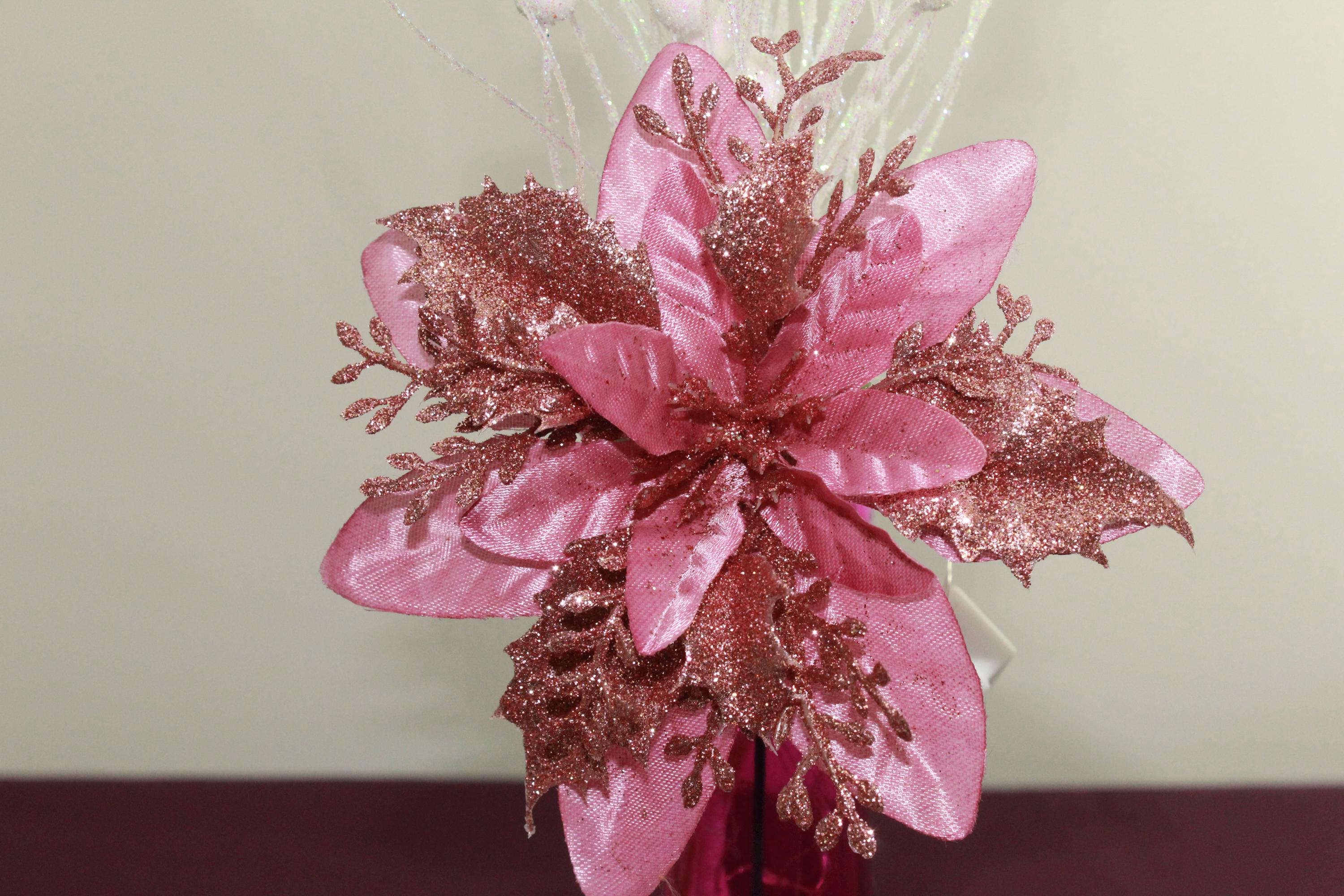 A gorgeous pink poinsettia with shimmering glitter accents for a festive glow.