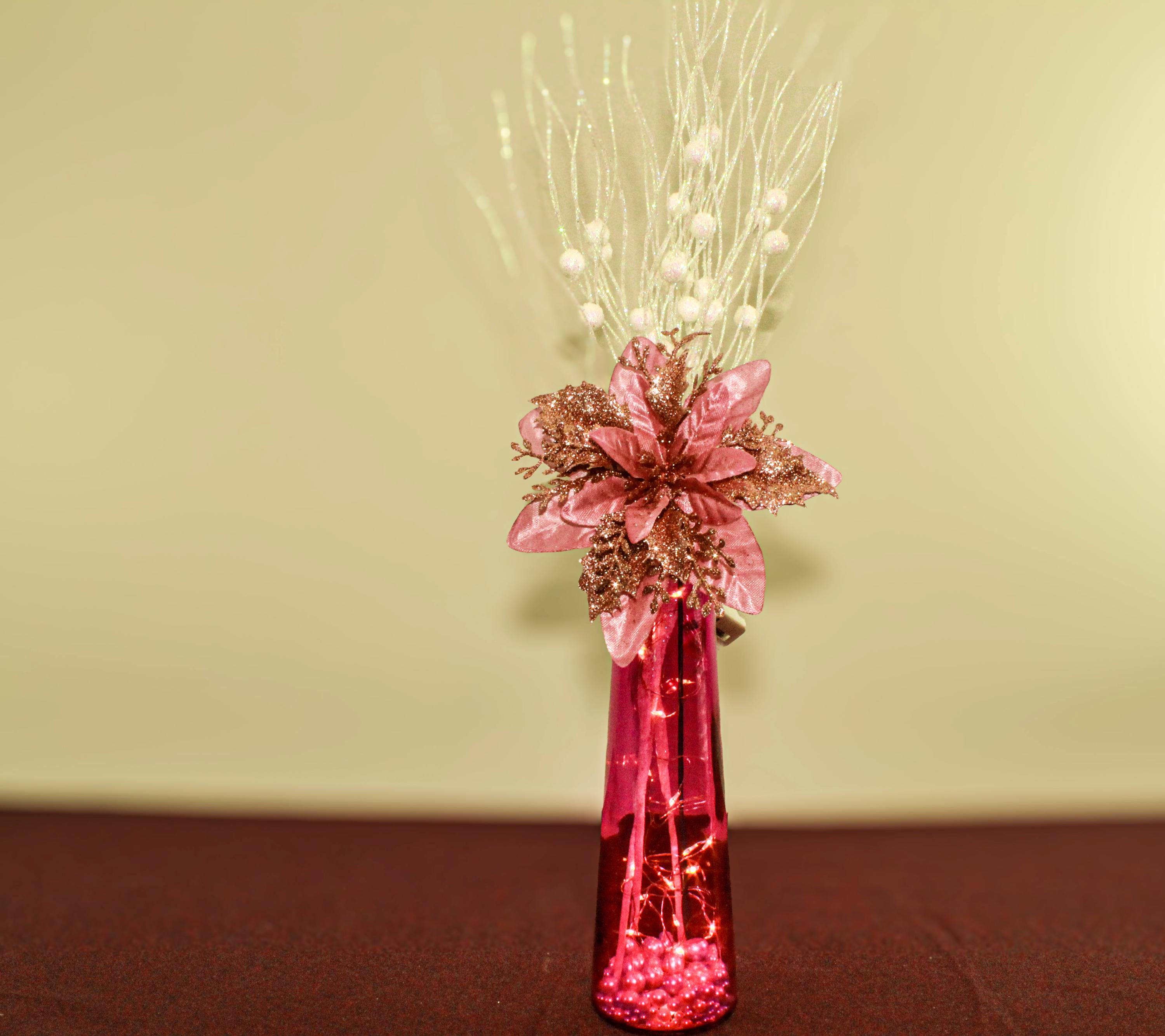 Add a touch of sophistication and festive charm to your home with this stunning Pink Poinsettia Arrangement. Featuring a glittering pink poinsettia, delicate white sparkle berry branches, and a base of radiant pearl marbles, all nestled in a chic pink fluted vase, this handcrafted centerpiece is the perfect accent for the holiday season.