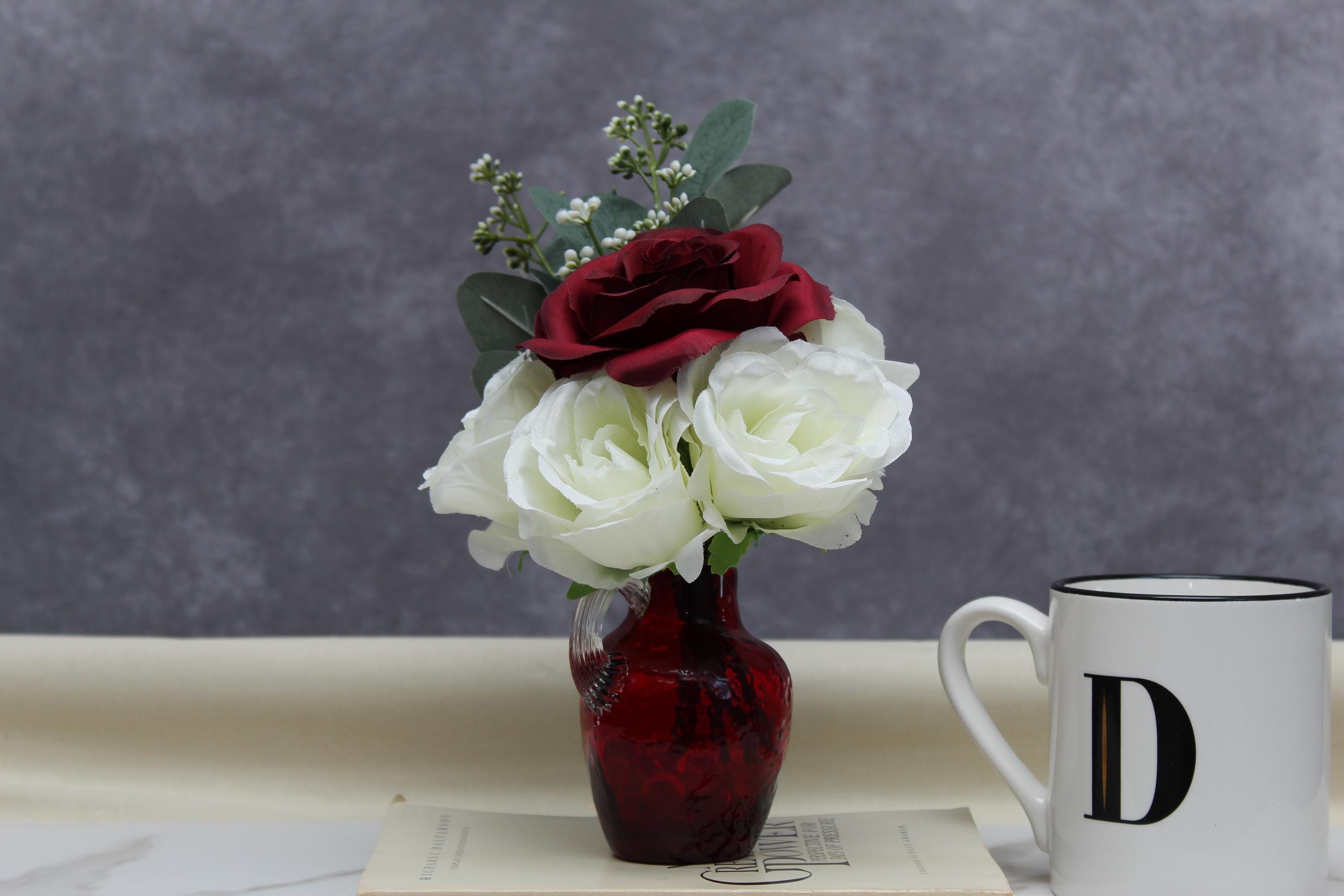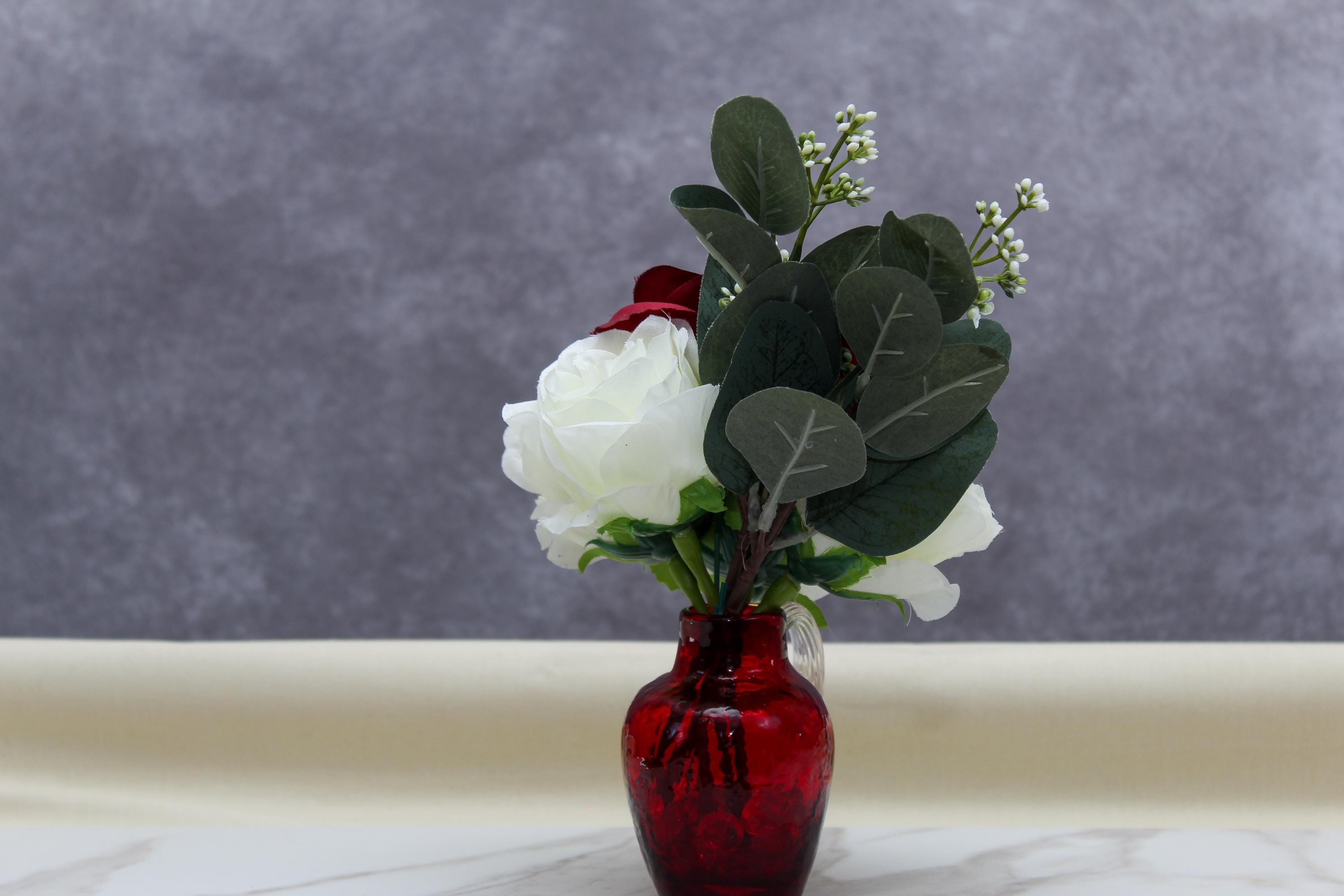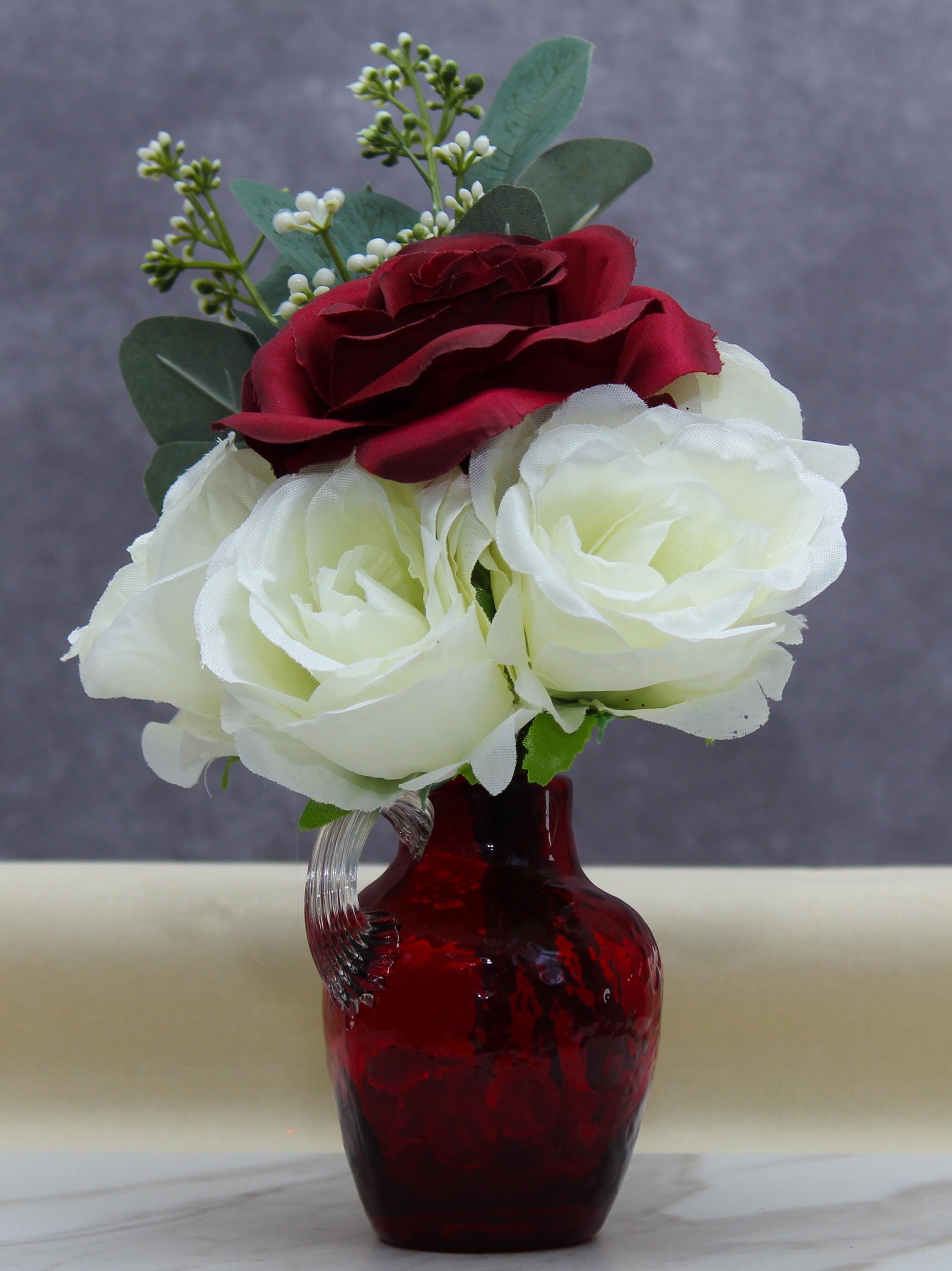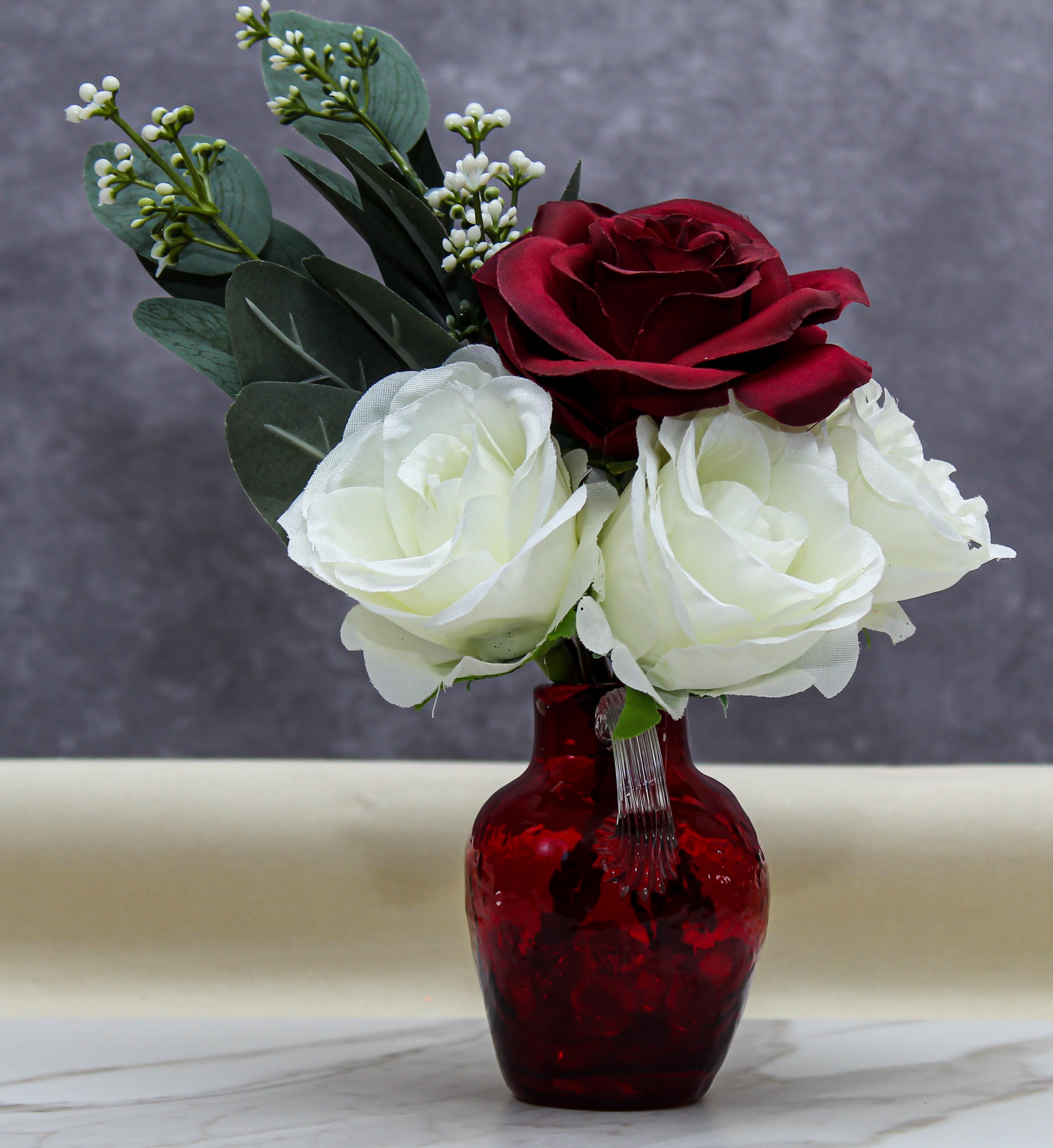 Add an elegant touch to your space with this stunning faux flower arrangement featuring deep red roses, soft white roses, and lush eucalyptus. Displayed in a small red textured handled vase, this arrangement exudes timeless beauty and sophistication. Perfect as a centerpiece, home décor accent, or a thoughtful gift for special occasions such as Valentine’s Day, anniversaries, or housewarmings. Its compact size makes it ideal for coffee tables, nightstands, or office desks, while the durable materials ensure long-lasting charm without the need for maintenance.