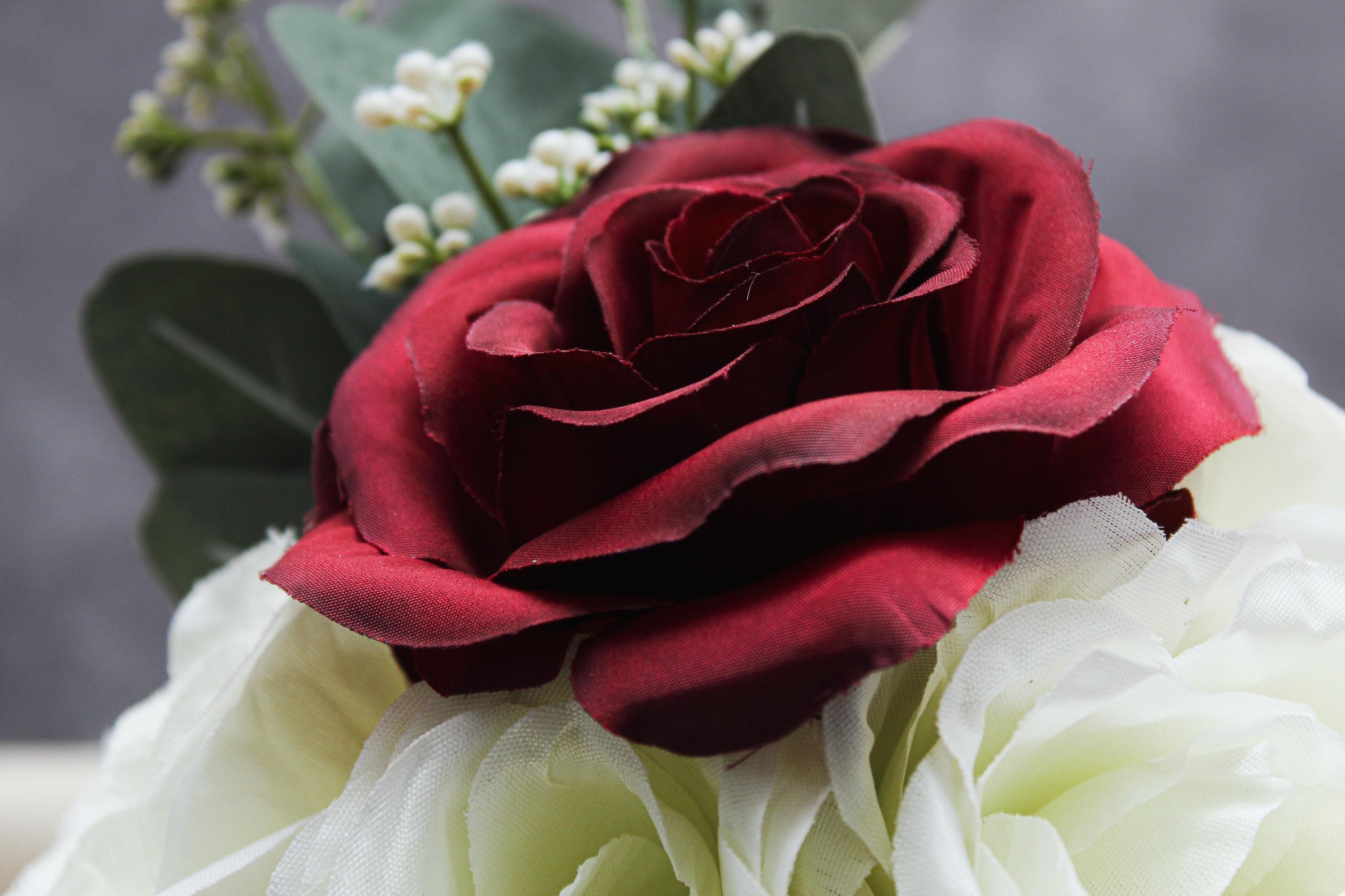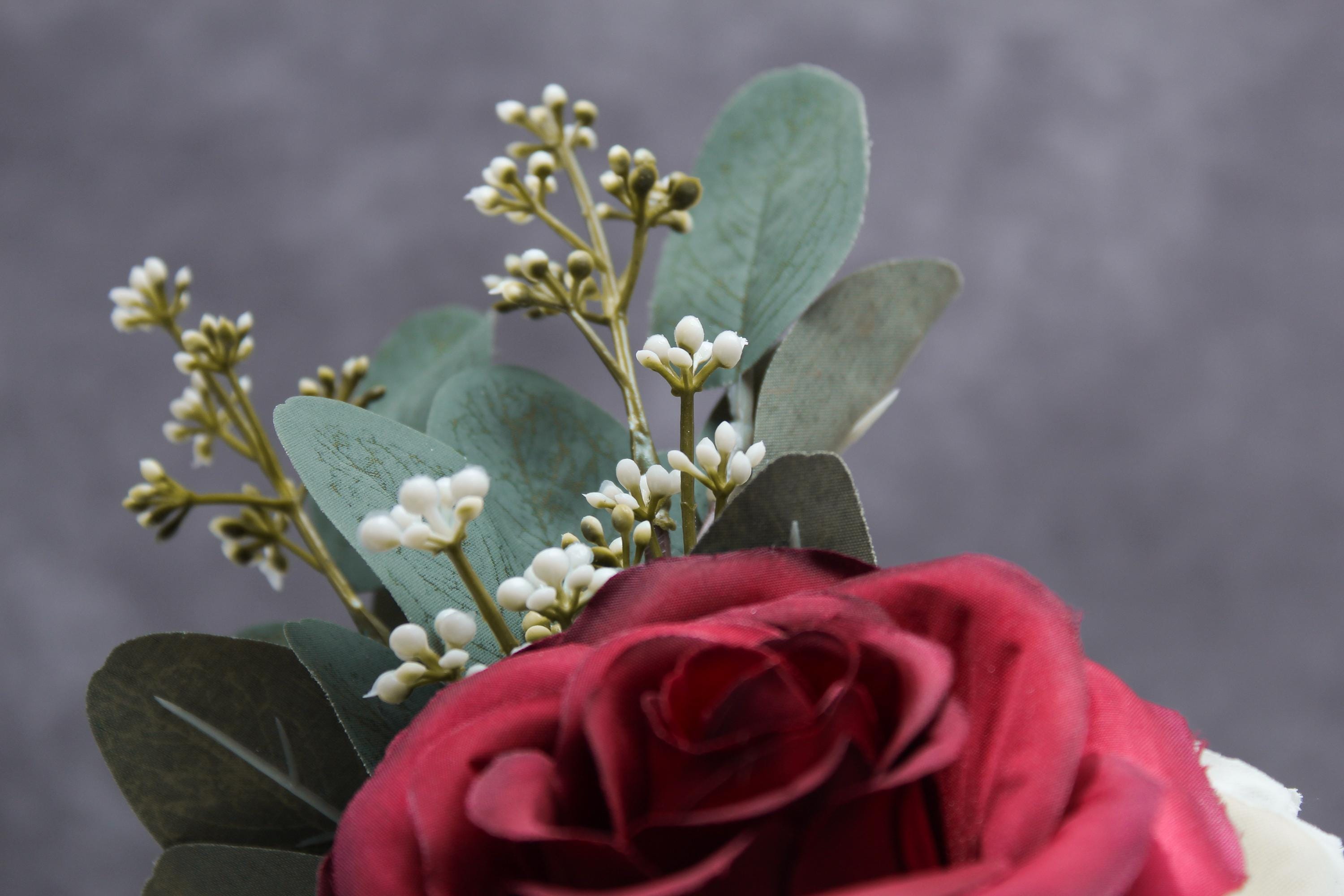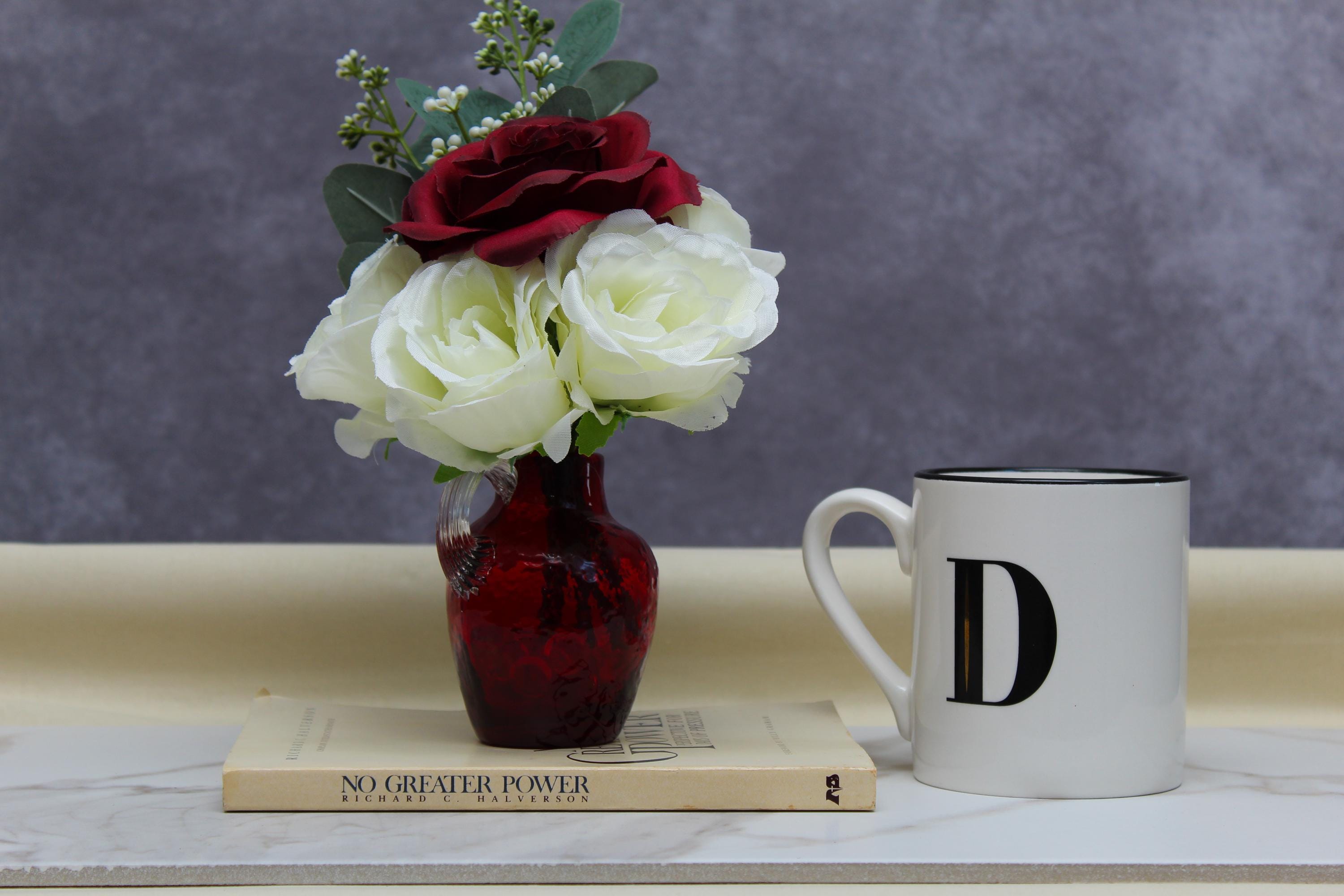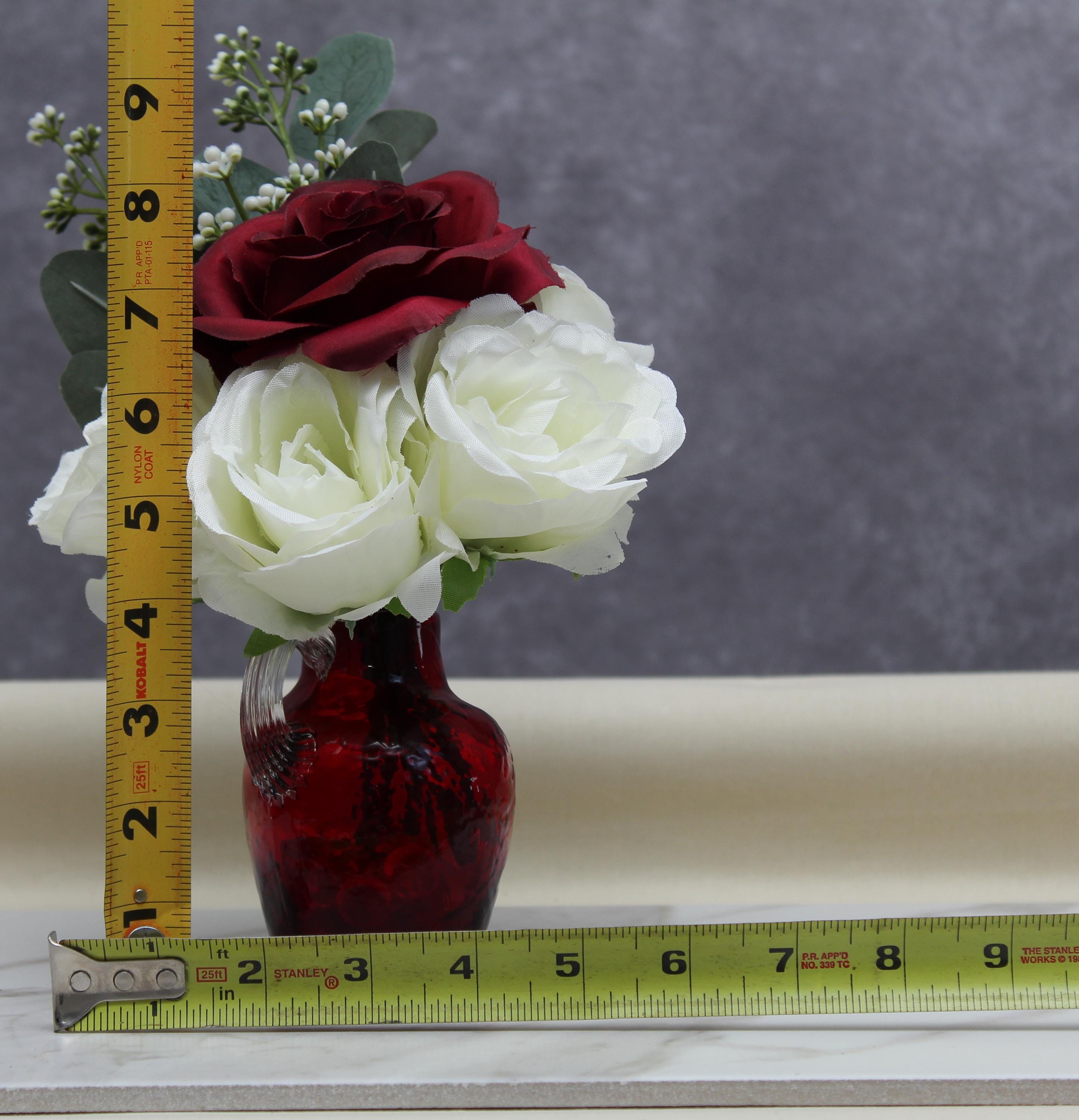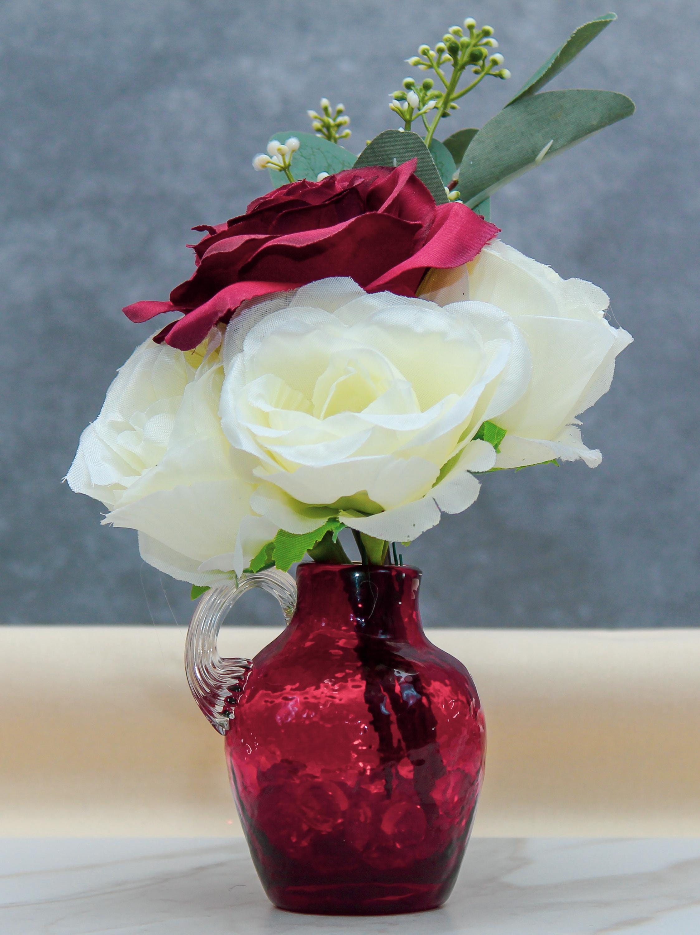 Add an elegant touch to your space with this stunning faux flower arrangement featuring deep red roses, soft white roses, and lush eucalyptus. Displayed in a small red textured handled vase, this arrangement exudes timeless beauty and sophistication. Perfect as a centerpiece, home décor accent, or a thoughtful gift for special occasions such as Valentine’s Day, anniversaries, or housewarmings. Its compact size makes it ideal for coffee tables, nightstands, or office desks, while the durable materials ensure long-lasting charm without the need for maintenance.