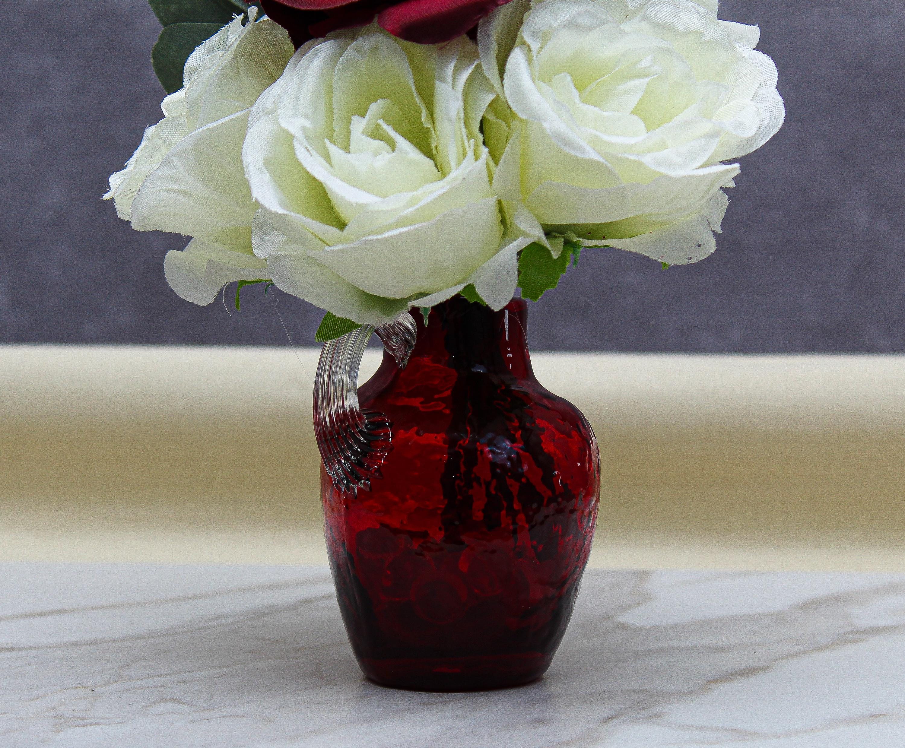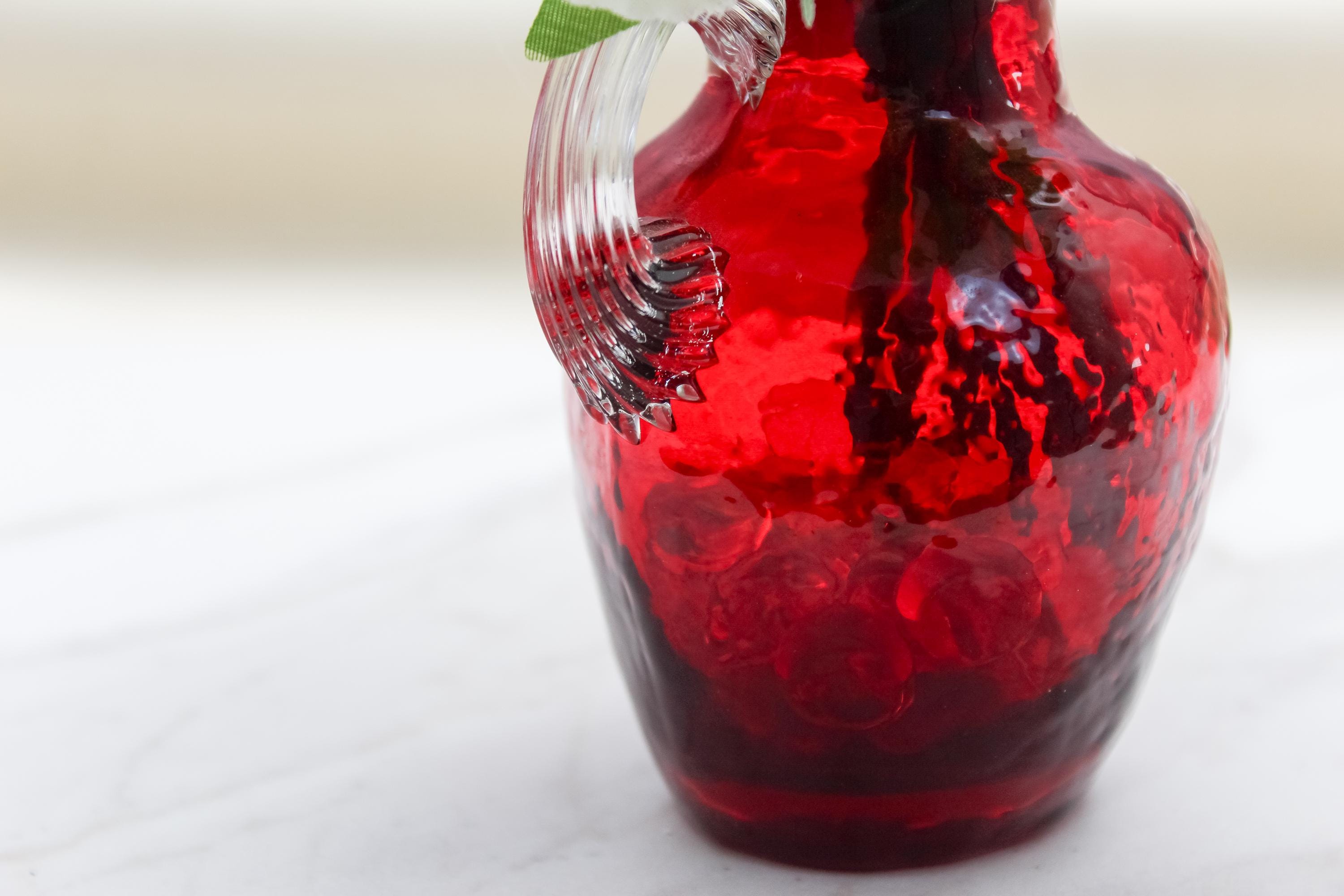 Vase: Red textured glass vase with a delicate handle for a vintage-inspired look.