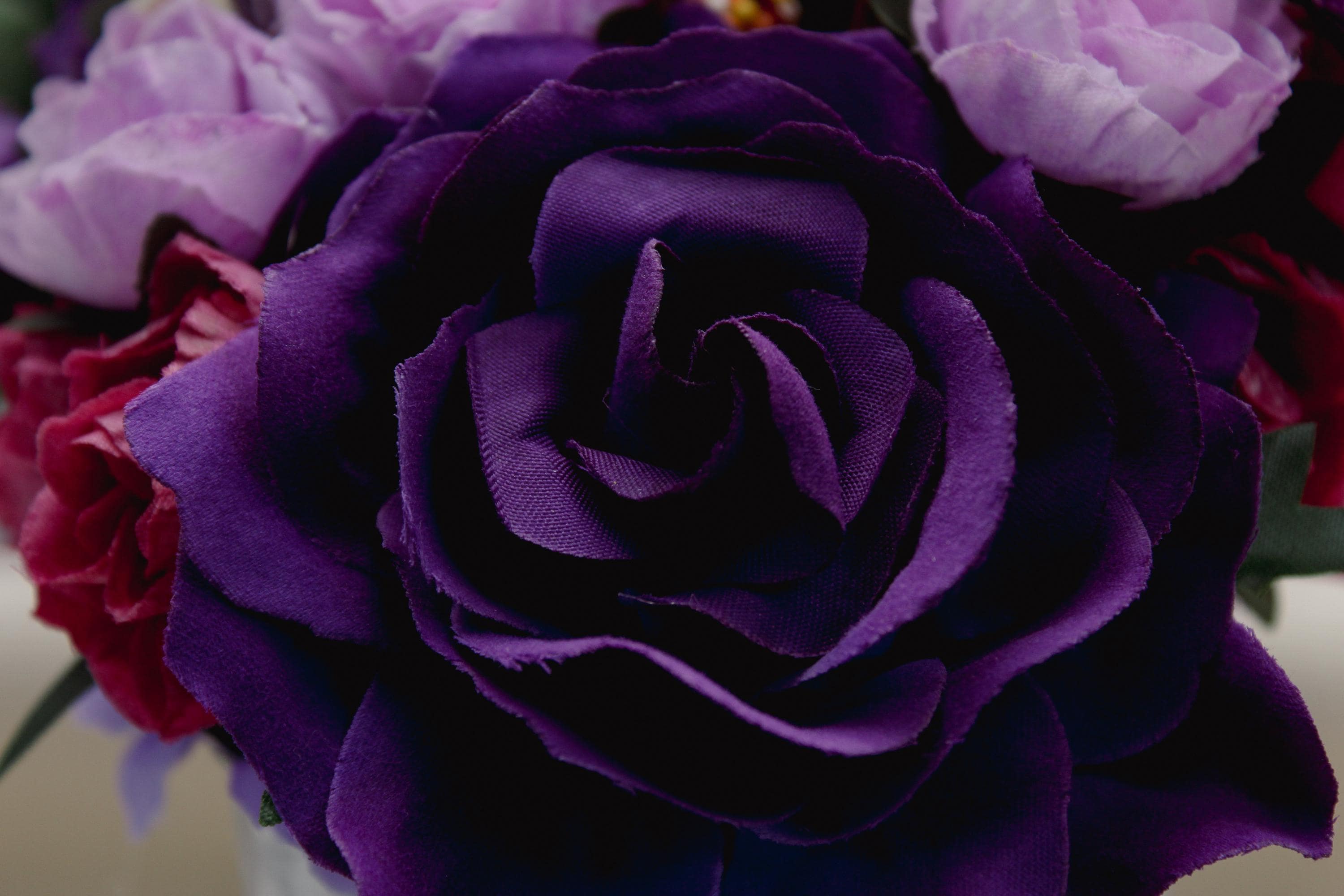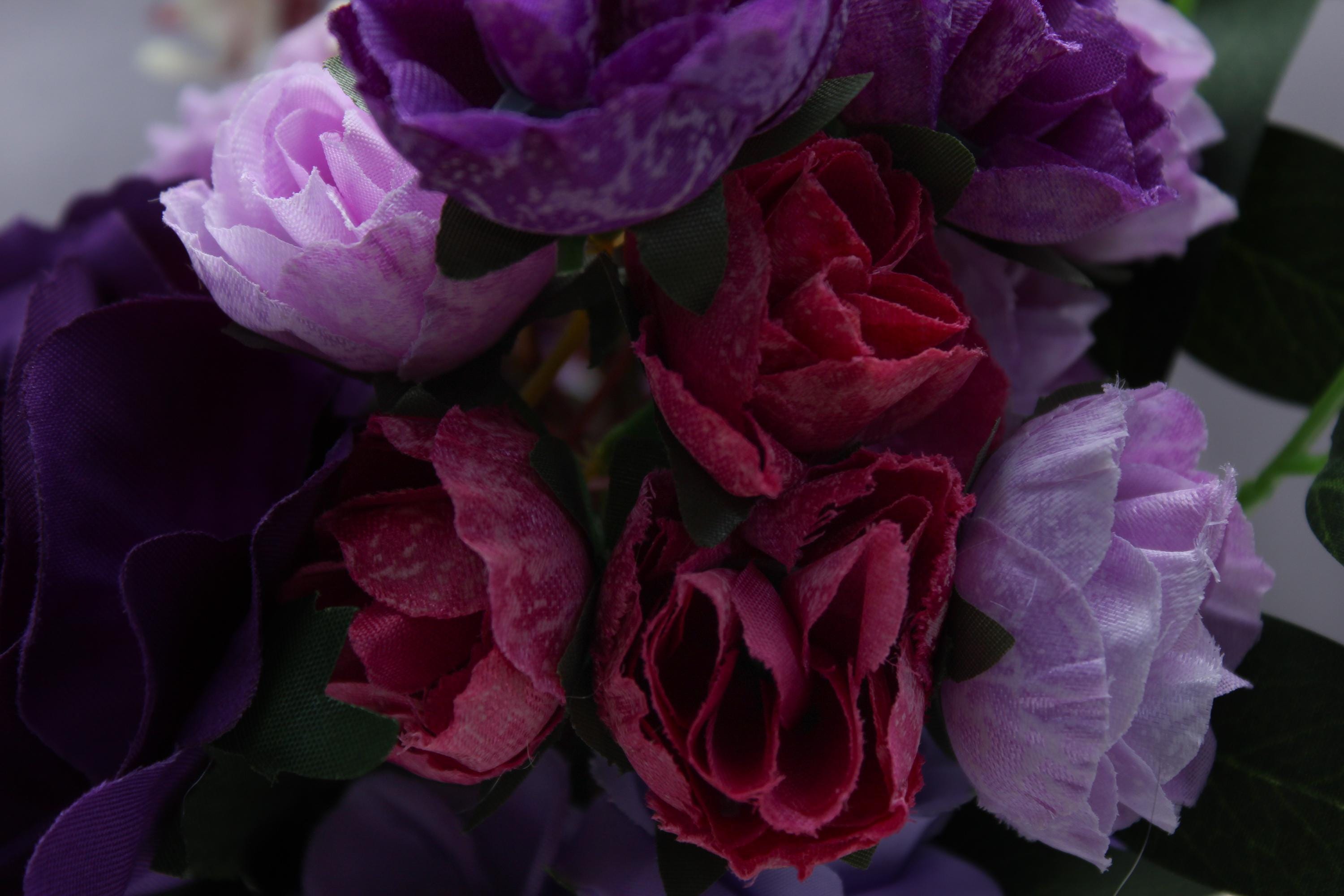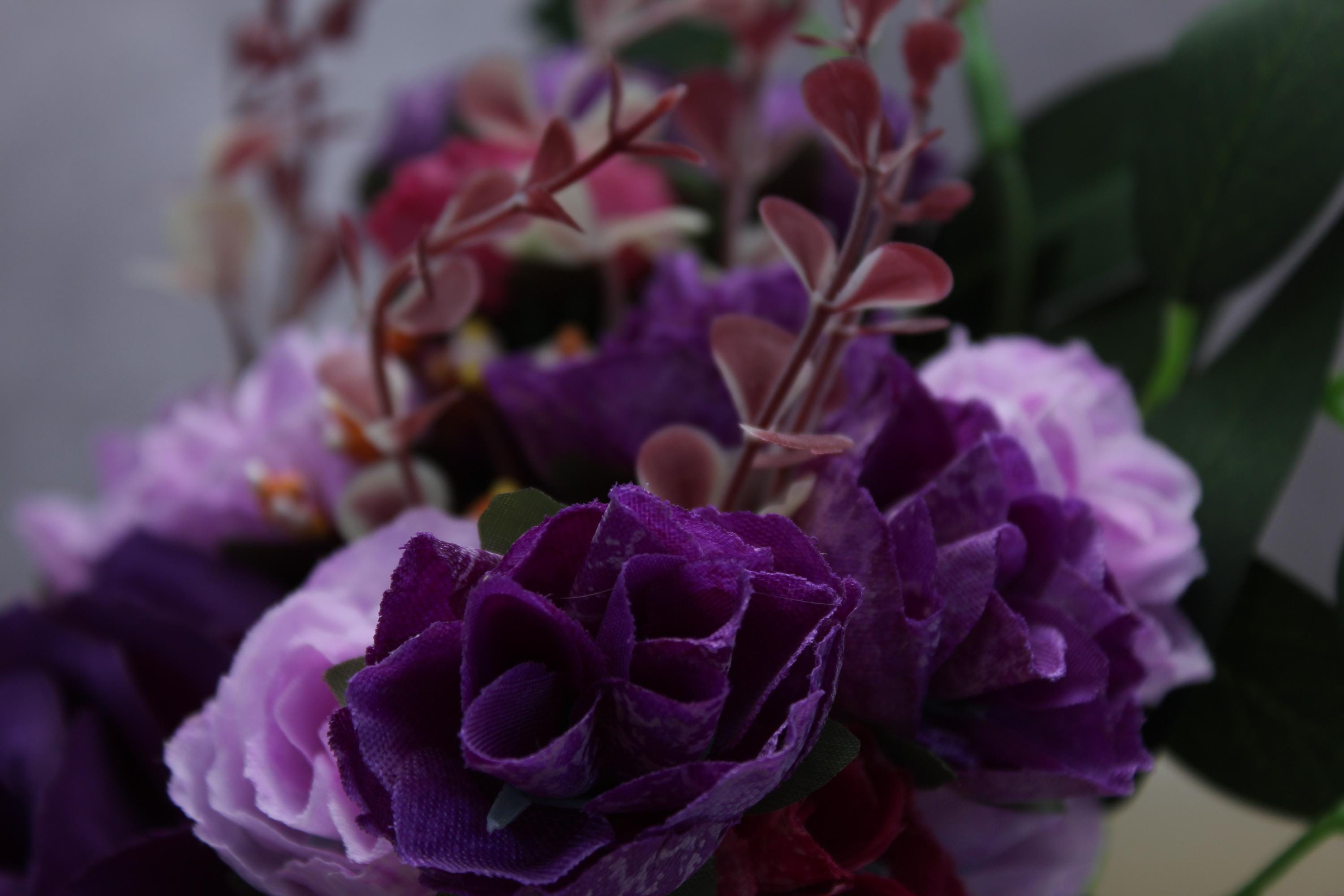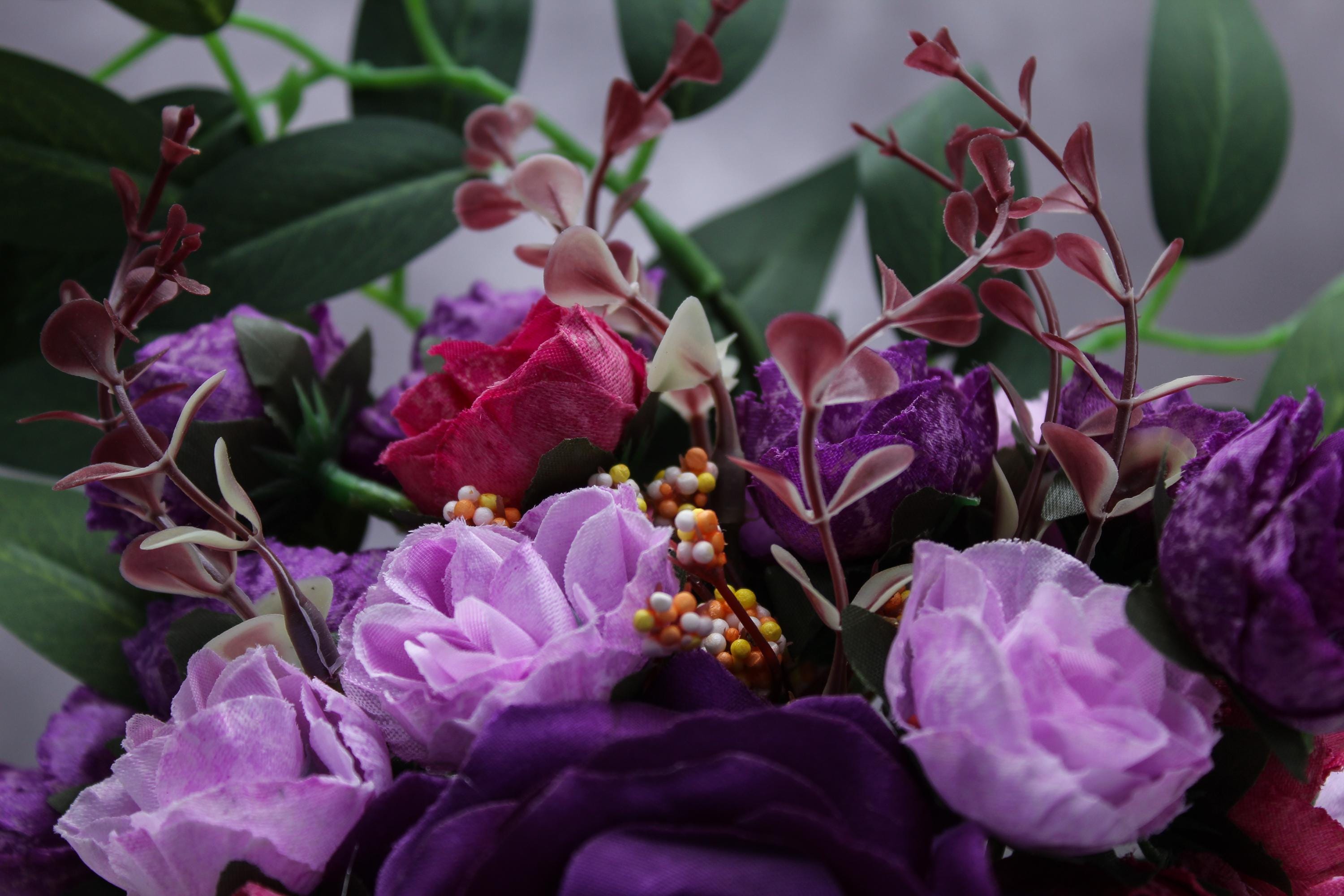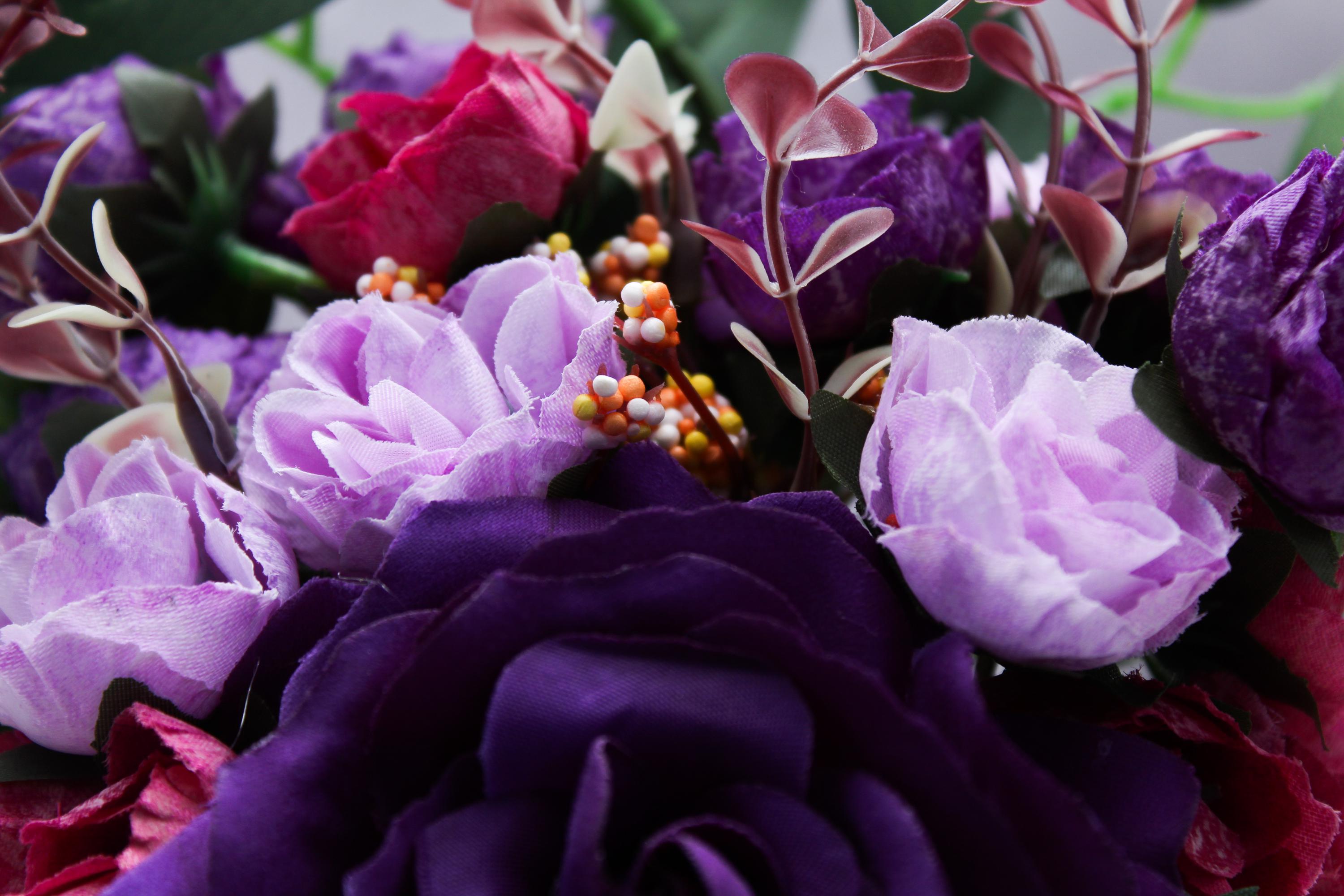 Floral Composition: Deep purple roses, pink blossoms, lush green foliage.