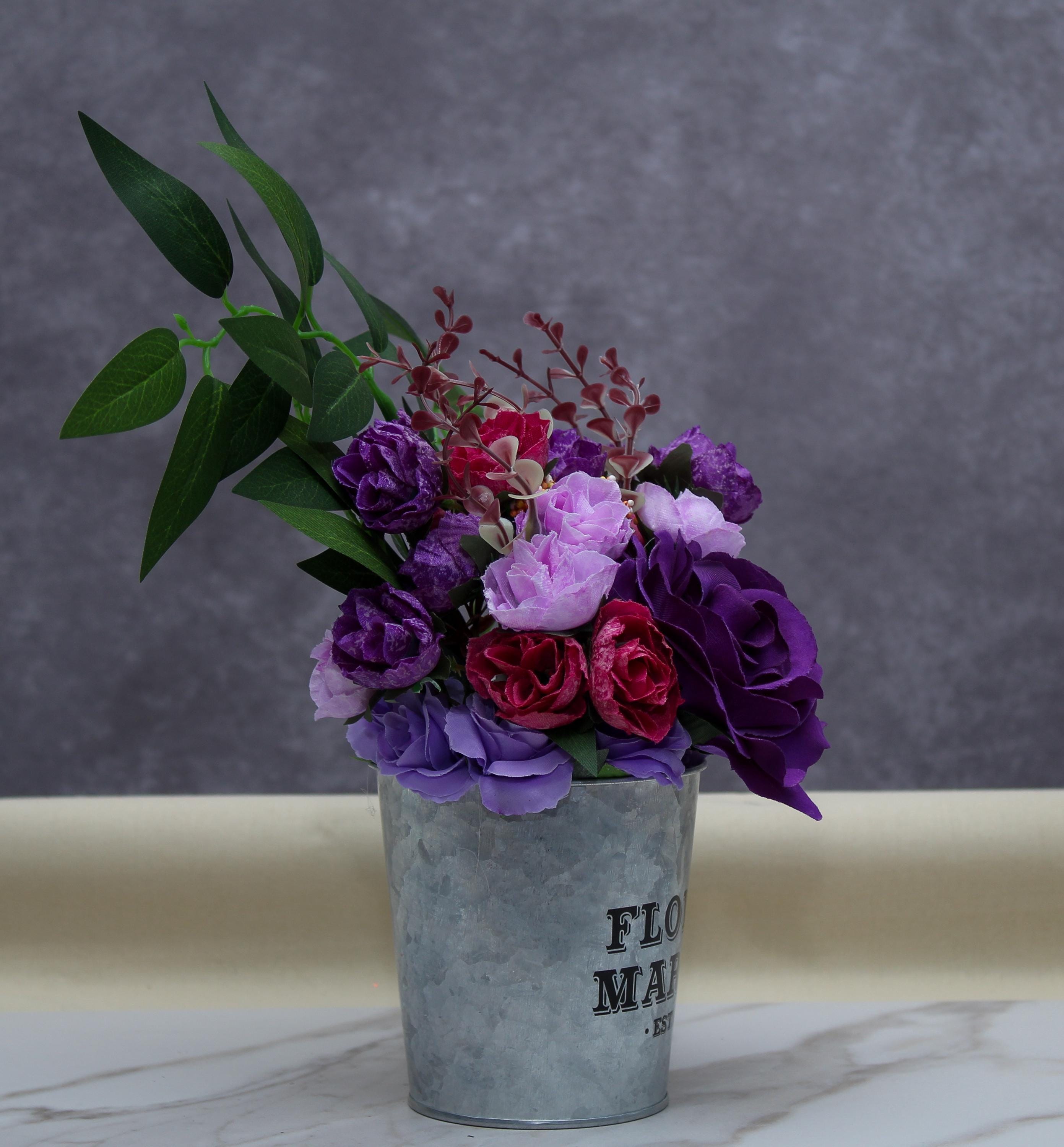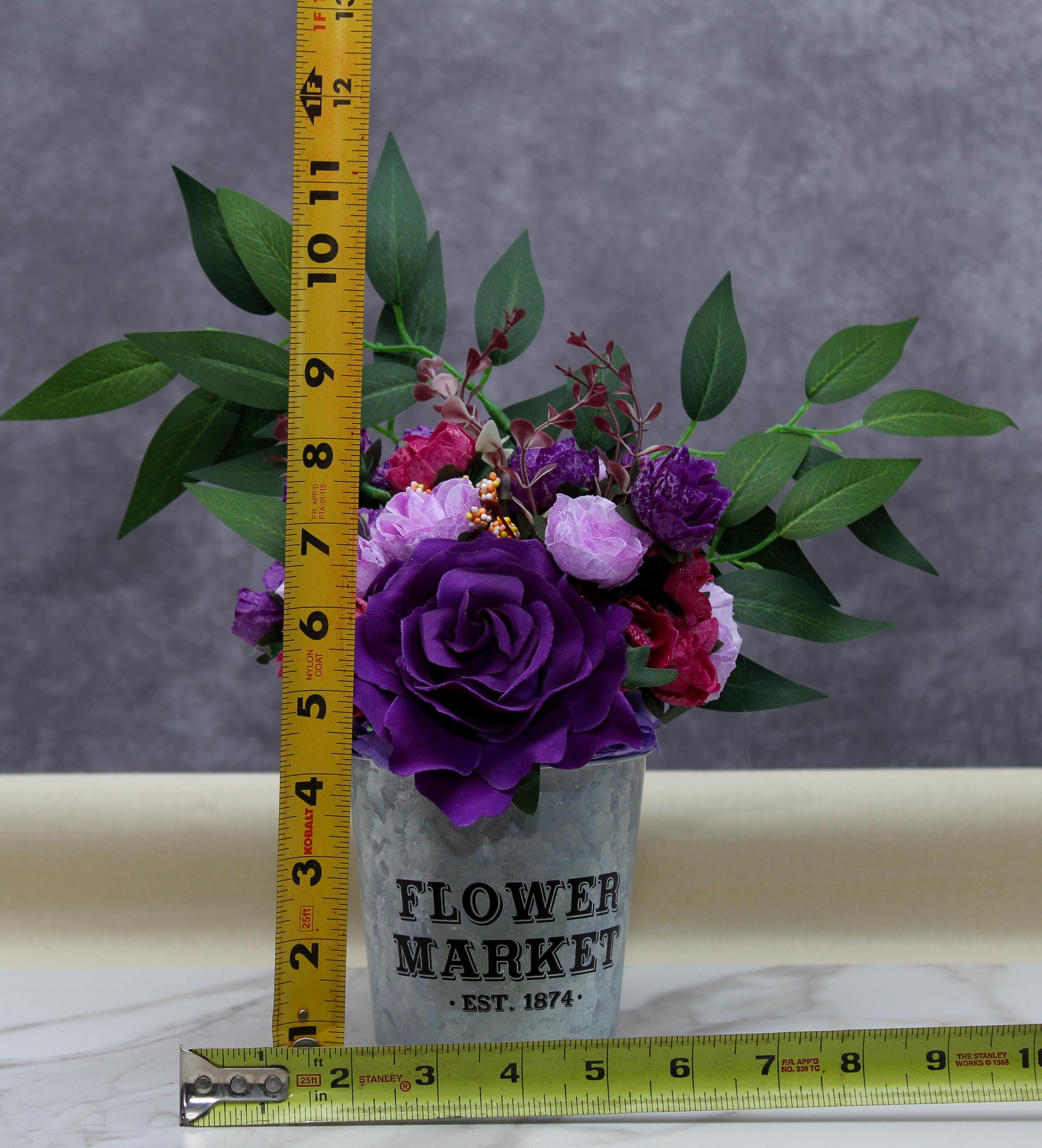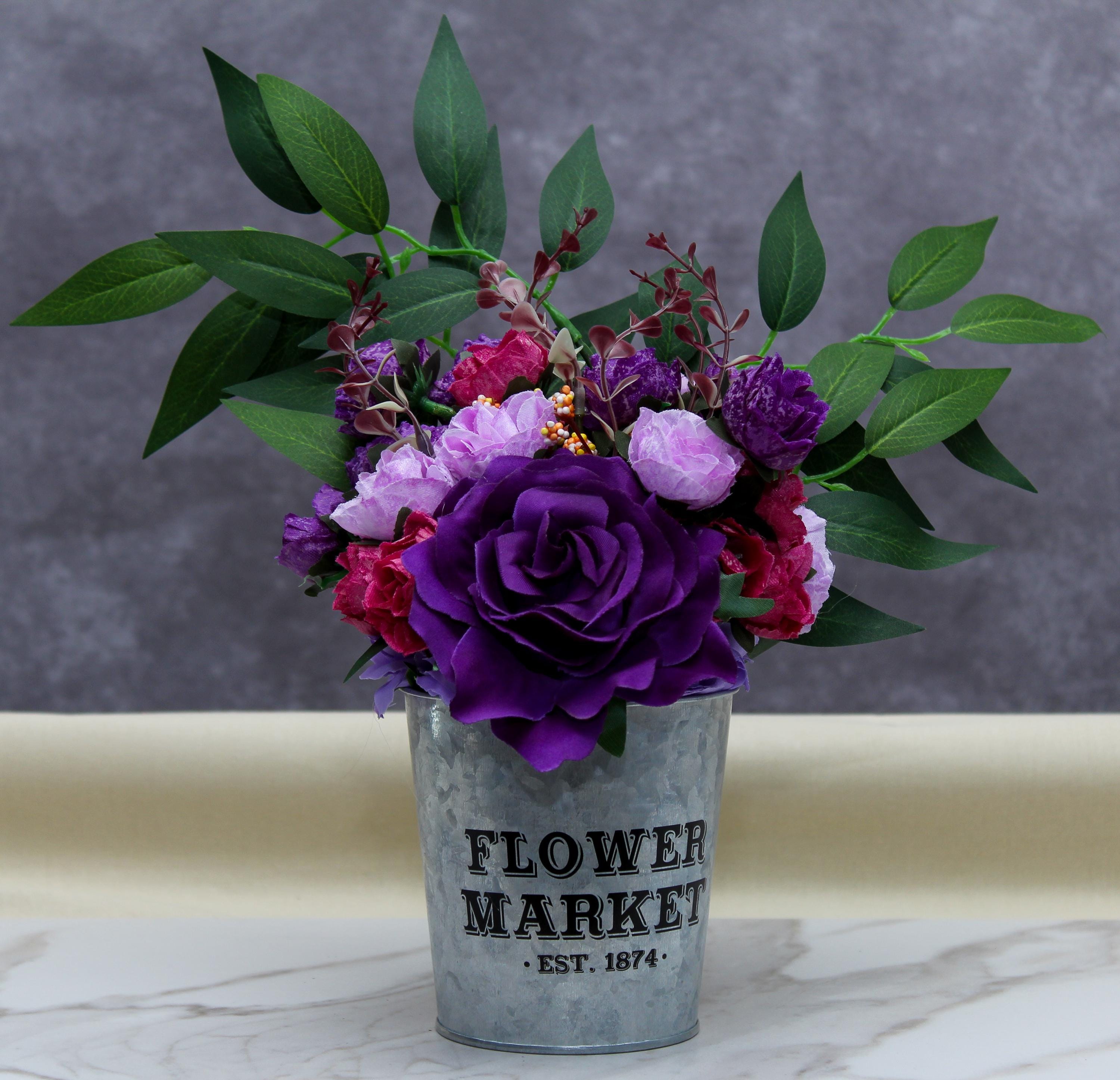 Add a splash of vibrant elegance to your home with this captivating faux flower arrangement. Featuring a stunning blend of lush purple roses, soft pink blossoms, and delicate greenery, this arrangement is beautifully presented in a rustic "Flower Market EST. 1874" galvanized tin. The contrast of bold purples, rich pinks, and lush green foliage creates an eye-catching centerpiece or accent piece for any room.