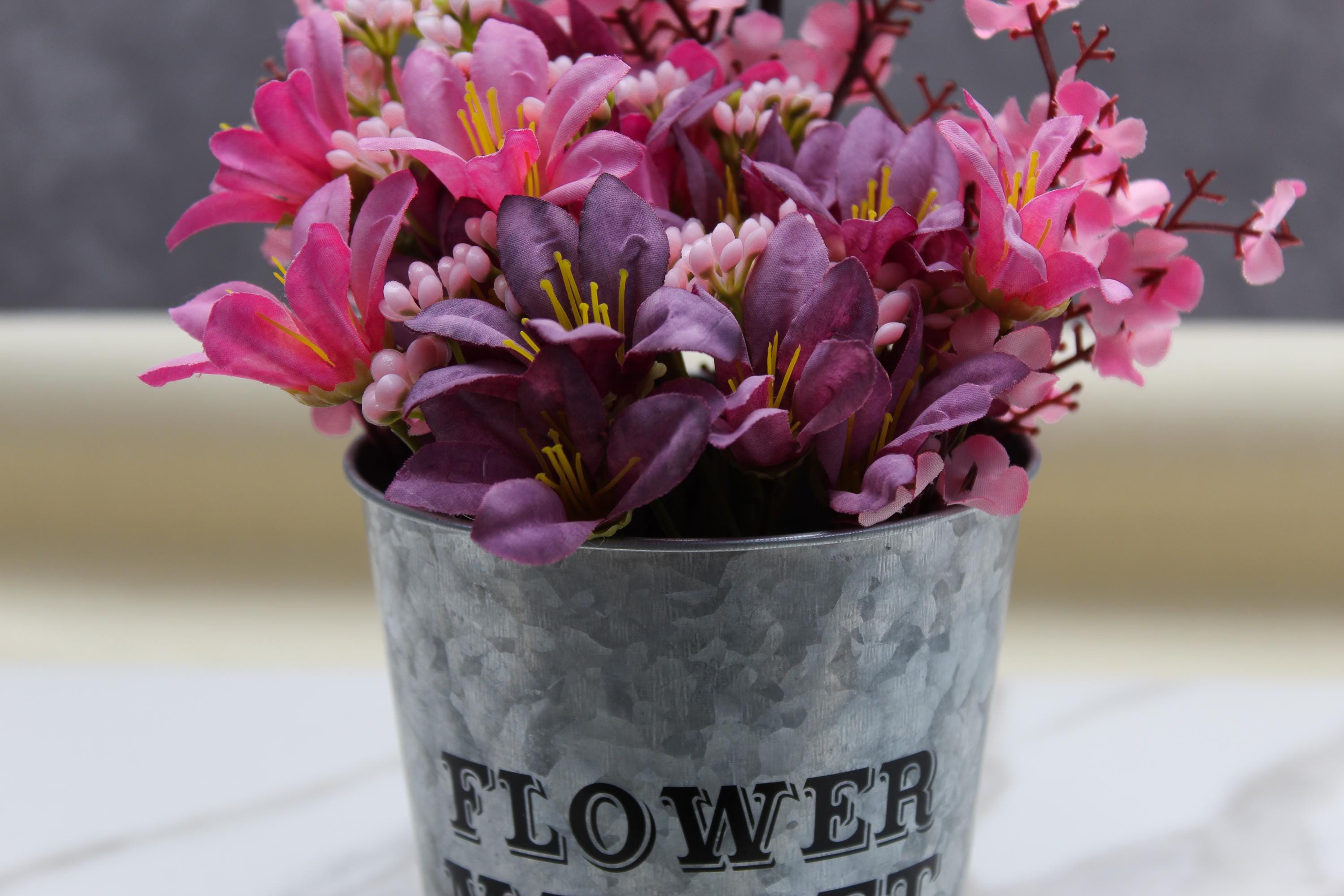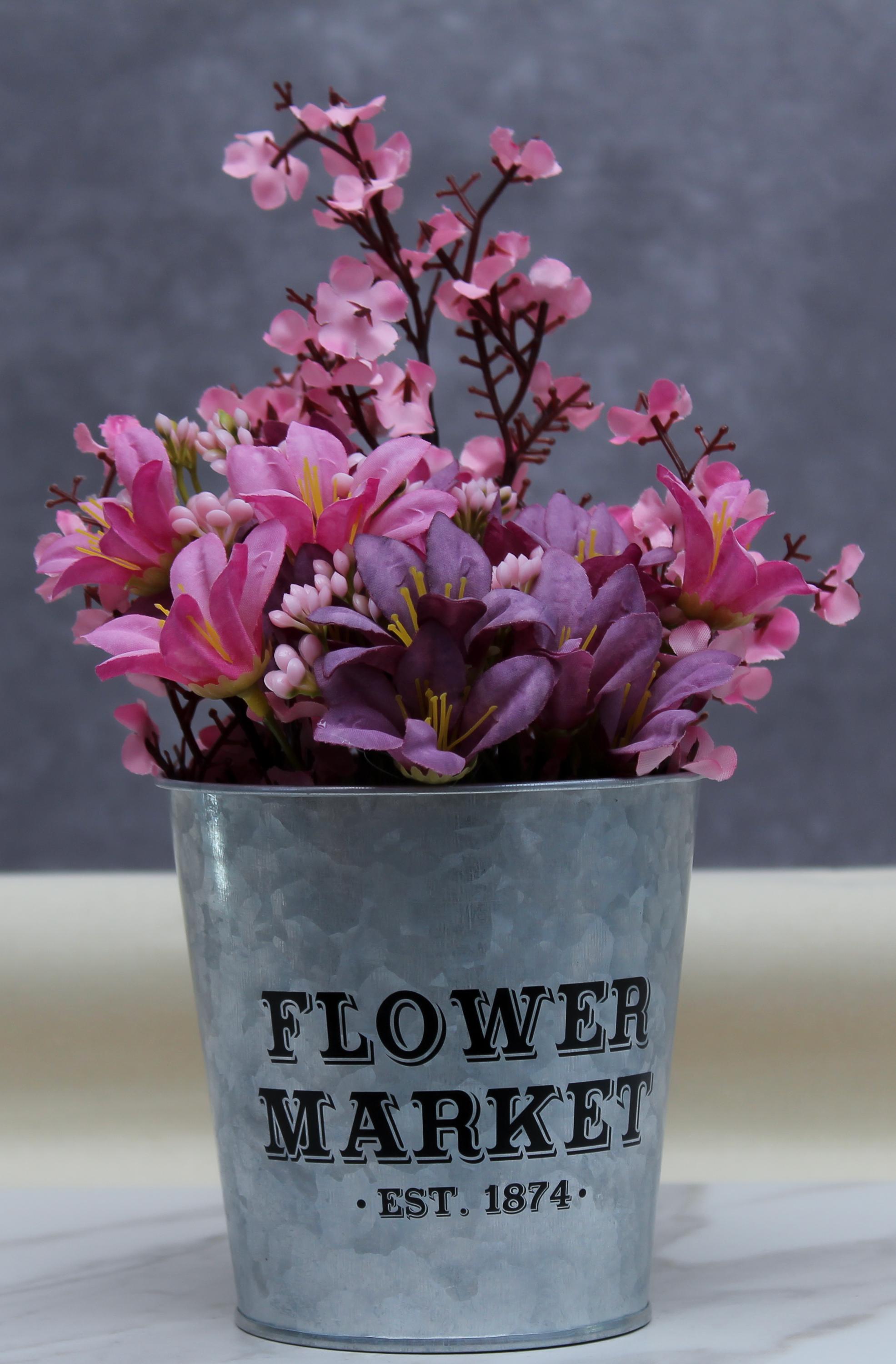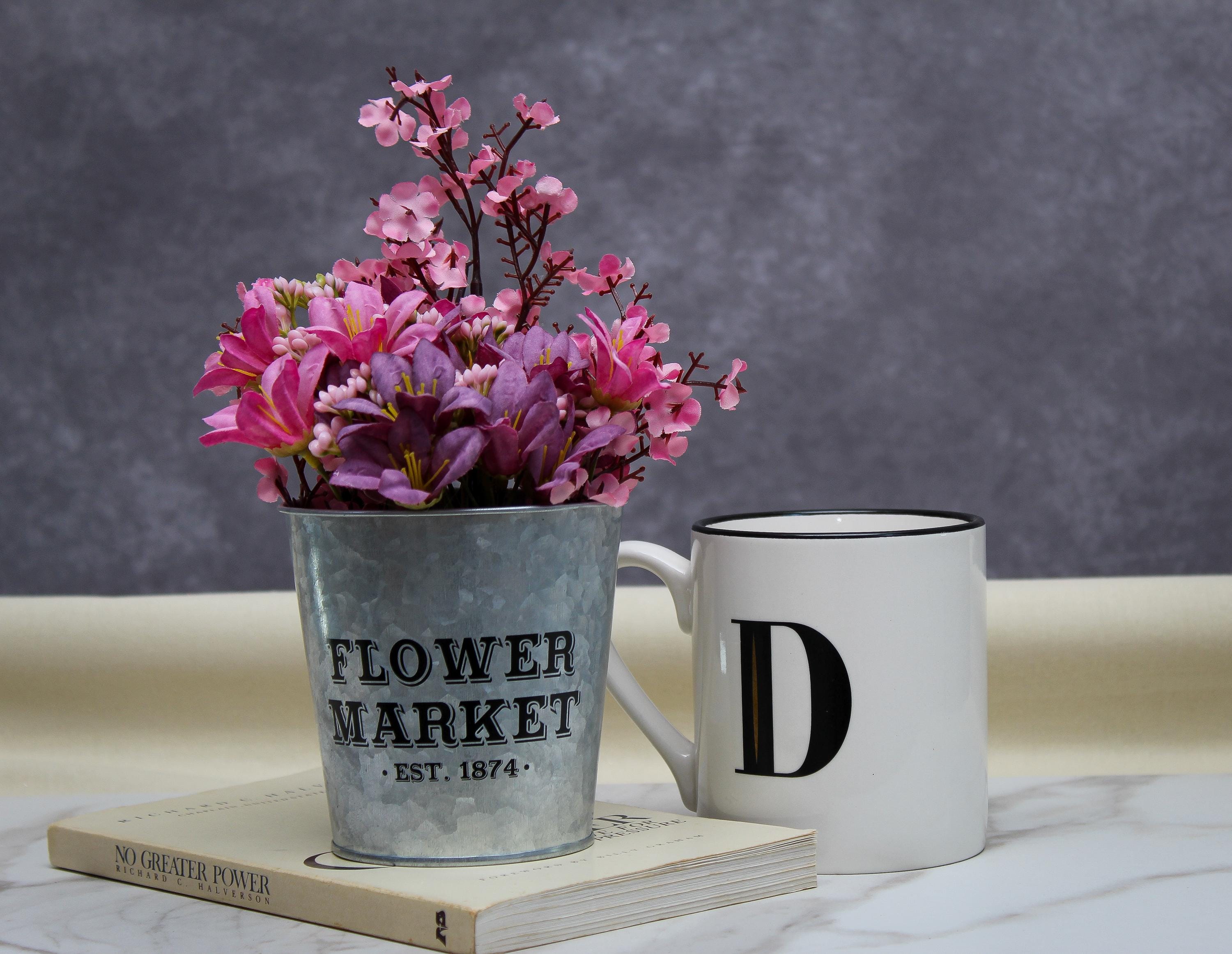 The galvanized pail with “Flower Market, Est. 1874” offers a vintage, farmhouse-inspired design.