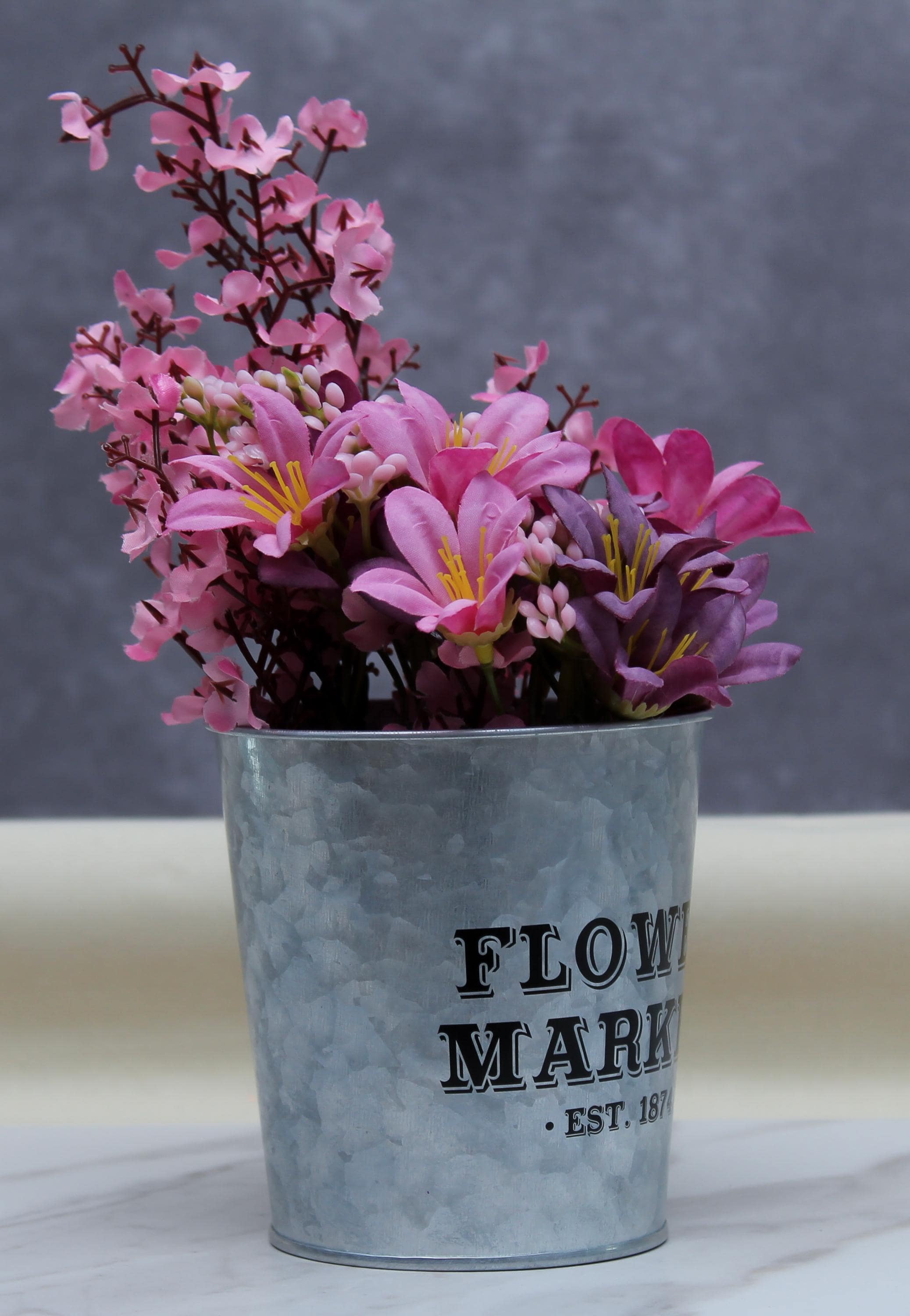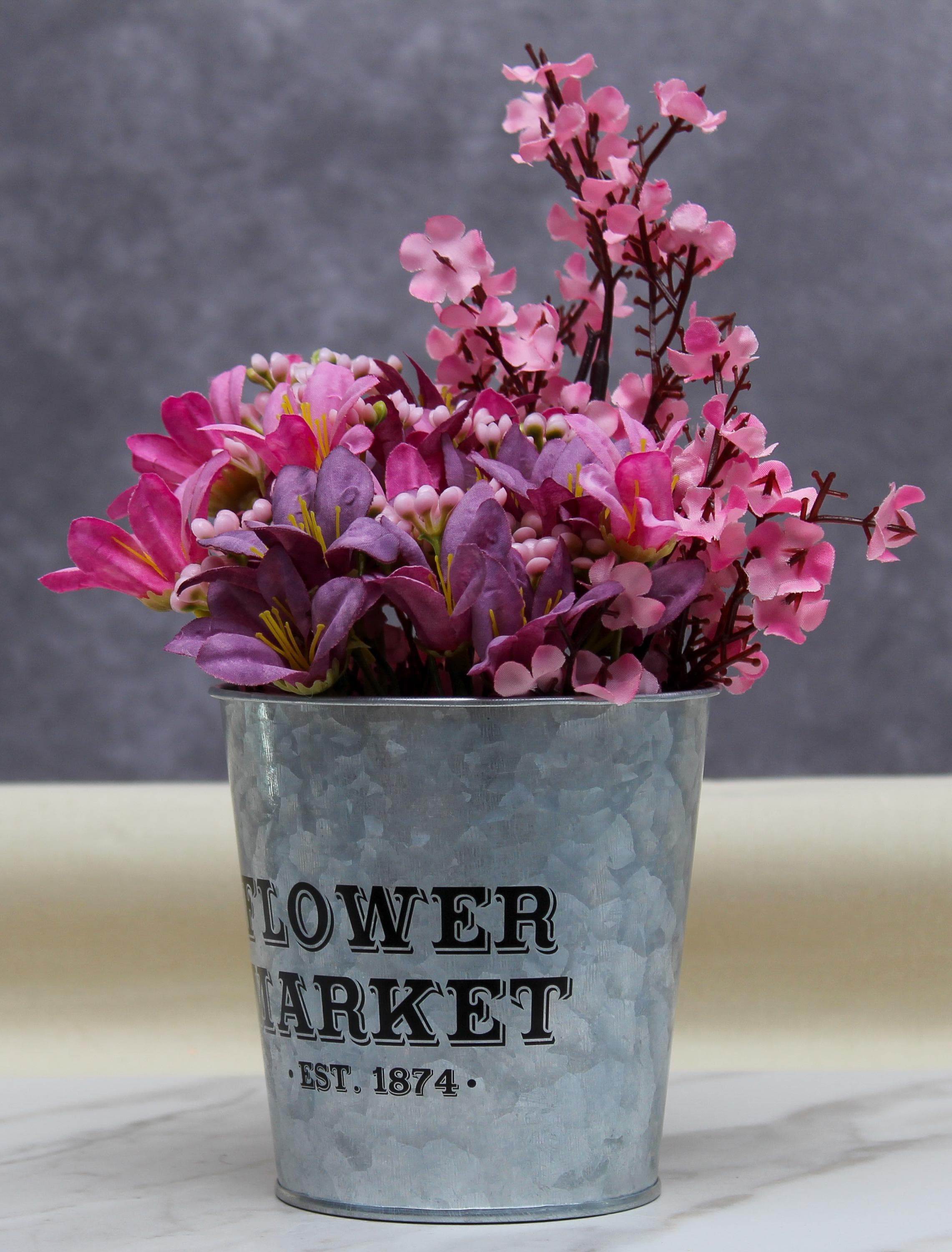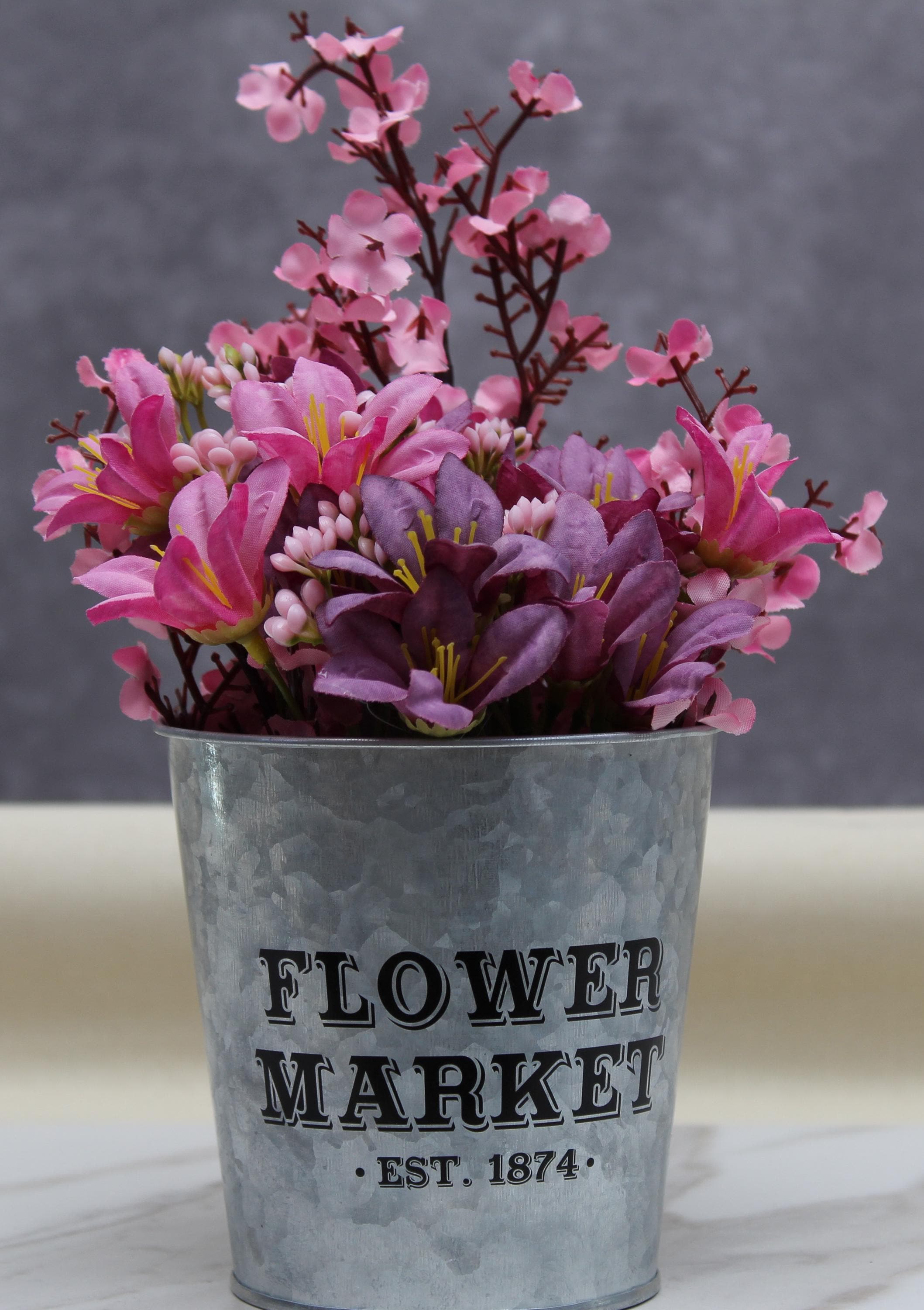 The galvanized pail with “Flower Market, Est. 1874” offers a vintage, farmhouse-inspired design.