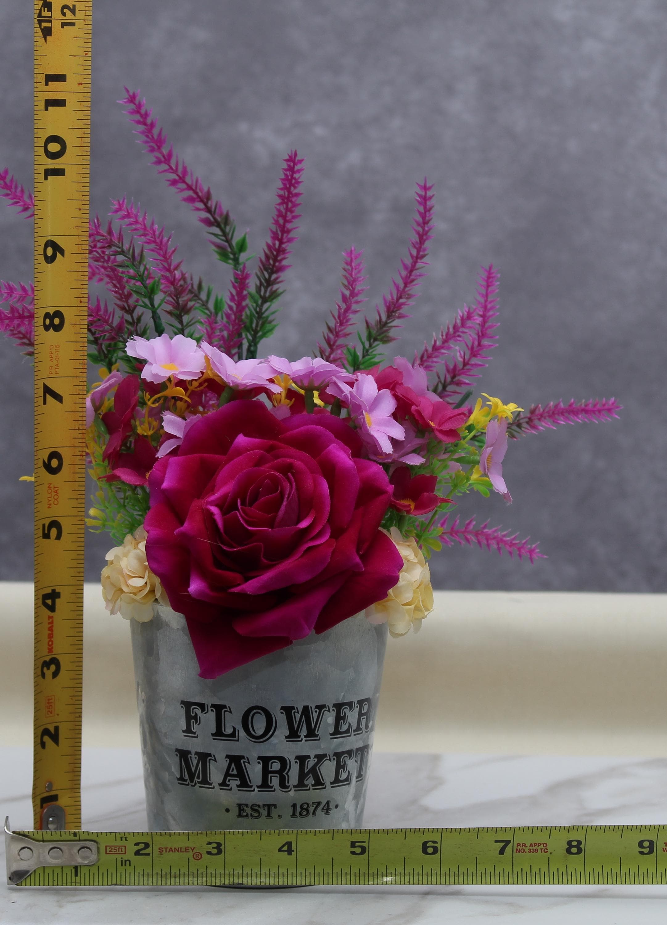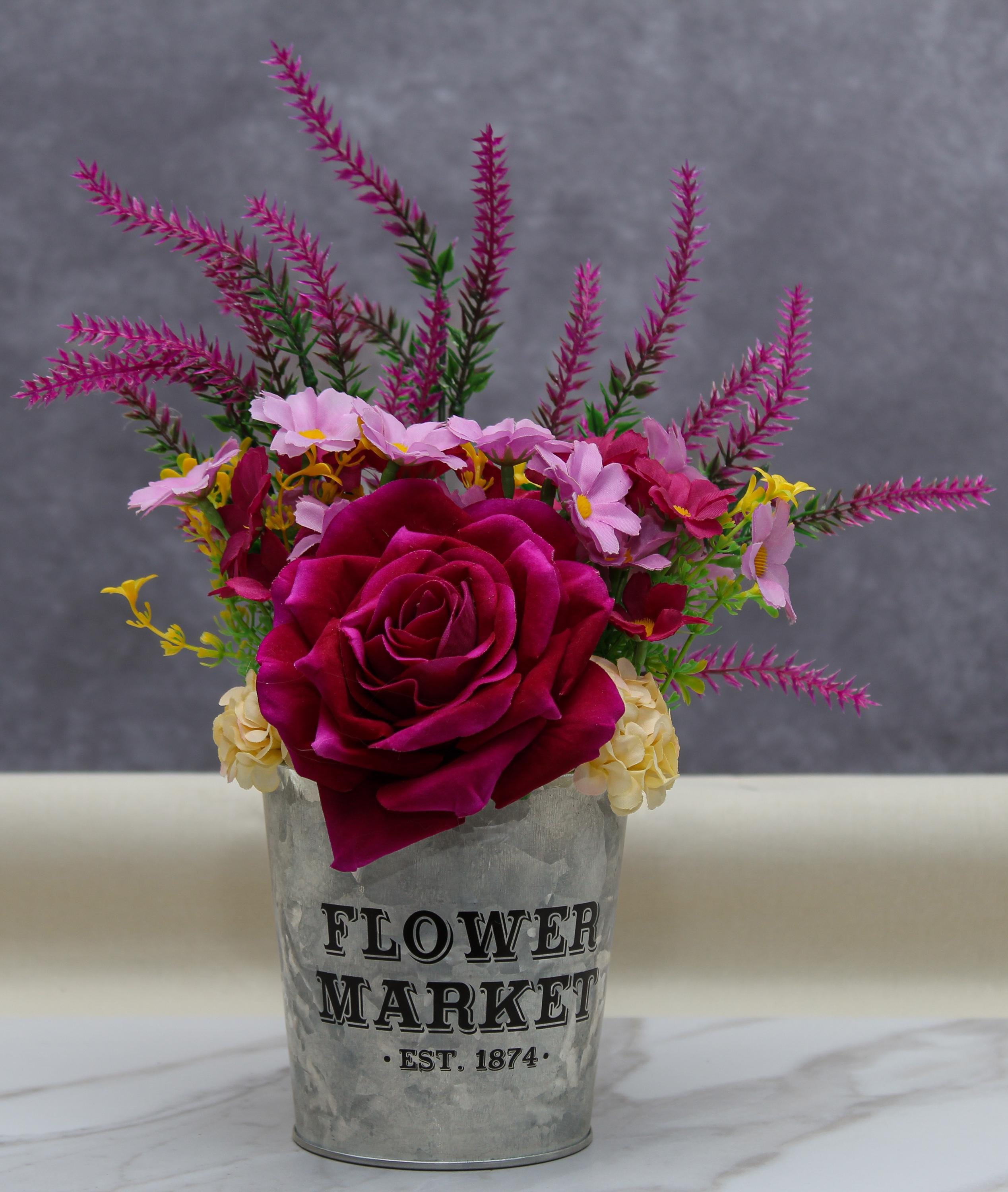 Bring a pop of romantic charm to your space with this handcrafted faux flower arrangement, designed to brighten any room and make Valentine's Day unforgettable. Featuring a stunning fuchsia rose as the centerpiece, surrounded by vibrant yellow hydrangeas, delicate daisies, and lush artificial lavender, this arrangement is set in an adorable "Flower Market" can, perfect for farmhouse and rustic decor themes.