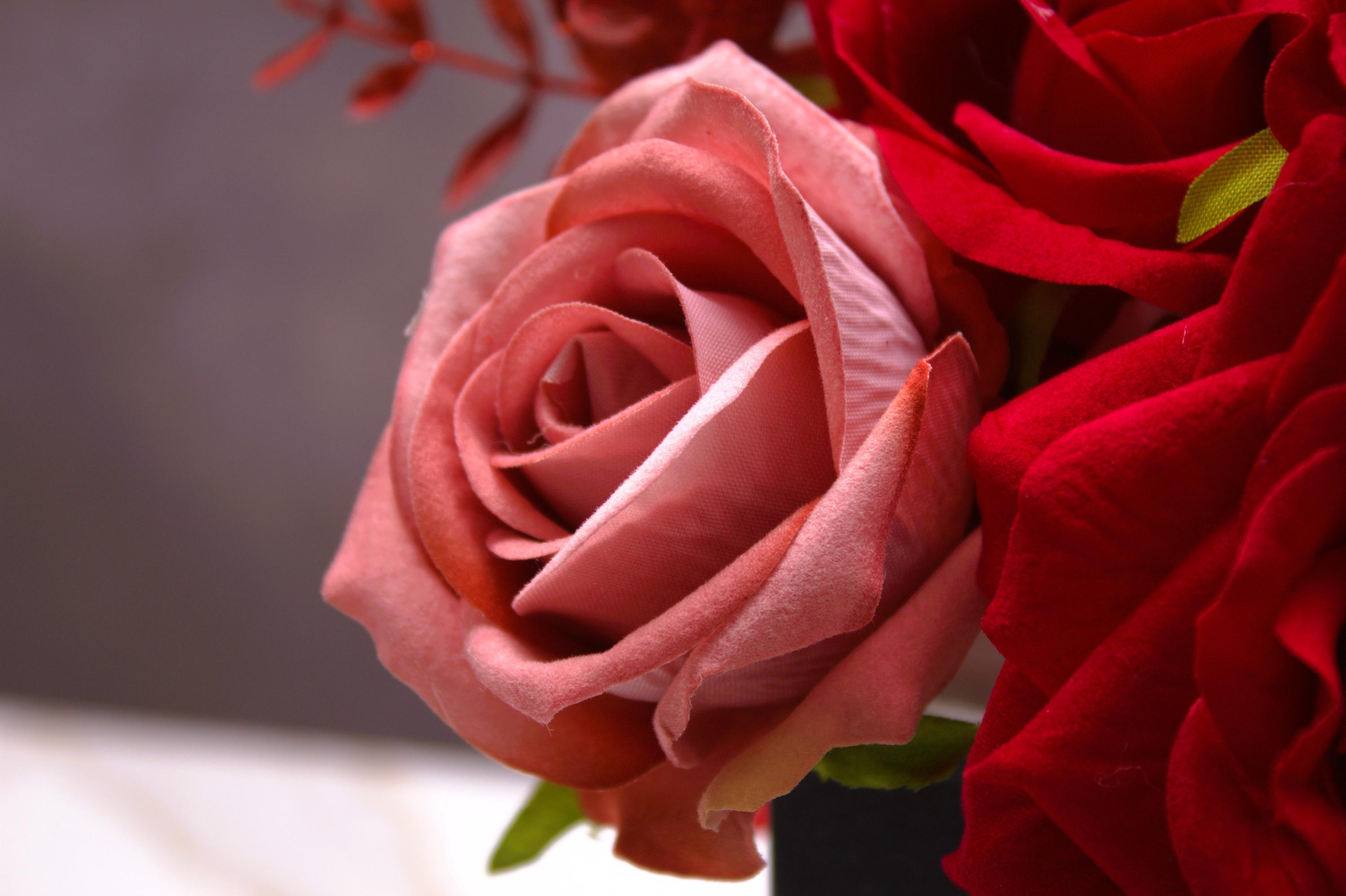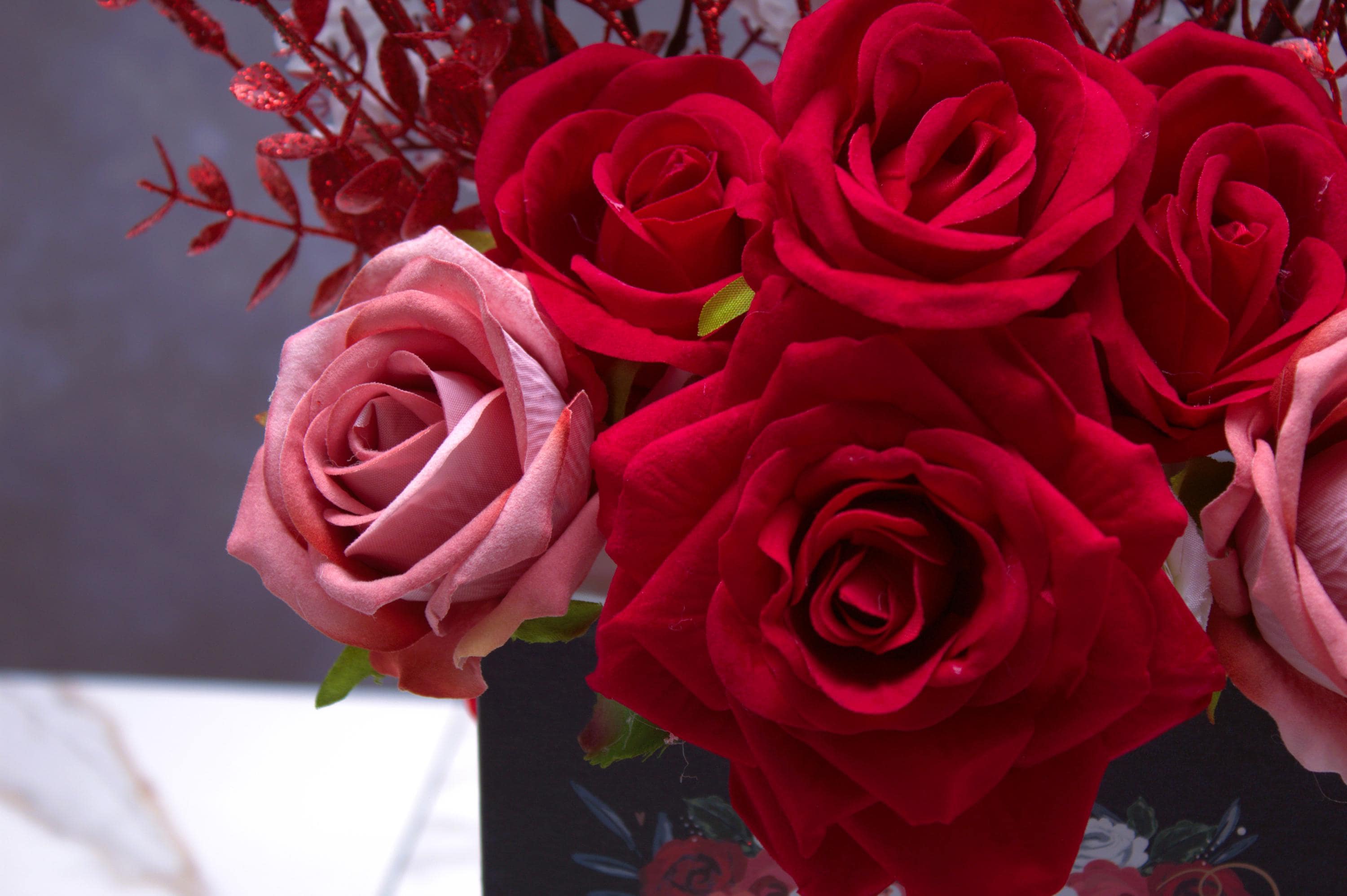 Premium Silk Flowers: Vibrant red and pink roses with realistic textures and lifelike details.