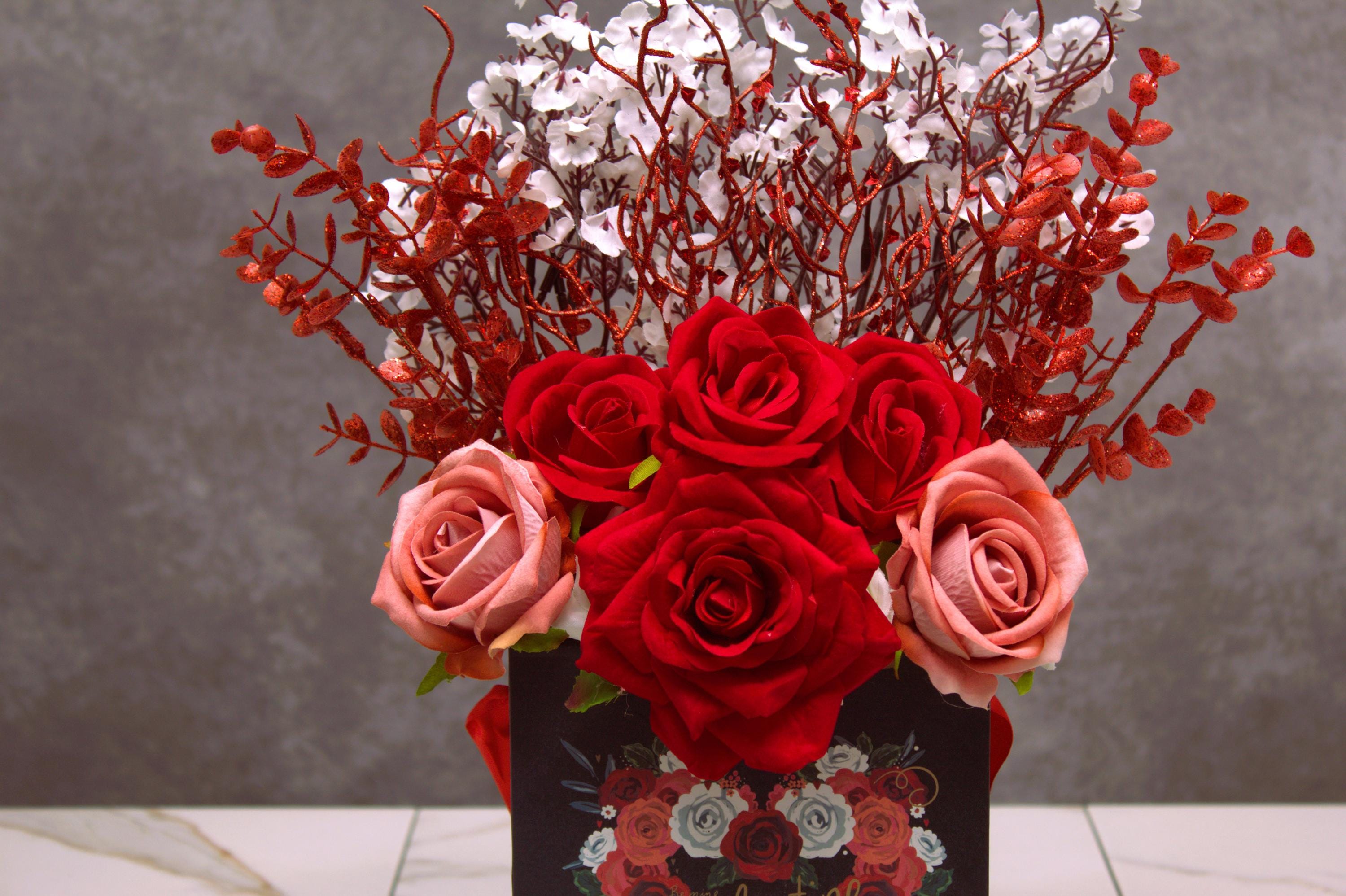 Surprise your loved one this Valentine’s Day with this exquisite silk flower arrangement, crafted to embody romance and sophistication. Featuring deep red roses paired with soft pink blooms, this bouquet is complemented by sparkling red glittered accents and delicate white flowers. Arranged in a stunning Valentine-themed gift box with an elegant heart motif and a luxurious red ribbon, it’s the perfect keepsake for expressing love and affection.