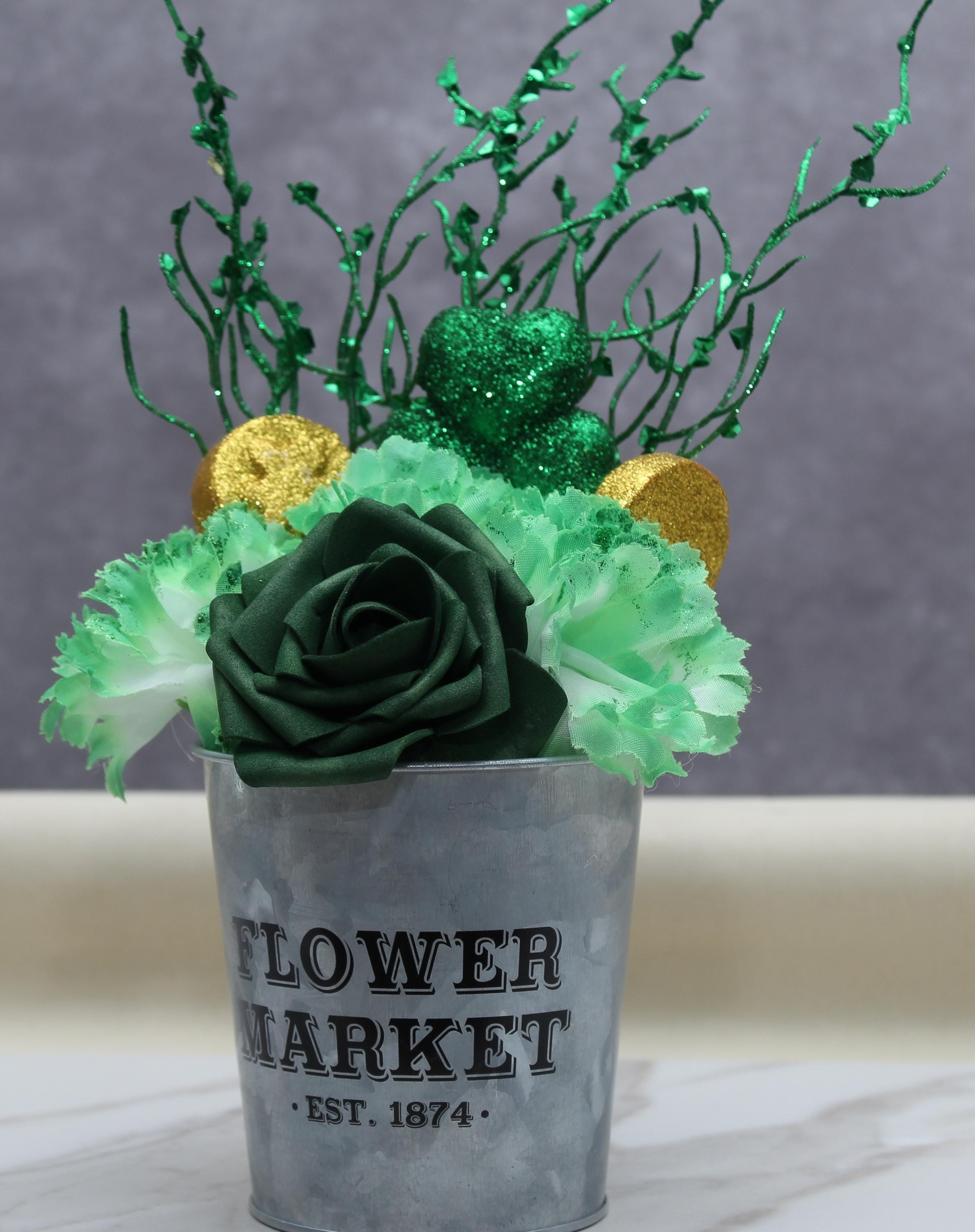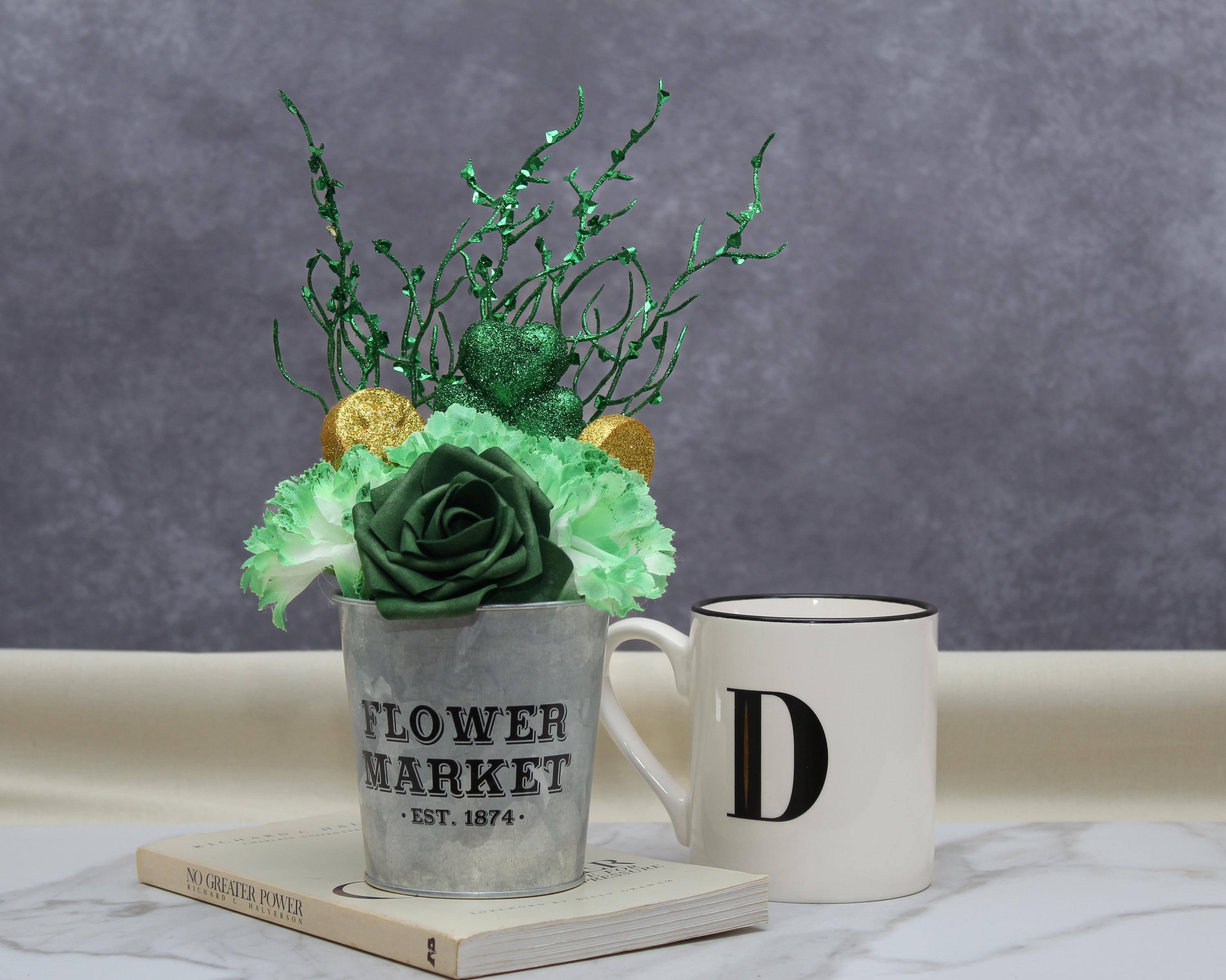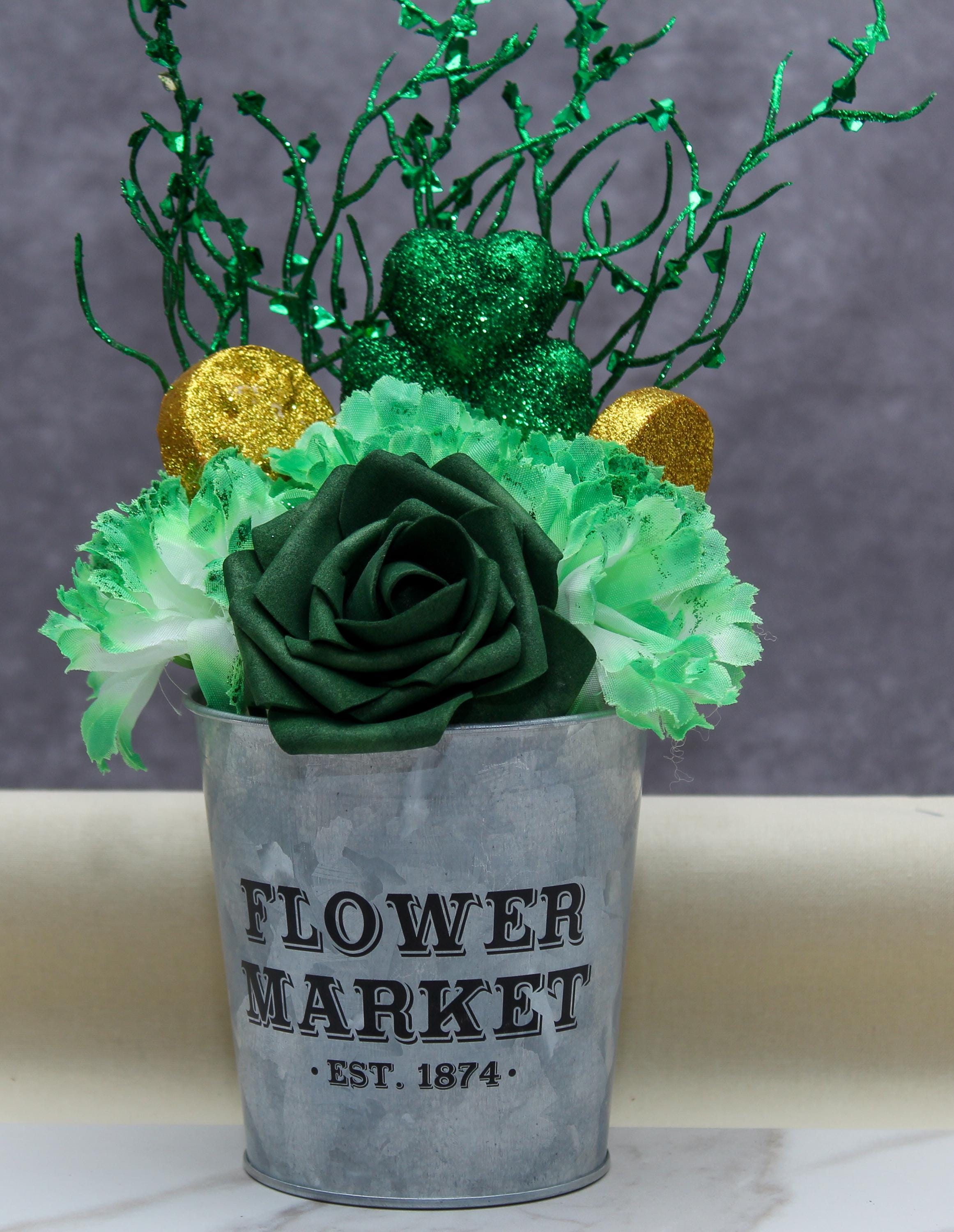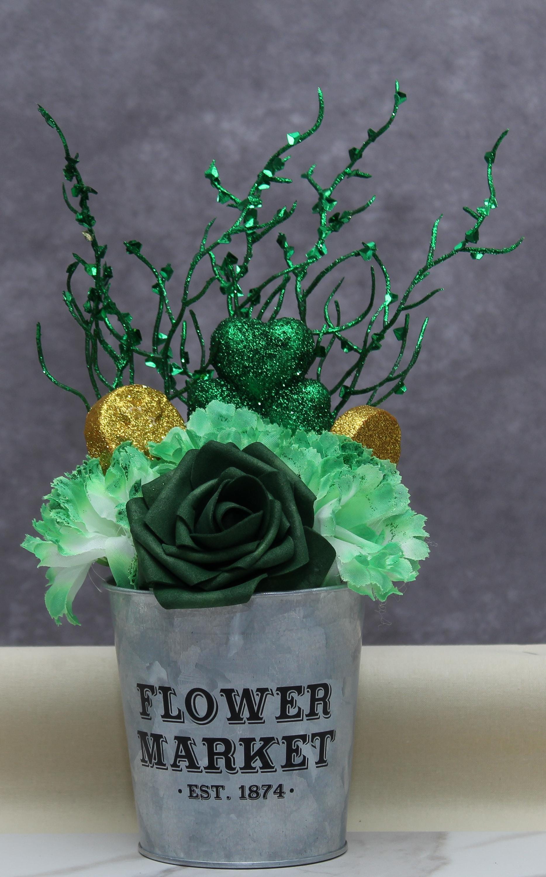 🍀 Add a touch of Irish charm to your home with this stunning St. Patrick’s Day artificial floral arrangement! Featuring a lush green rose, variegated green carnations, glittery shamrocks, and gold coin accents, this festive centerpiece is designed to bring luck and beauty to any space. Displayed in a rustic galvanized metal pot, it’s the perfect piece for holiday decor, table settings, or gifting.