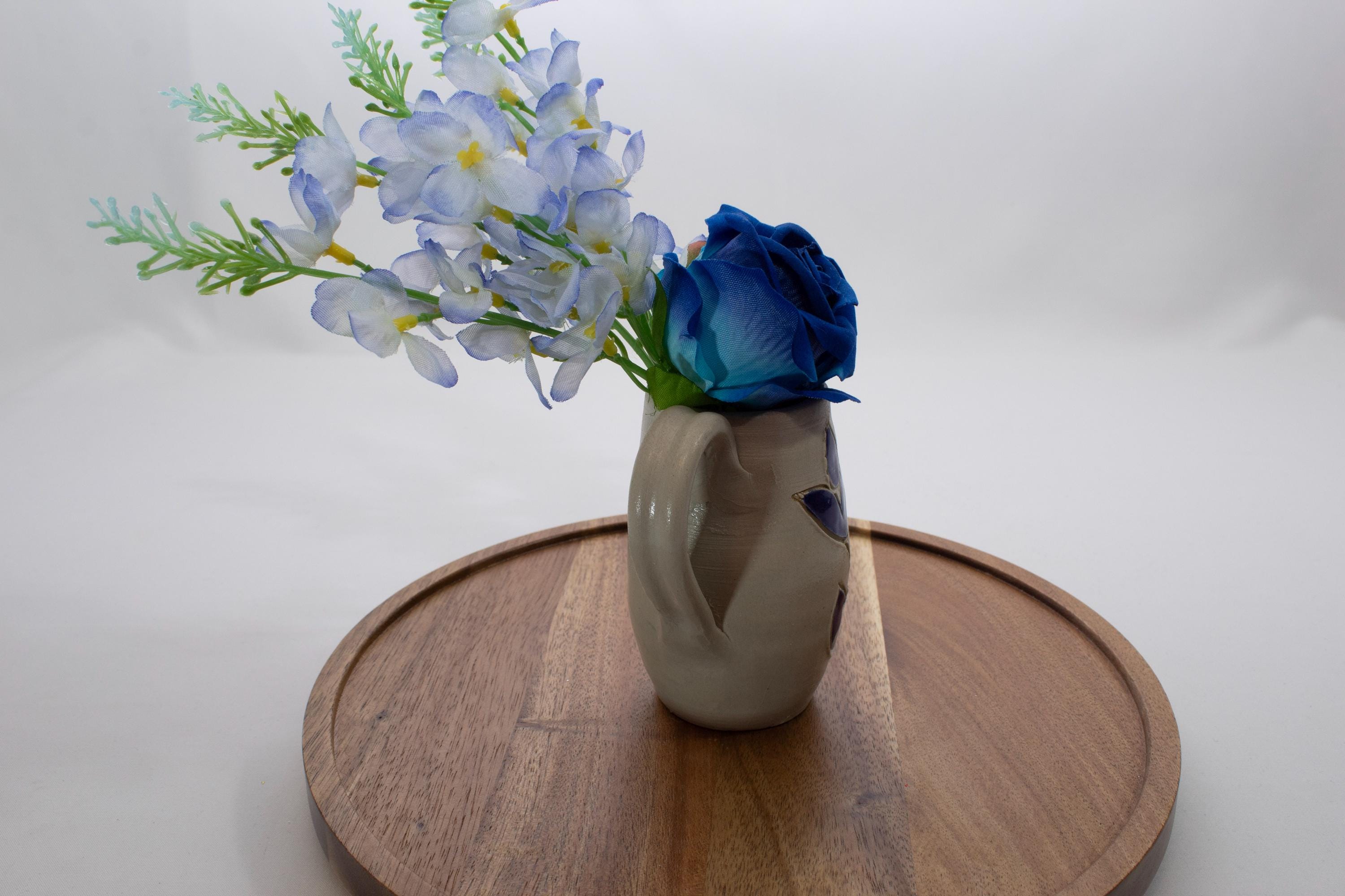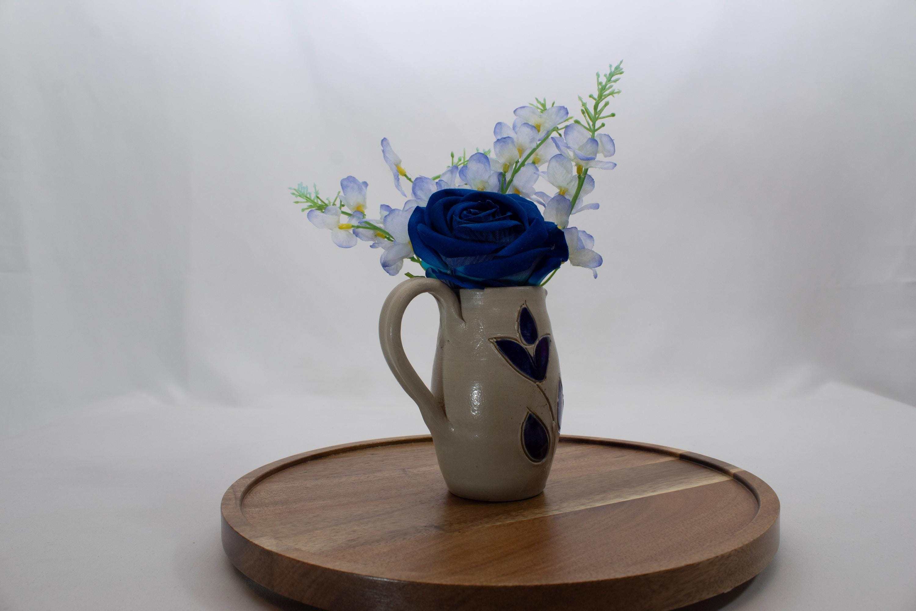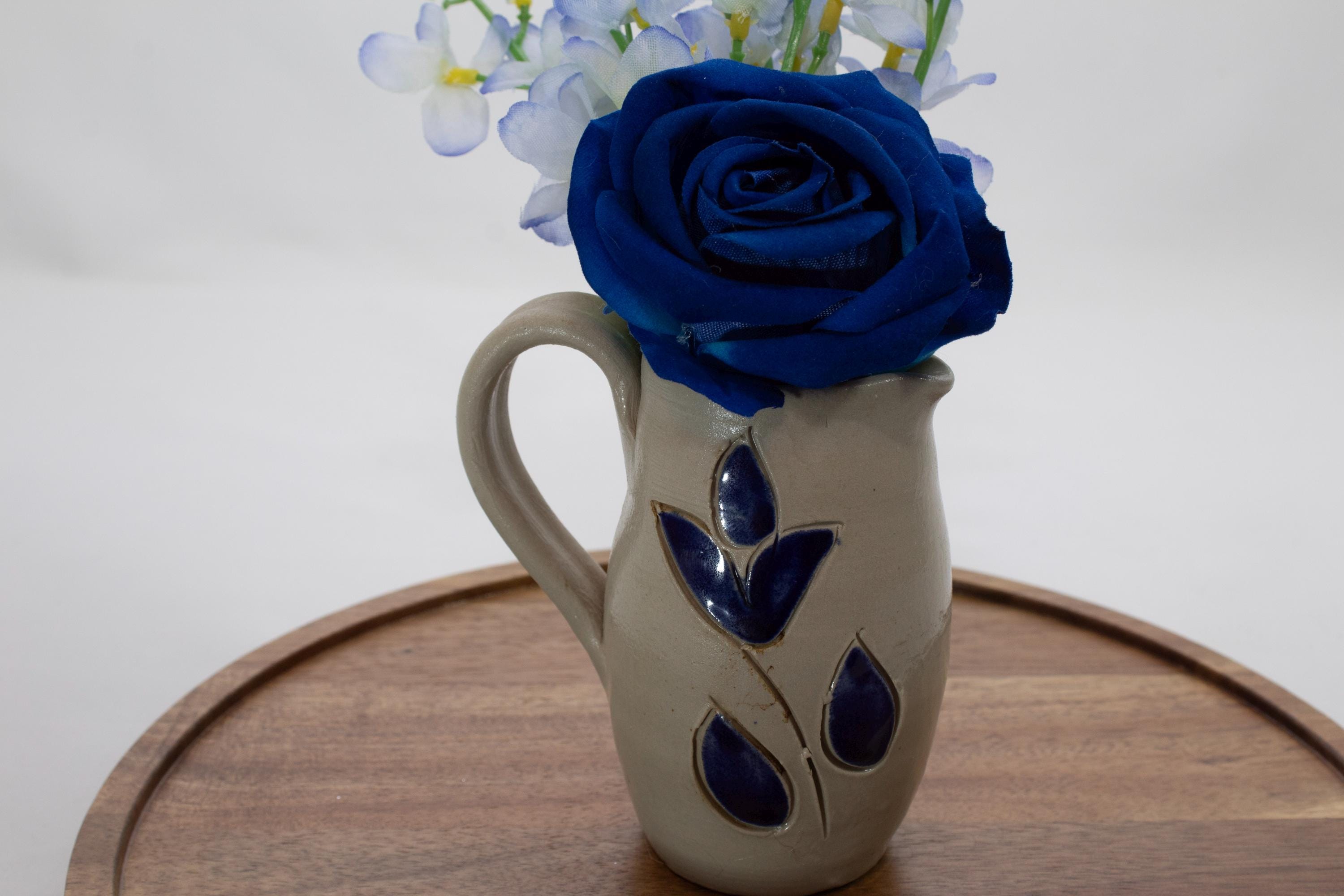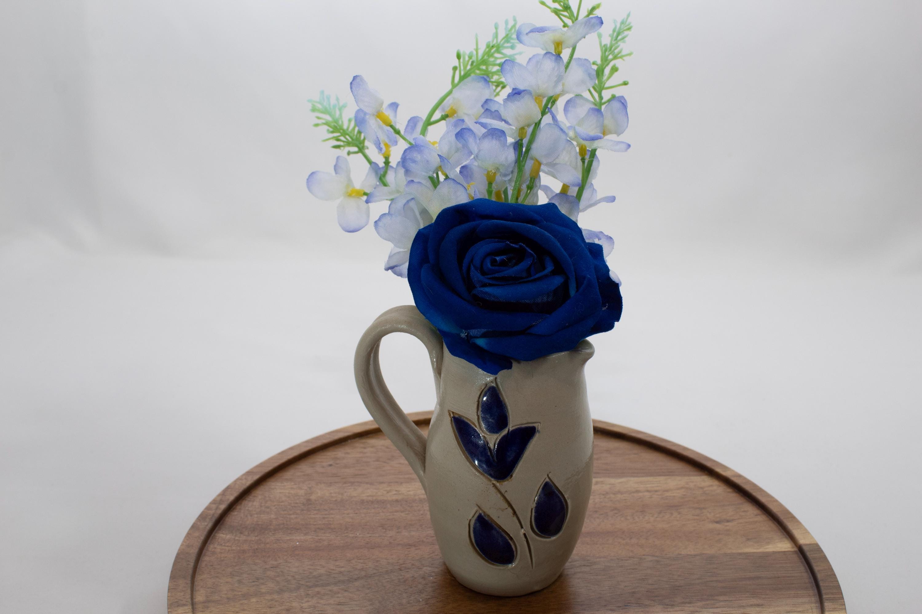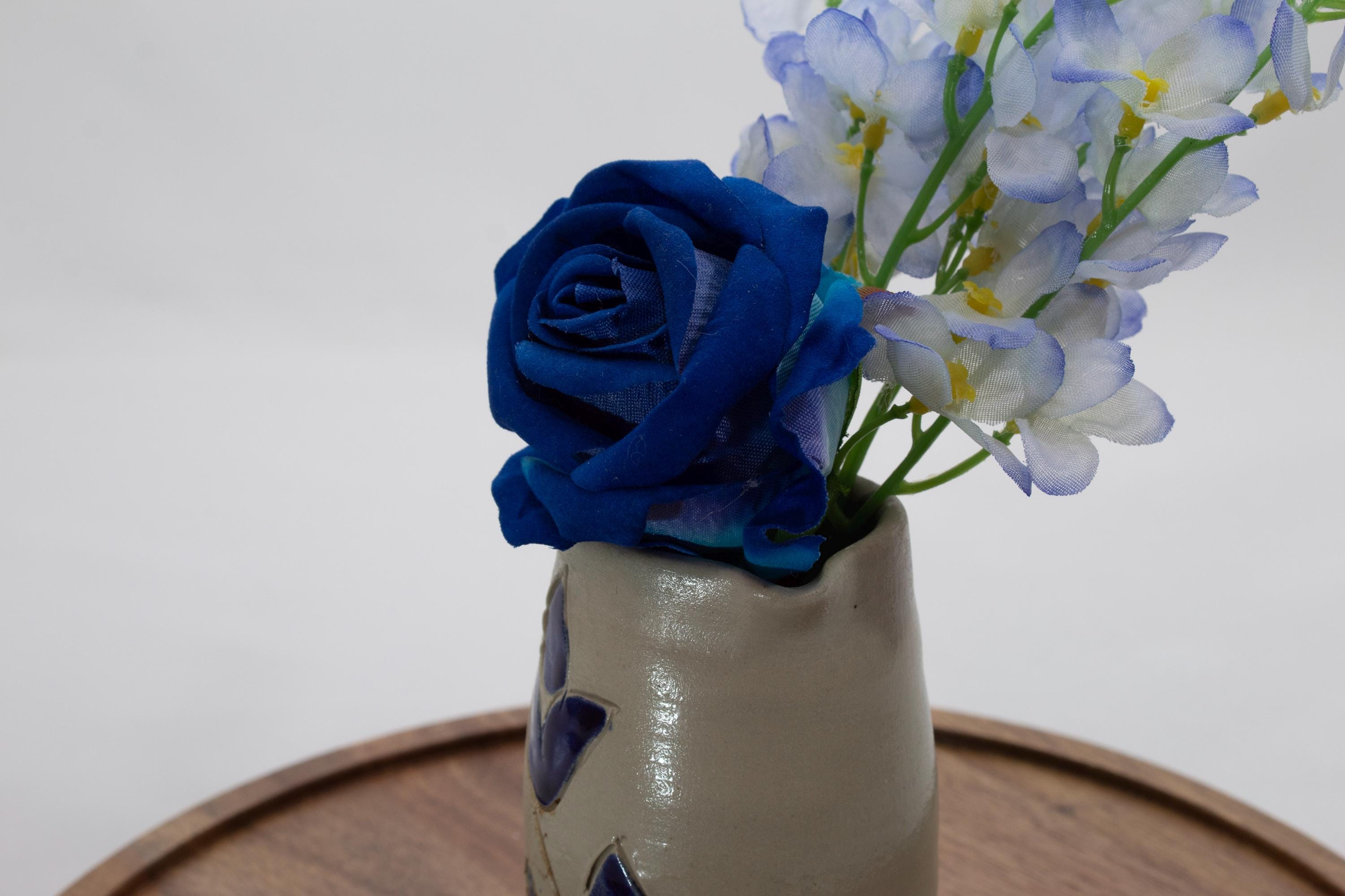 🌿 Add a touch of elegance to your space with this stunning artificial flower arrangement, featuring a deep blue rose, delicate blue blossoms, and soft greenery in a handmade, hand-painted ceramic vase with unique floral accents. This charming piece is perfect for home décor, office spaces, or as a thoughtful gift.