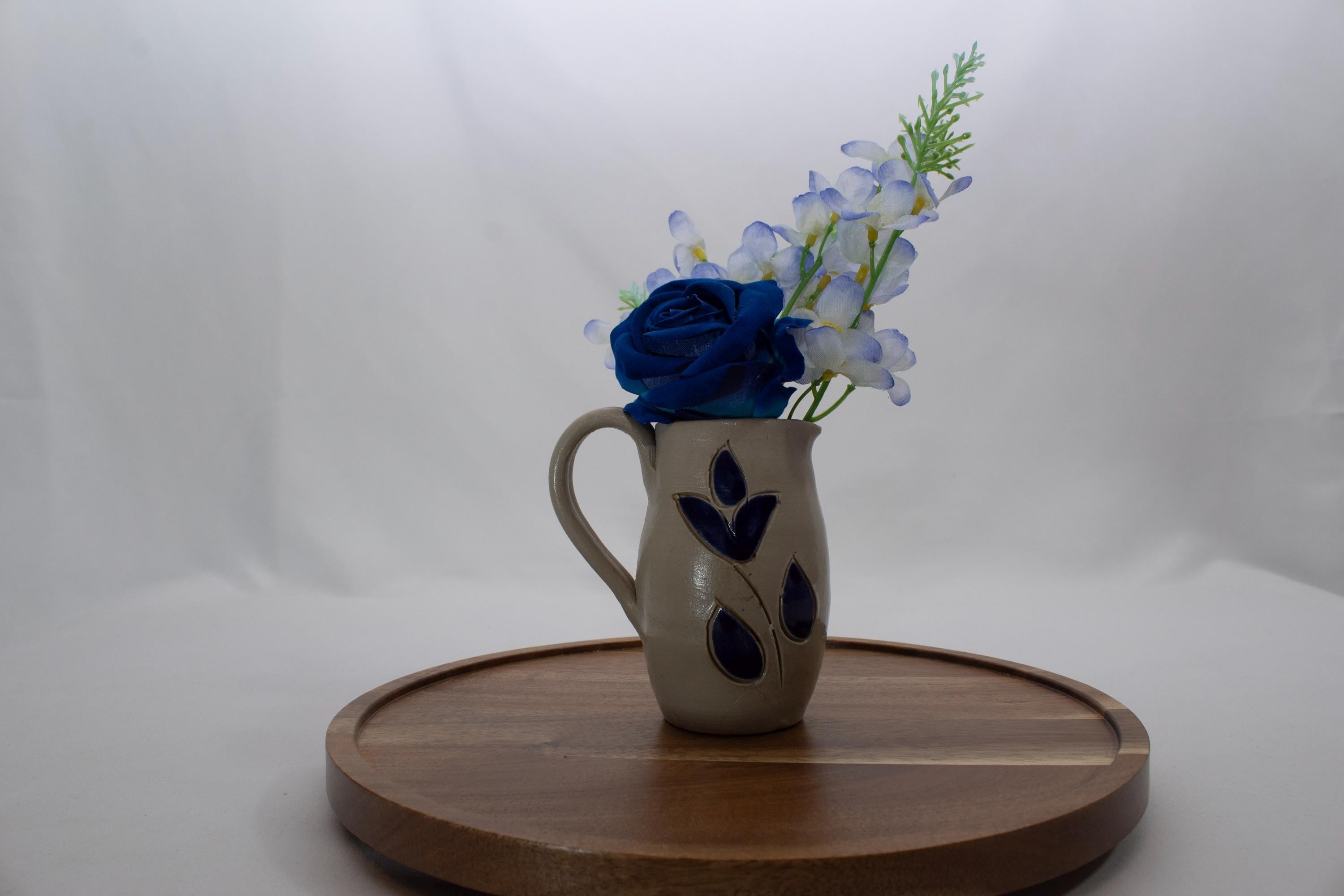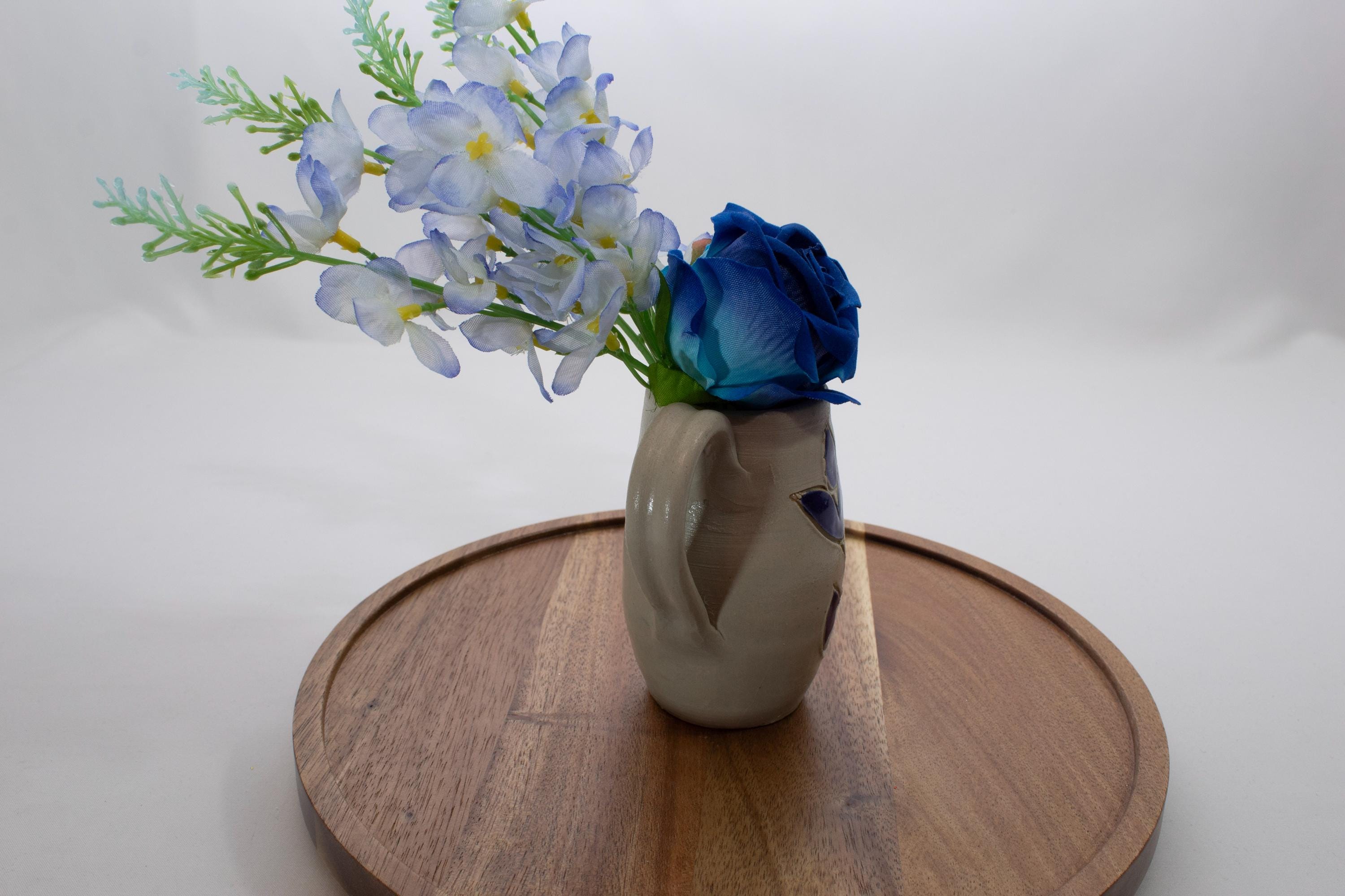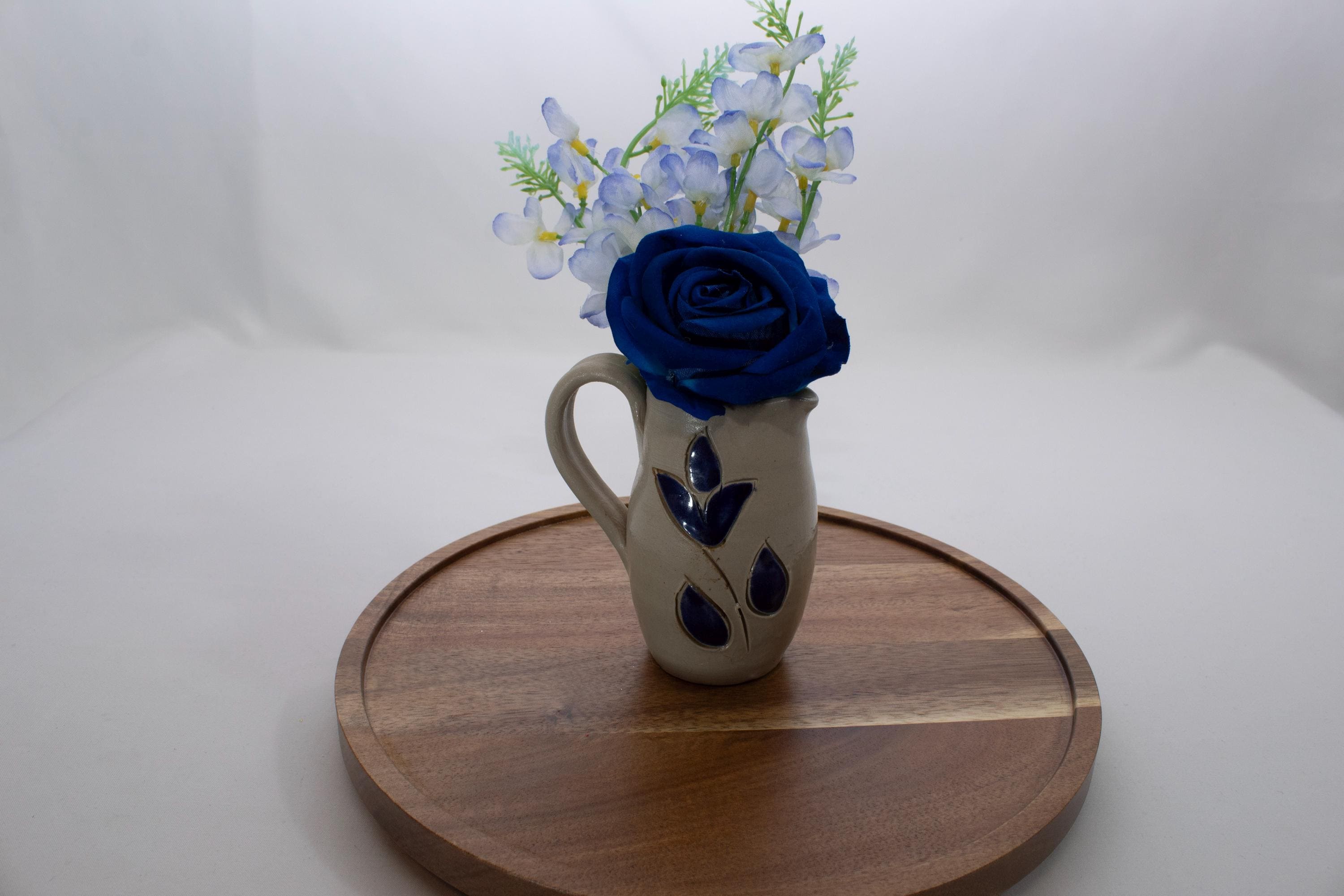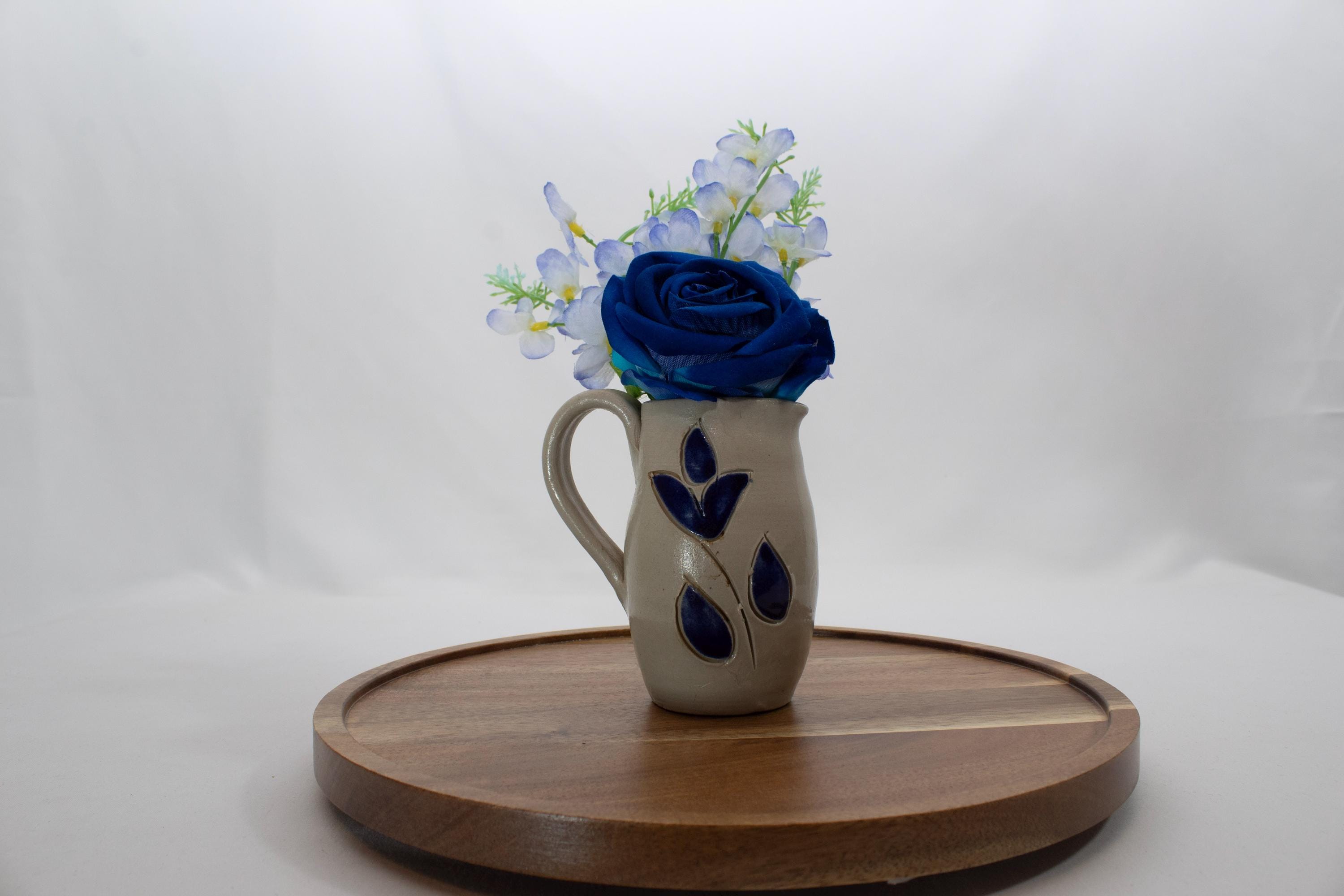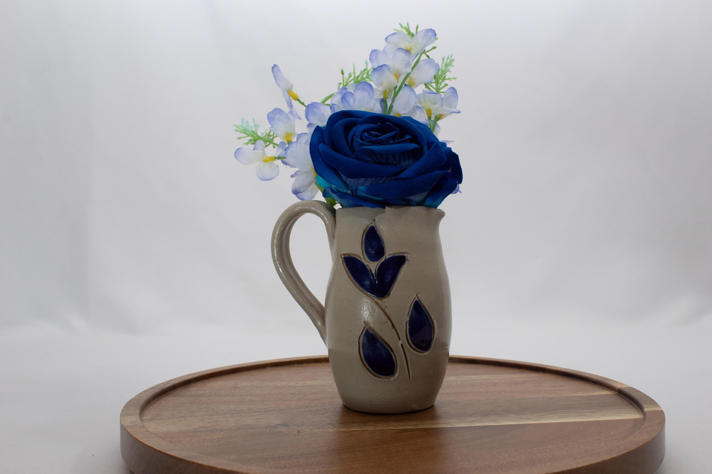 🌿 Add a touch of elegance to your space with this stunning artificial flower arrangement, featuring a deep blue rose, delicate blue blossoms, and soft greenery in a handmade, hand-painted ceramic vase with unique floral accents. This charming piece is perfect for home décor, office spaces, or as a thoughtful gift.