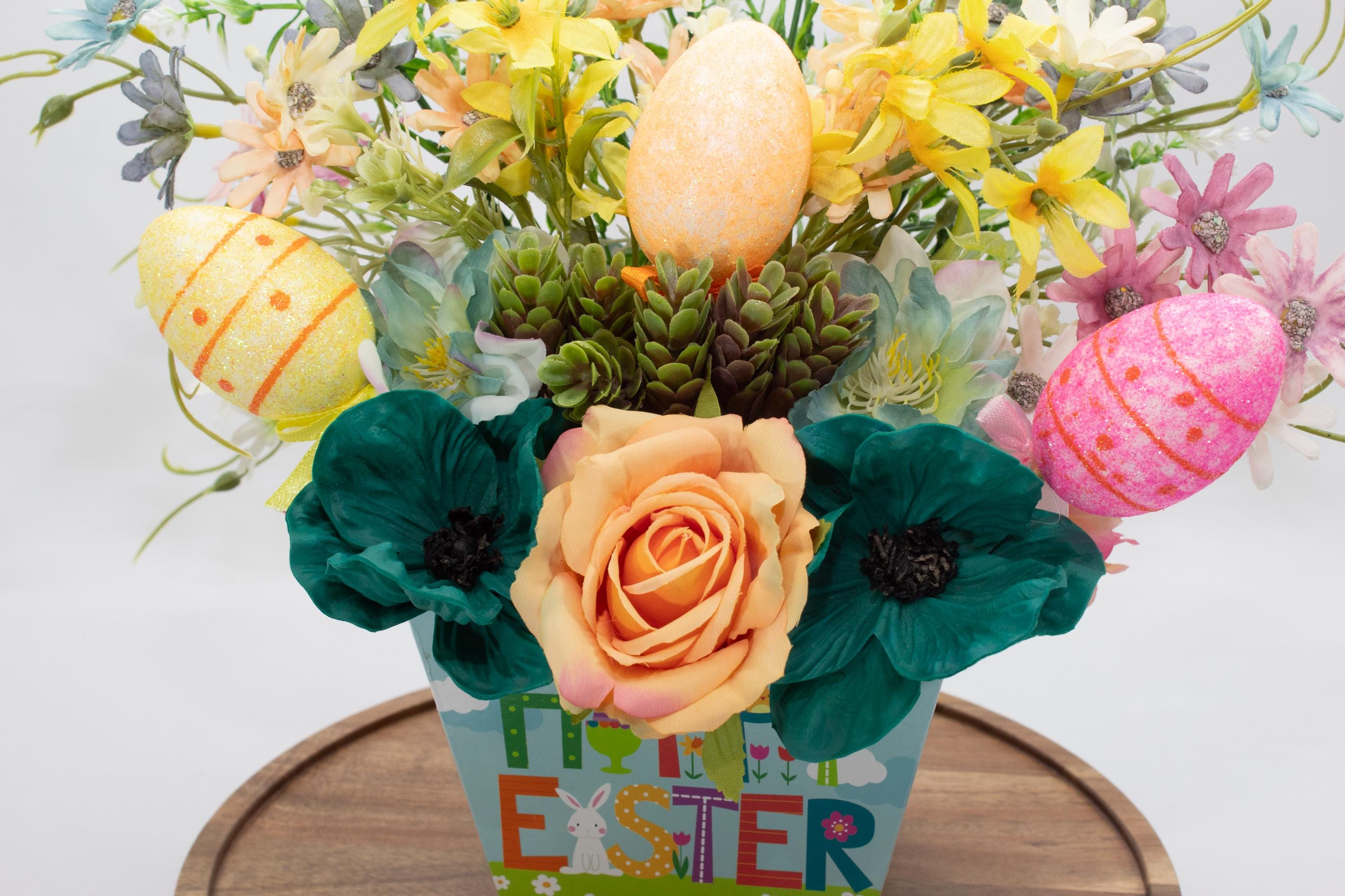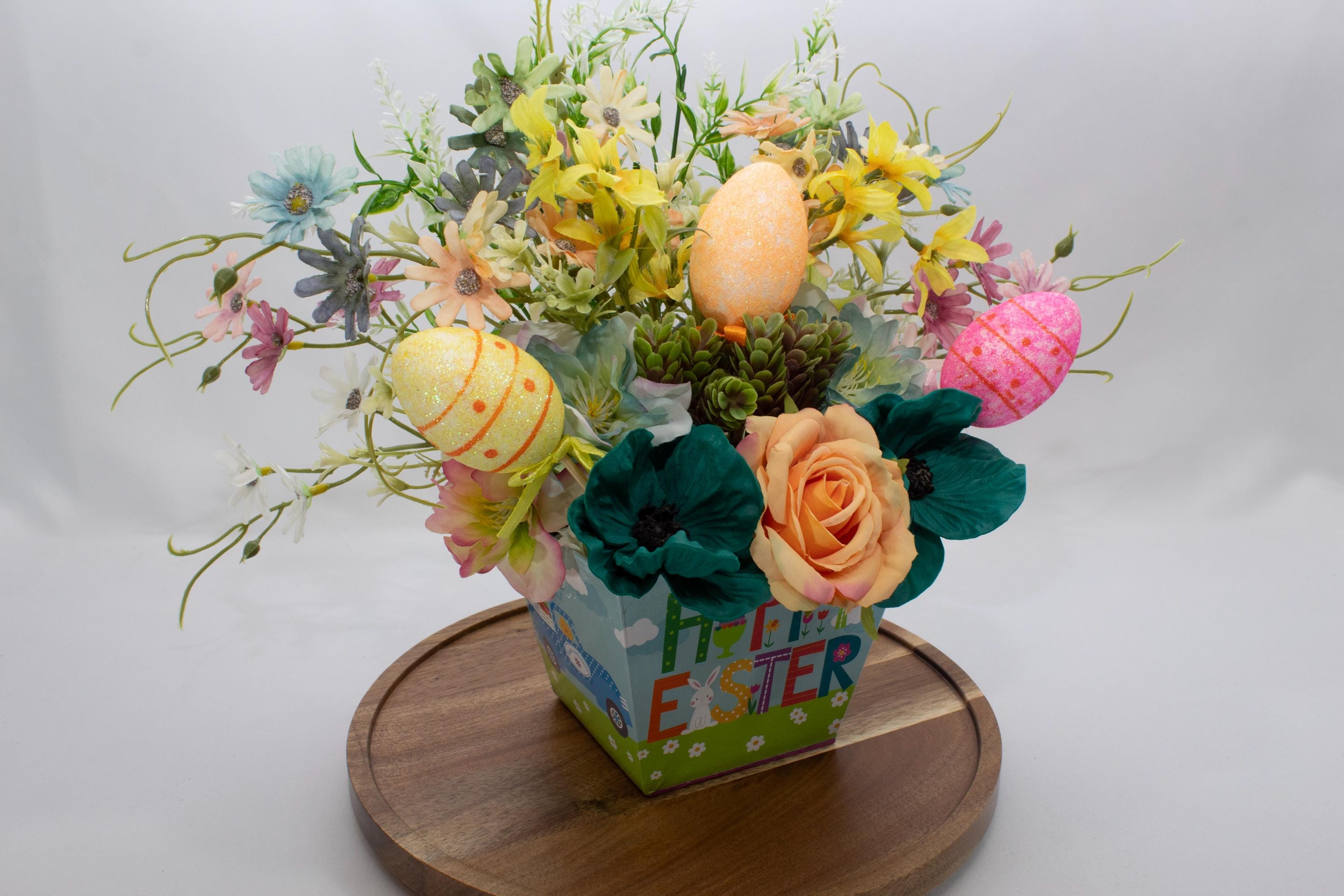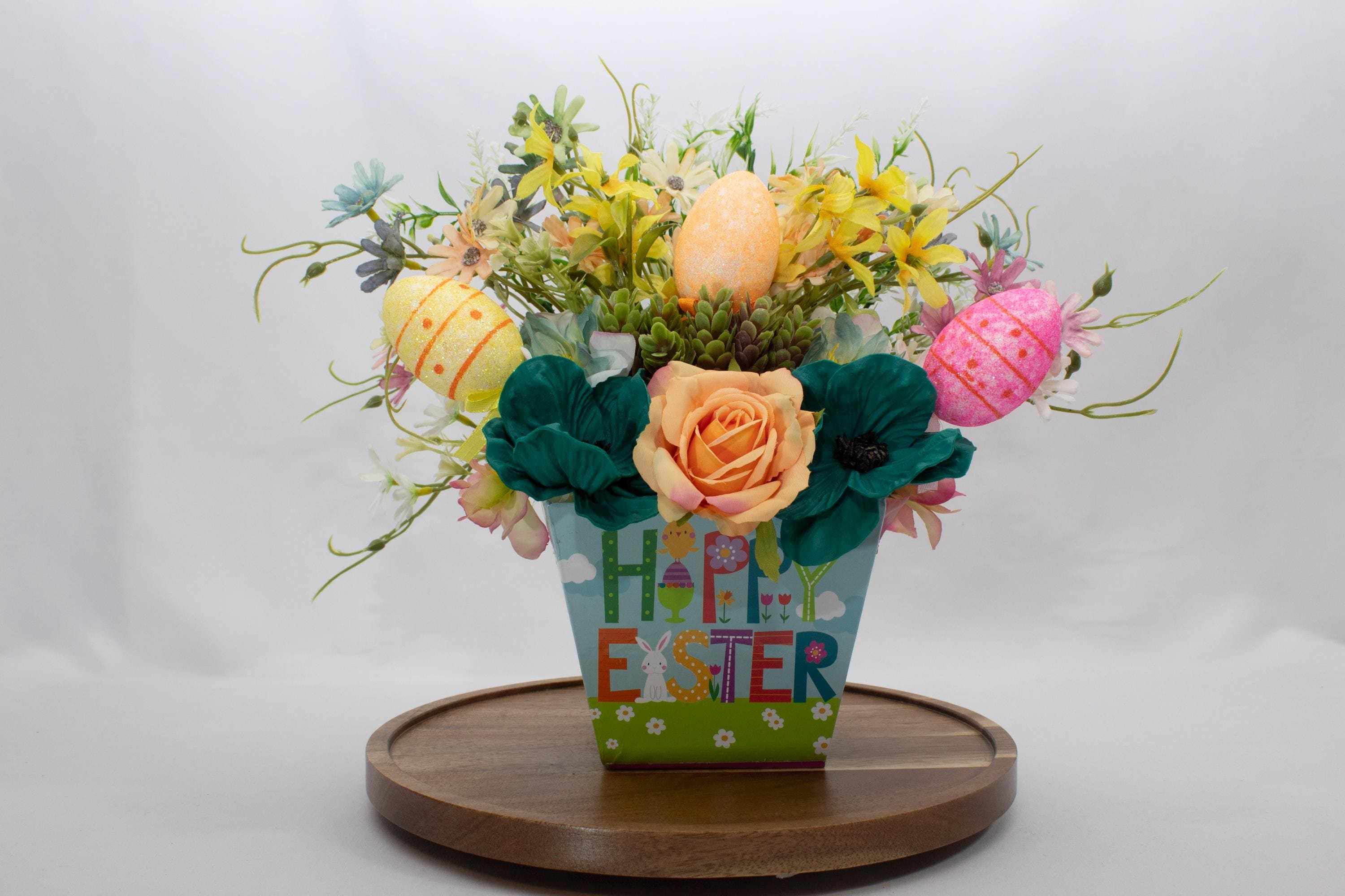 🌸 Celebrate Easter in style with this charming artificial floral arrangement, featuring vibrant spring flowers, decorative Easter eggs, and lush greenery in a festive "Happy Easter" container. This handcrafted piece is perfect for holiday décor, centerpieces, or gifting!