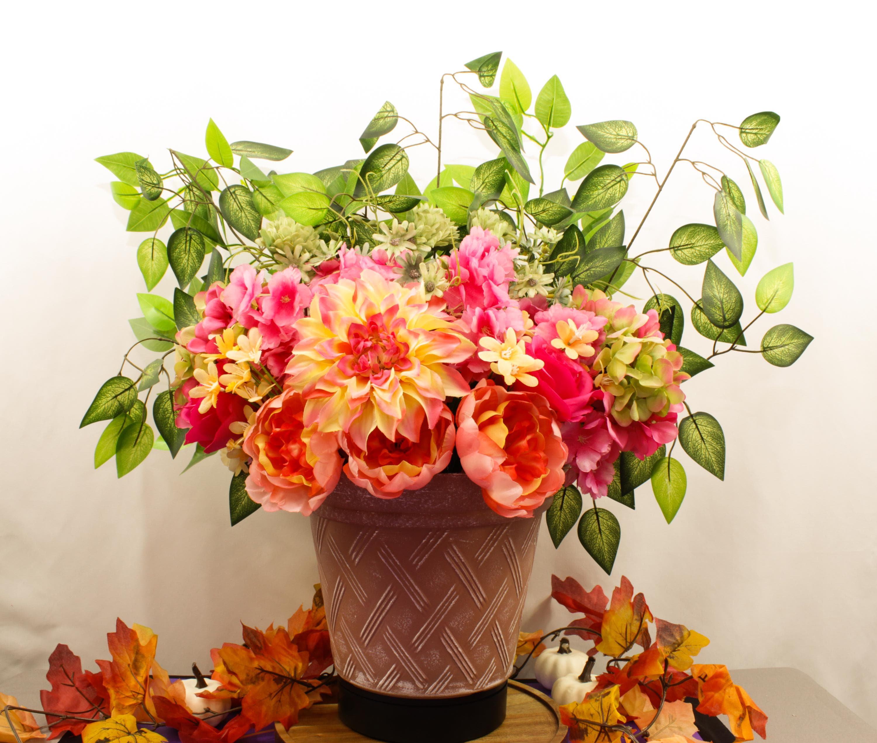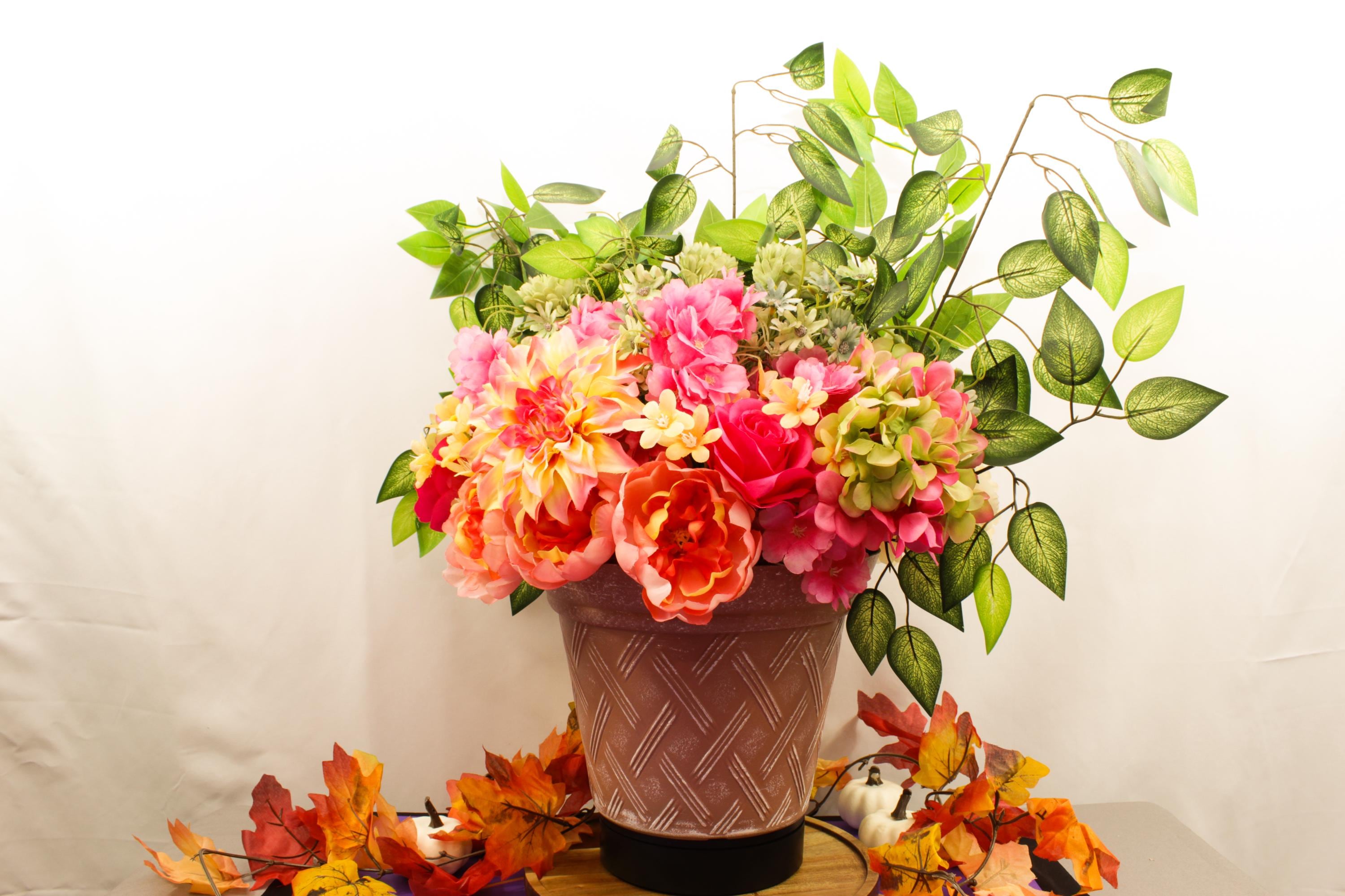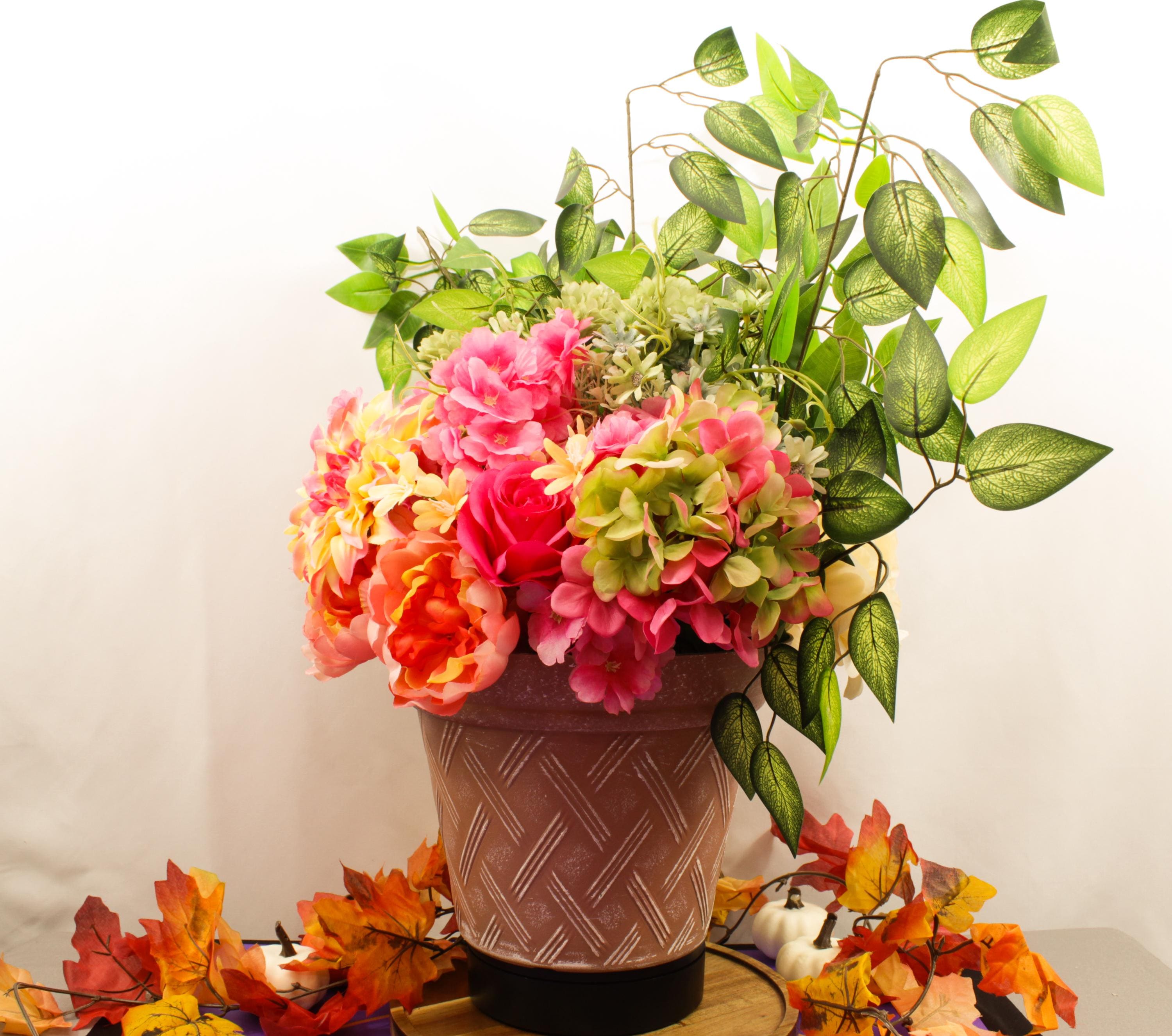 Handcrafted with care, this elegant silk floral display comes arranged in a textured rose-toned pot that perfectly complements its soft pinks, creams, yellows, and greens. The result is a show-stopping centerpiece that brings warmth, charm, and natural color to any space — no watering required.