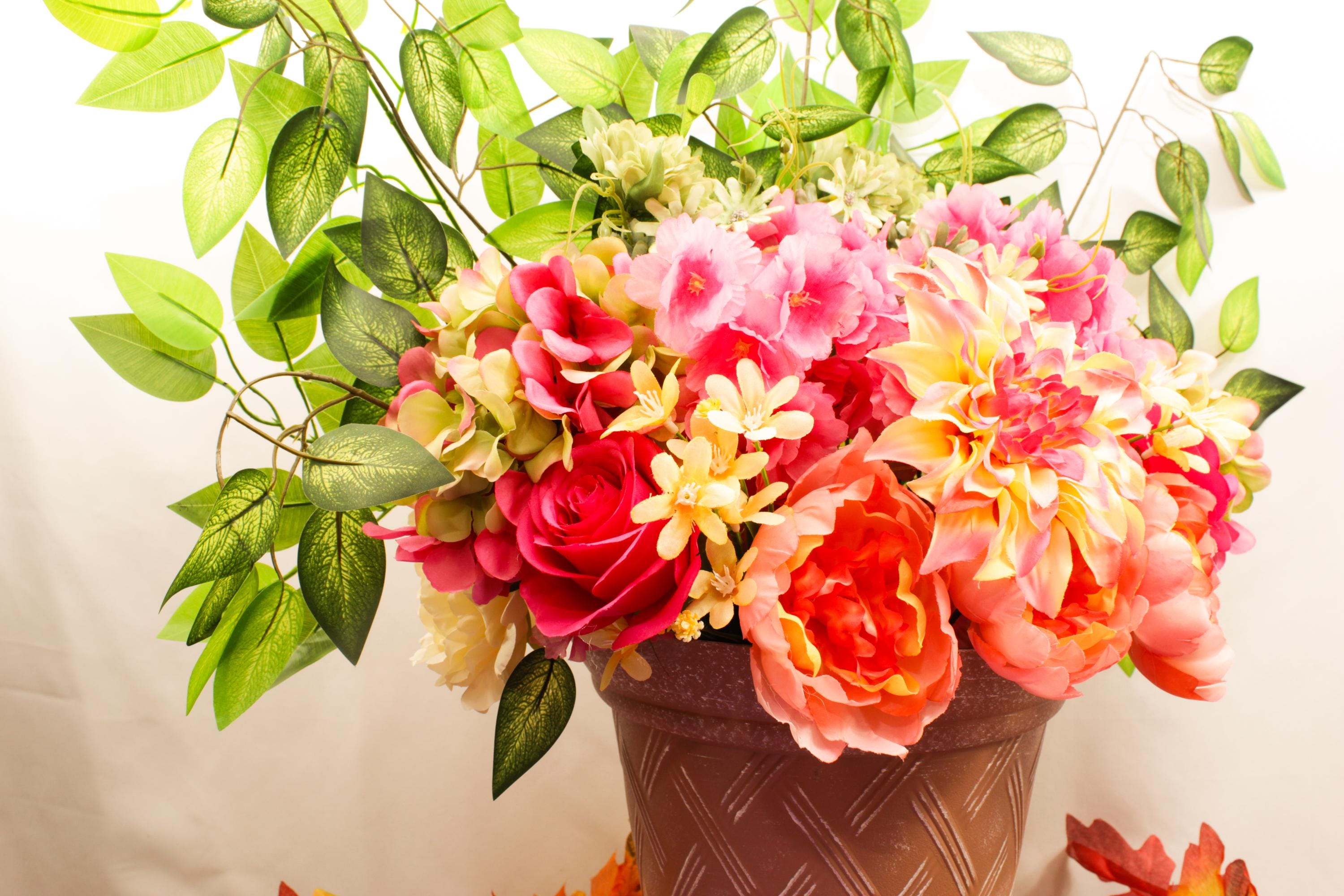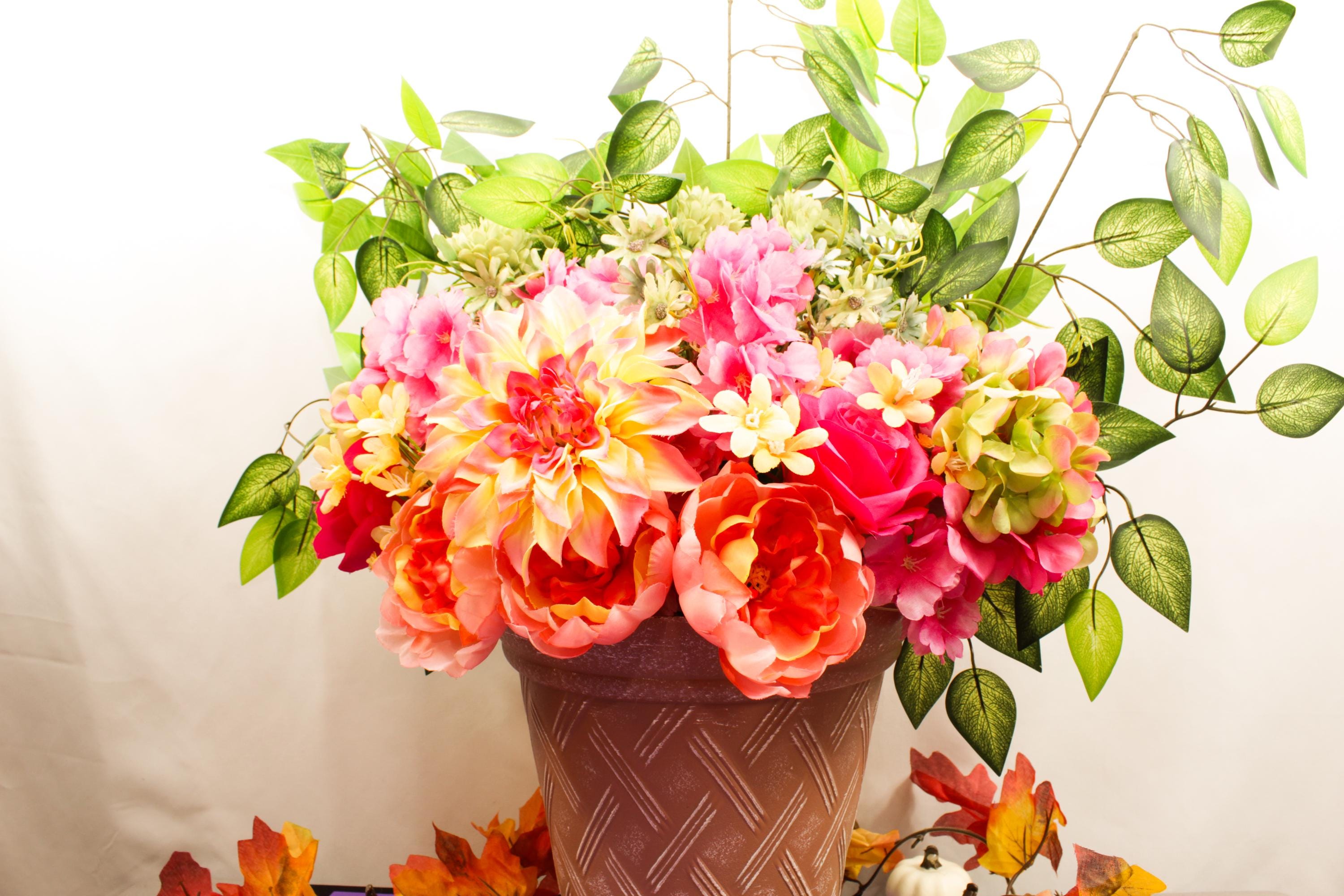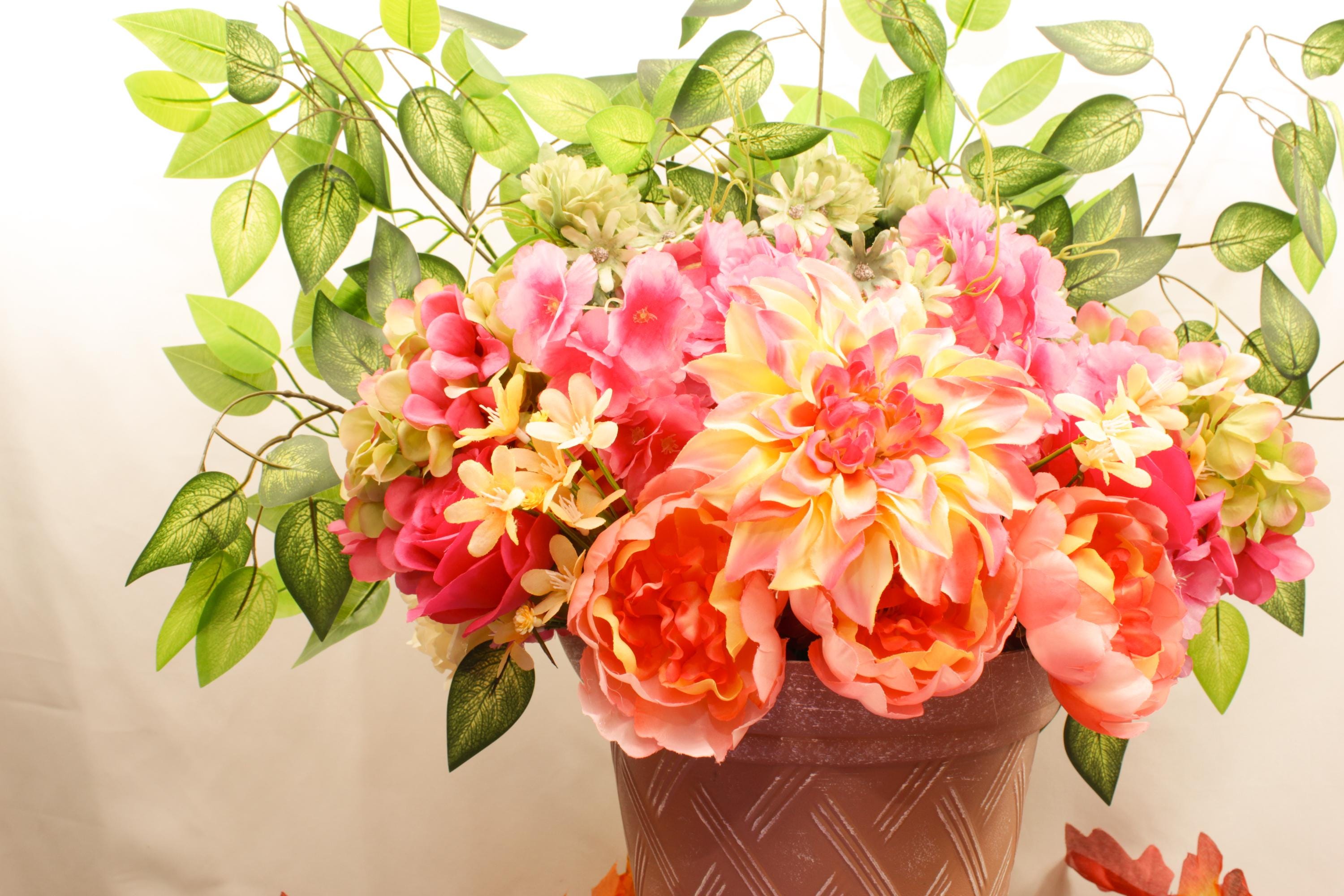 Handcrafted with care, this elegant silk floral display comes arranged in a textured rose-toned pot that perfectly complements its soft pinks, creams, yellows, and greens. The result is a show-stopping centerpiece that brings warmth, charm, and natural color to any space — no watering required.