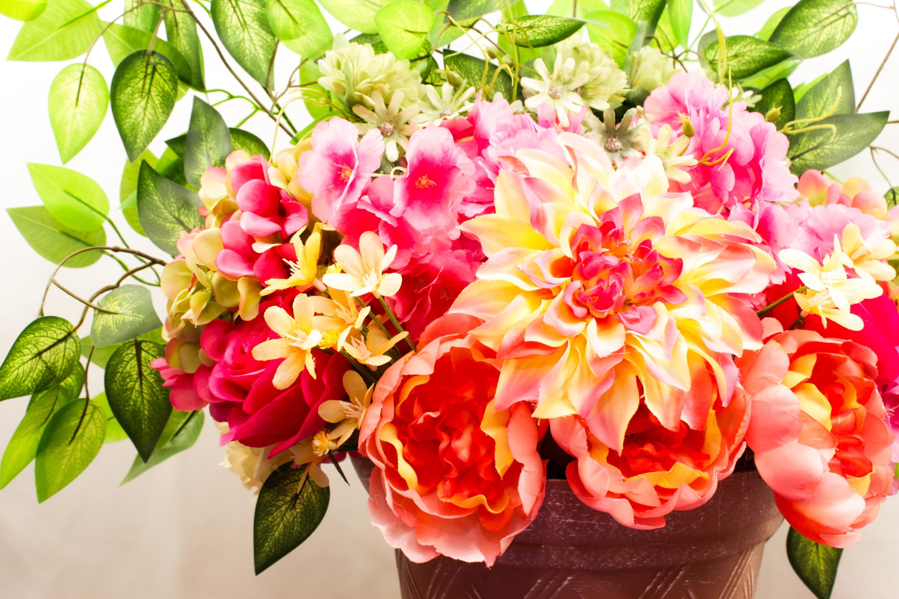 Brighten your home with the lush beauty of everlasting blooms. This faux flower arrangement overflows with hydrangeas, roses, dahlias, lilies, orchids, baby’s breath, and daffodils, surrounded by rich Ficus greenery for a full, garden-fresh look.