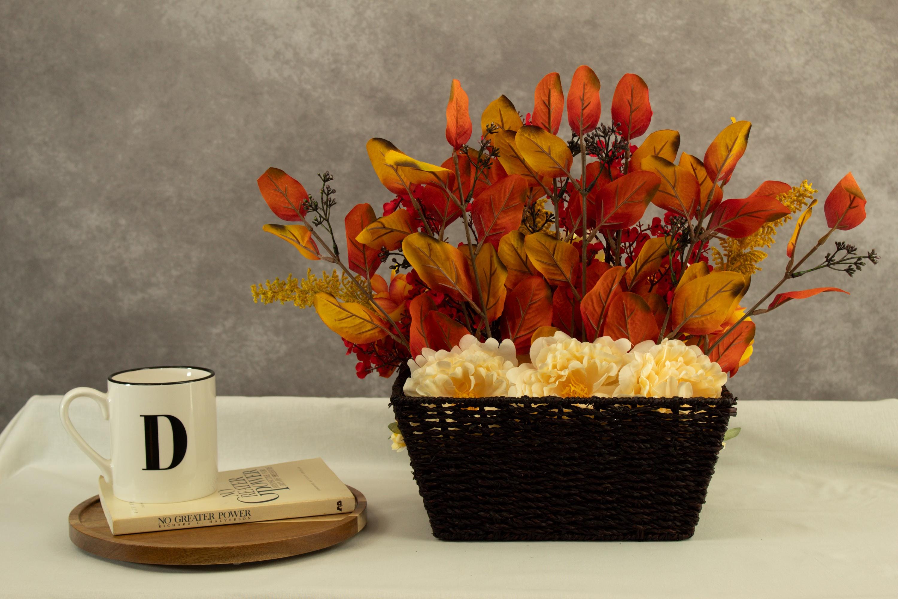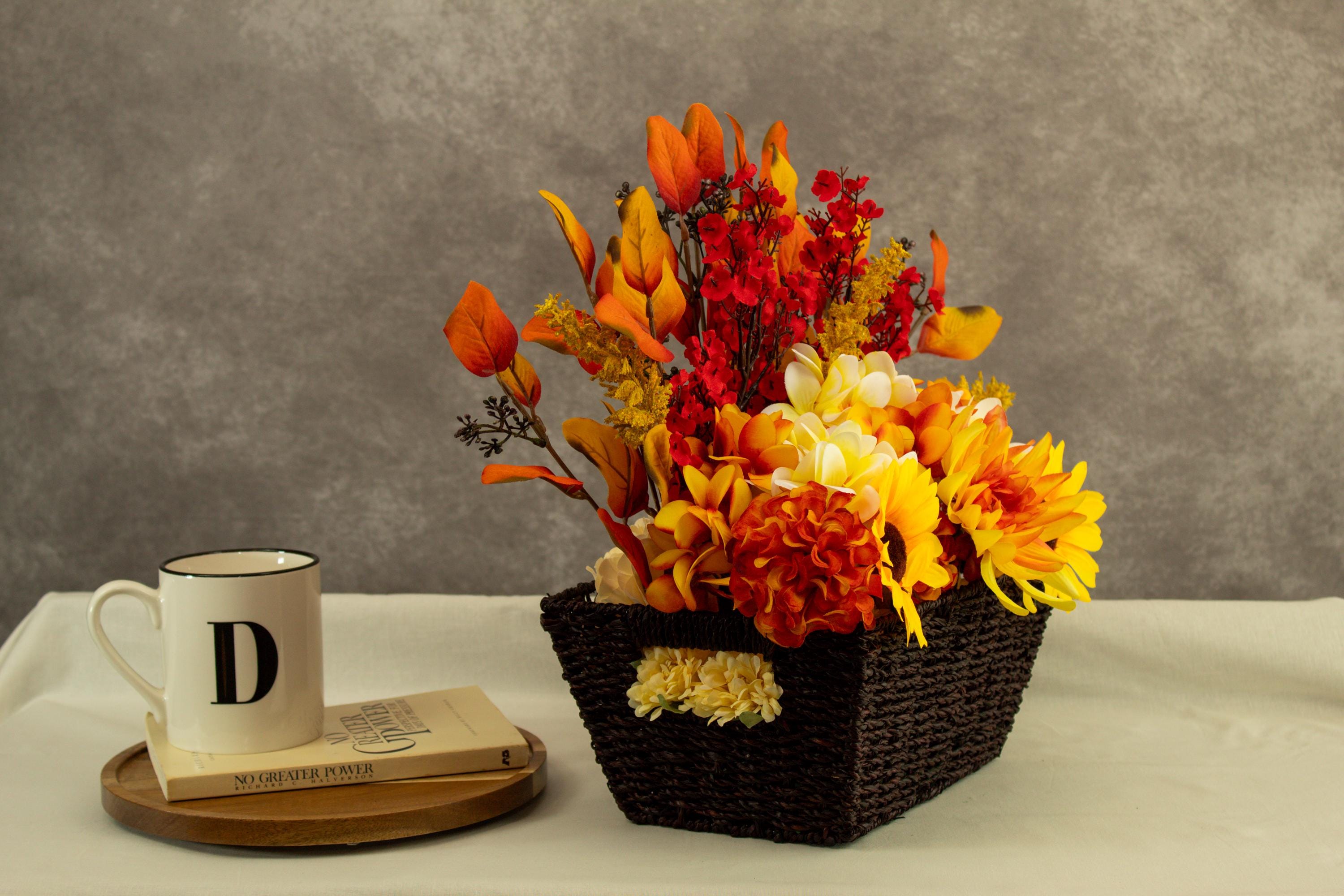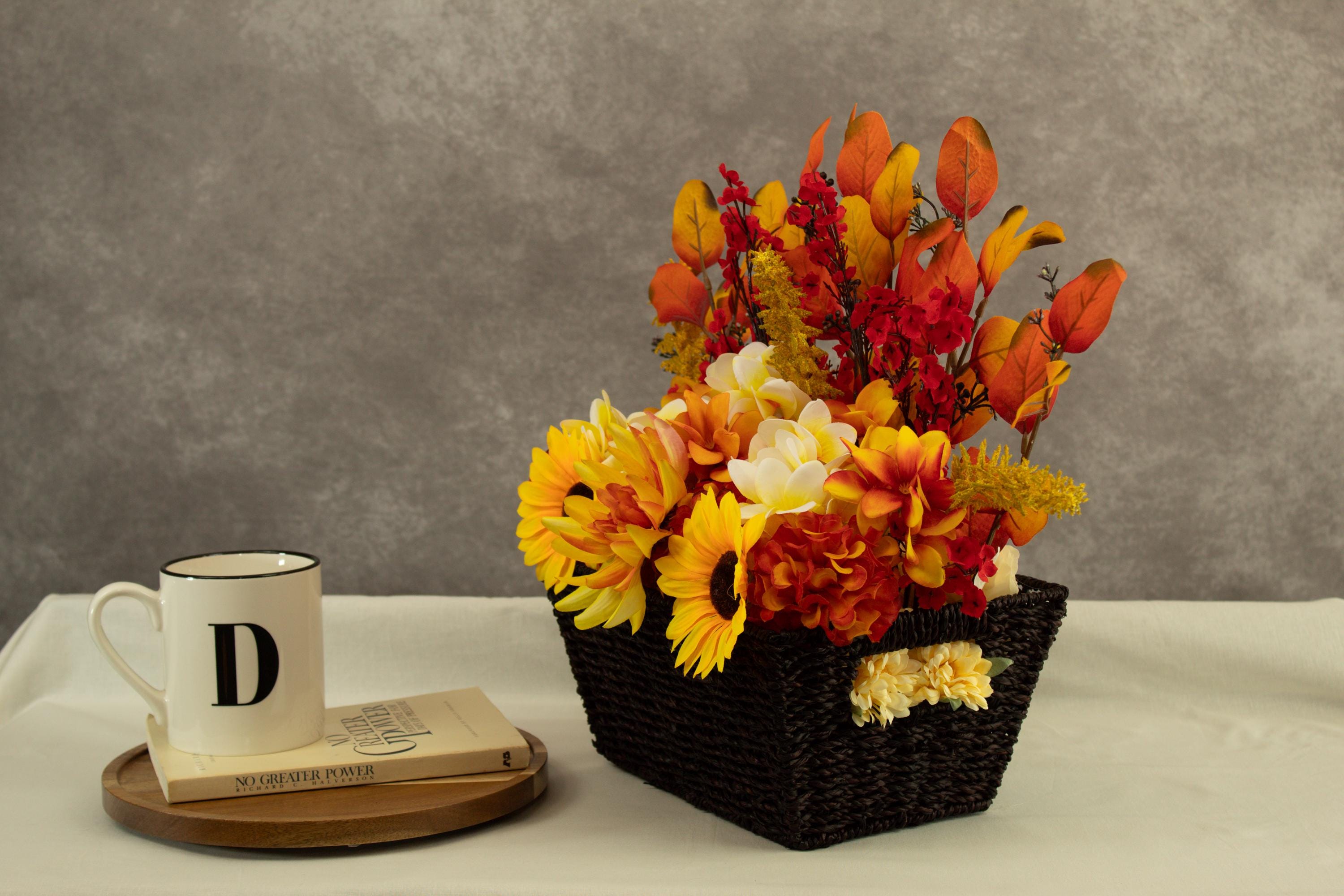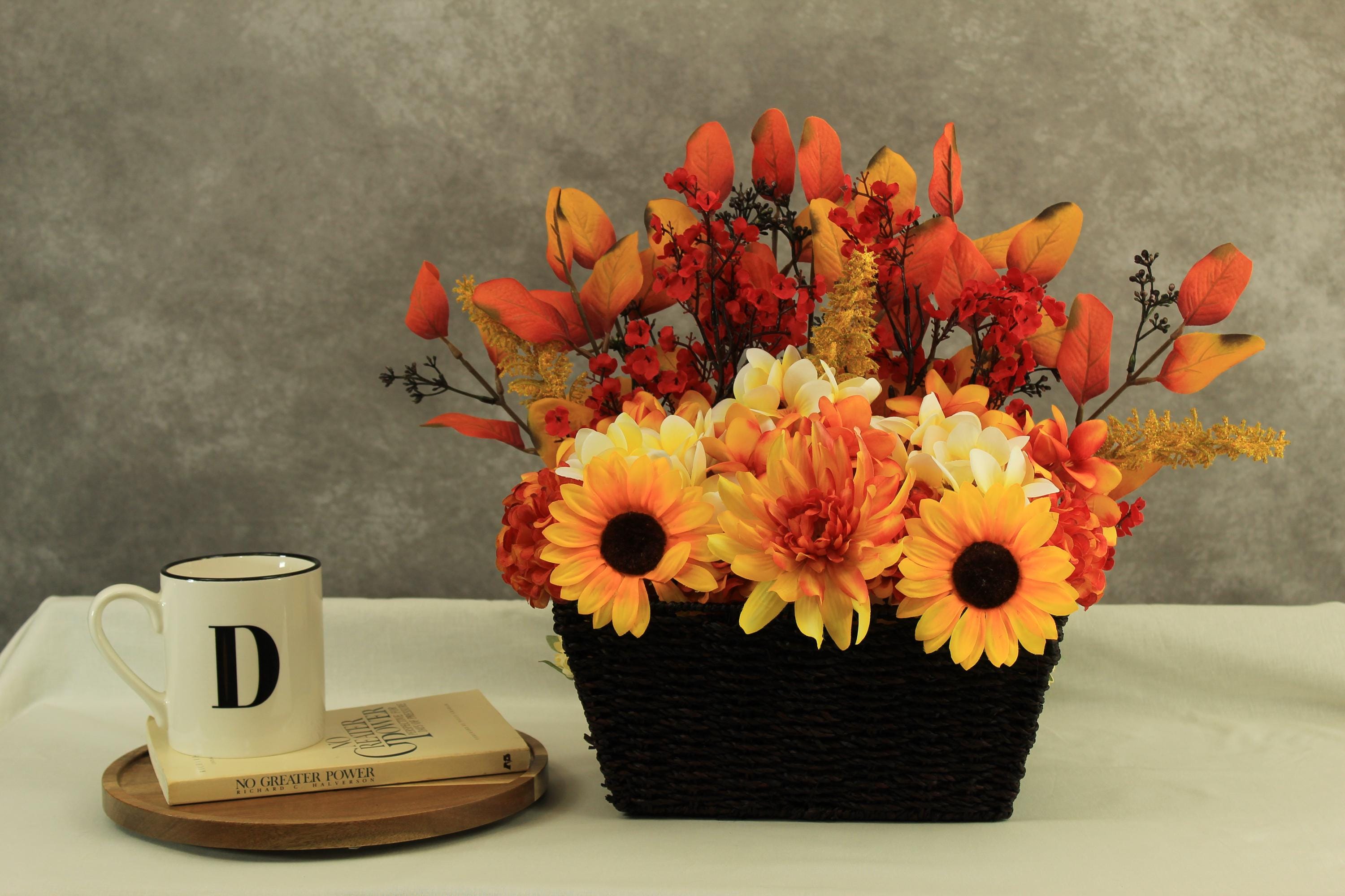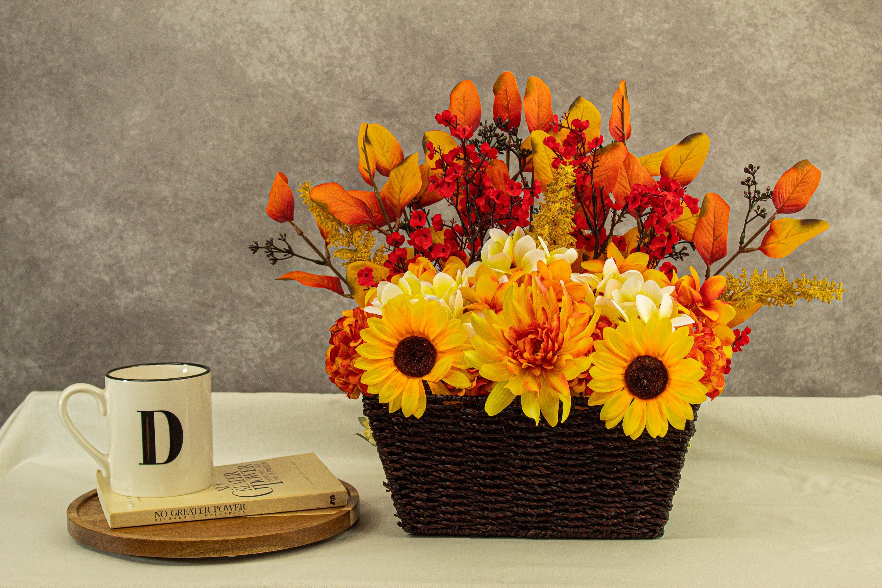 Bring warm “golden hour” fall color to your home without the wilting, water, or cleanup. This handcrafted fall basket centerpiece is packed with sunflowers, a dinner plate dahlia, hydrangea, peonies, daisies, wheat, baby’s breath, and autumn leaves, all arranged in a handmade rattan basket and finished with a soft lining of petite carnations for a luxe, full look.