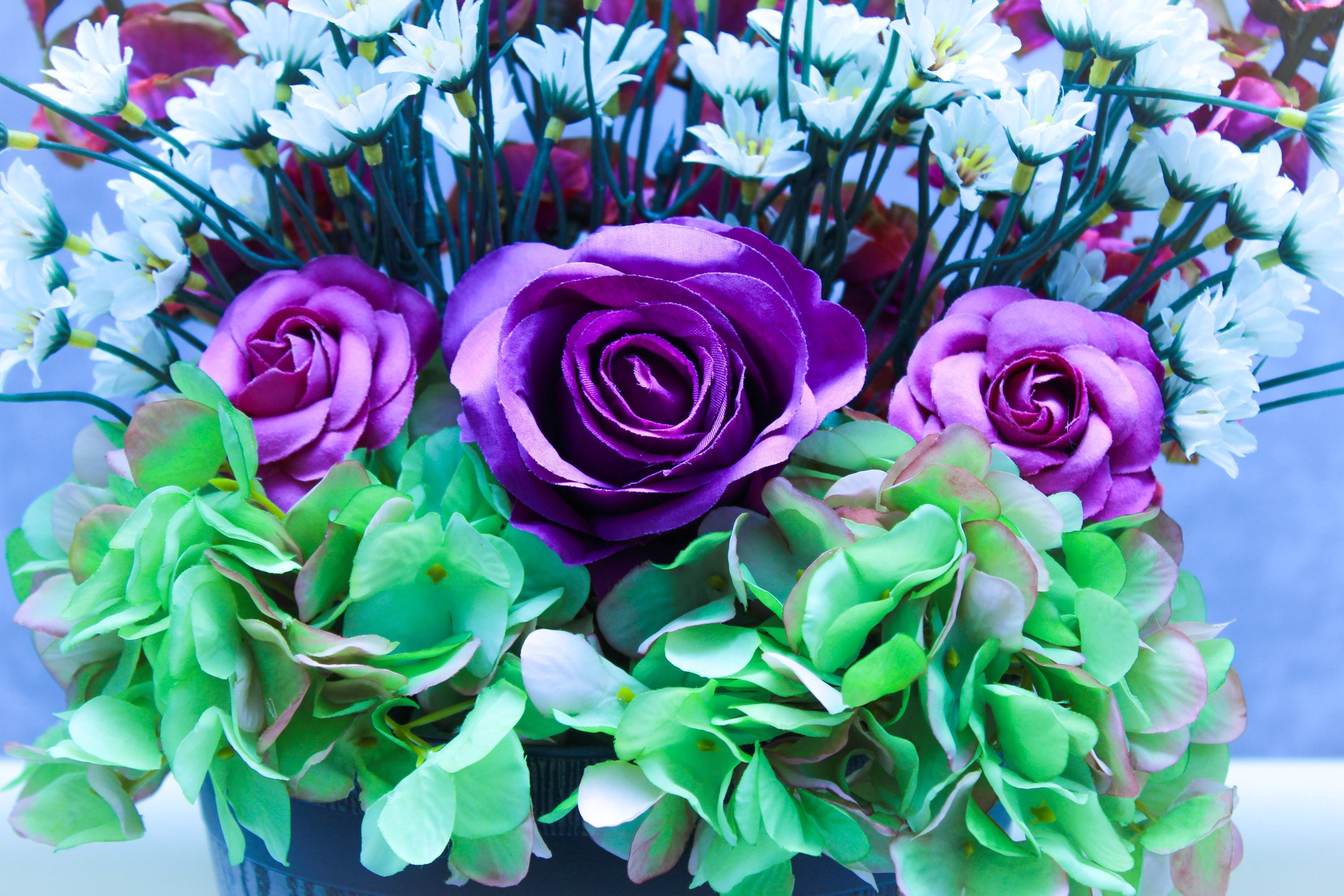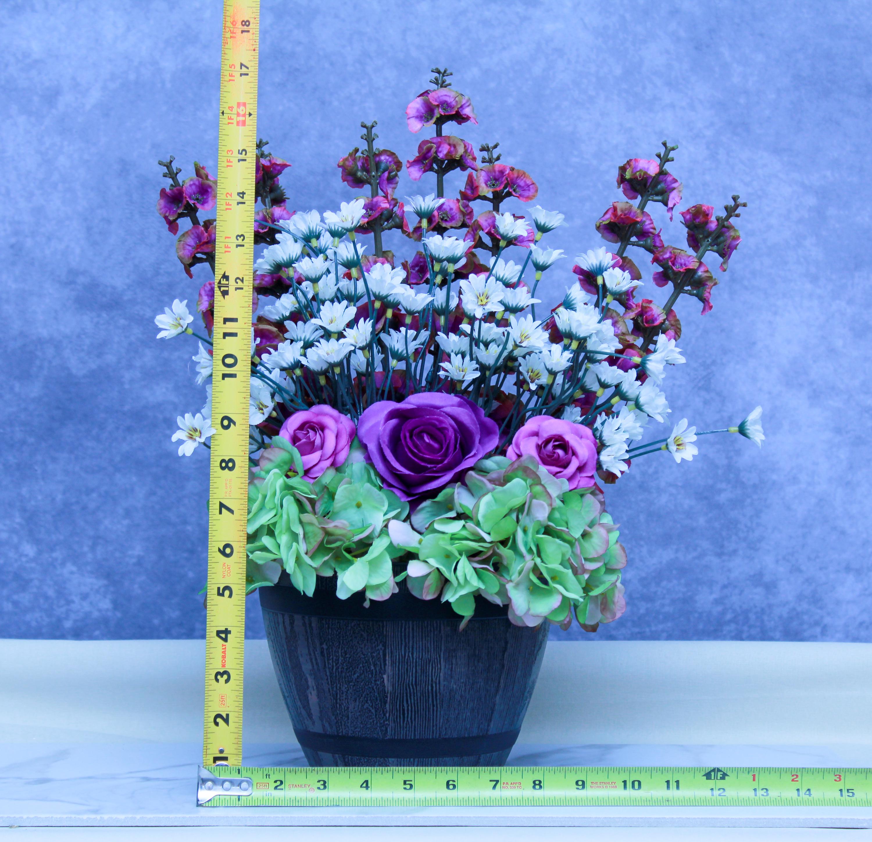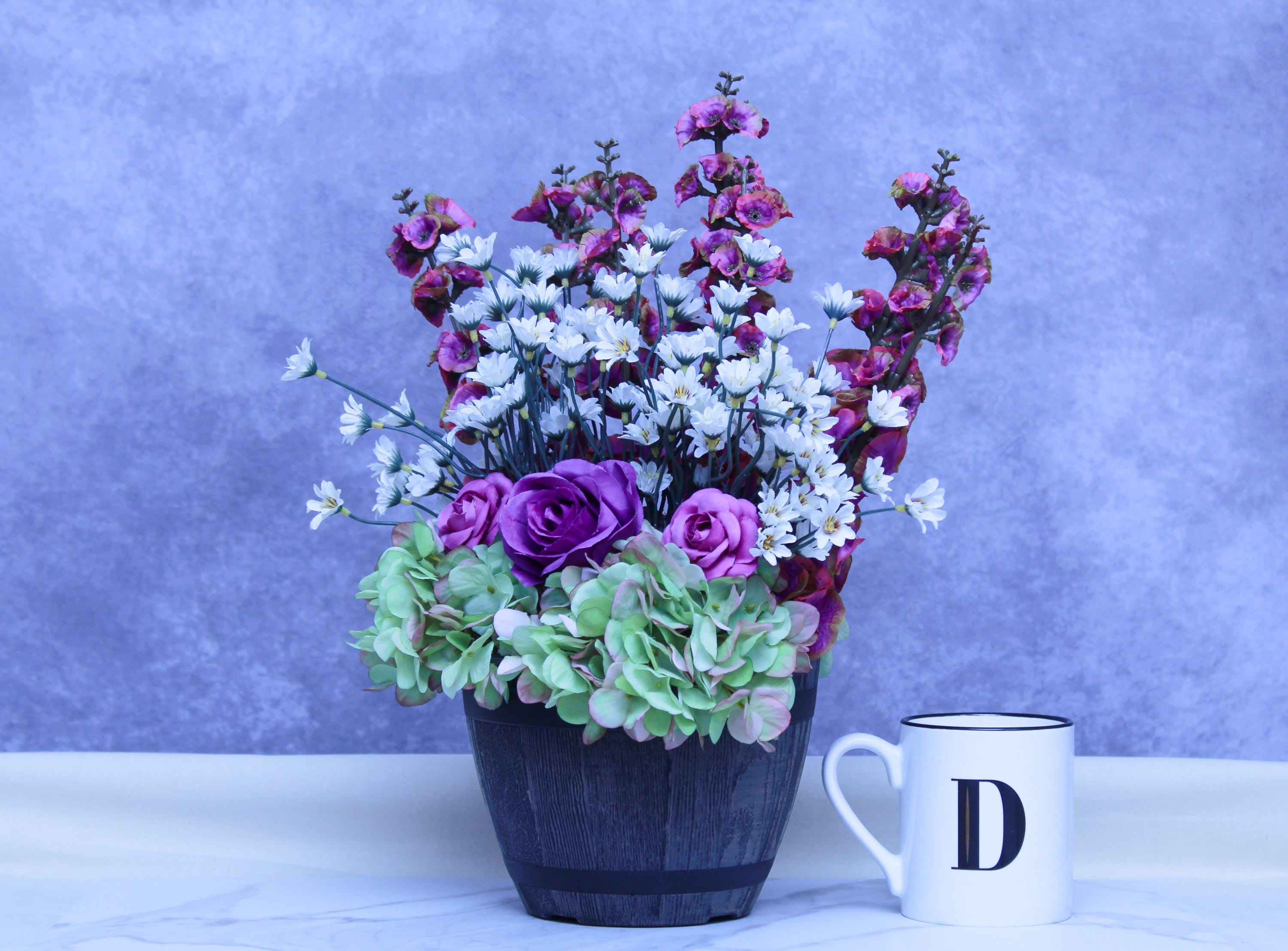 Make your space feel styled in seconds with this farmhouse faux flower centerpiece—a full, layered arrangement featuring purple roses, green hydrangea, and airy white daisy blooms with deep magenta accents for that “designer arrangement” look.