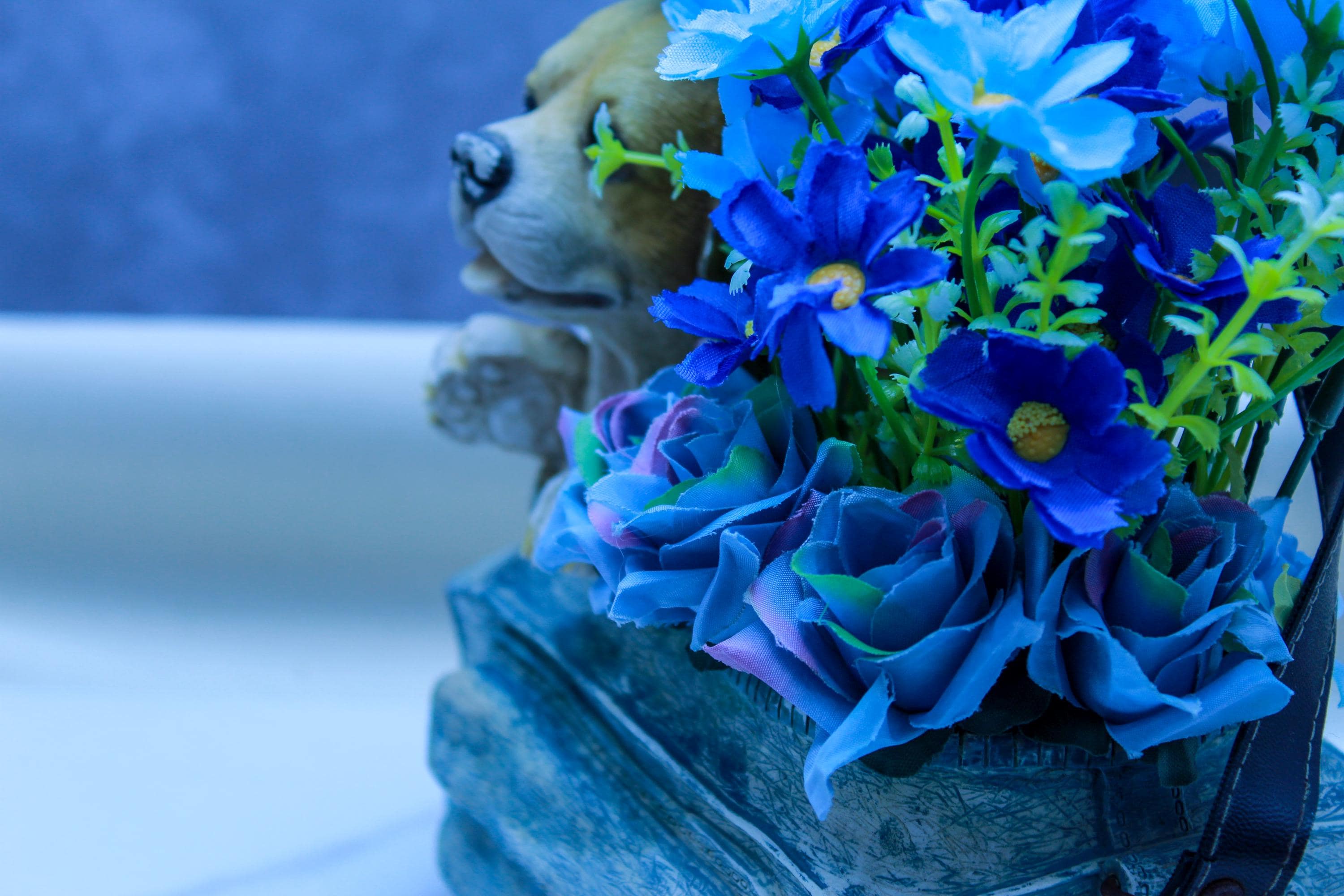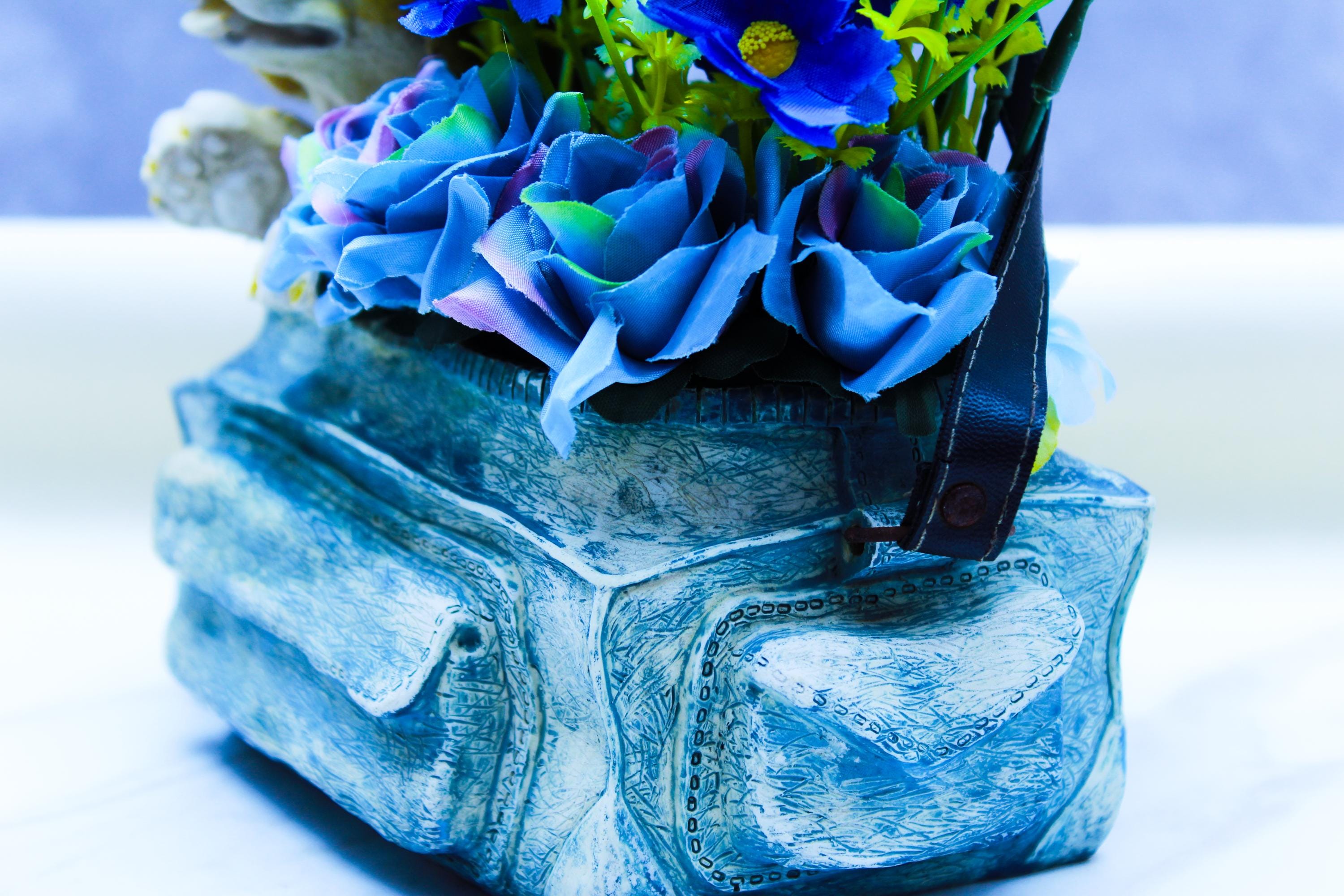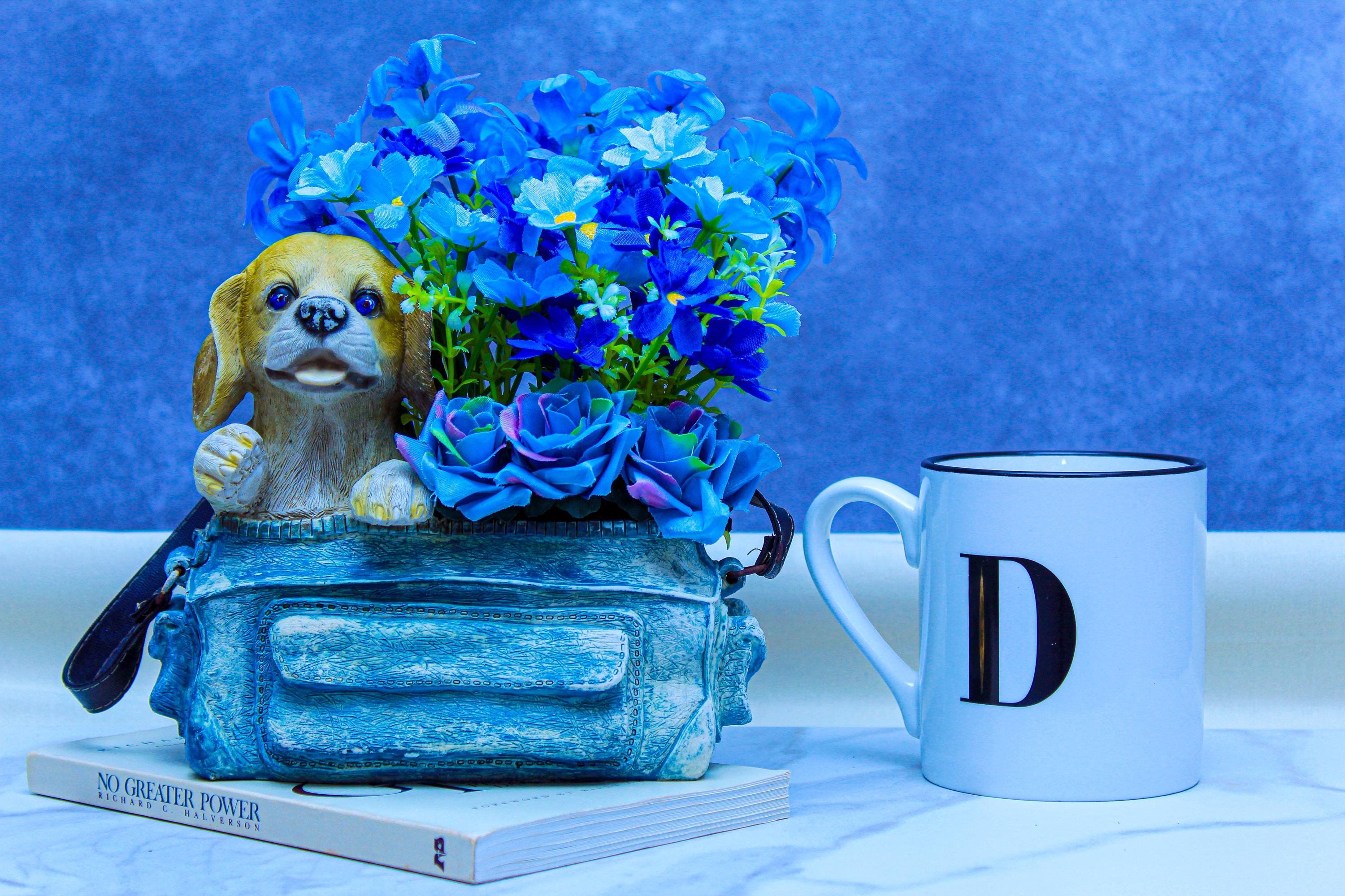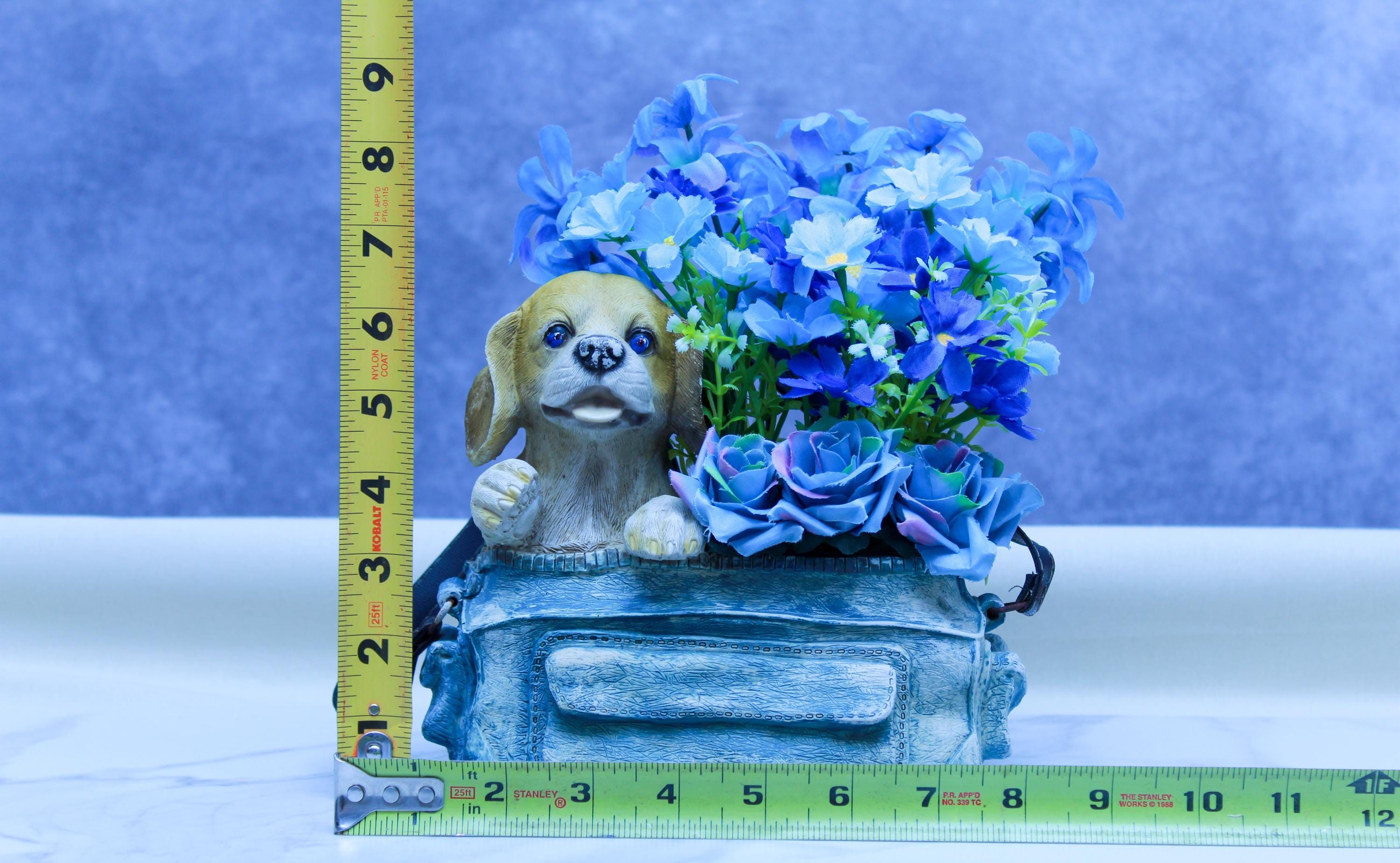 Bring a little happy to your shelf with this whimsical handmade, hand-painted ceramic purse planter featuring an adorable beagle pup peeking out beside a lush burst of blue faux flowers. It’s bright, playful, and still works beautifully in cottage farmhouse / coastal farmhouse décor as a pop of color on a neutral shelf, entryway table, or office desk.