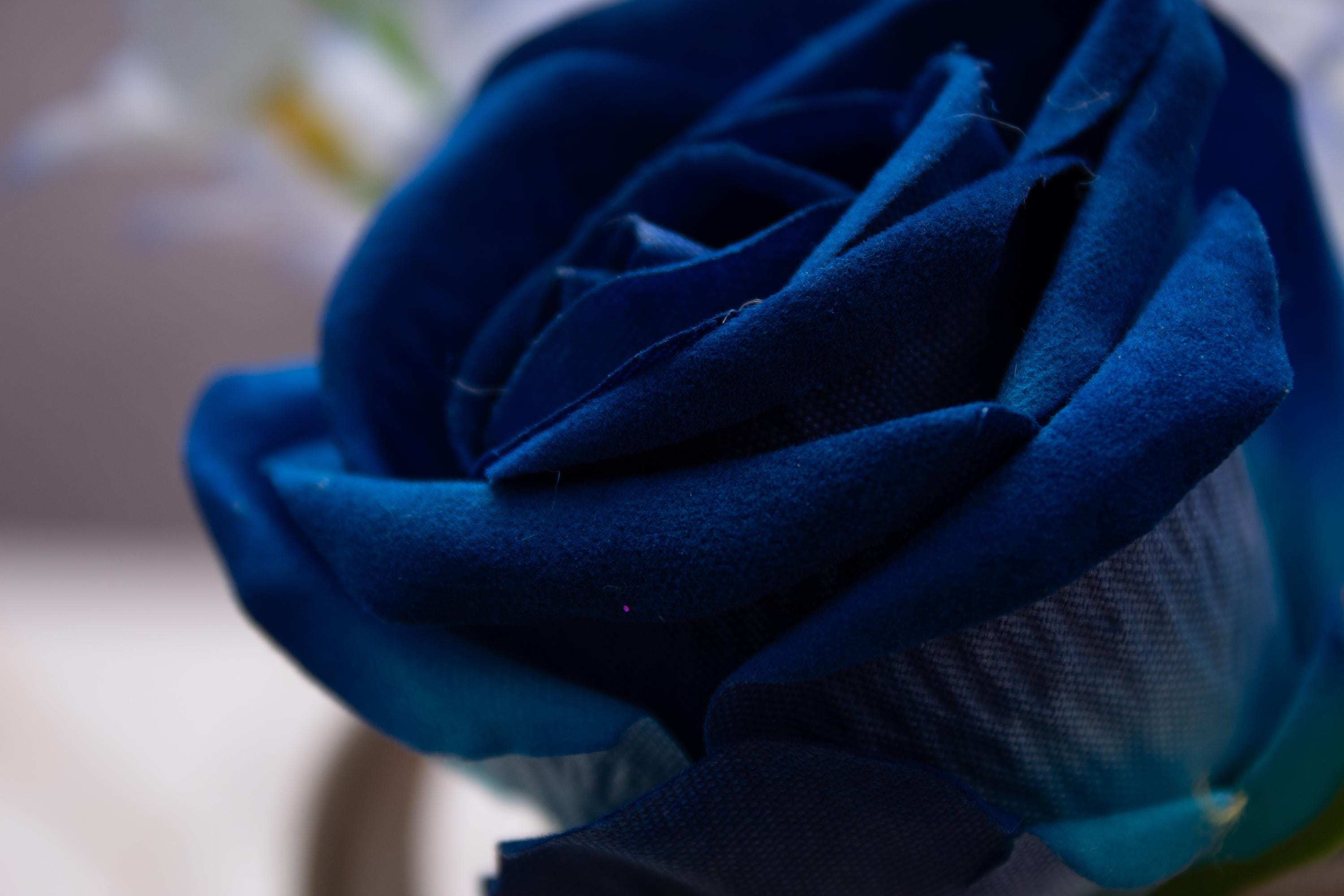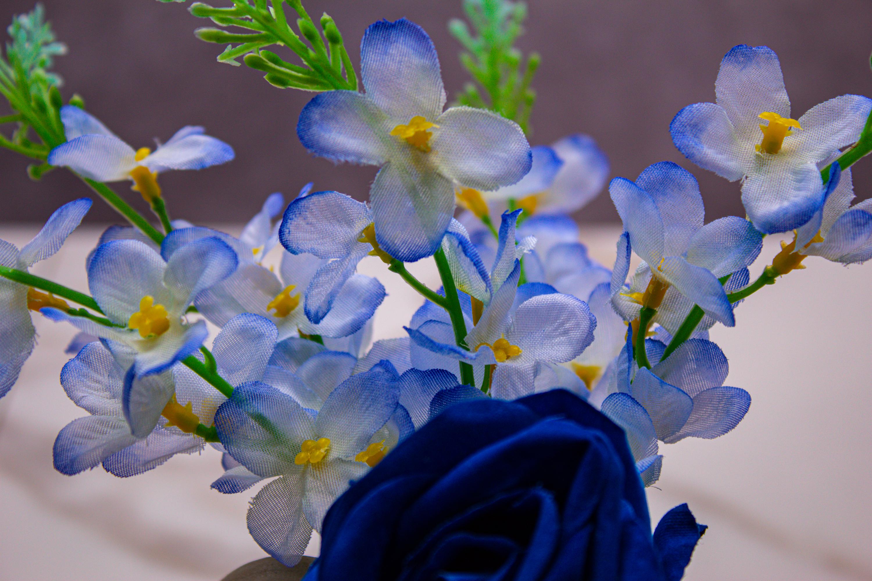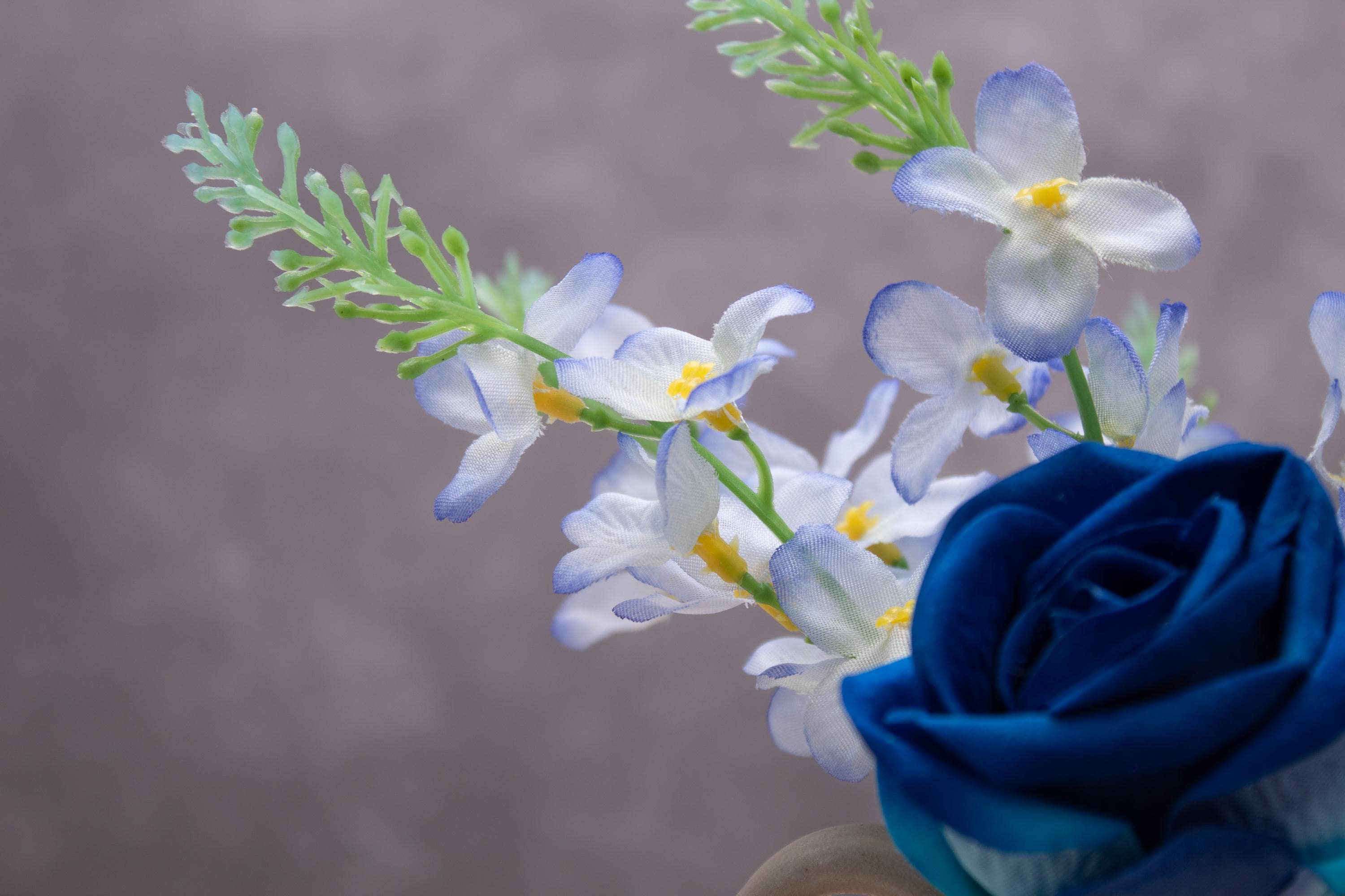 Bold blue rose + soft blue/white wildflower blooms for a calm, elegant look
