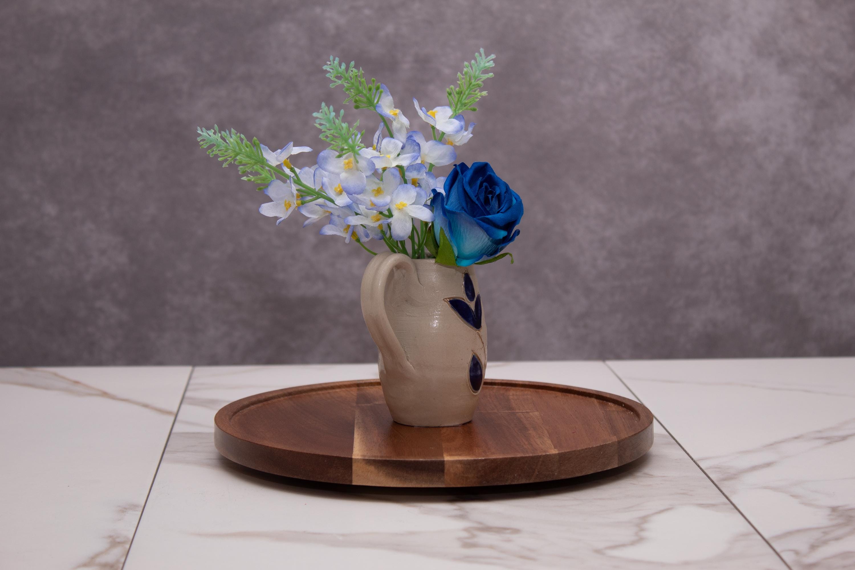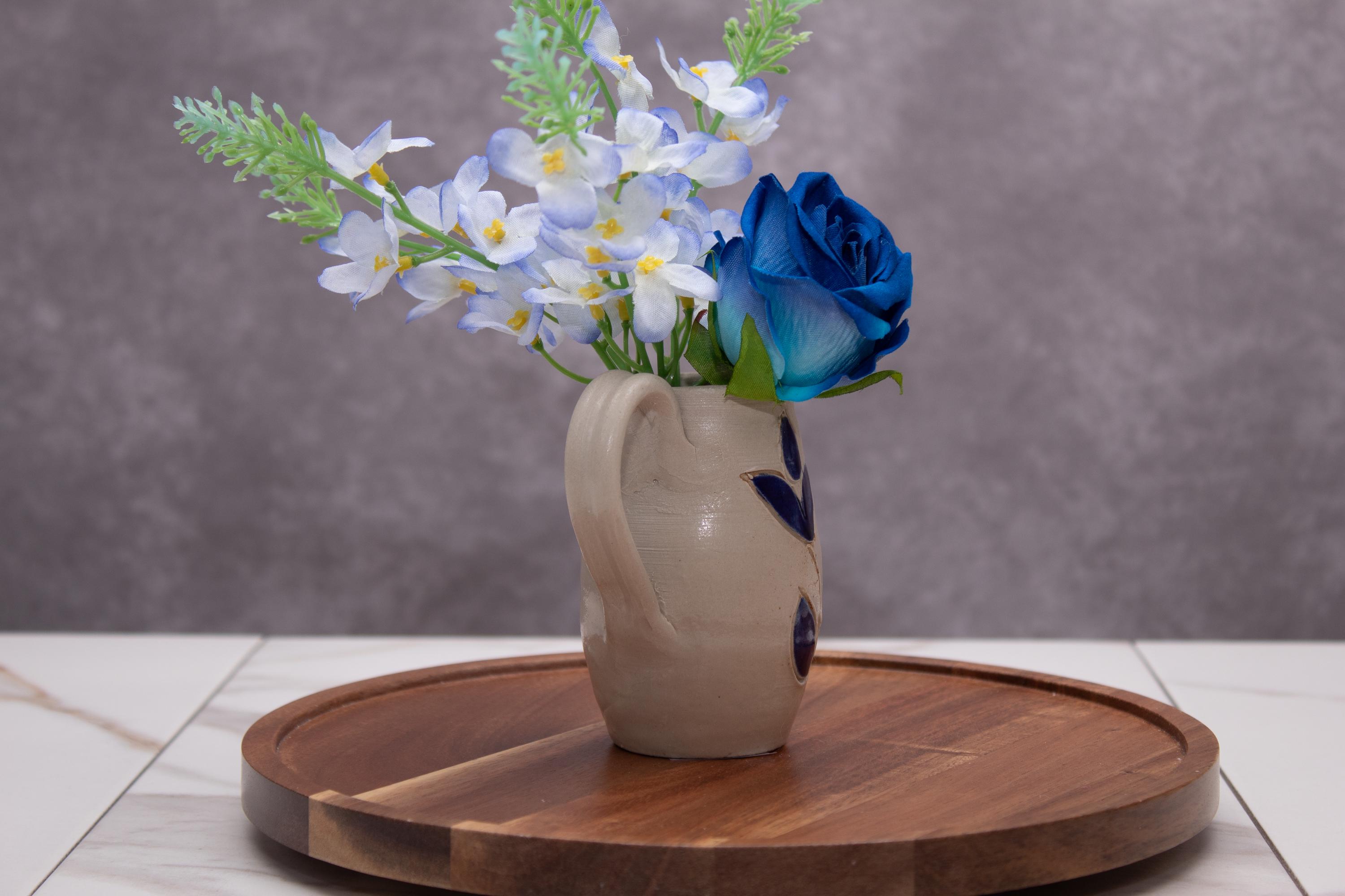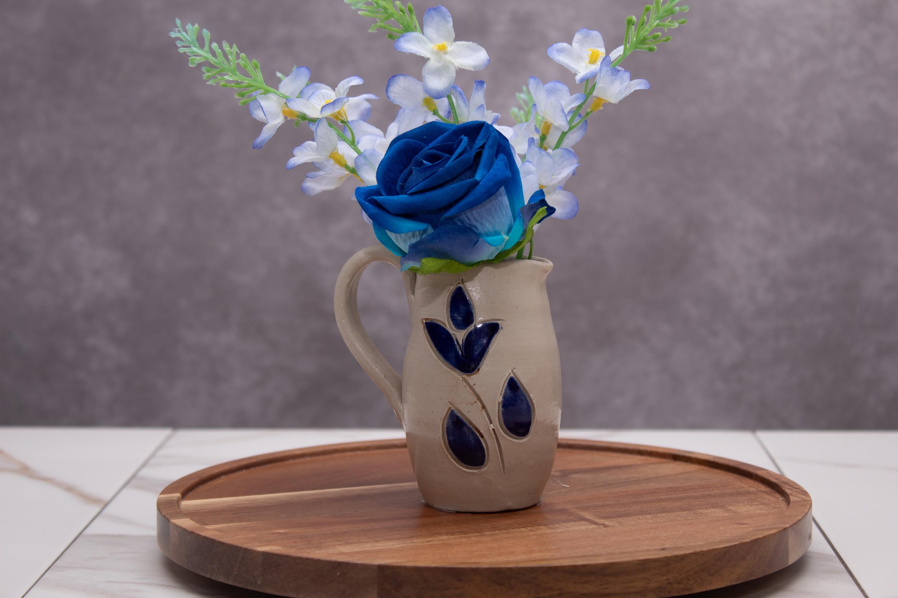 Bring a pop of deep blue into your space with this blue rose faux flower arrangement styled in a handmade, kiln-fired, hand-painted ceramic pitcher vase. It’s the perfect small floral accent for a farmhouse home, cottagecore shelf styling, or a thoughtful gift that lasts (no wilting, no watering, no mess).